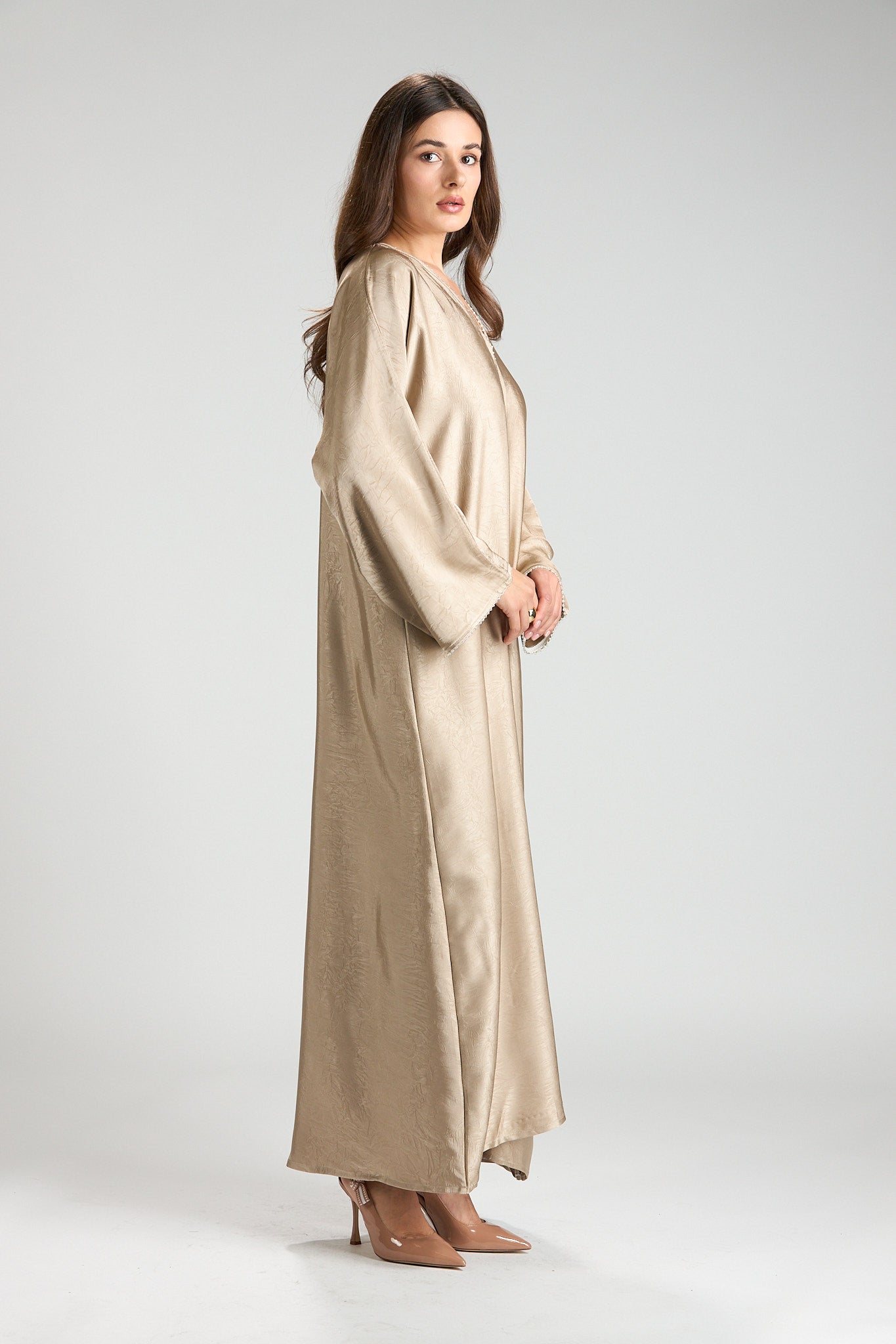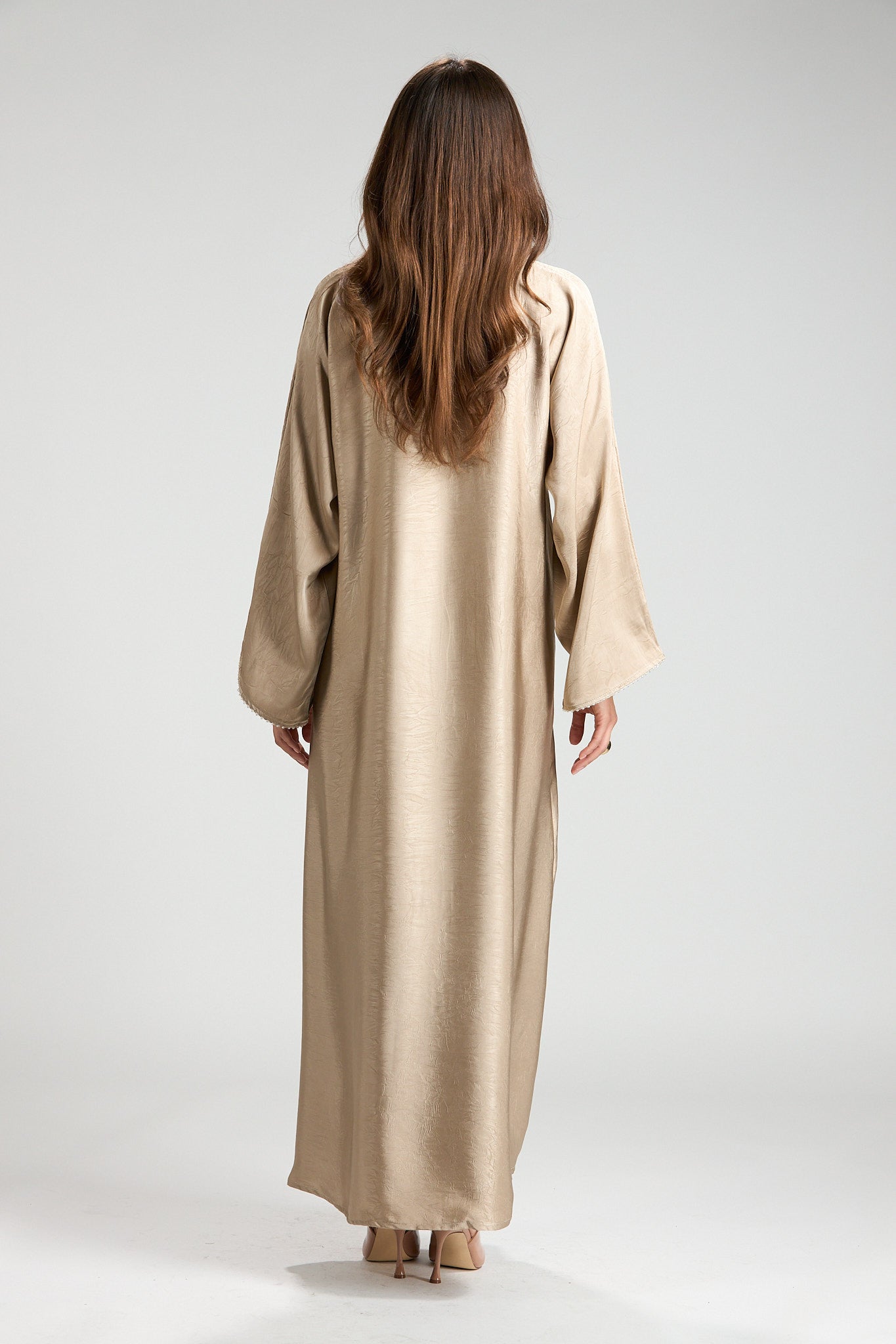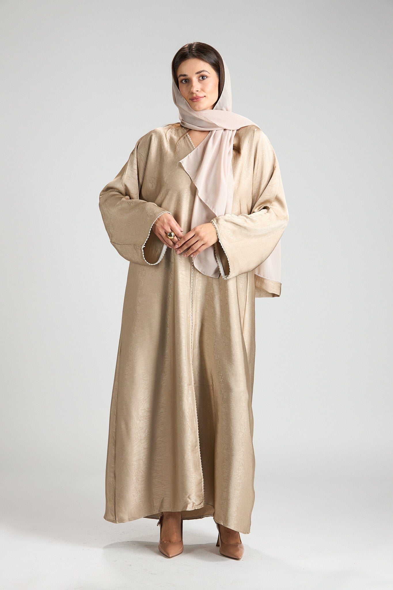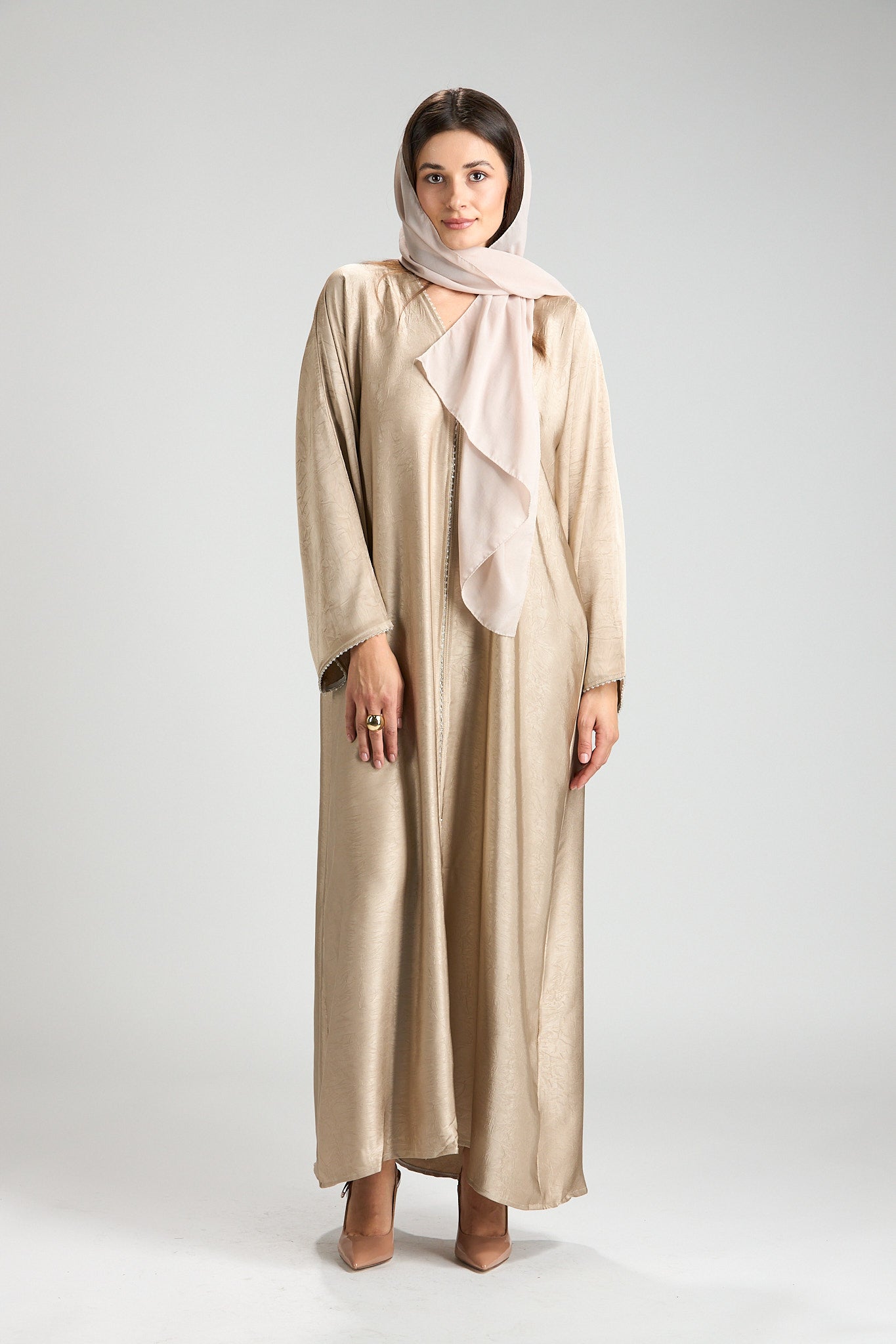 Effortlessly elegant and refined, The Champagne Grace Abaya is designed in a soft champagne-beige hue with a subtle textured finish that catches the light beautifully. Its fluid silhouette drapes gracefully, offering a look that is both modest and sophisticated.