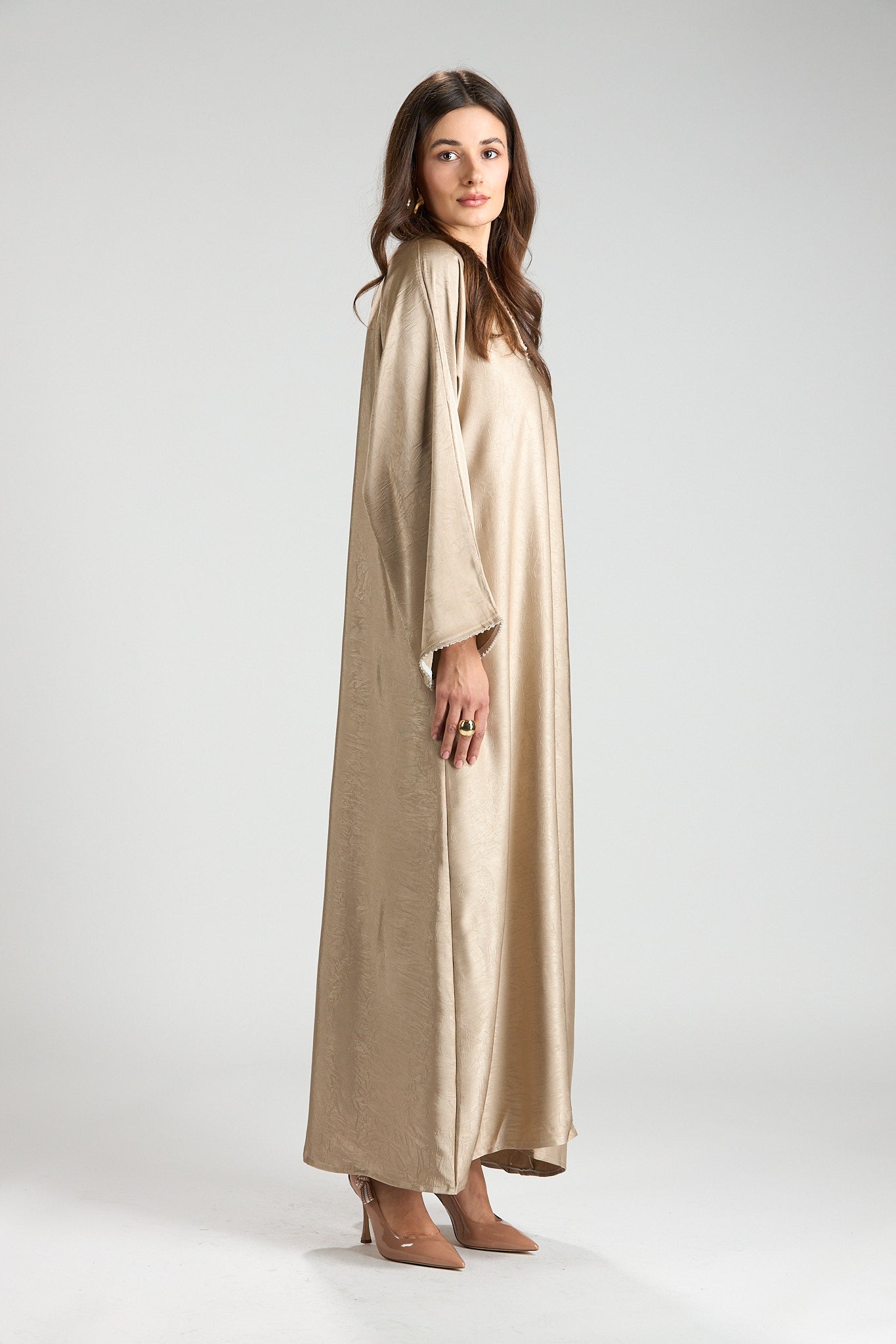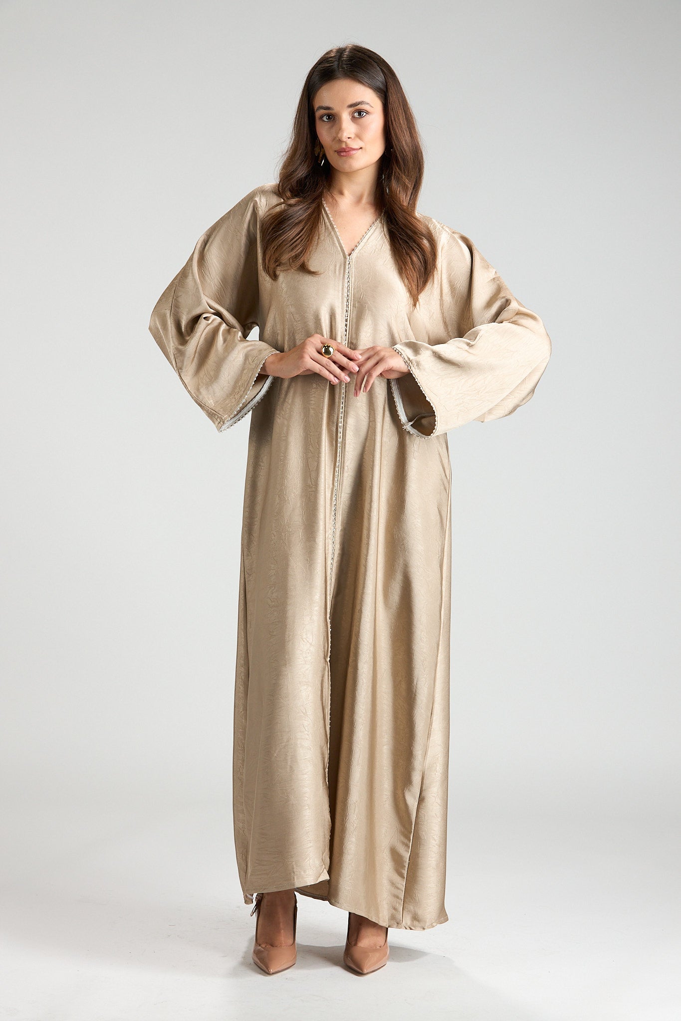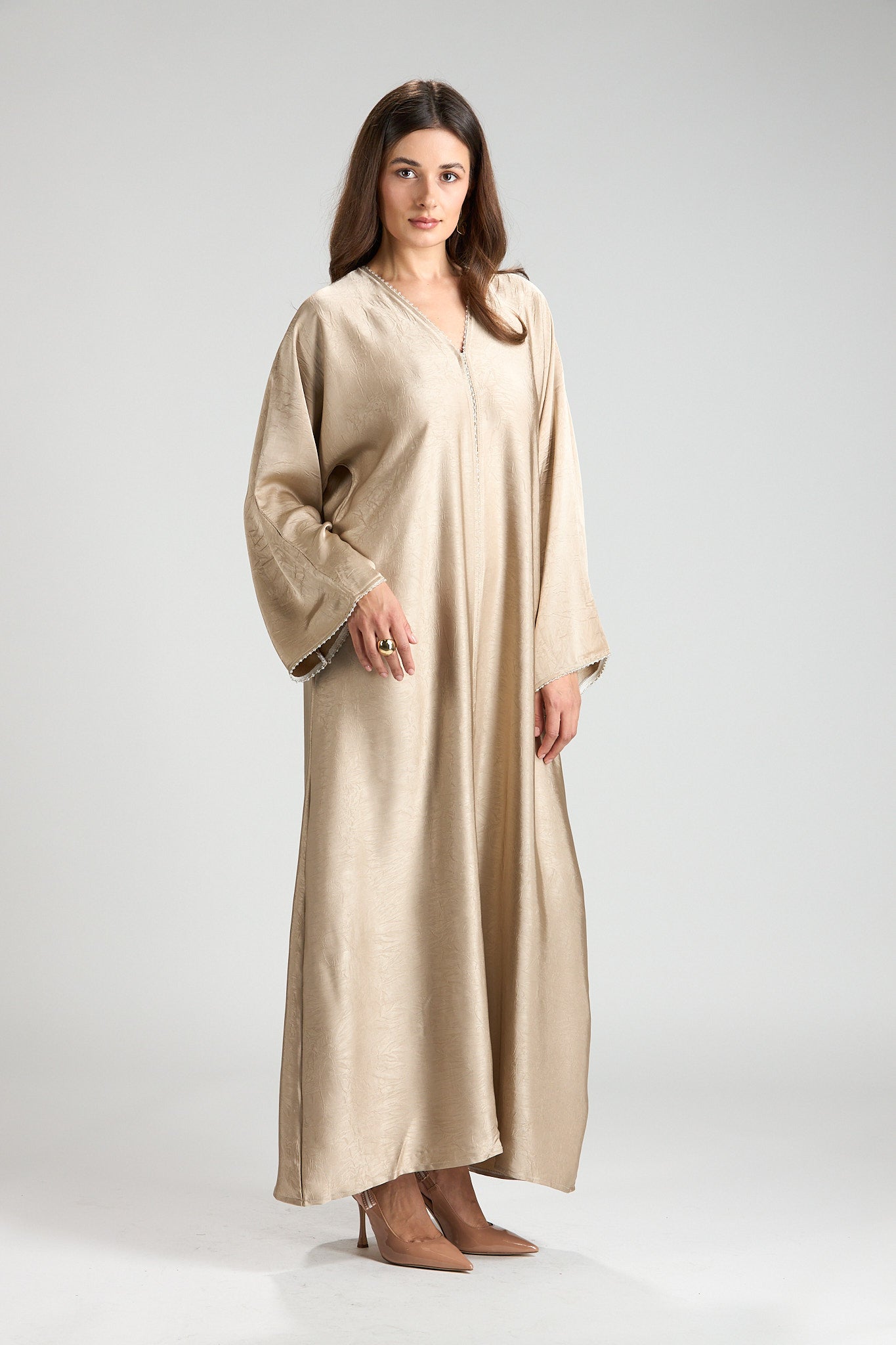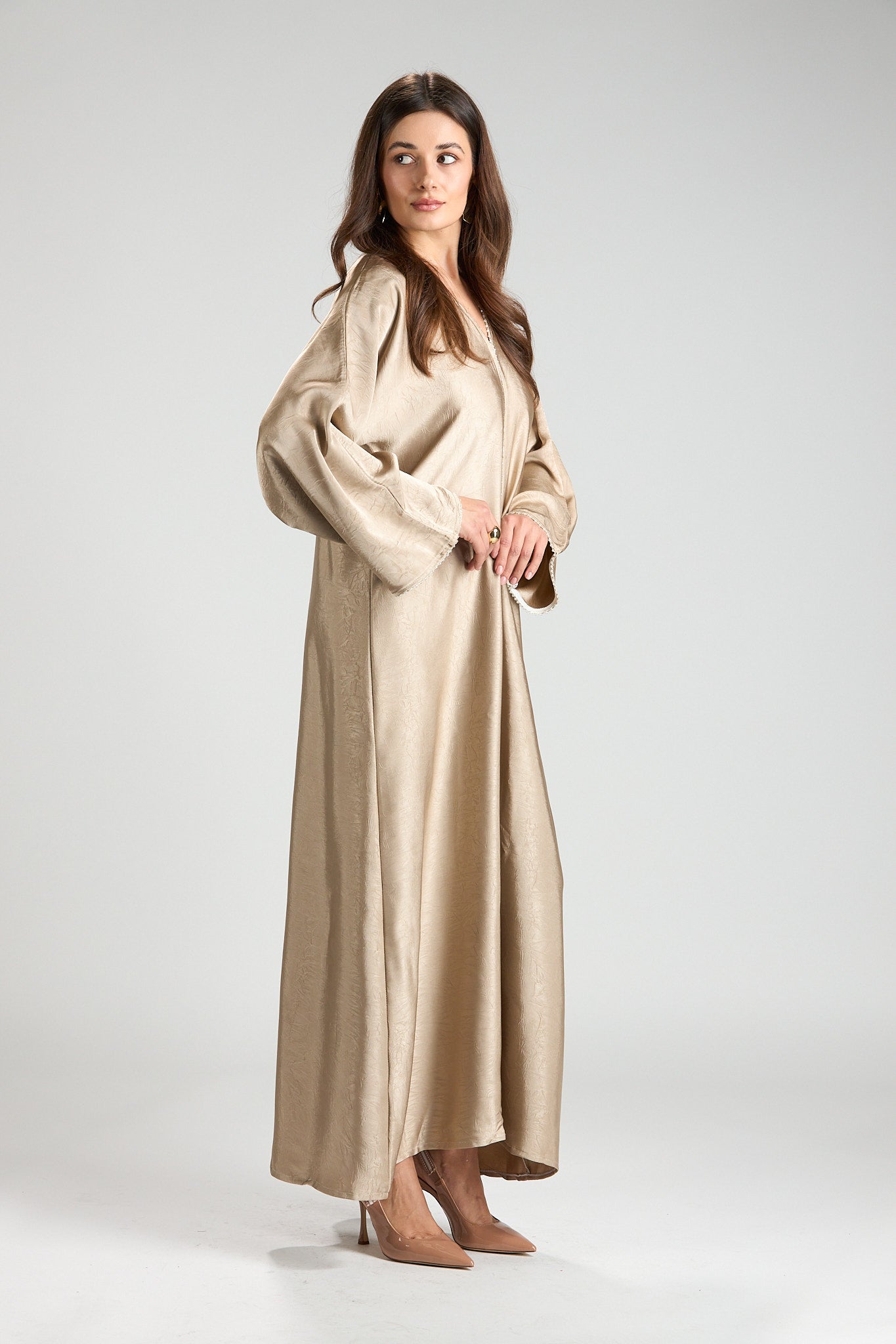 Effortlessly elegant and refined, The Champagne Grace Abaya is designed in a soft champagne-beige hue with a subtle textured finish that catches the light beautifully. Its fluid silhouette drapes gracefully, offering a look that is both modest and sophisticated.