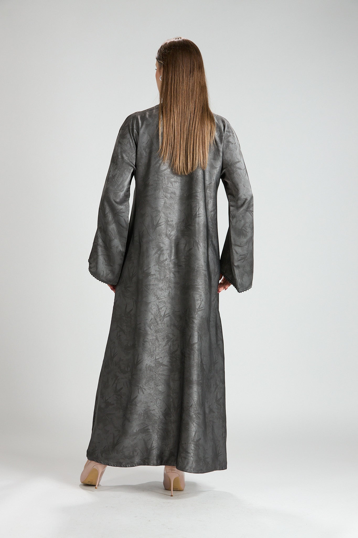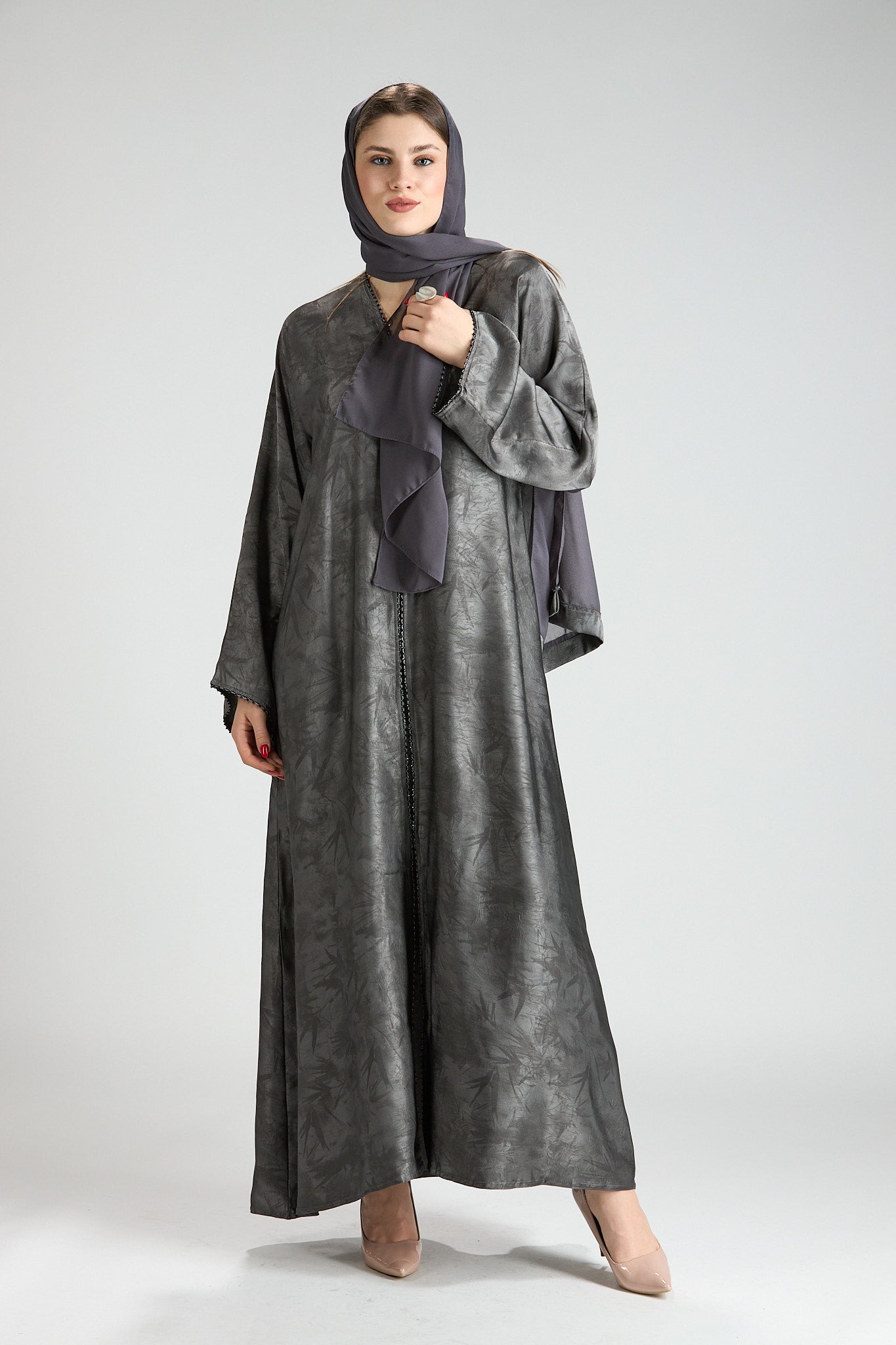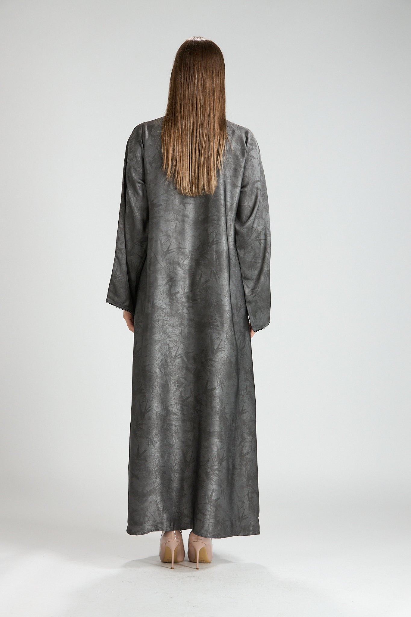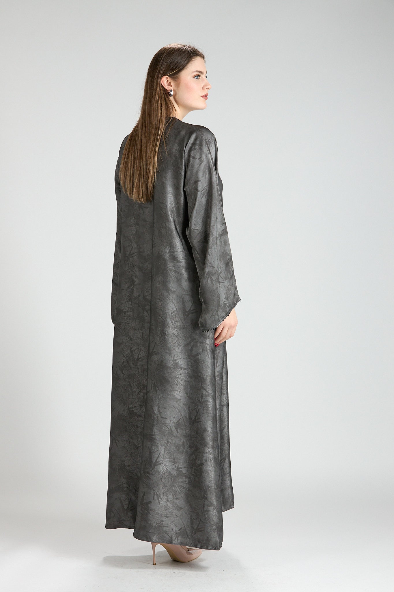 Effortlessly elegant and refined, Farah Abaya is designed in a gray hue with a subtle textured finish that catches the light beautifully. Its fluid silhouette drapes gracefully, offering a look that is both modest and sophisticated.