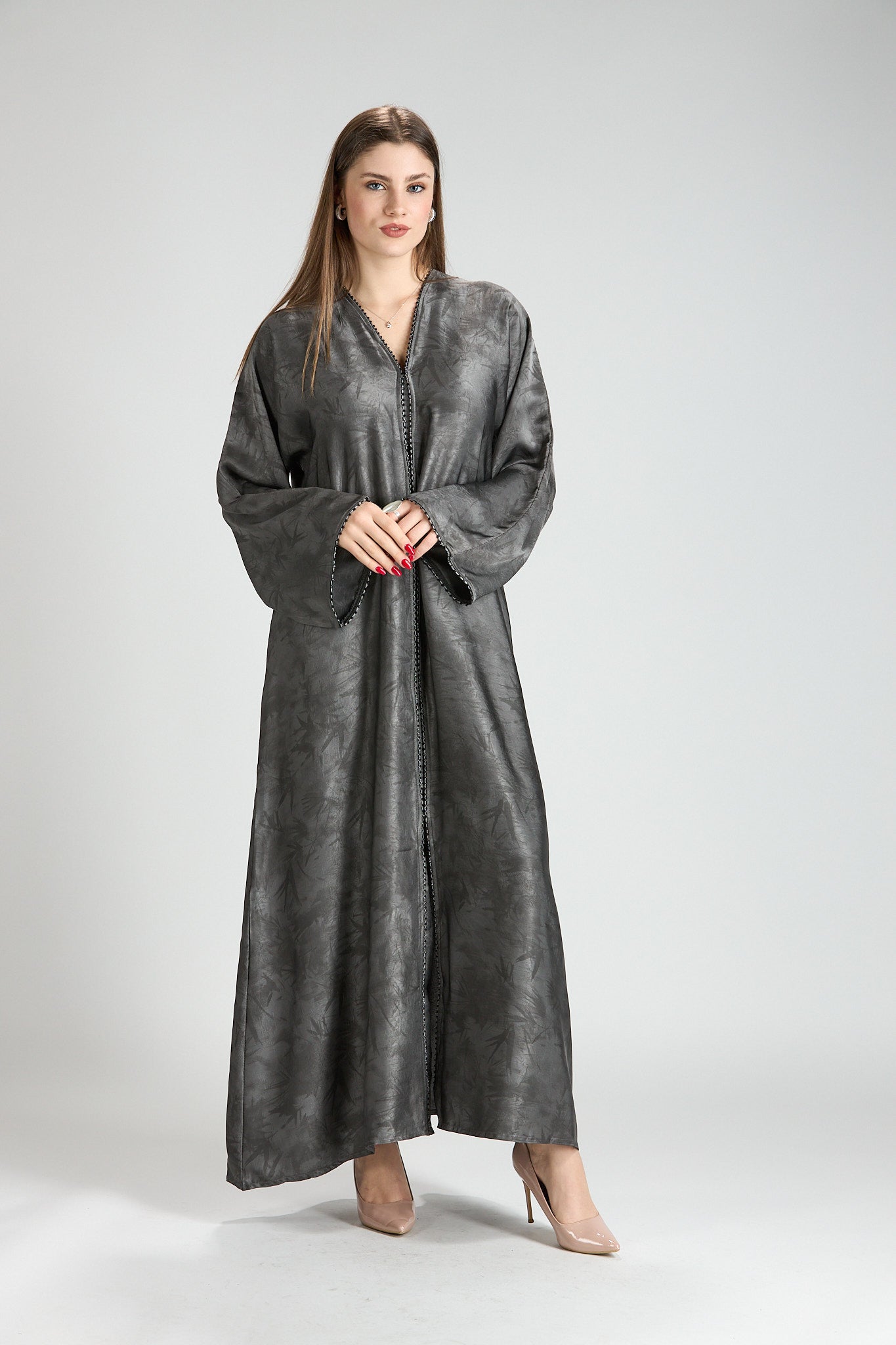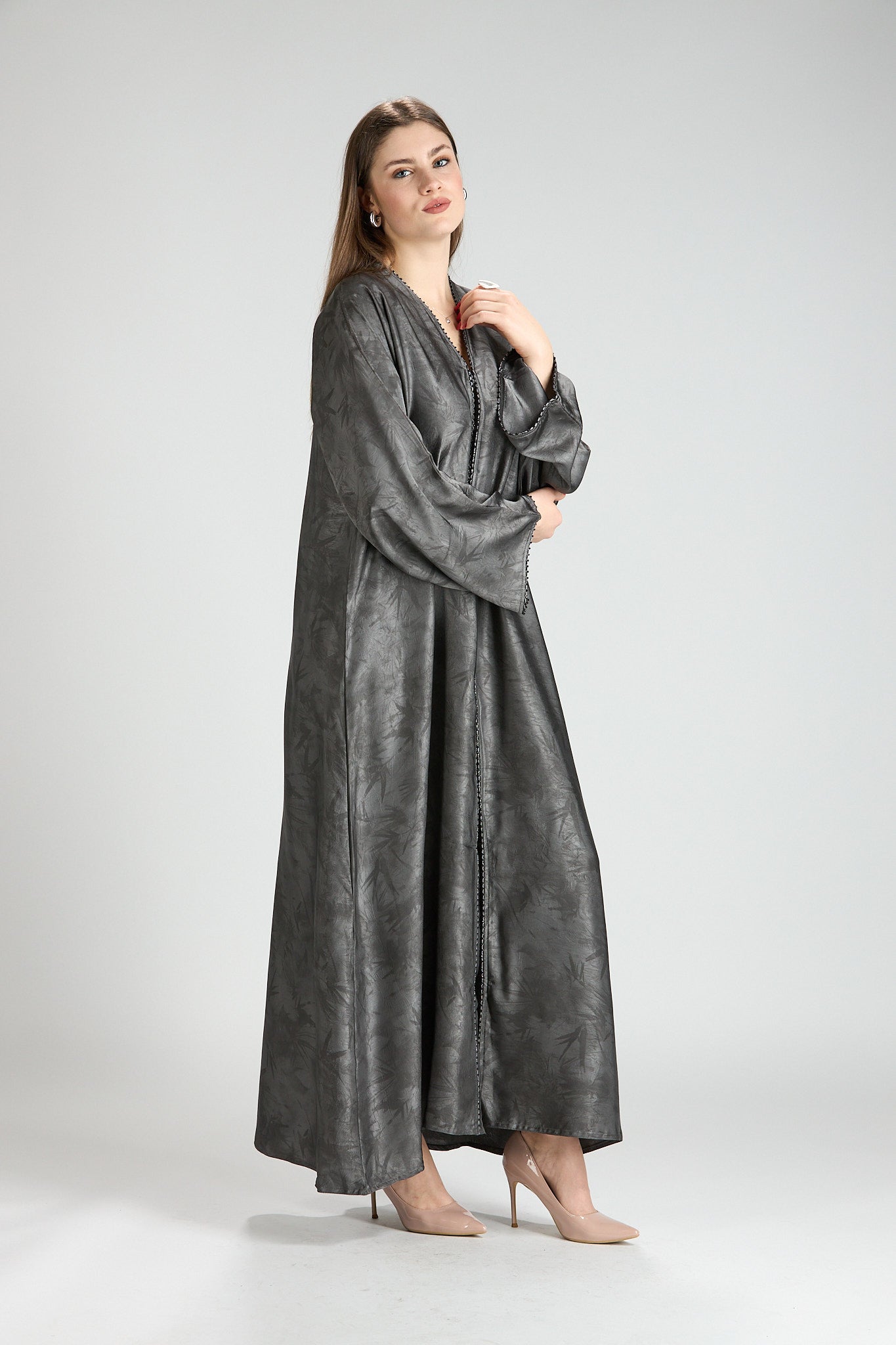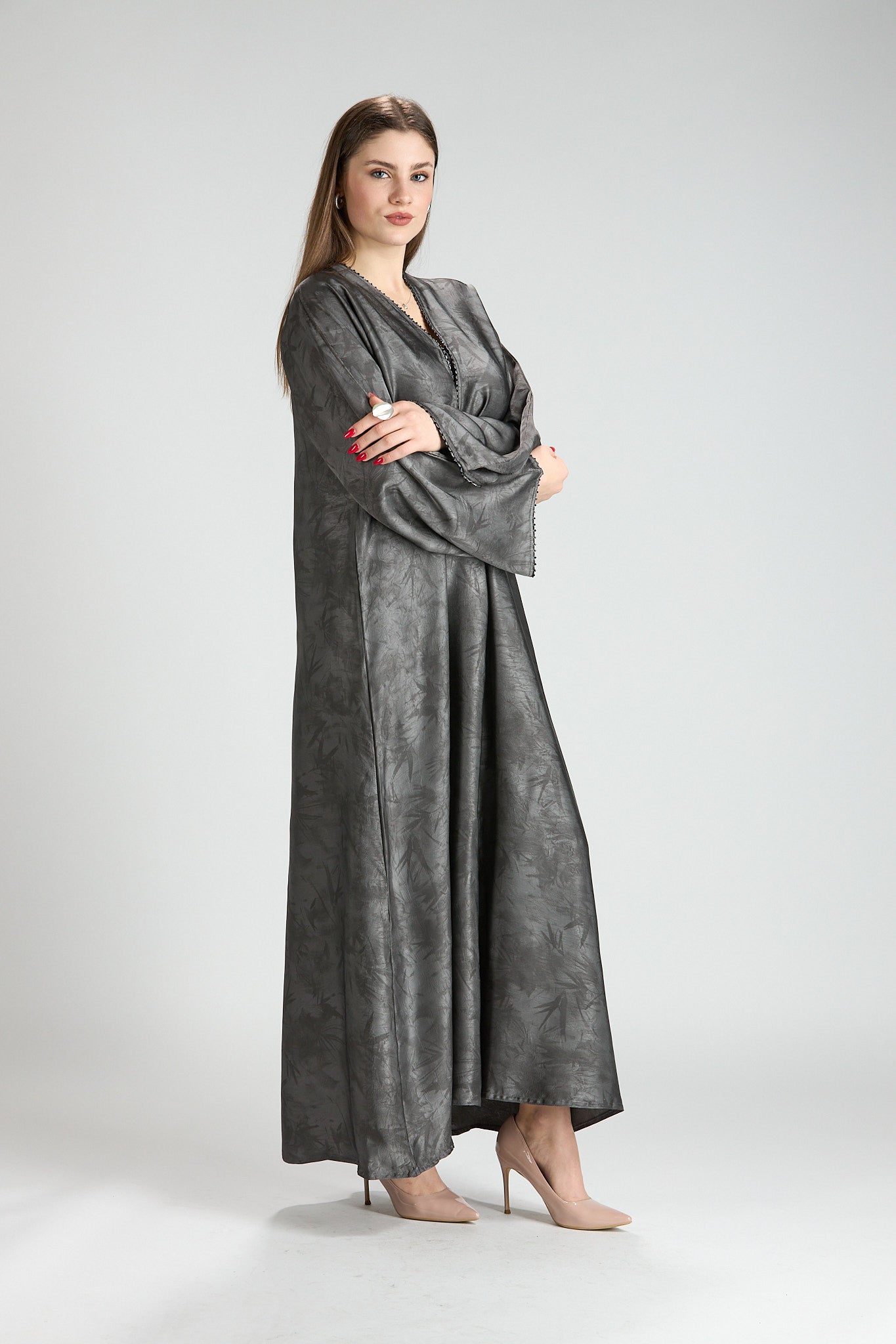 Effortlessly elegant and refined, Farah Abaya is designed in a gray hue with a subtle textured finish that catches the light beautifully. Its fluid silhouette drapes gracefully, offering a look that is both modest and sophisticated.
