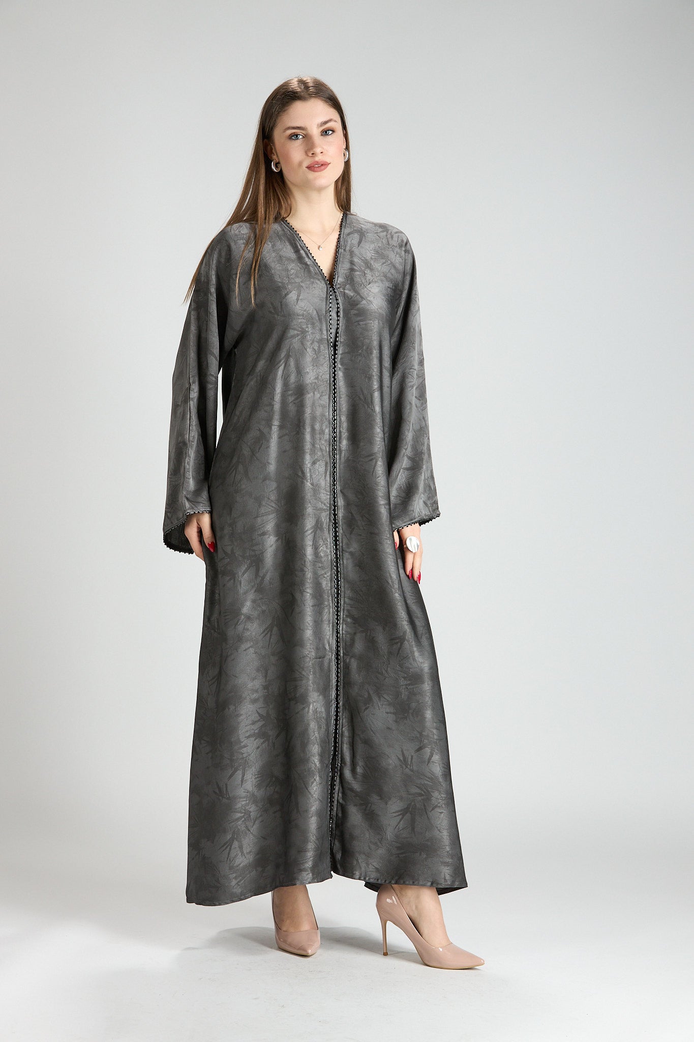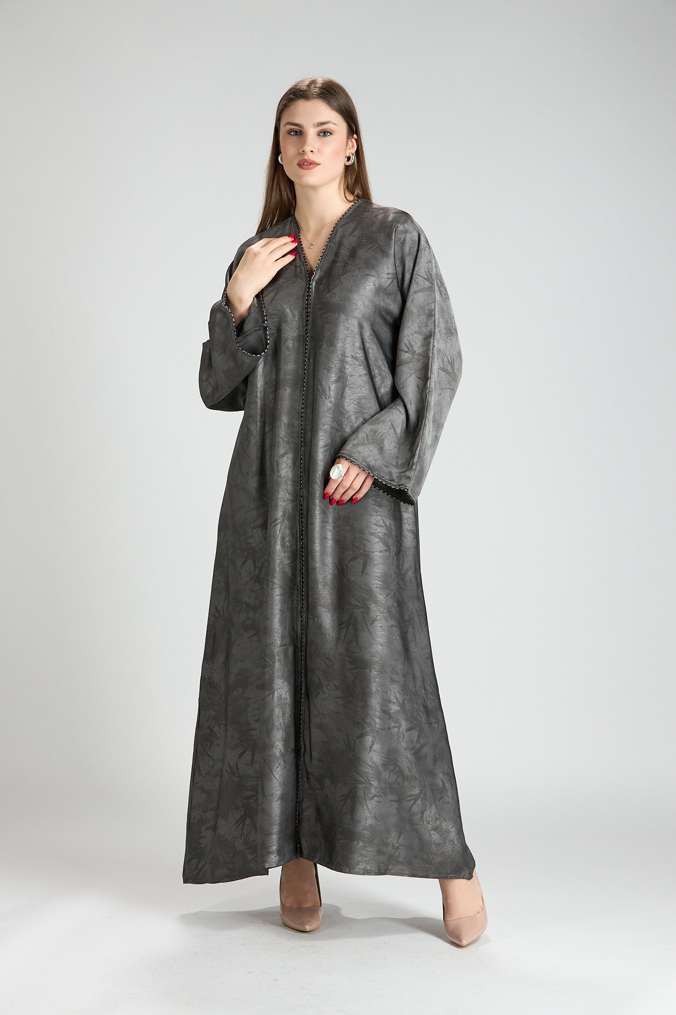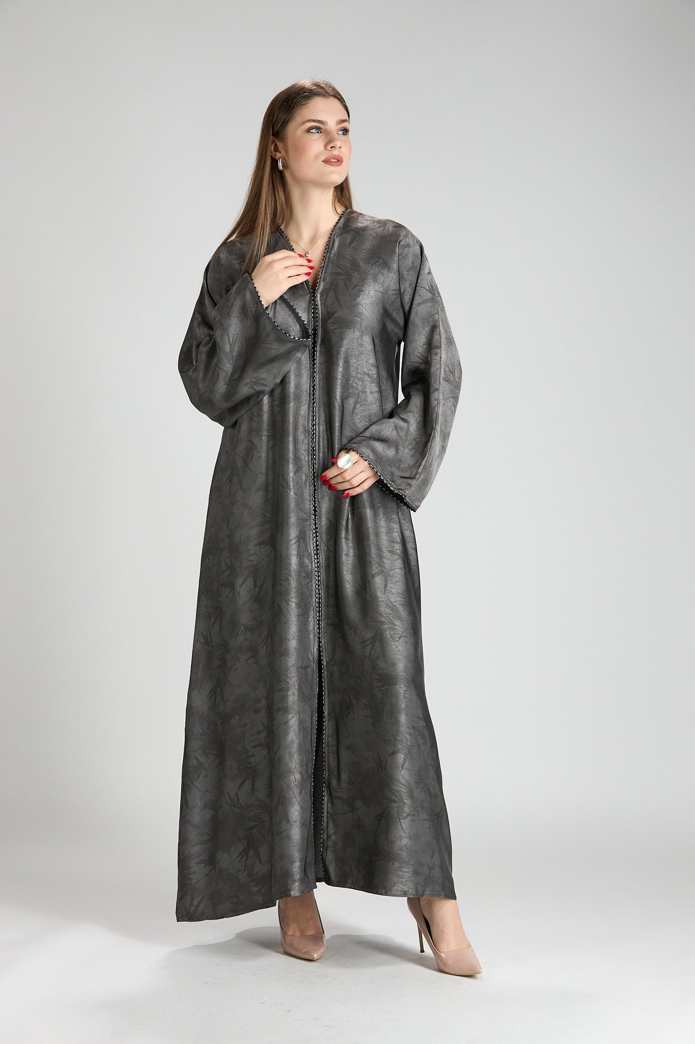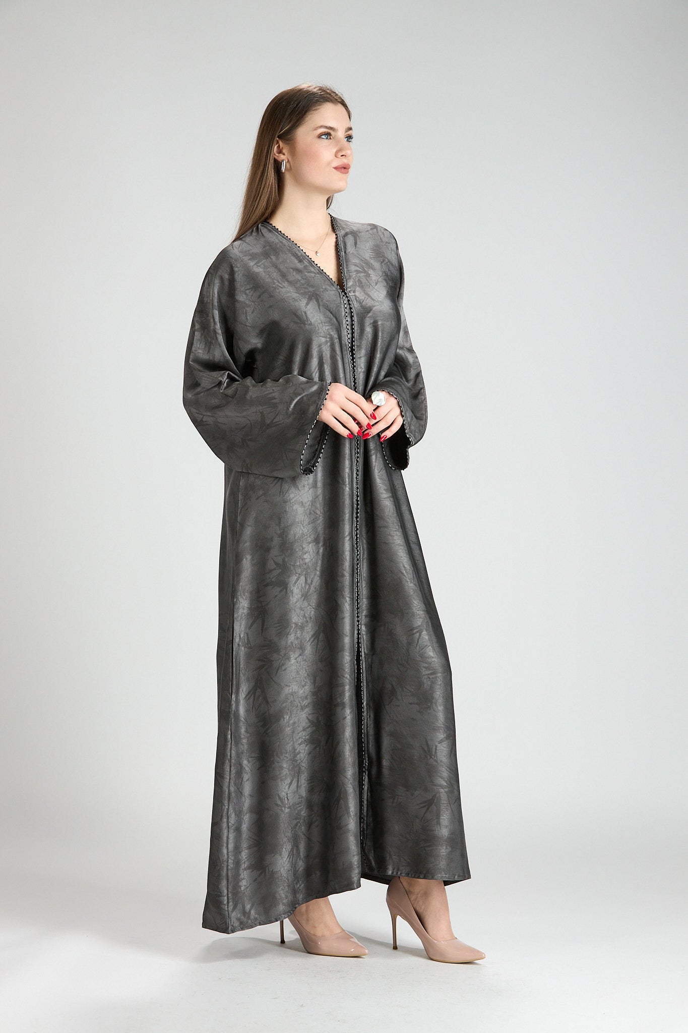 Effortlessly elegant and refined, Farah Abaya is designed in a gray hue with a subtle textured finish that catches the light beautifully. Its fluid silhouette drapes gracefully, offering a look that is both modest and sophisticated.