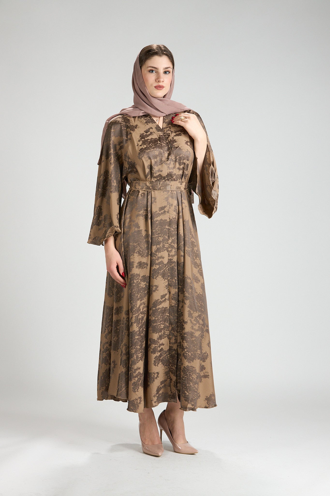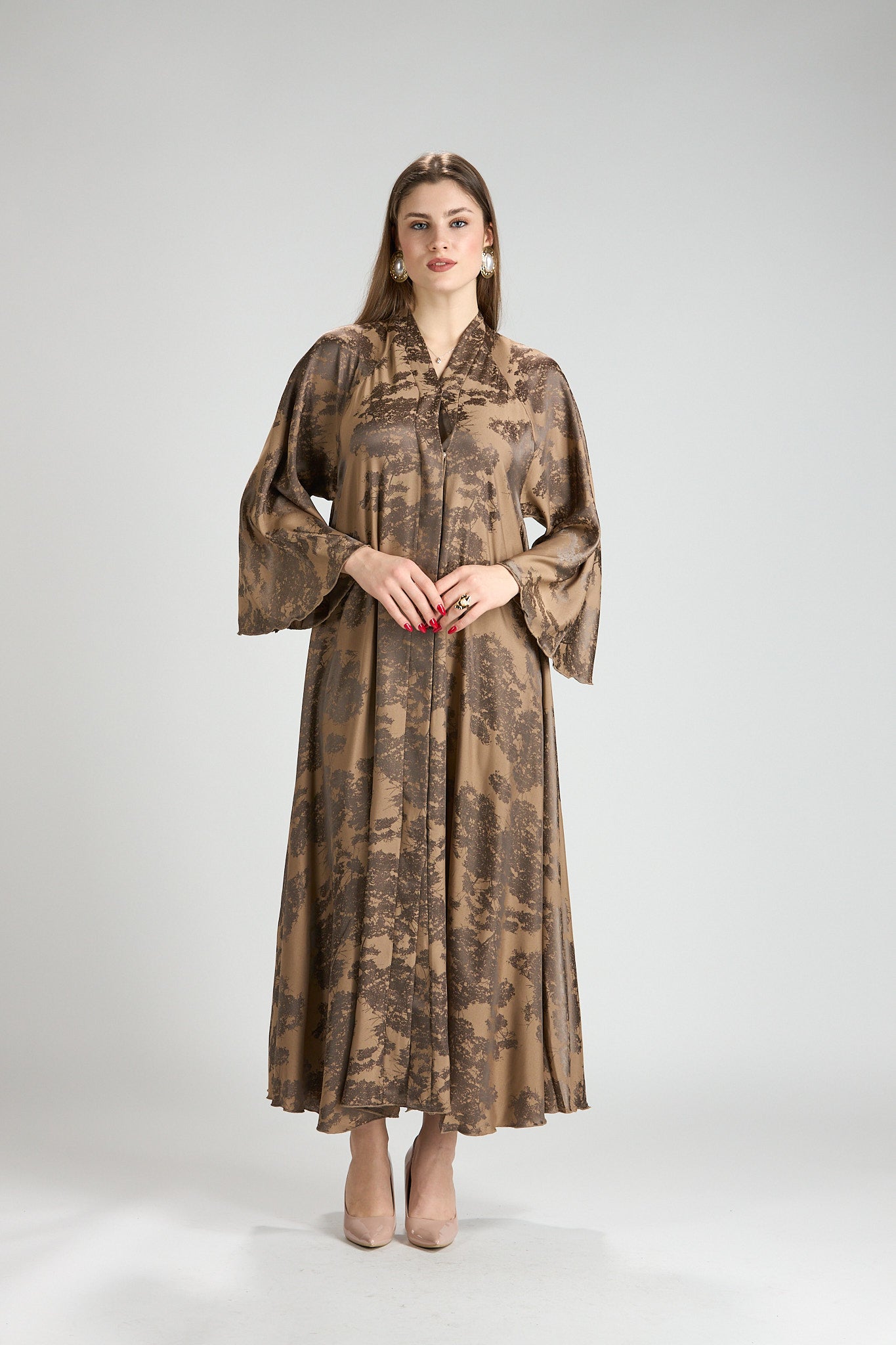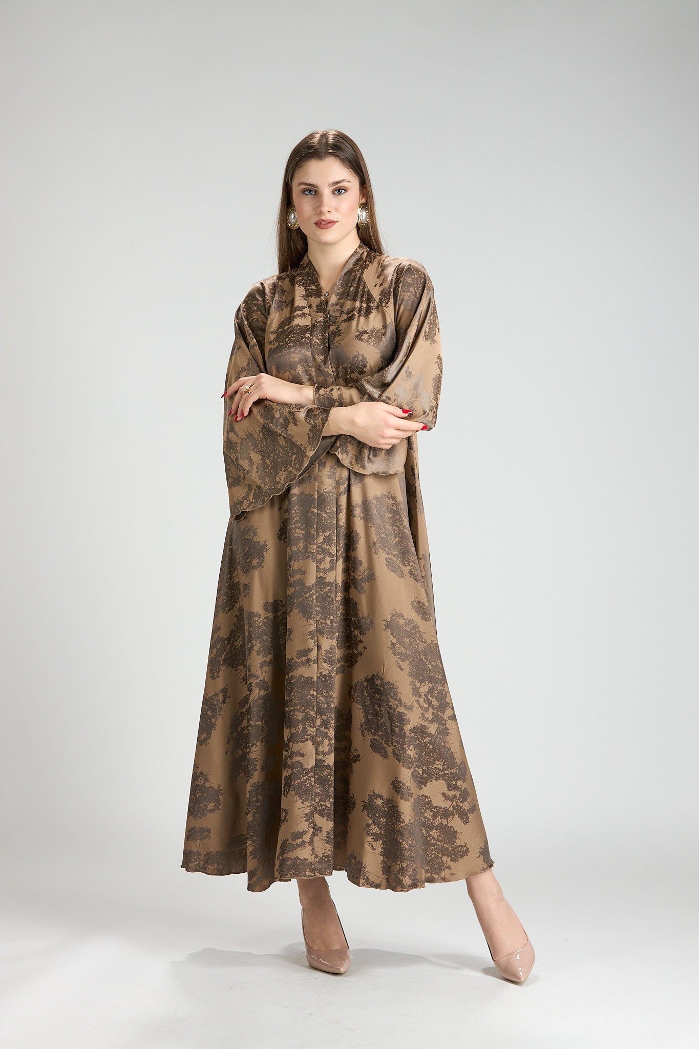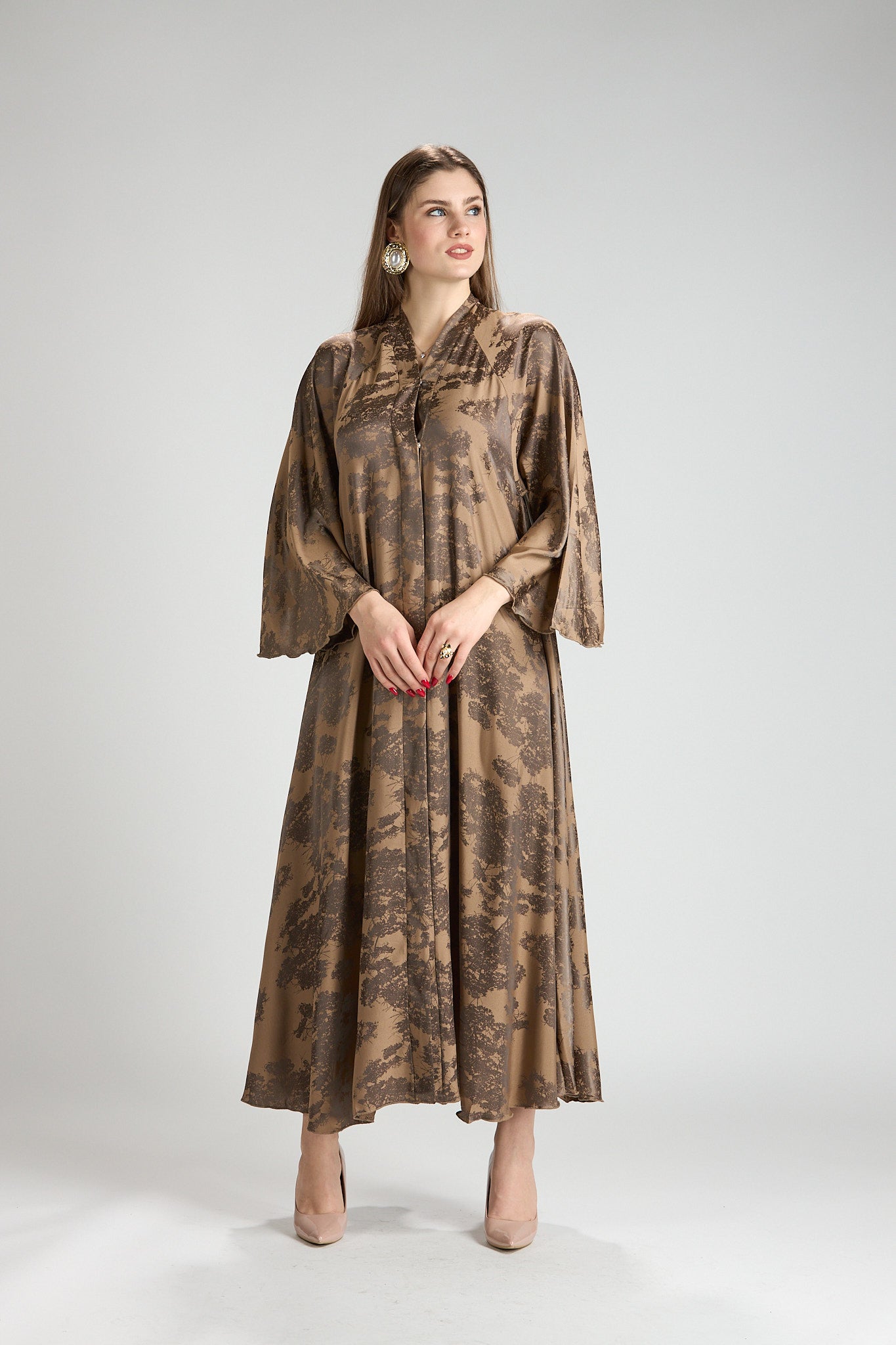 Inspired by earthy elegance and natural beauty, Reem Floral Abaya features a warm caramel base adorned with an artistic botanical print that adds depth and character. The fluid silhouette flows effortlessly, creating graceful movement while maintaining a refined, modest profile.