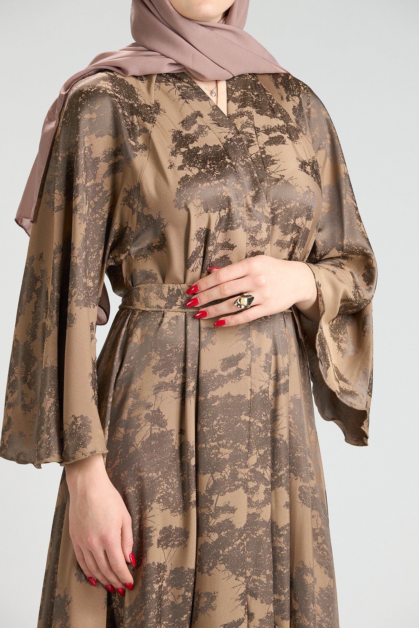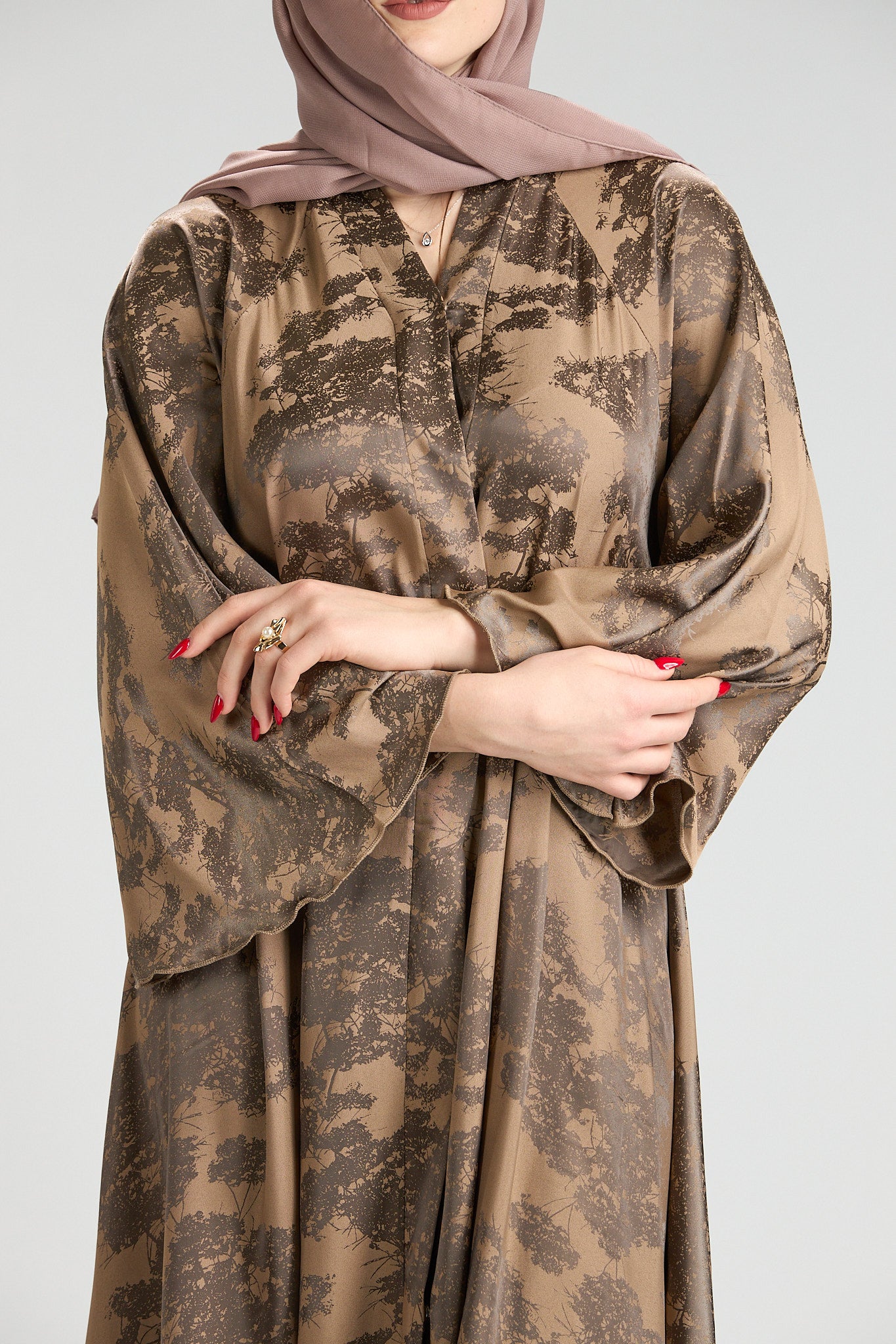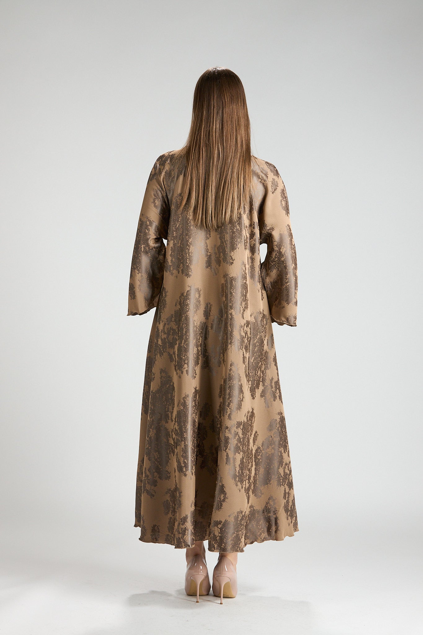 Inspired by earthy elegance and natural beauty, Reem Floral Abaya features a warm caramel base adorned with an artistic botanical print that adds depth and character. The fluid silhouette flows effortlessly, creating graceful movement while maintaining a refined, modest profile.