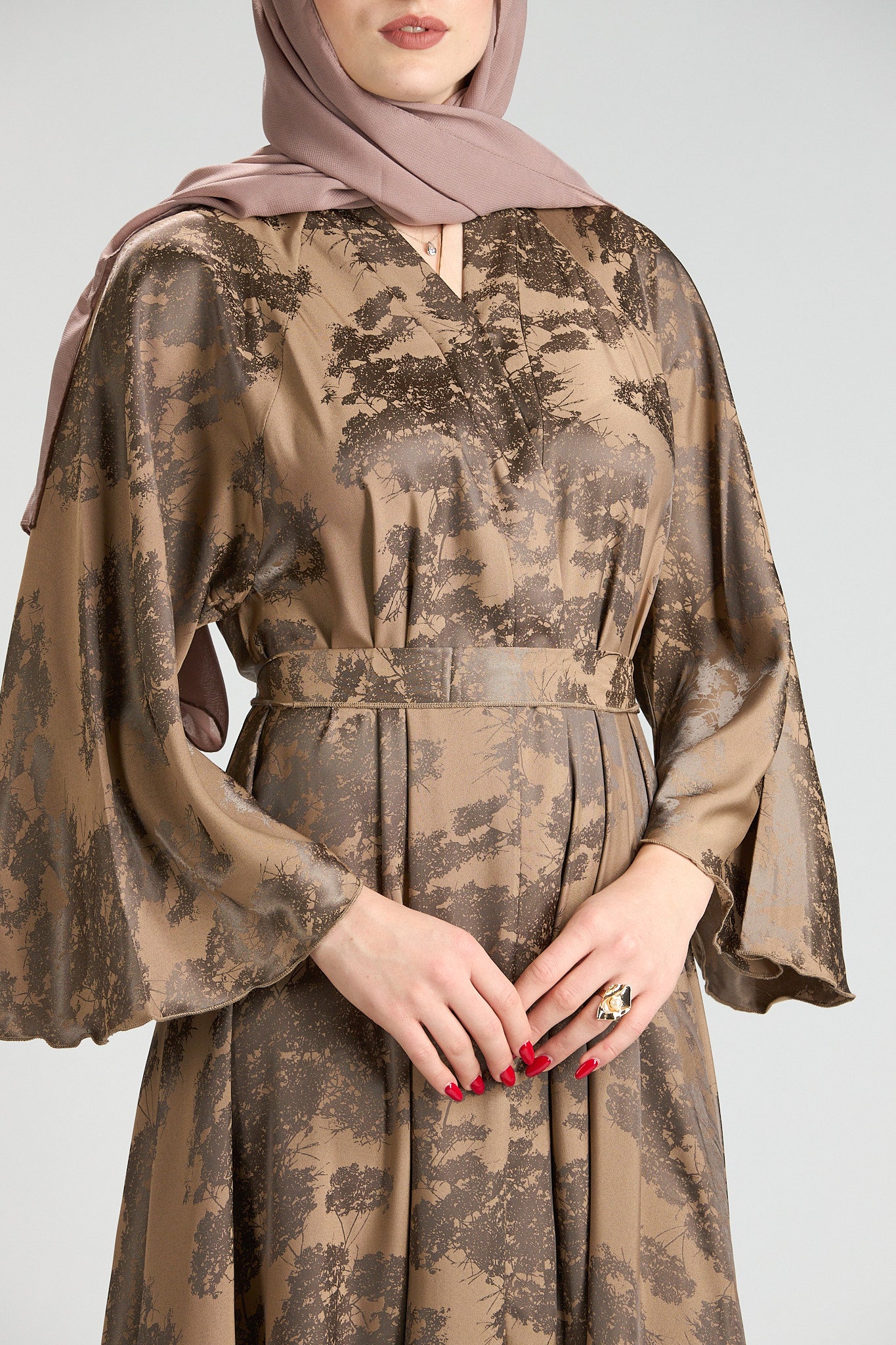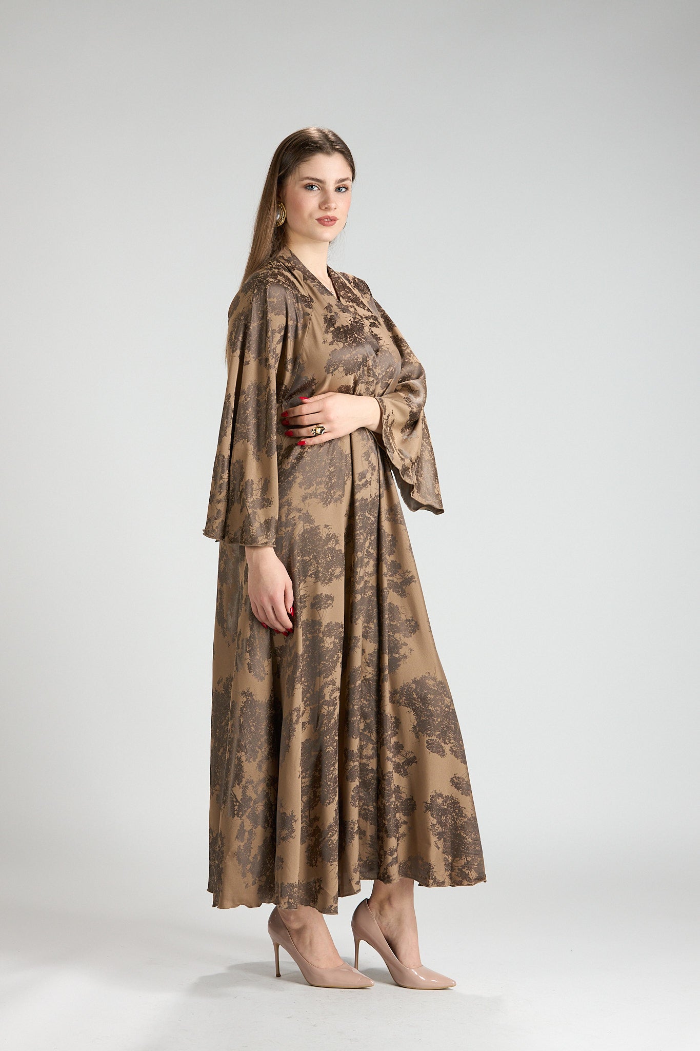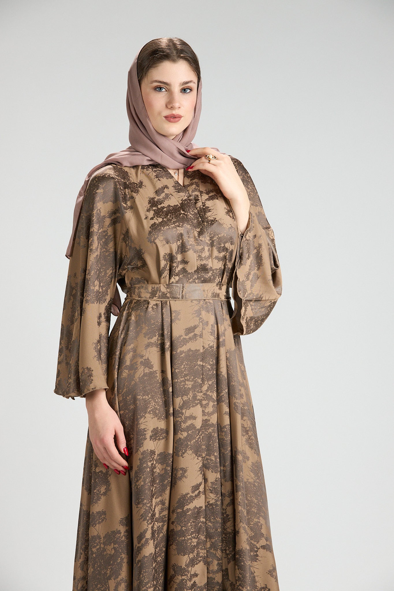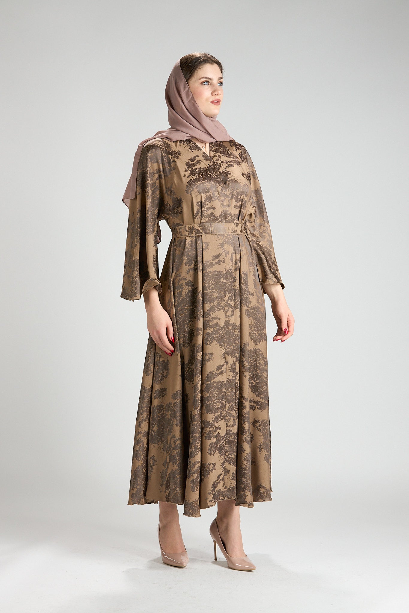 Inspired by earthy elegance and natural beauty, Reem Floral Abaya features a warm caramel base adorned with an artistic botanical print that adds depth and character. The fluid silhouette flows effortlessly, creating graceful movement while maintaining a refined, modest profile.