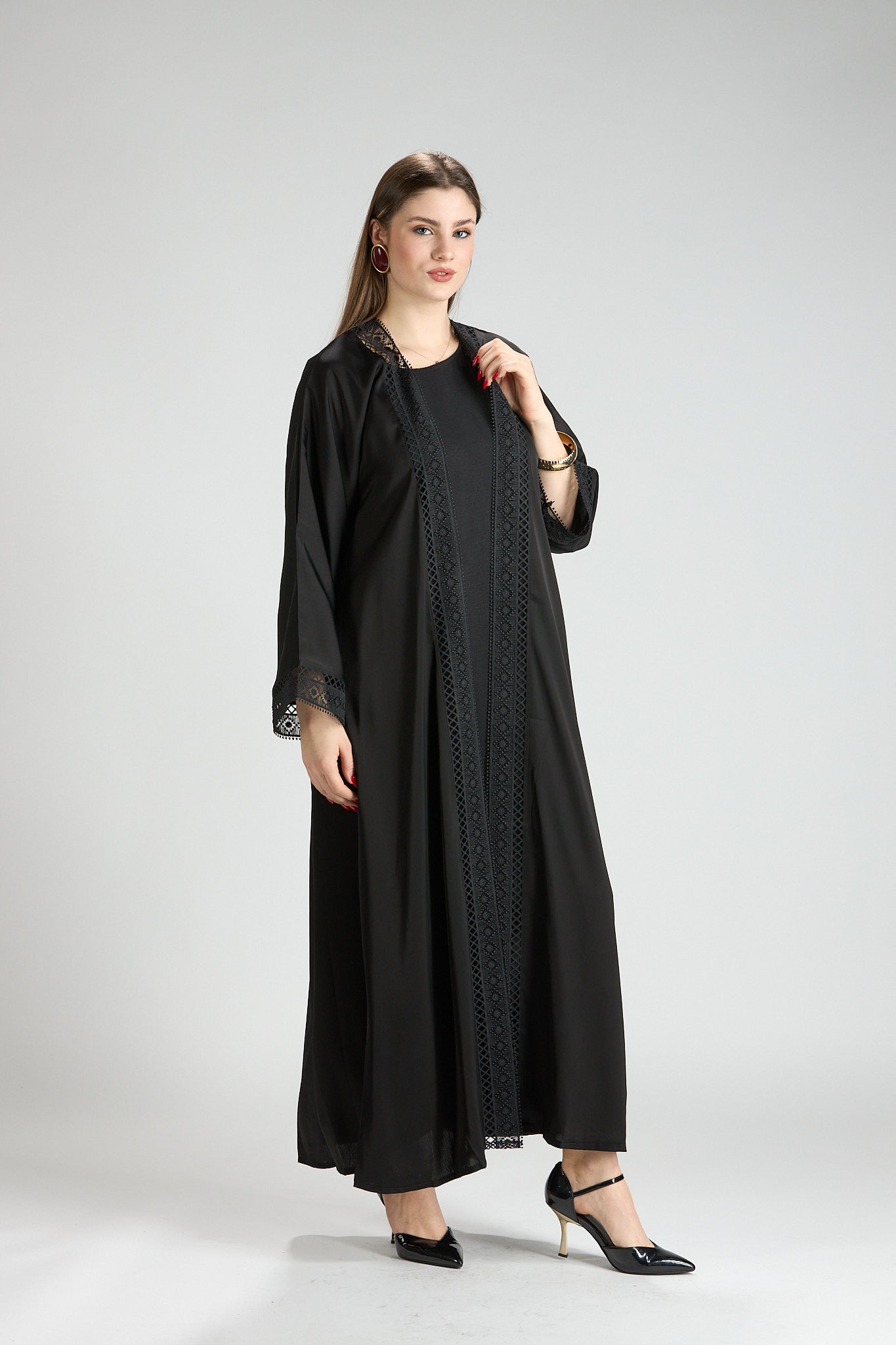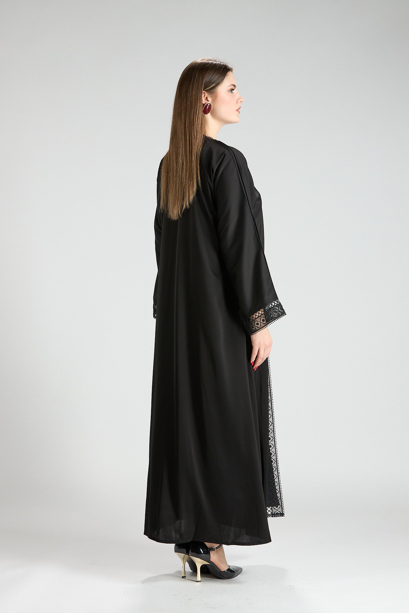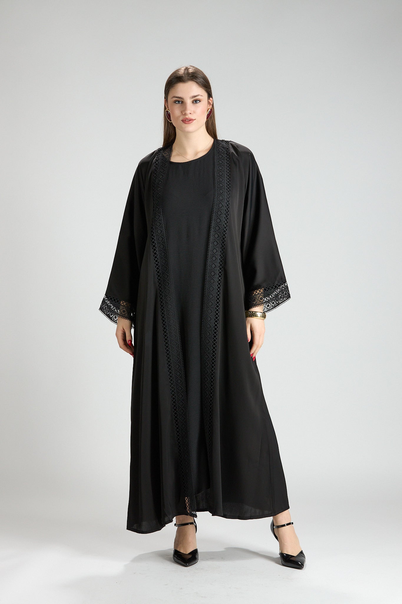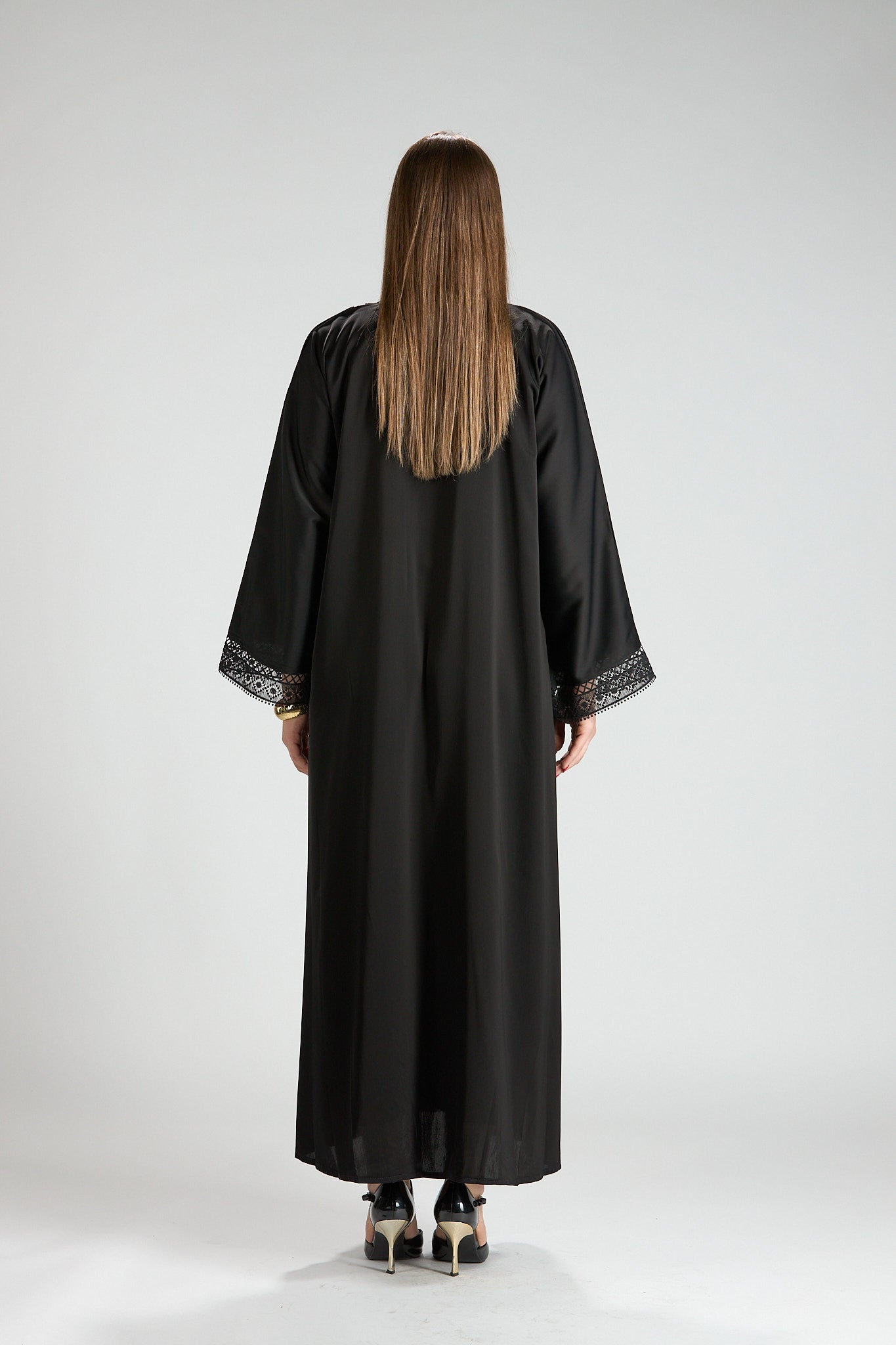 Designed with a fluid yet structured drape, this abaya offers graceful movement and all-day comfort. Its classic cut and refined details make it an ideal choice for formal occasions, evening gatherings, or polished daytime wear.