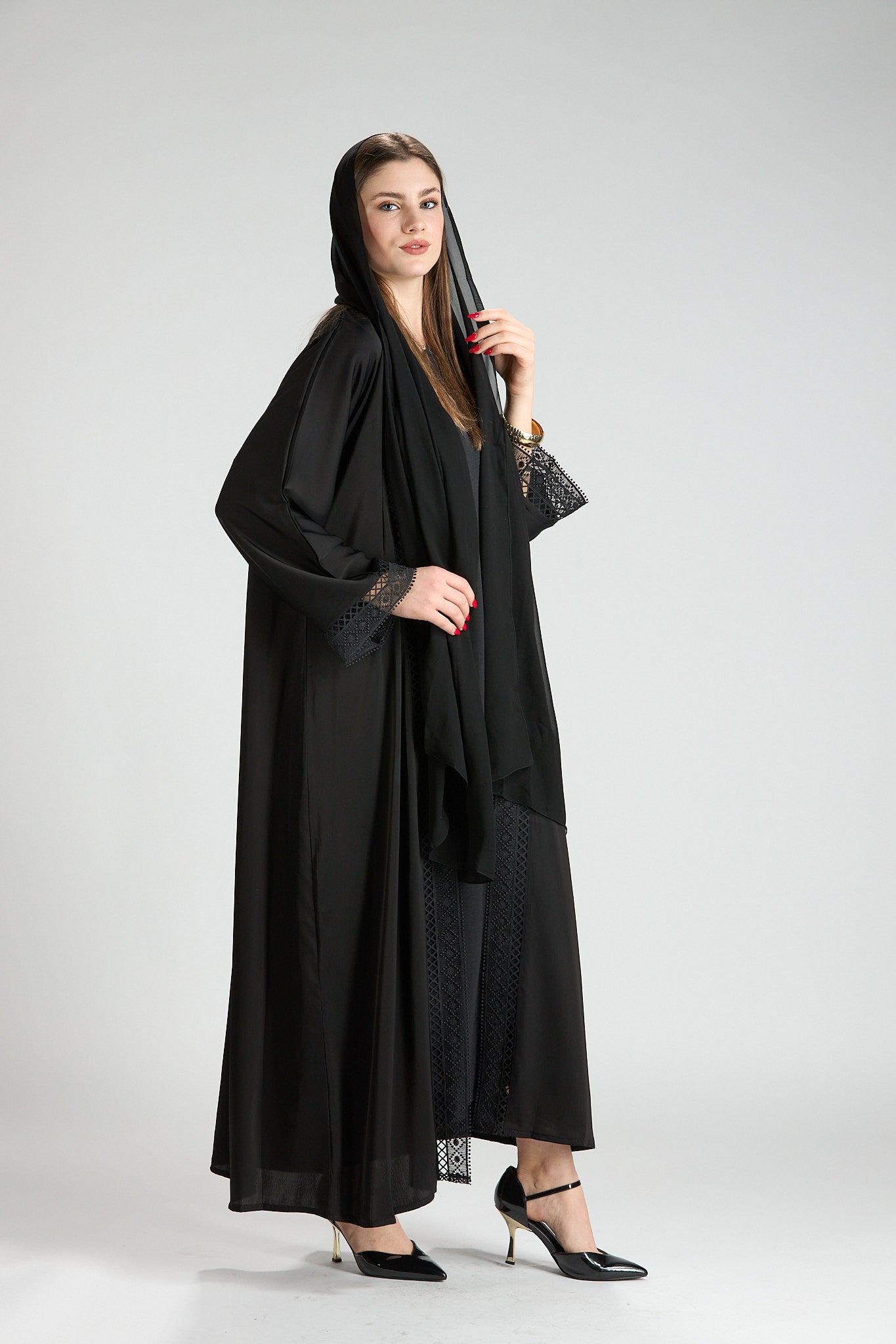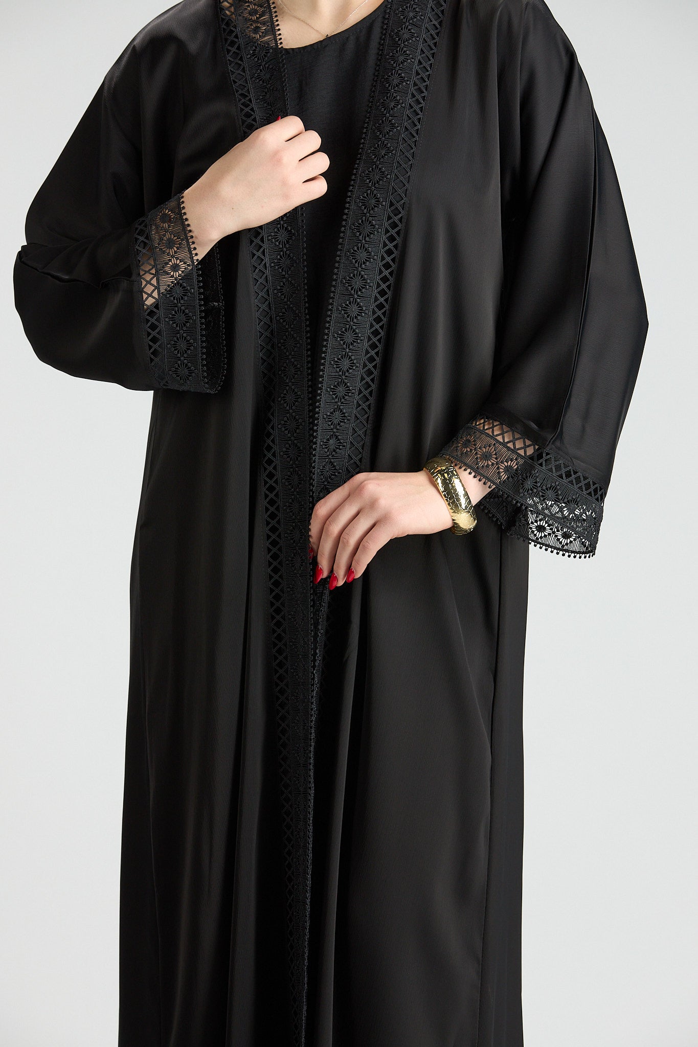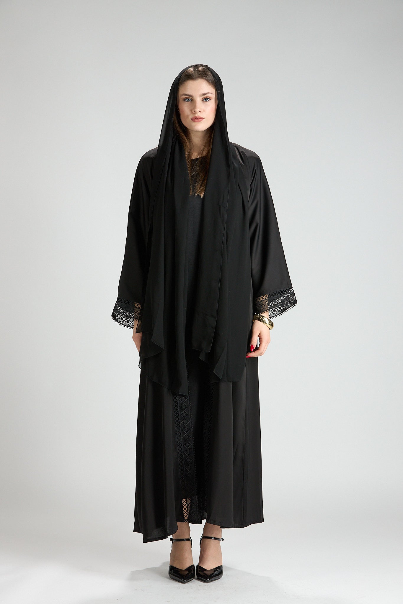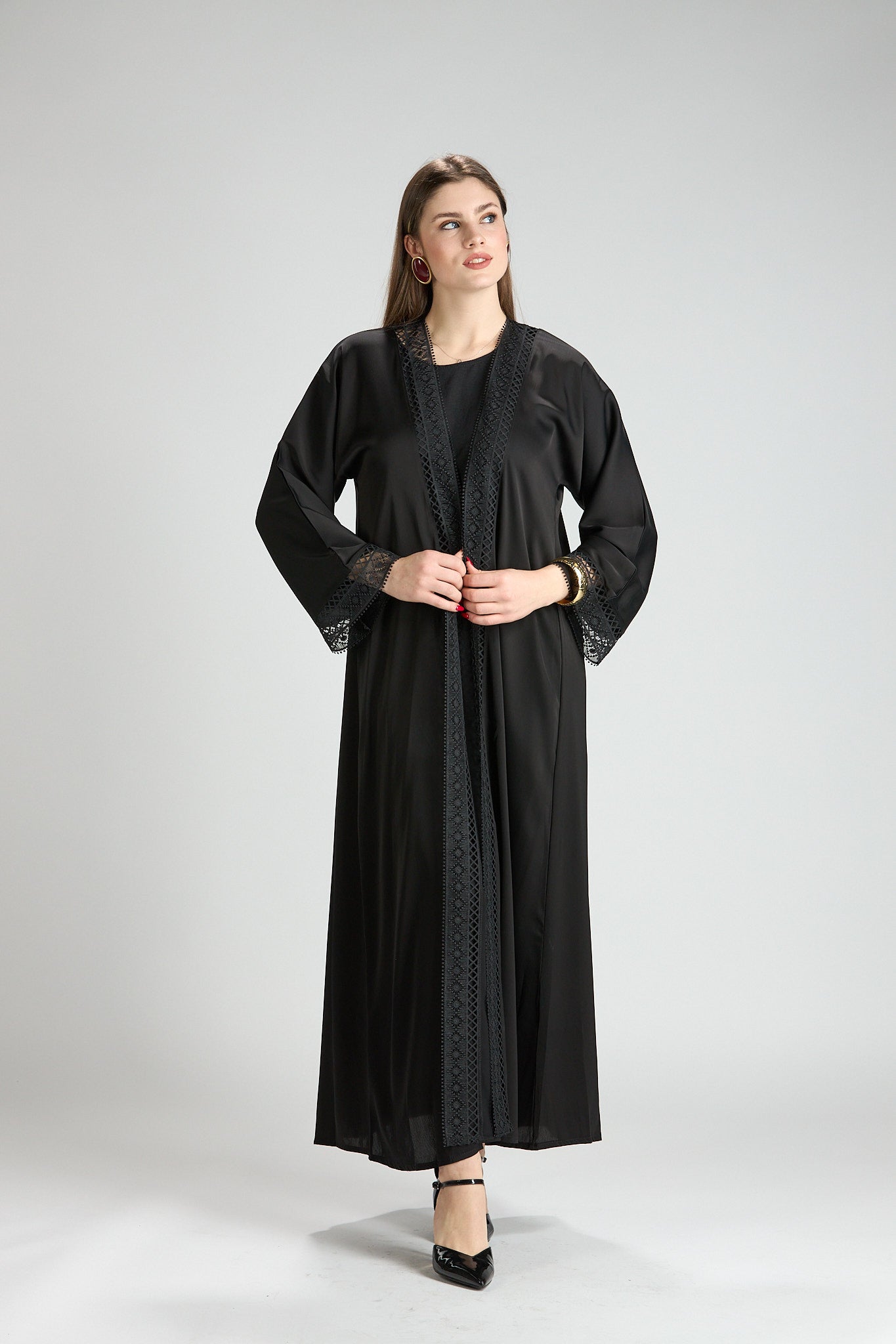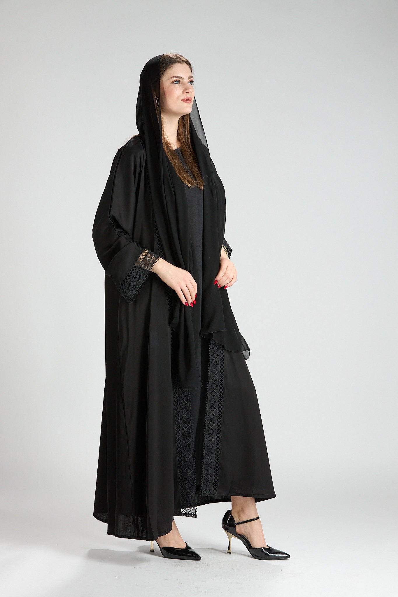 Designed with a fluid yet structured drape, this abaya offers graceful movement and all-day comfort. Its classic cut and refined details make it an ideal choice for formal occasions, evening gatherings, or polished daytime wear.