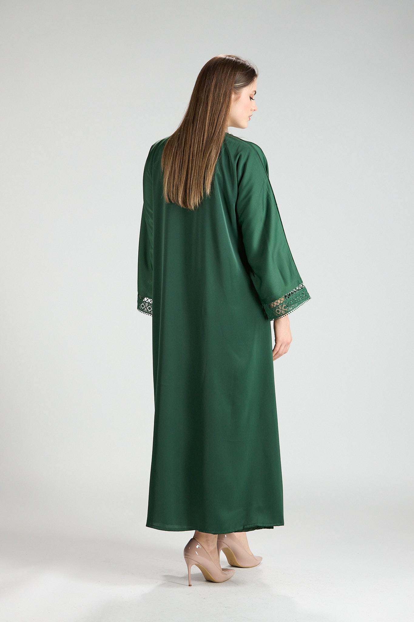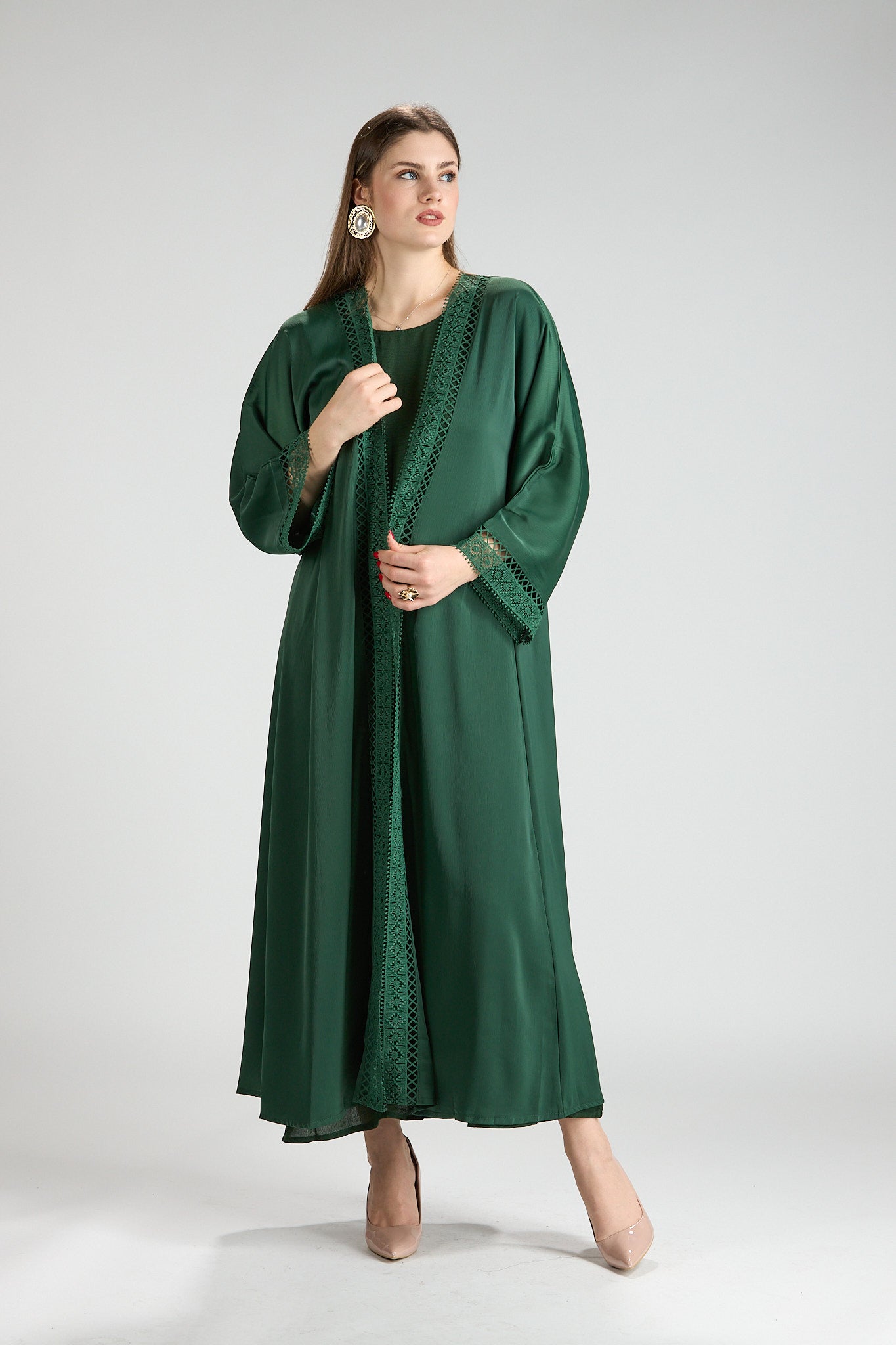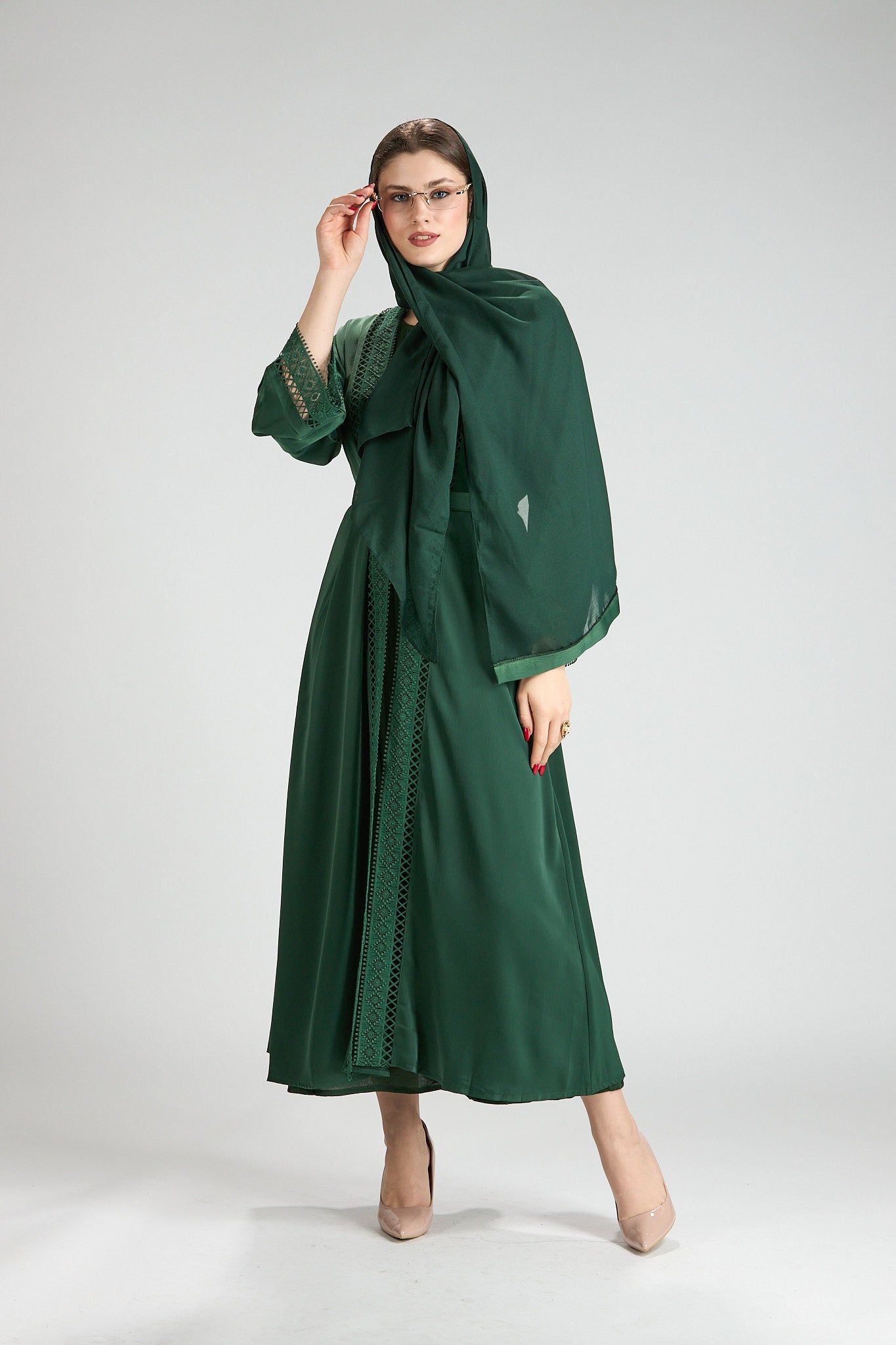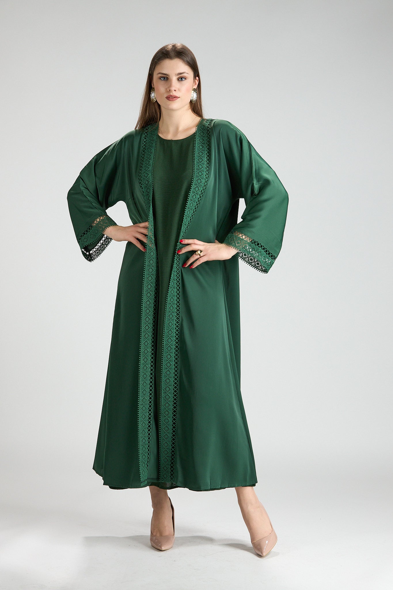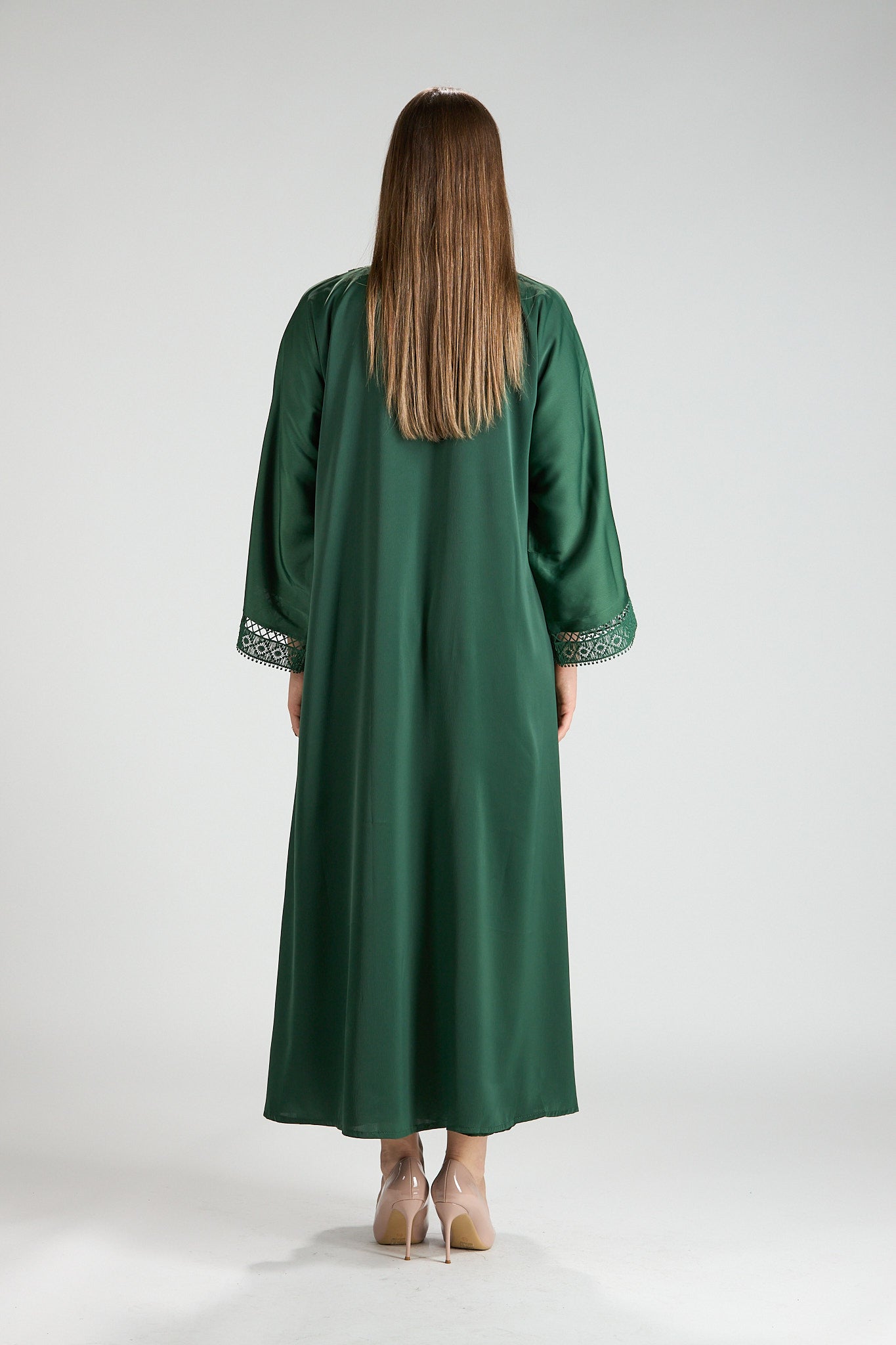 Sophisticated and timeless, Rena Abaya is crafted in a rich green hue accented with intricate embroidered detailing along the front and sleeves. The delicate embroidery adds depth and refinement, elevating the design while maintaining a clean, elegant silhouette.