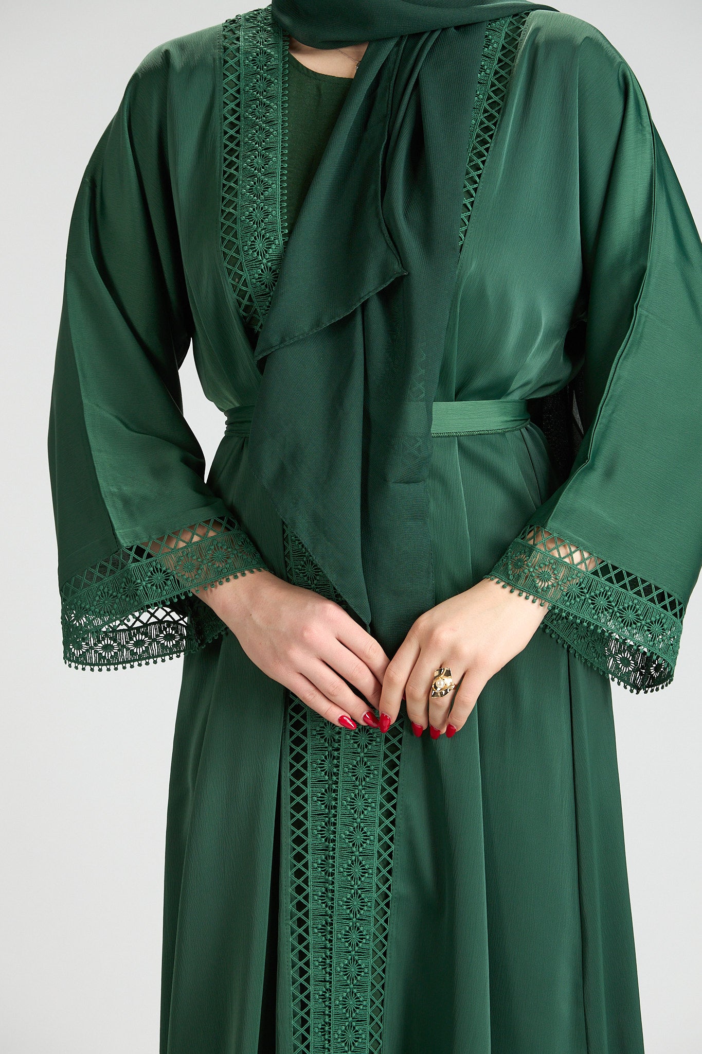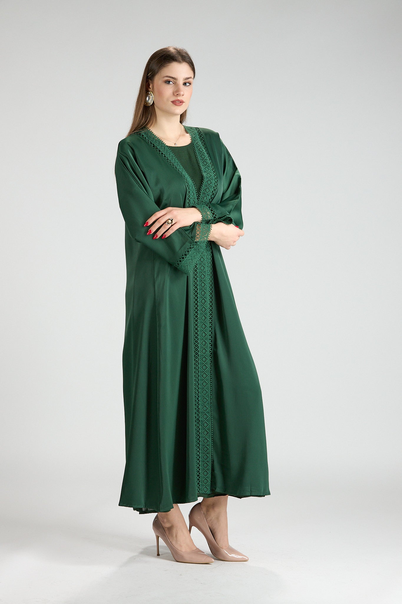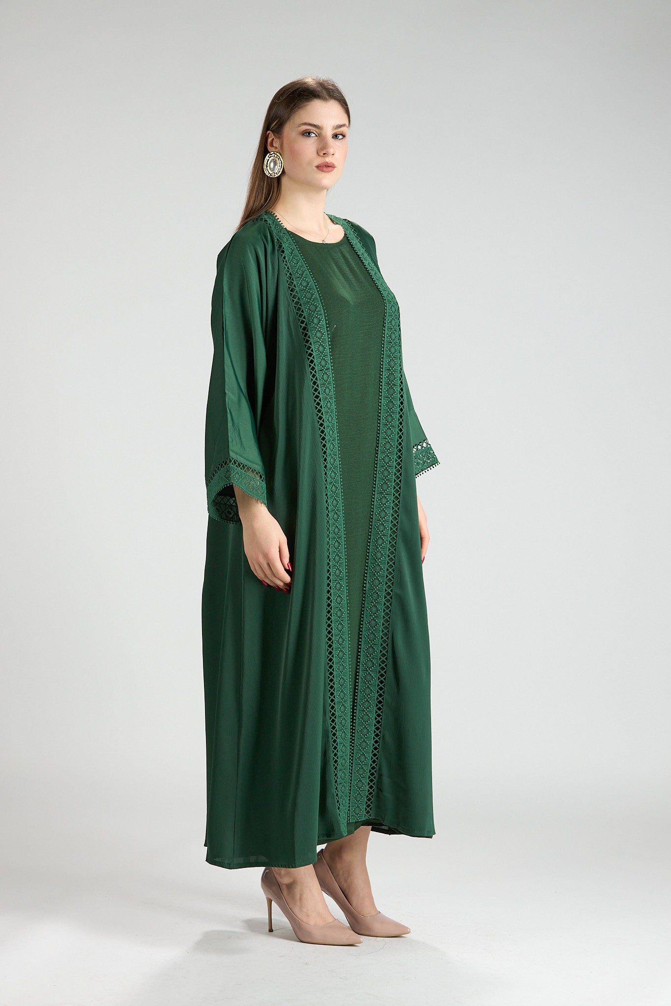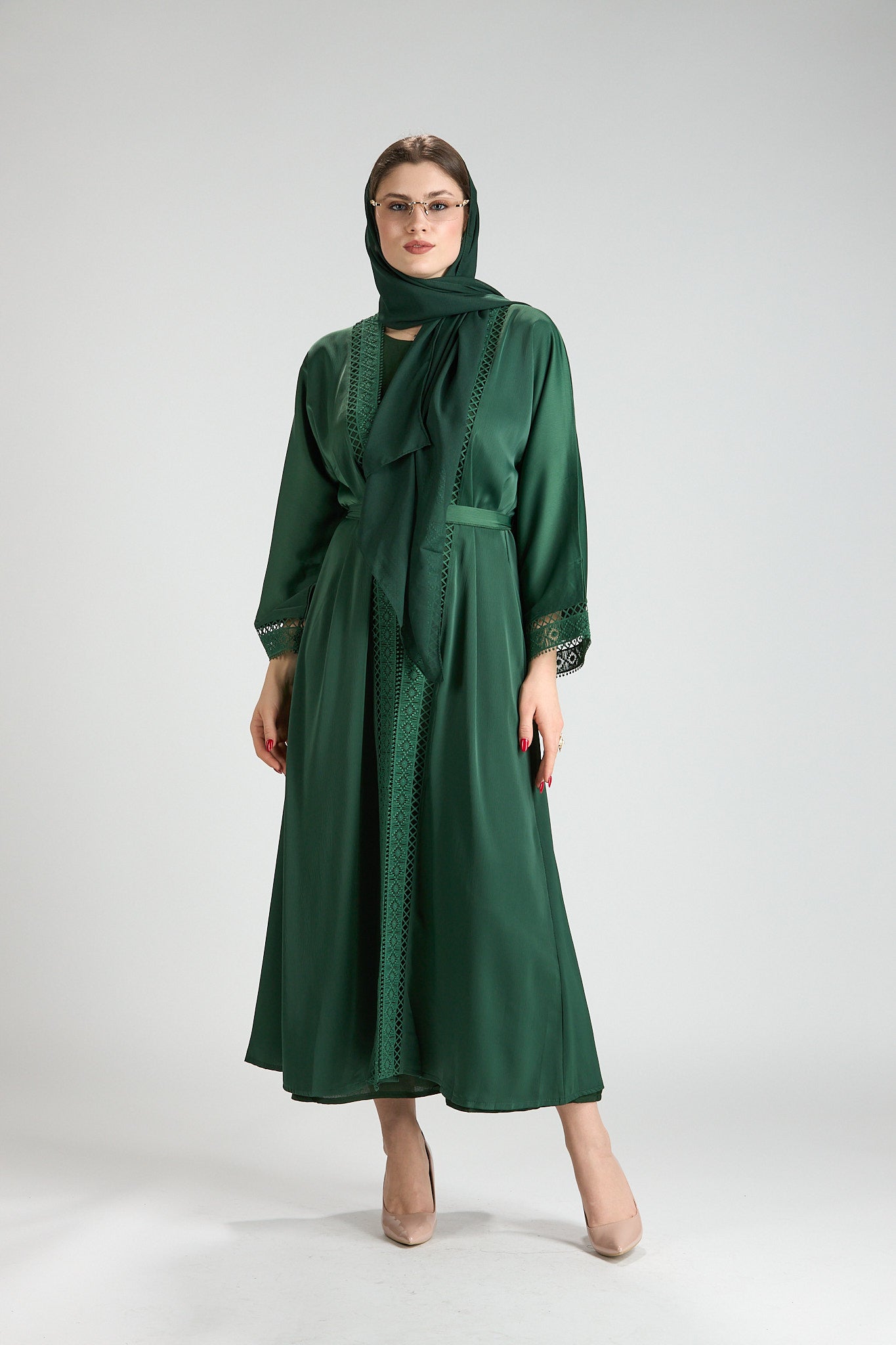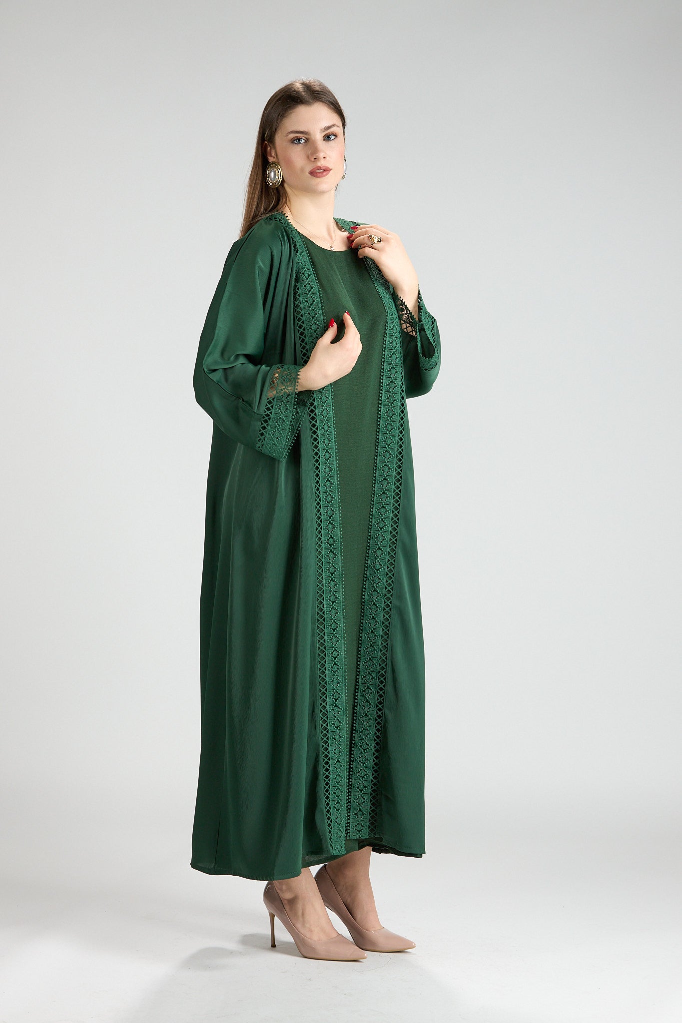 Sophisticated and timeless, Rena Abaya is crafted in a rich green hue accented with intricate embroidered detailing along the front and sleeves. The delicate embroidery adds depth and refinement, elevating the design while maintaining a clean, elegant silhouette.