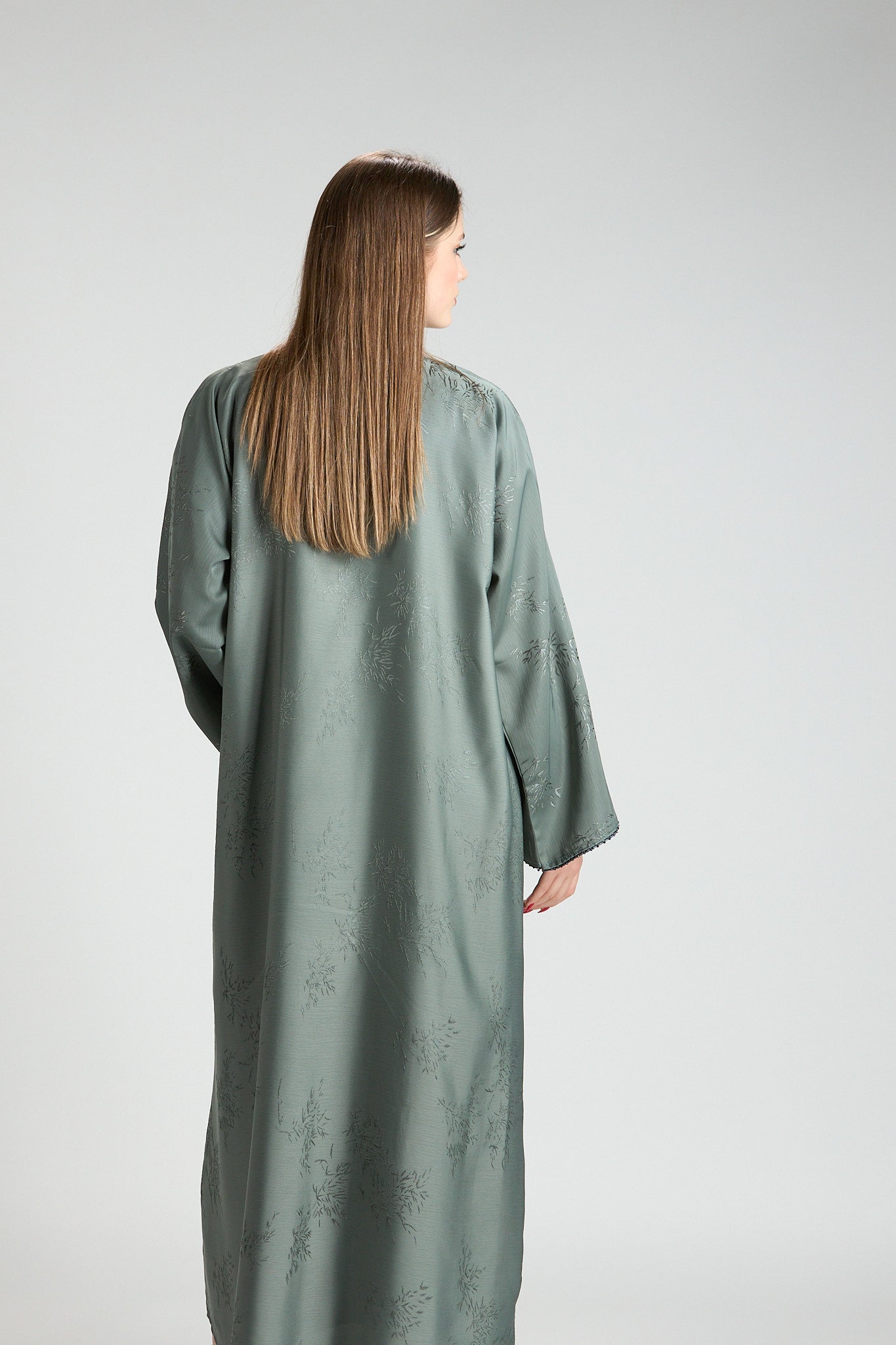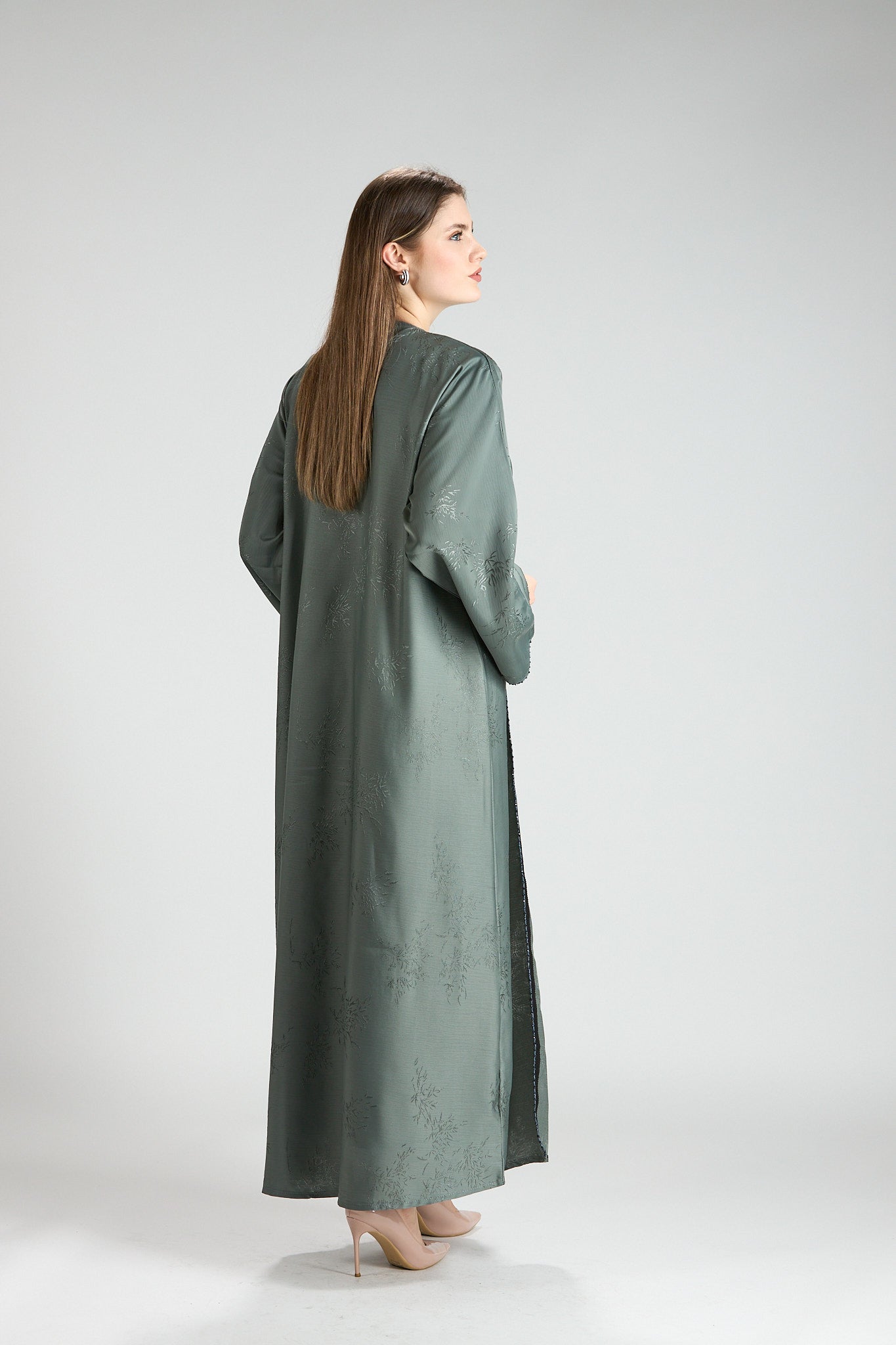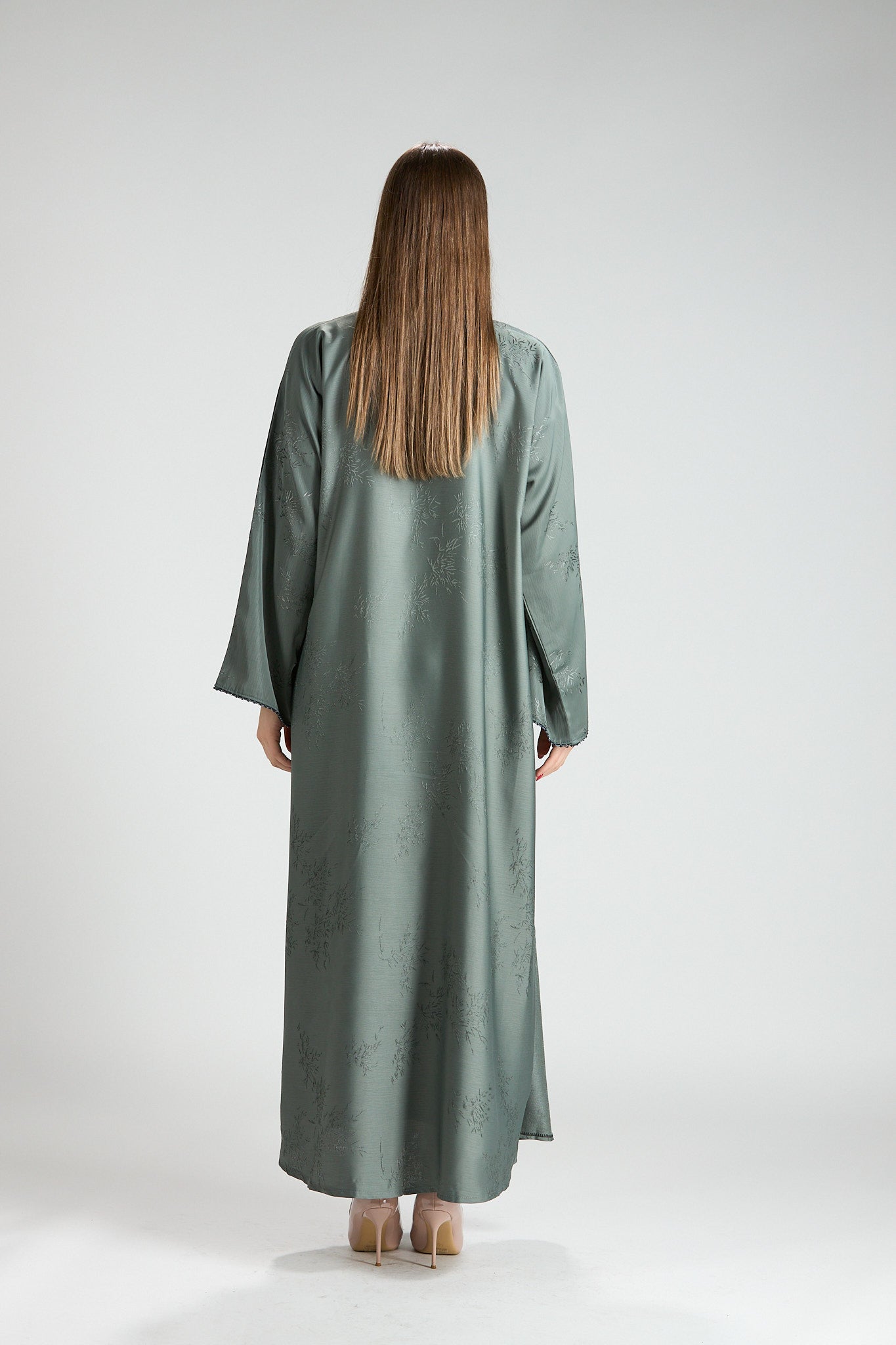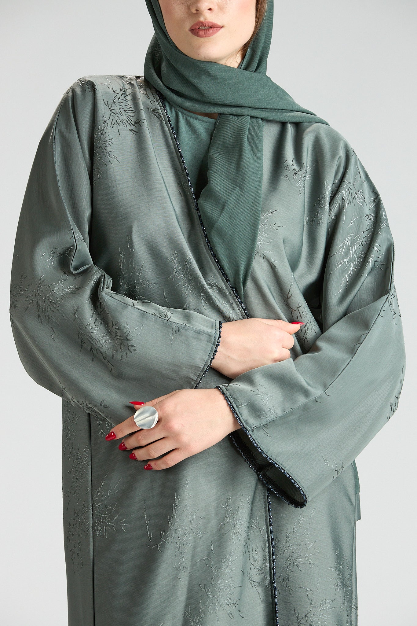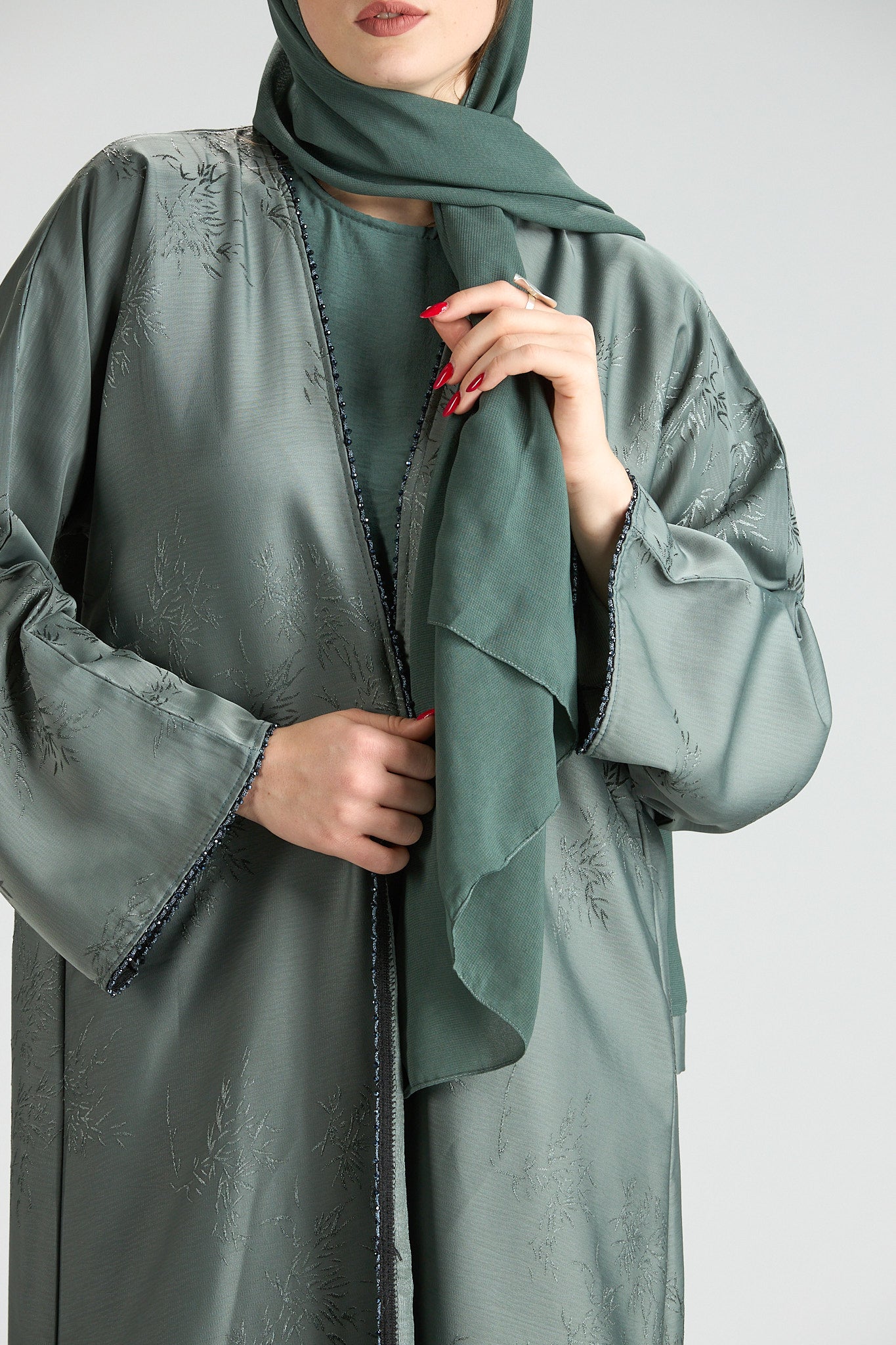 Refined and effortlessly graceful, The Sage Whisper Abaya is crafted in a muted sage-green hue with delicate jacquard detailing that adds depth and quiet sophistication. The flowing open-front silhouette drapes beautifully over a smooth inner layer, creating a look that is both polished and serene.