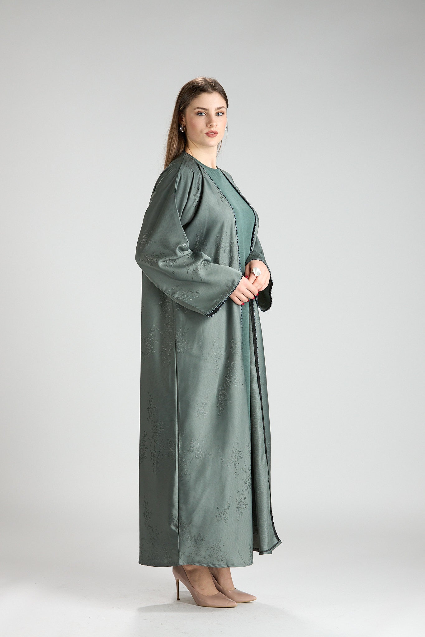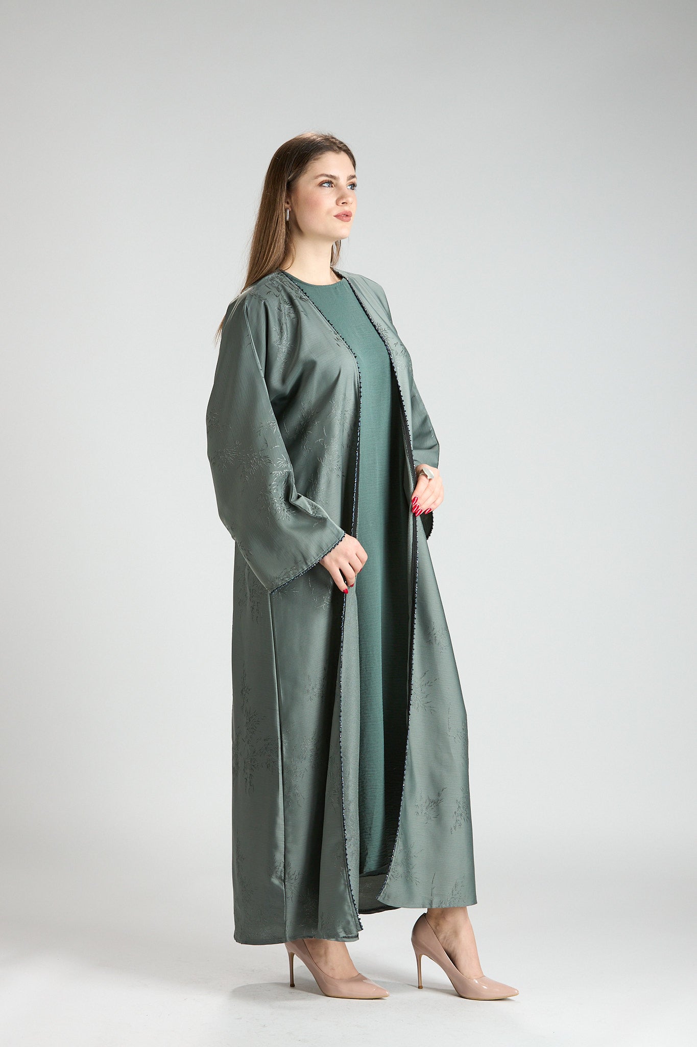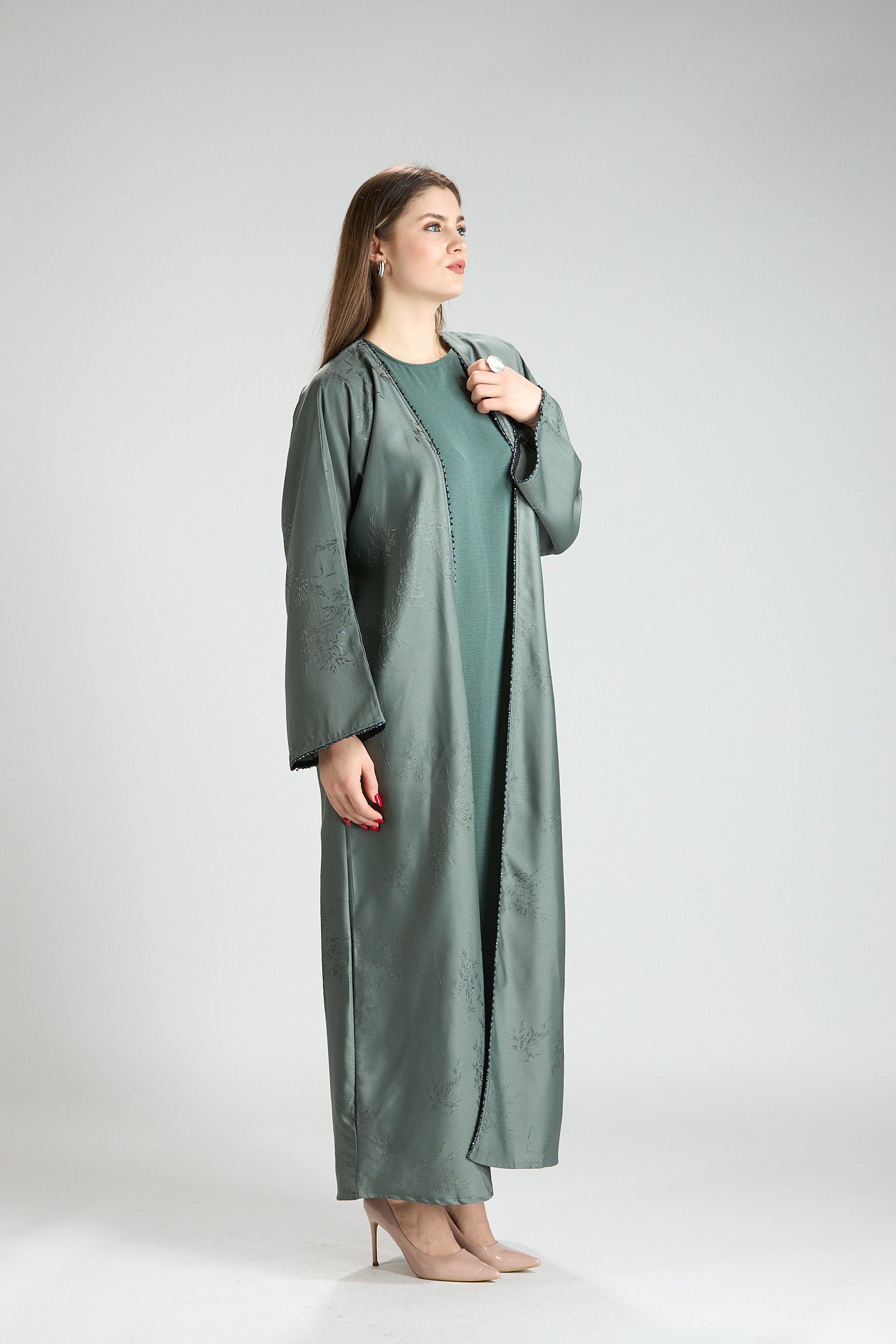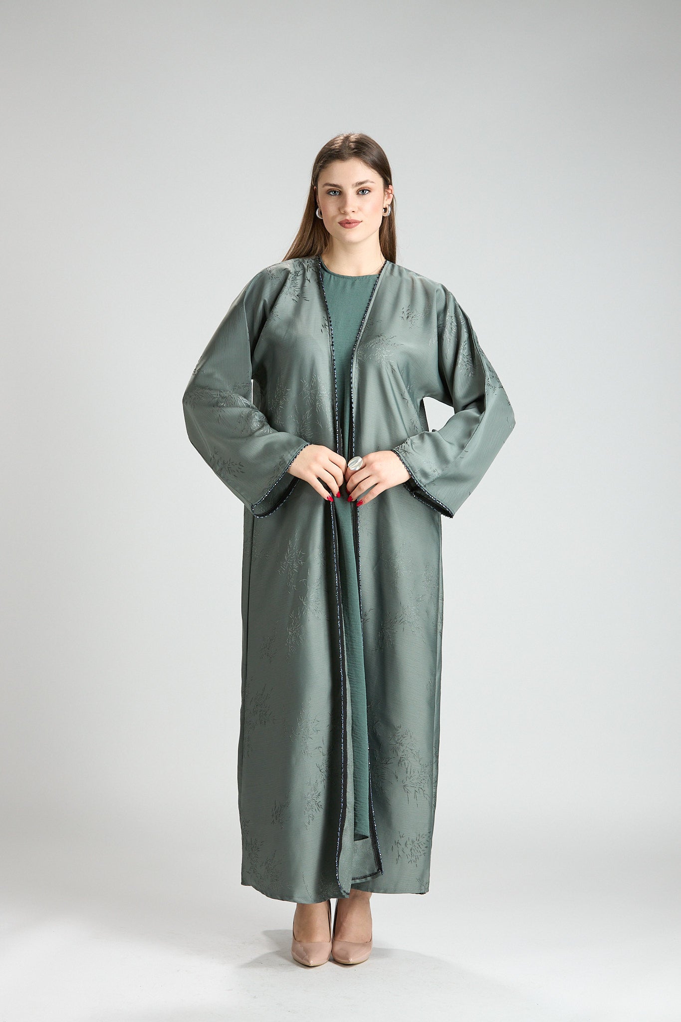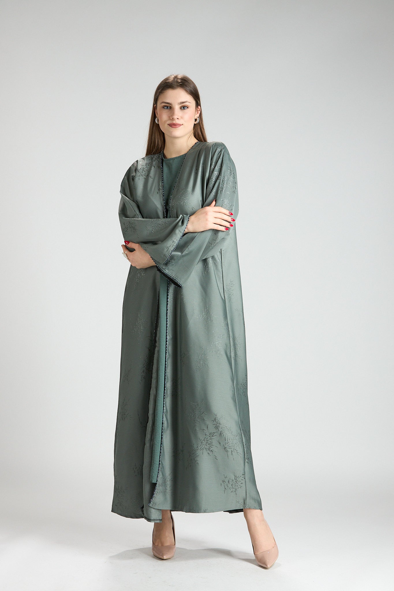 Refined and effortlessly graceful, The Sage Whisper Abaya is crafted in a muted sage-green hue with delicate jacquard detailing that adds depth and quiet sophistication. The flowing open-front silhouette drapes beautifully over a smooth inner layer, creating a look that is both polished and serene.