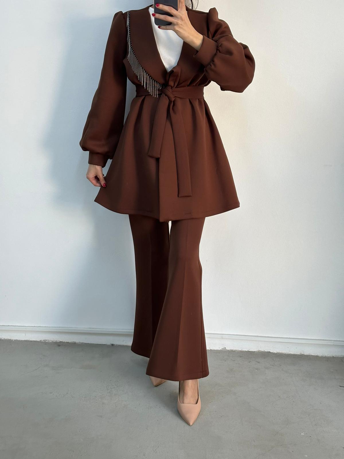 BROWN BEADED COLLAR W TIE WAIST TWO PIECE SUIT