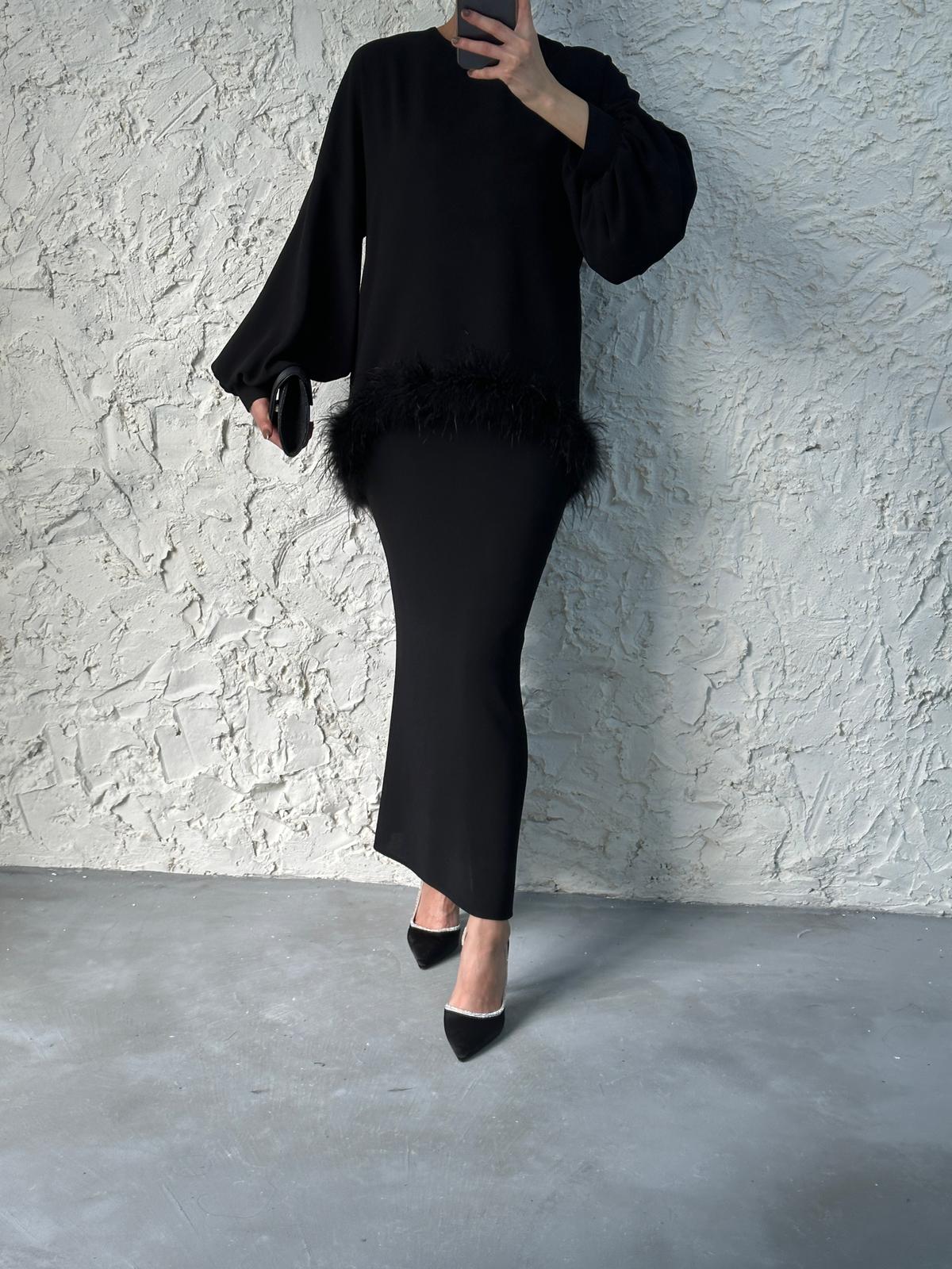 A Sophisticated design with a luxurious furline running down the center. This elegant dress combines classic modesty with a touch of timeless charm, making it a perfect choice for those seeking a unique and fashion-forward yet modest outfit.