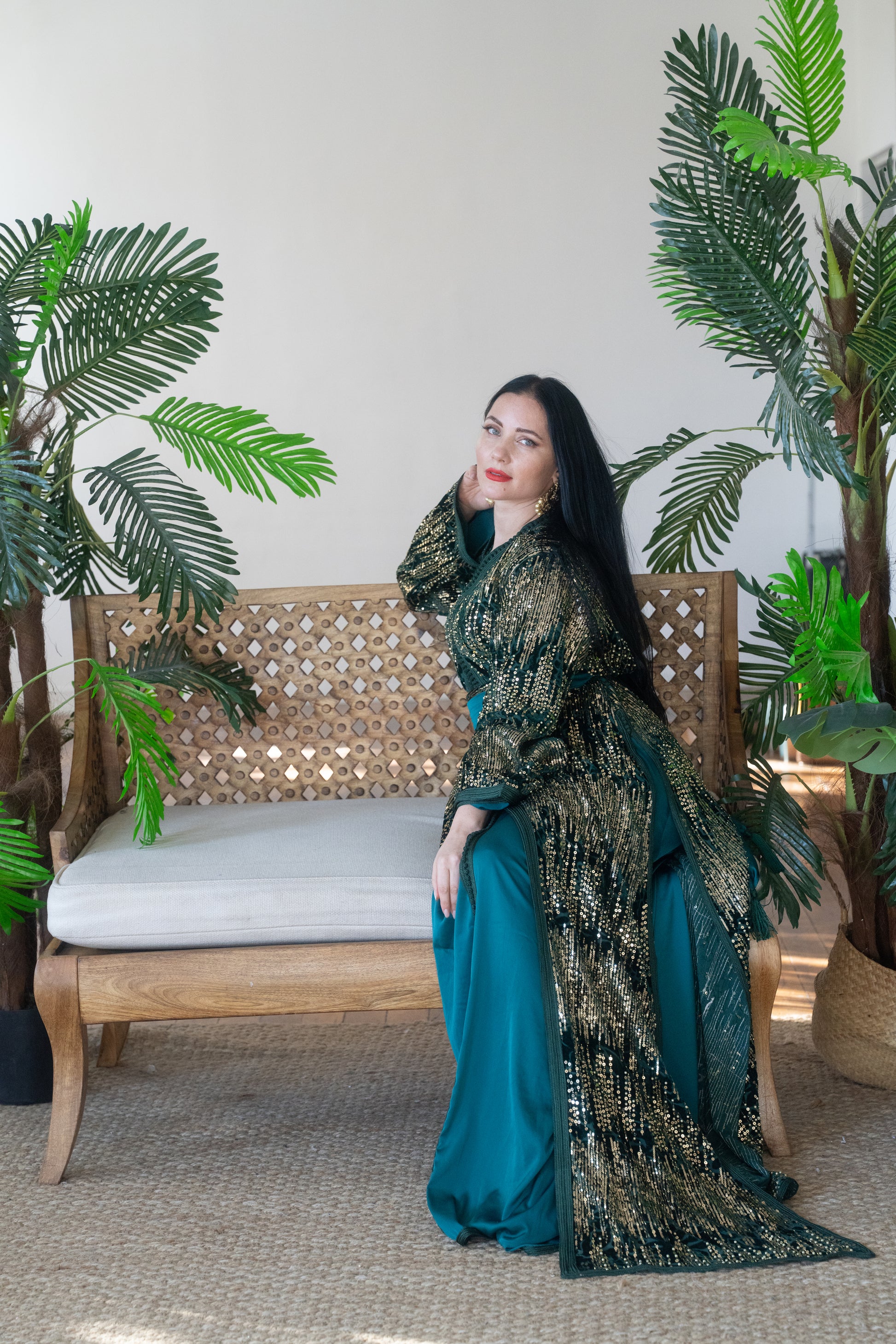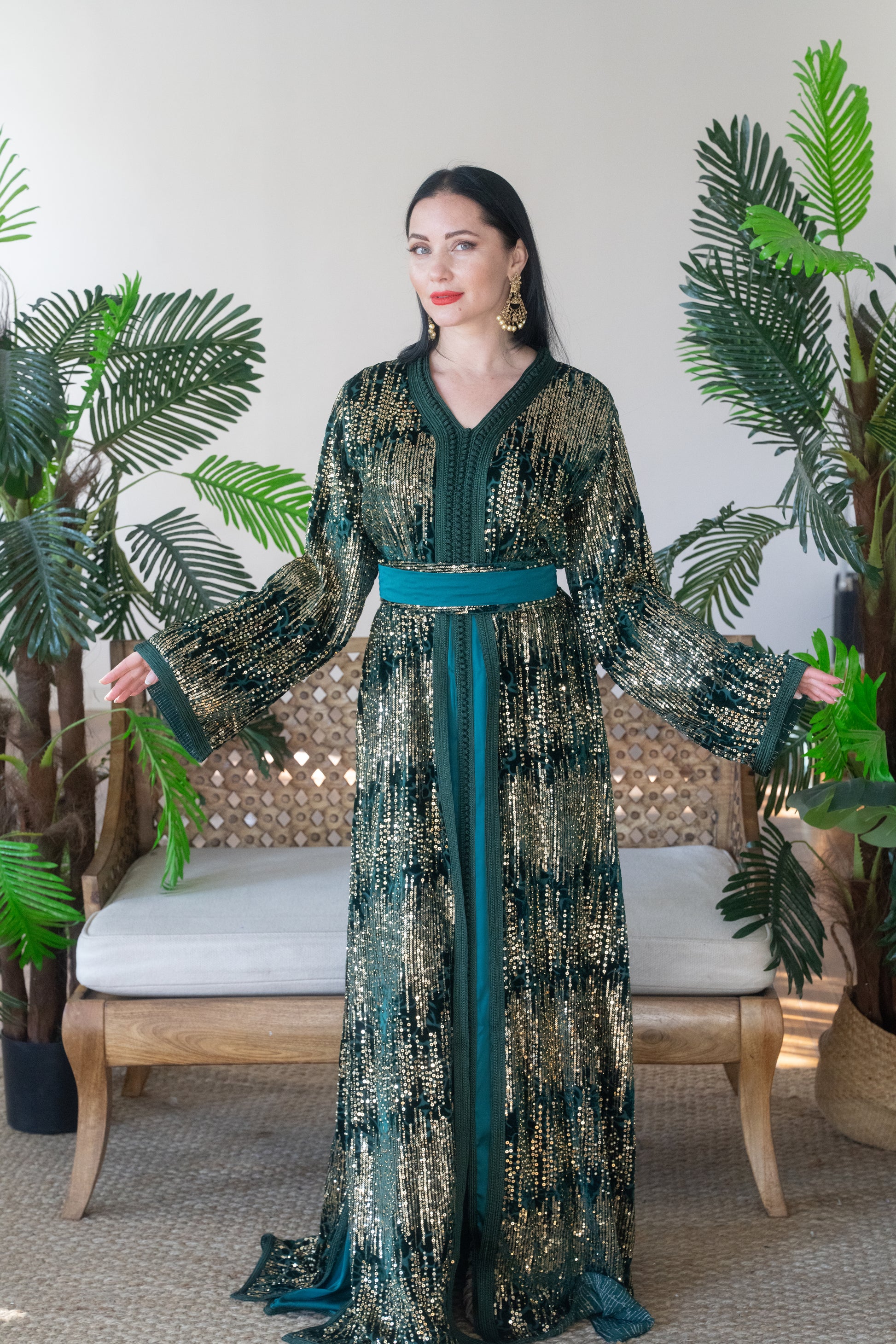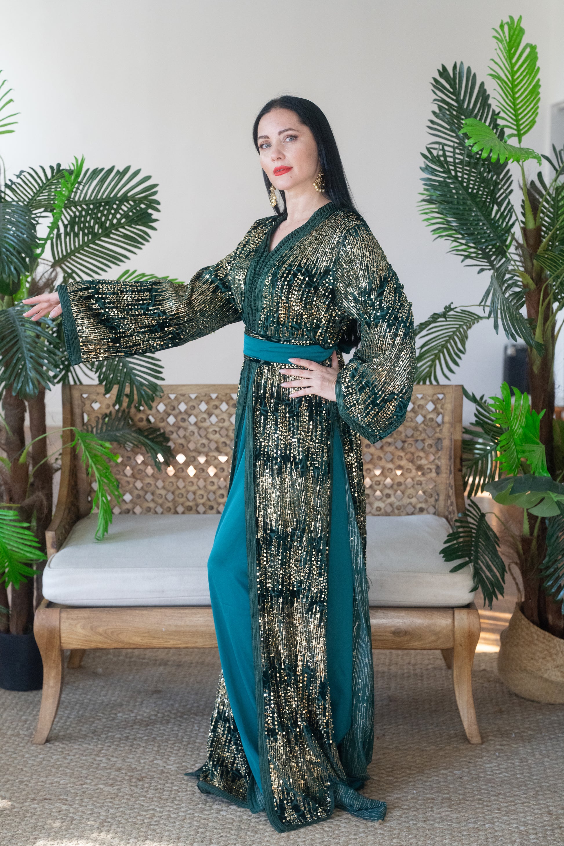 Make an unforgettable entrance in this emerald green caftan, adorned with luxurious gold sequin detailing that radiates sophistication and glamour. The design features wide embroidered sleeves, a matching satin belt, and a graceful layered silhouette that moves effortlessly with every step.