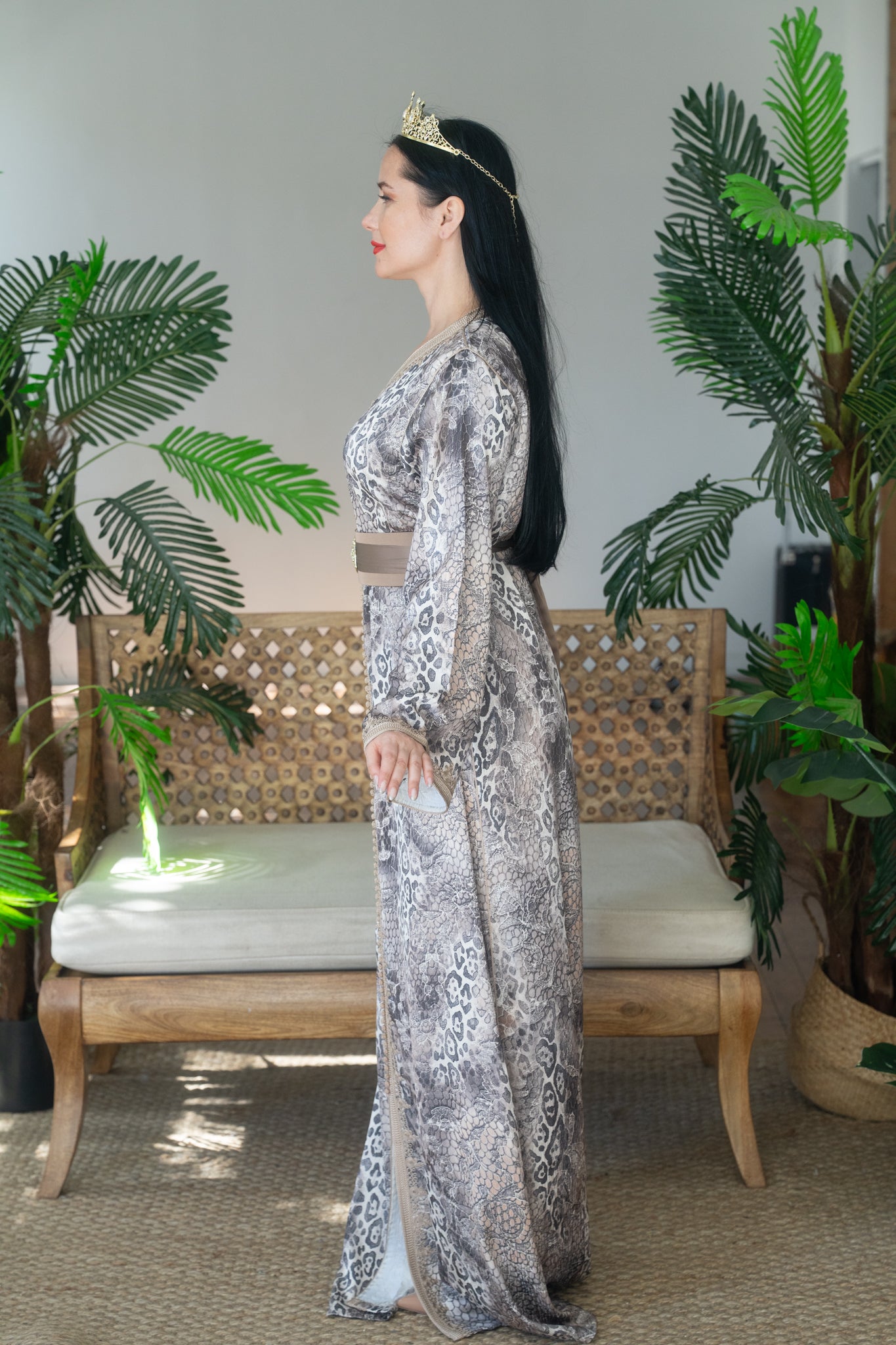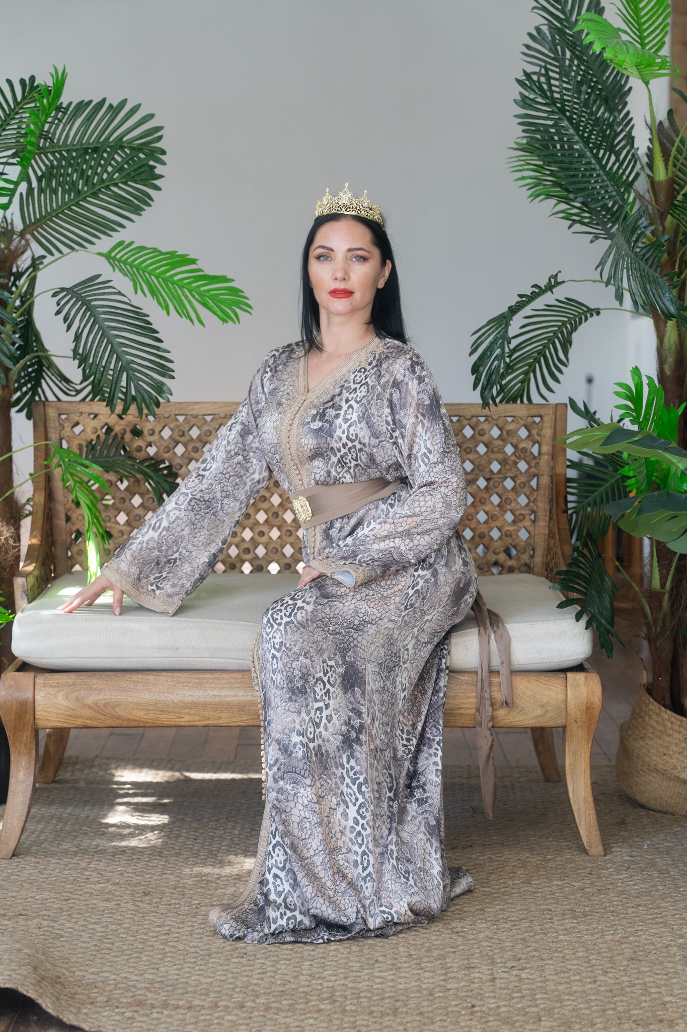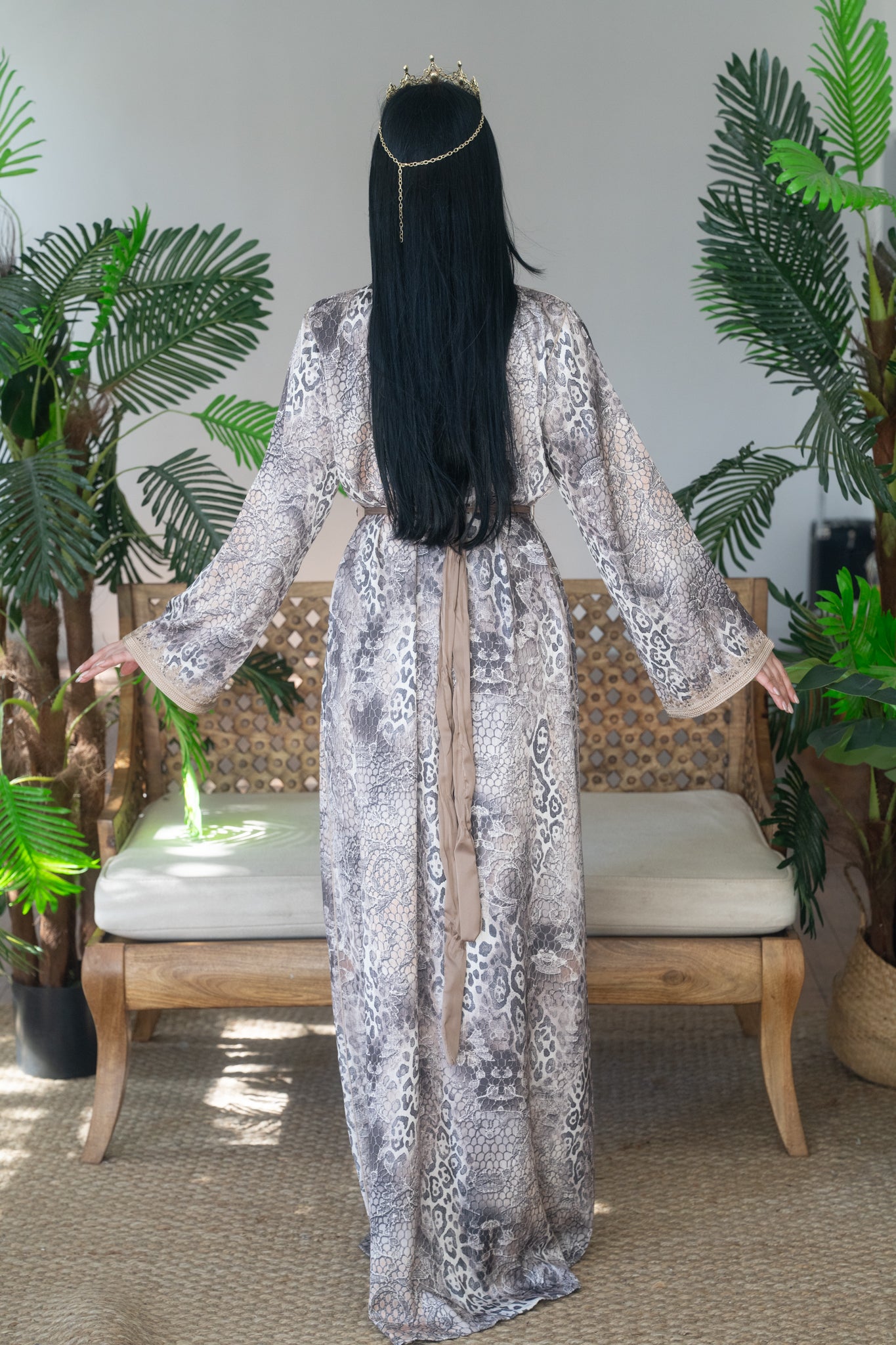 Bold, elegant, and full of presence — this Luxury Animal Print Caftan blends soft neutral tones with a striking snakeskin & leopard-inspired pattern. Crafted from a lightweight flowing fabric, it drapes effortlessly while maintaining a refined and polished look. The tonal beige embroidery framing the neckline, sleeves, and front adds depth and sophistication. Finished with a coordinating belt with a gold statement buckle, this caftan beautifully defines the waist while keeping a comfortable fit.