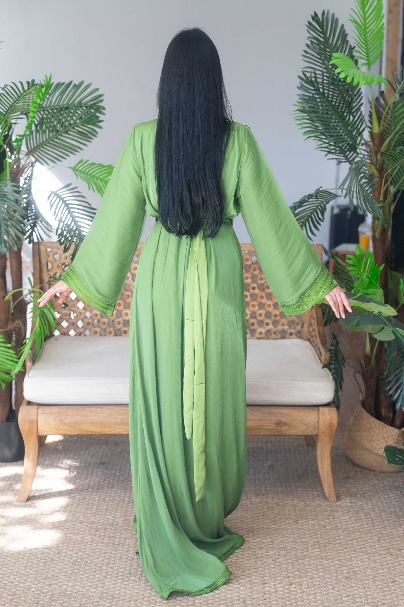 A graceful blend of softness and richness, this Olive Silk Caftan flows effortlessly with every step. Crafted from a lightweight, silky fabric with a natural sheen, it features tone-on-tone embroidery along the neckline, sleeves, and front for a refined and elevated look. The wide bell sleeves offer beautiful movement, while the matching belt with gold centerpiece buckle gently shapes the waist for an elegant, flattering silhouette.