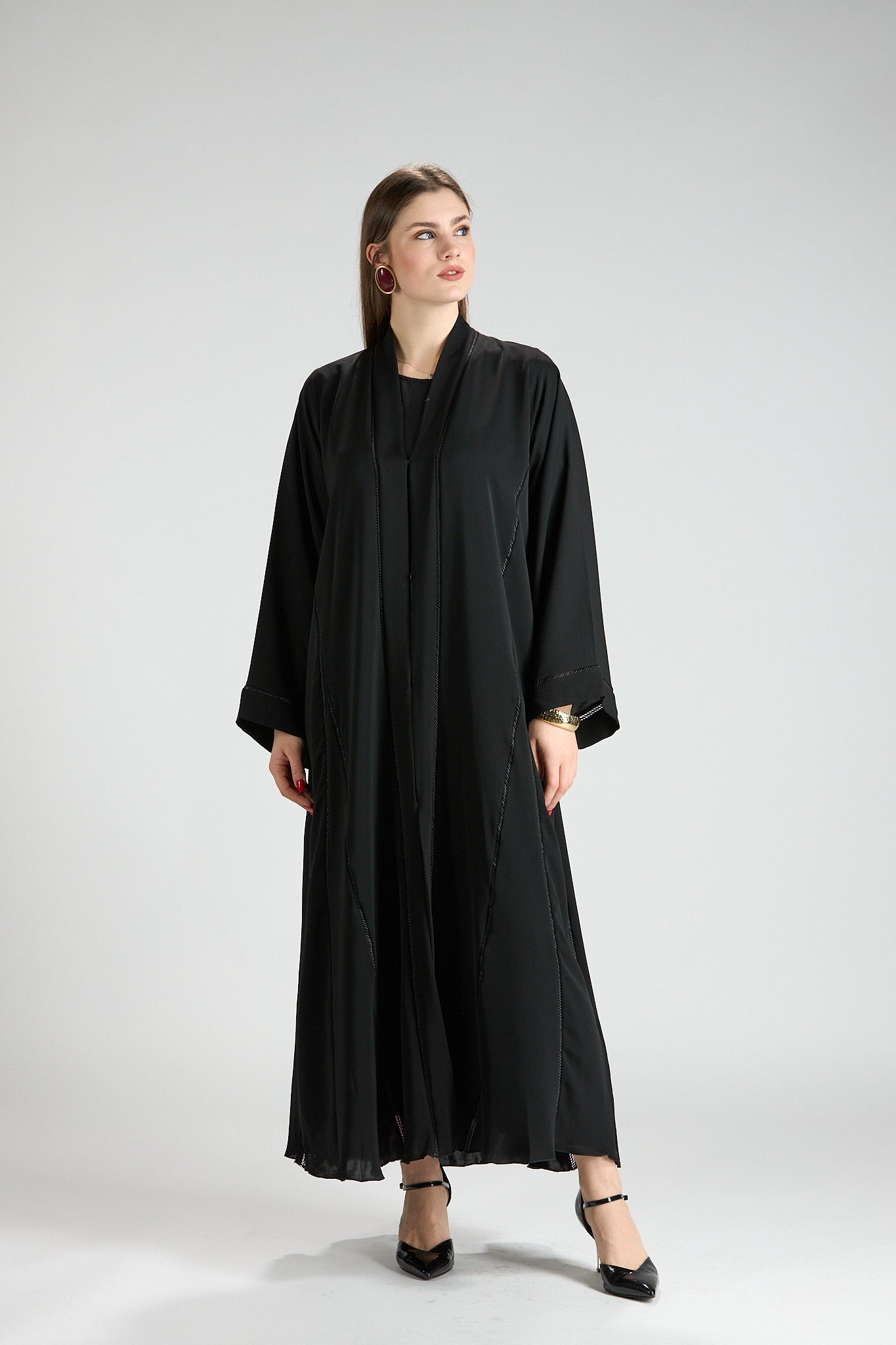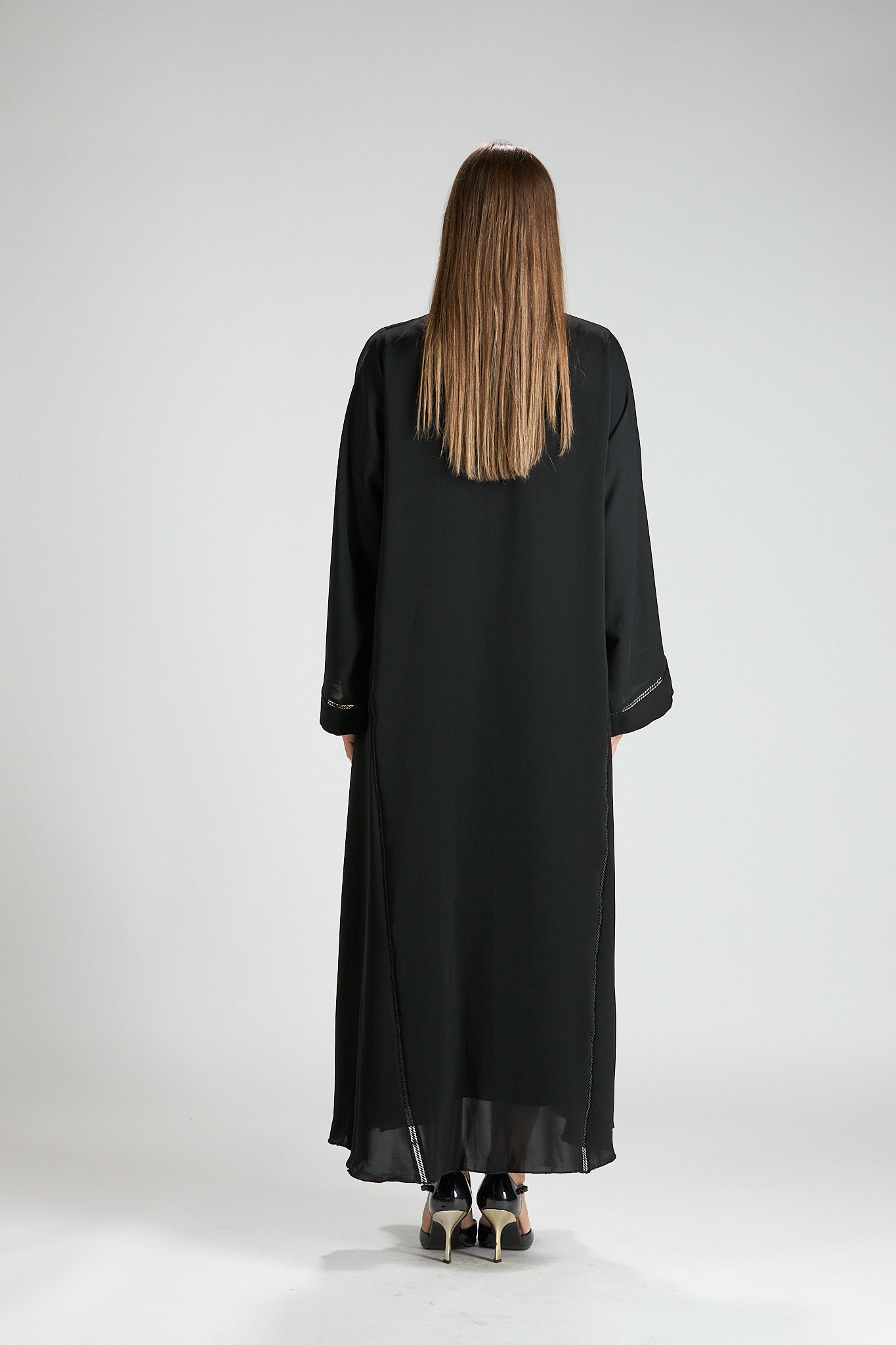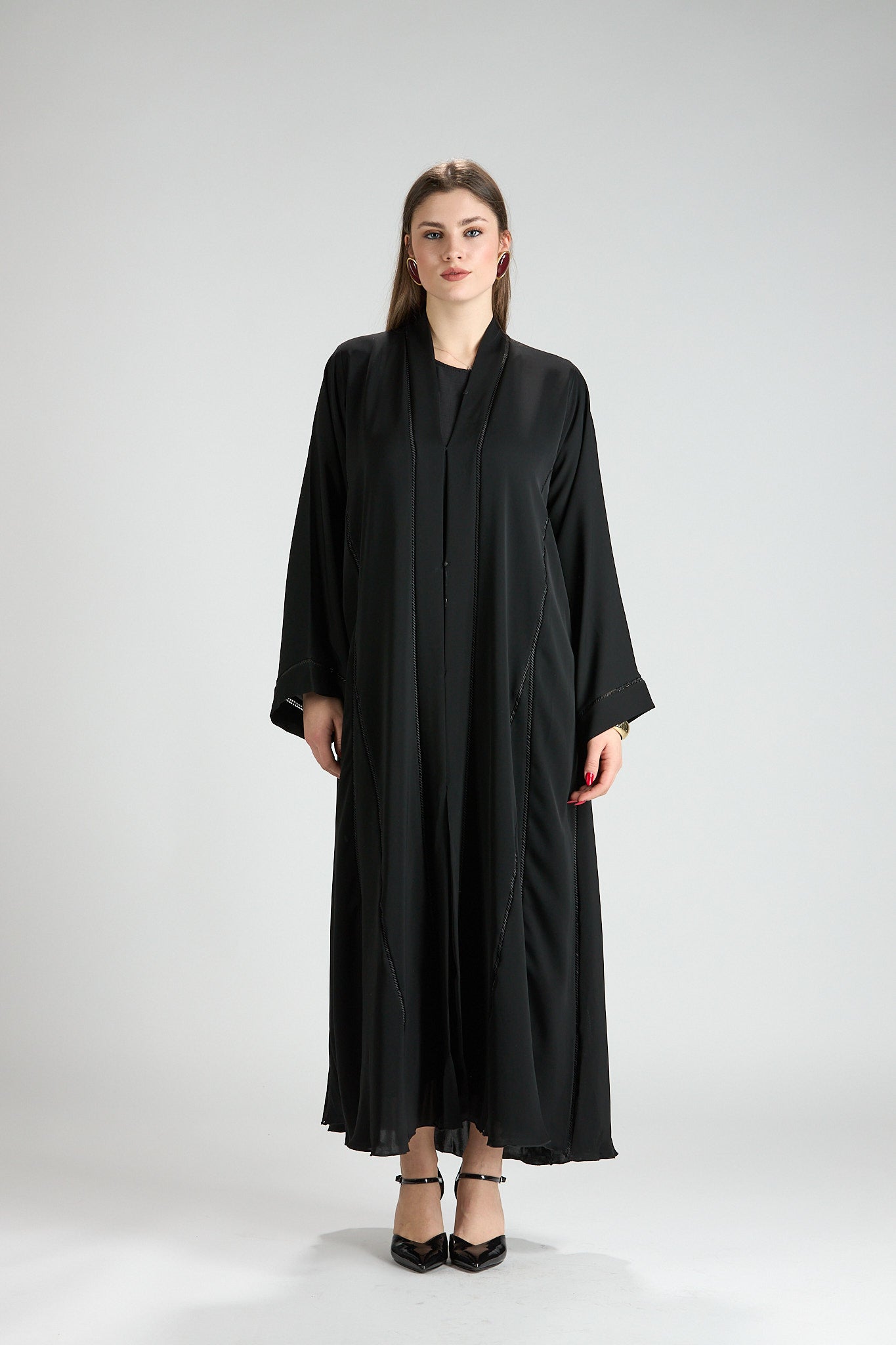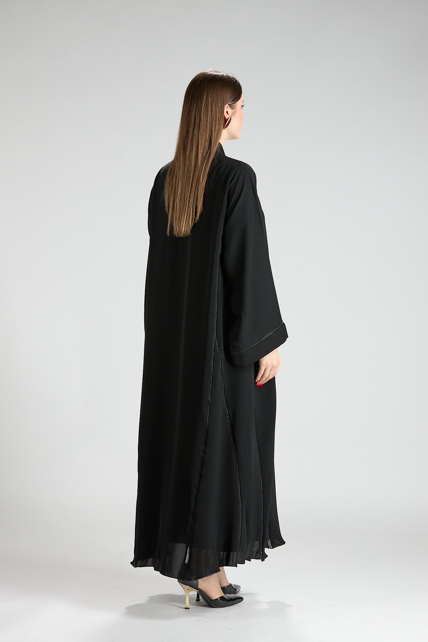 Subtle vertical detailing enhances the length of the design, creating a slimming and elongating effect without distracting from the abaya’s timeless simplicity. The wide sleeves add a touch of modern sophistication, making this piece ideal for both formal occasions and elevated everyday wear.