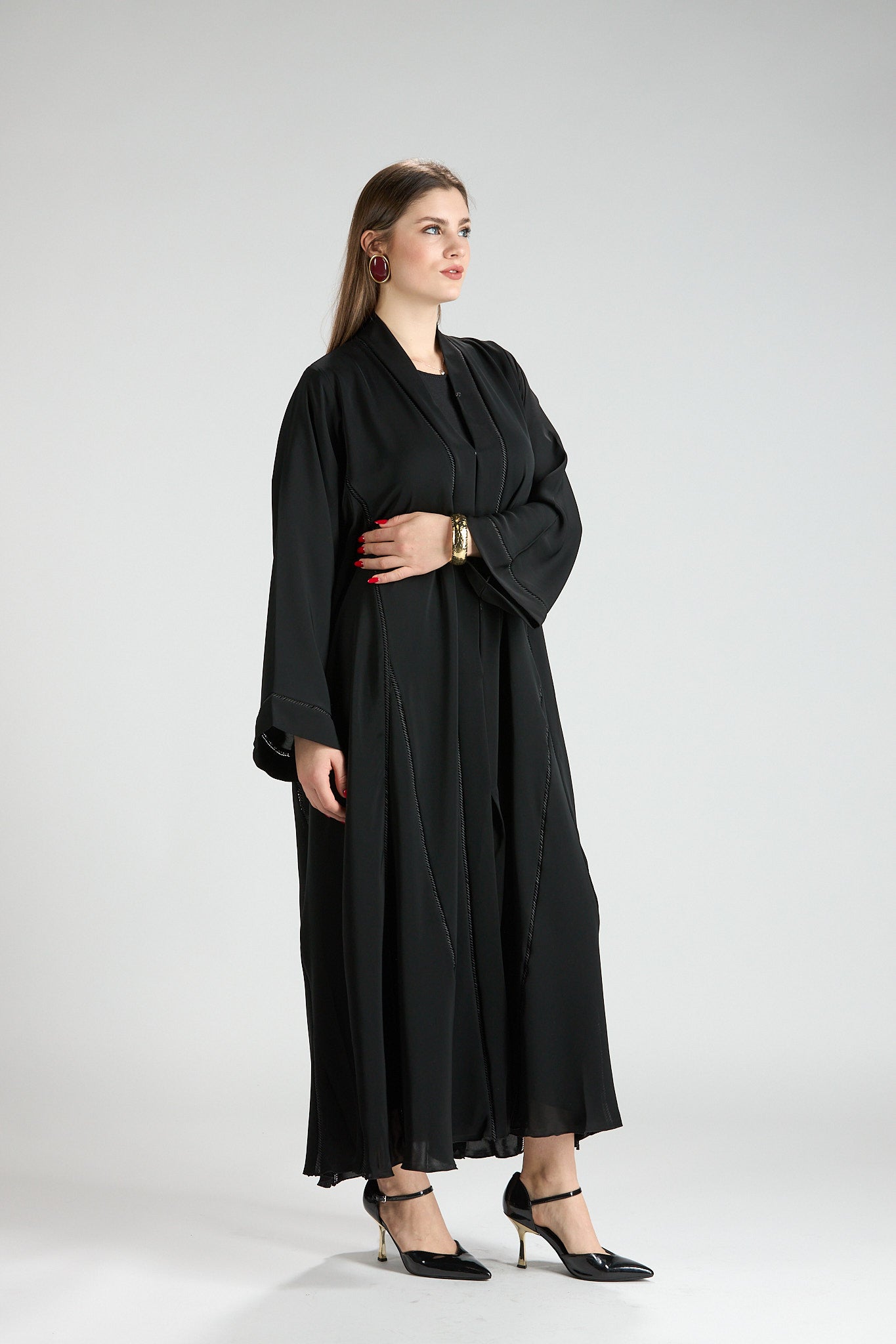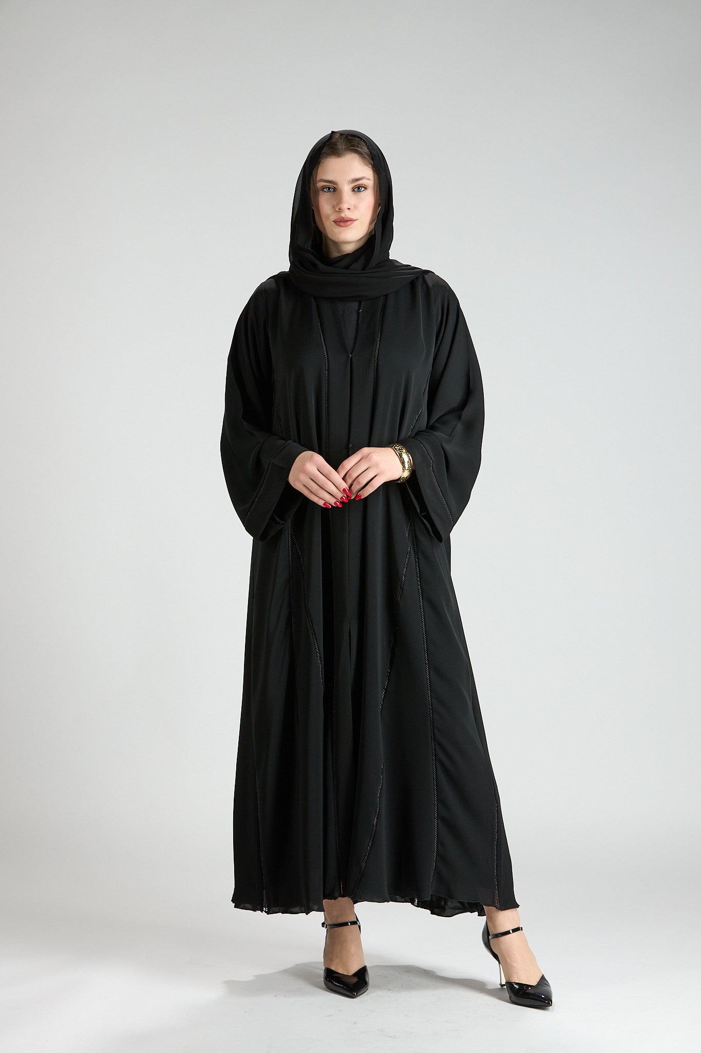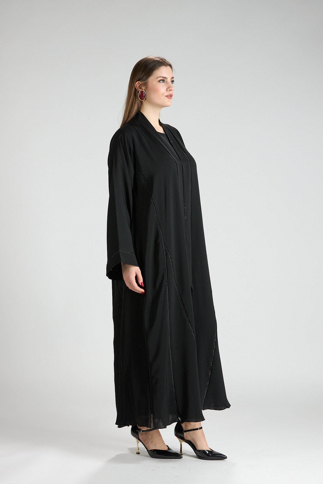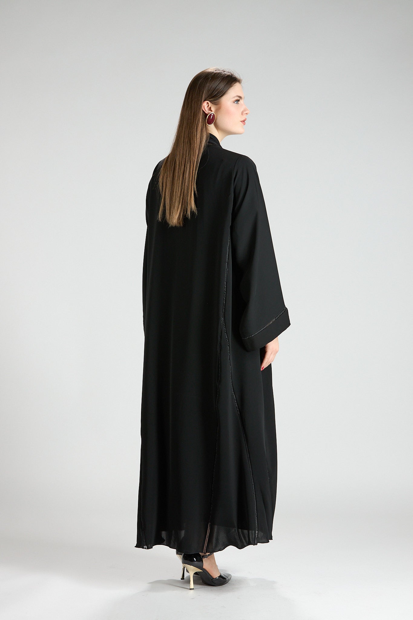 Subtle vertical detailing enhances the length of the design, creating a slimming and elongating effect without distracting from the abaya’s timeless simplicity. The wide sleeves add a touch of modern sophistication, making this piece ideal for both formal occasions and elevated everyday wear.