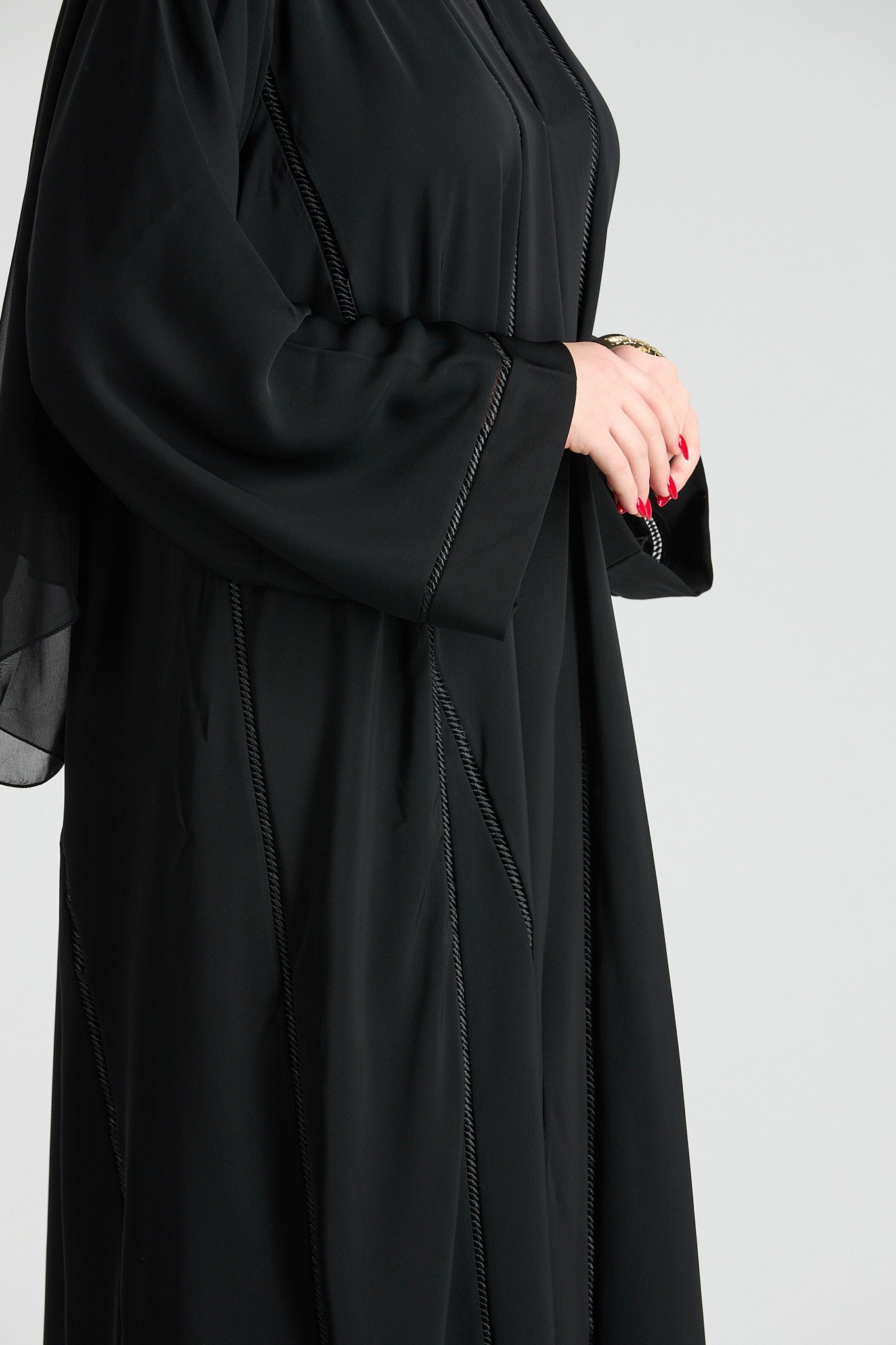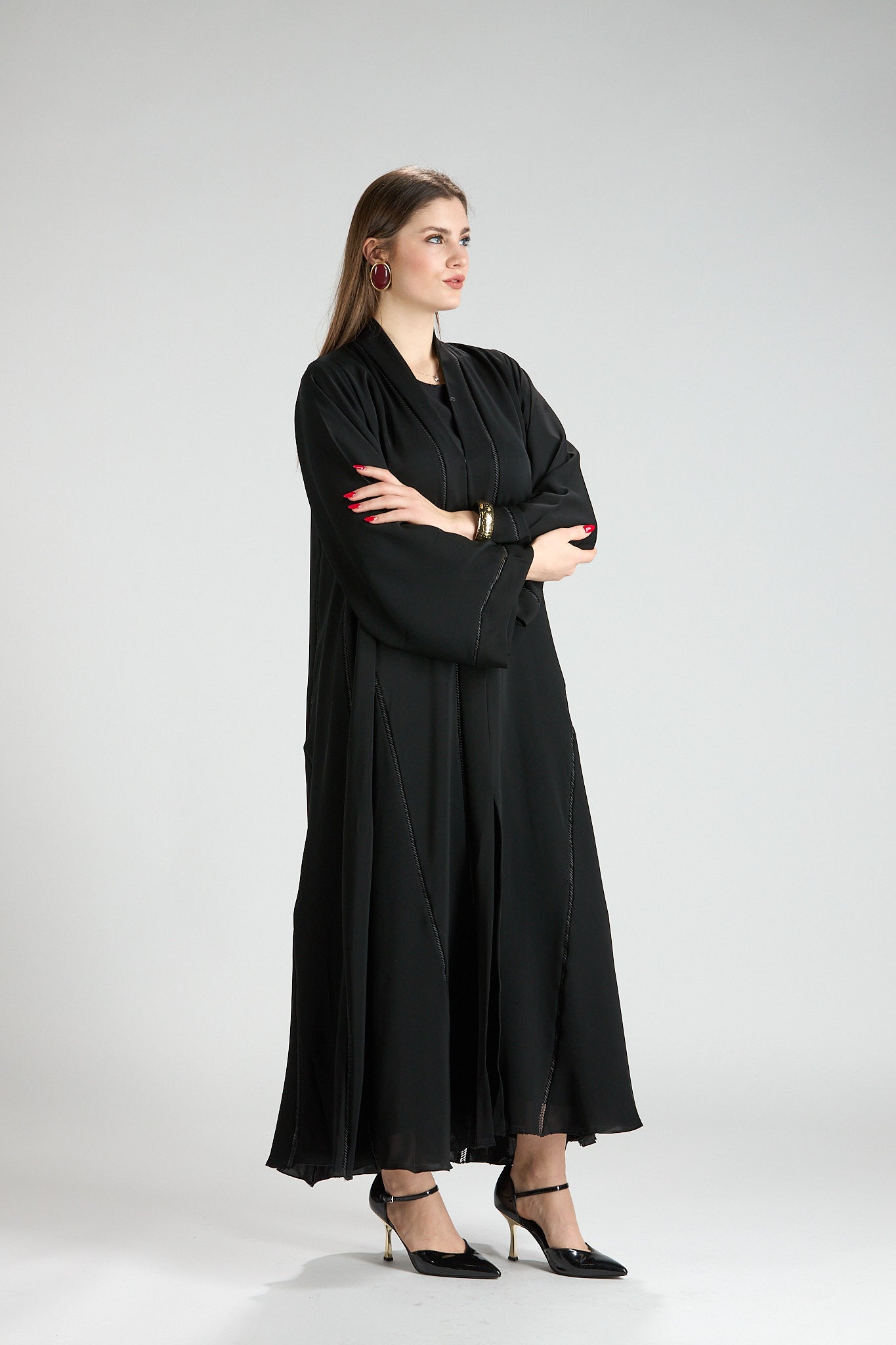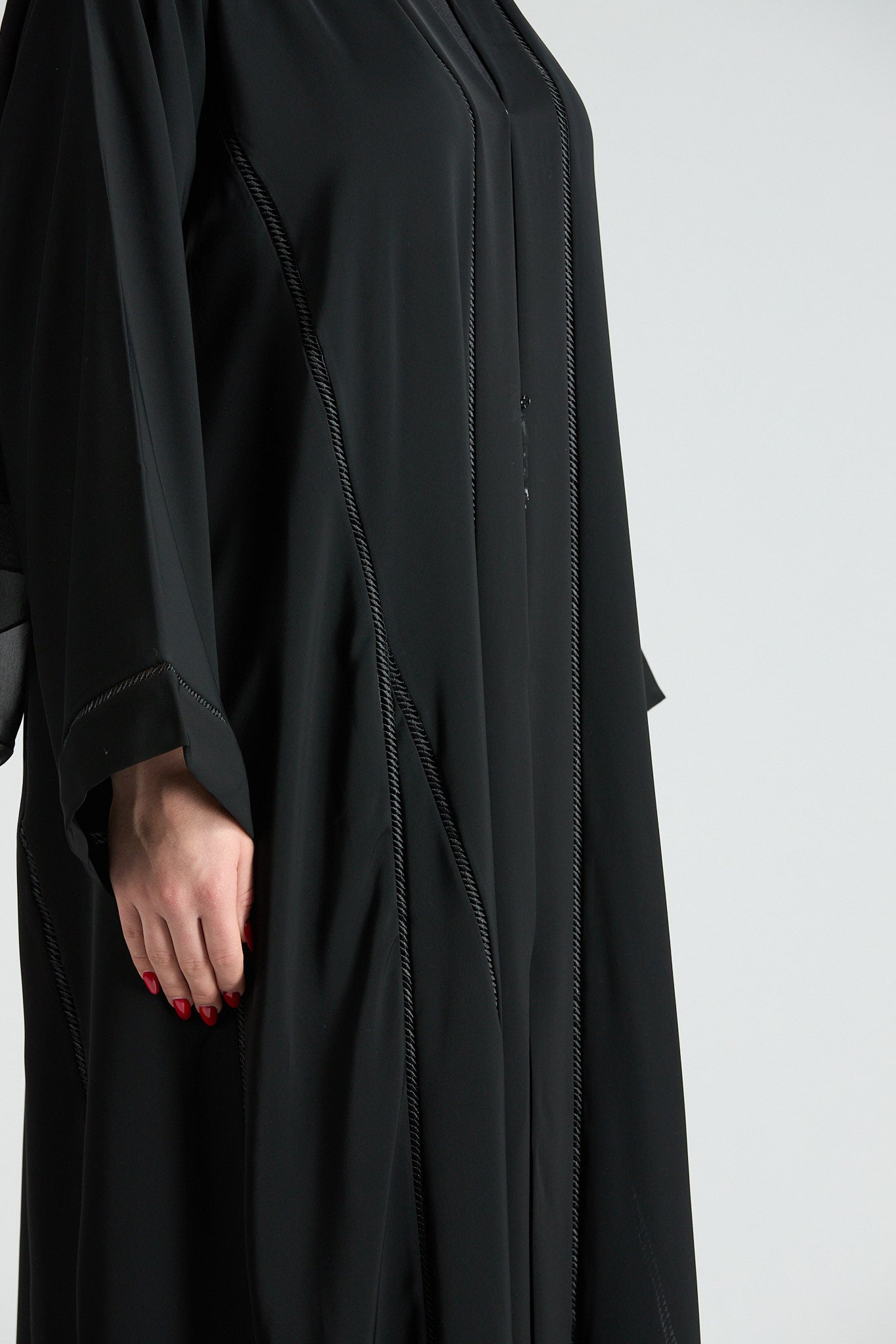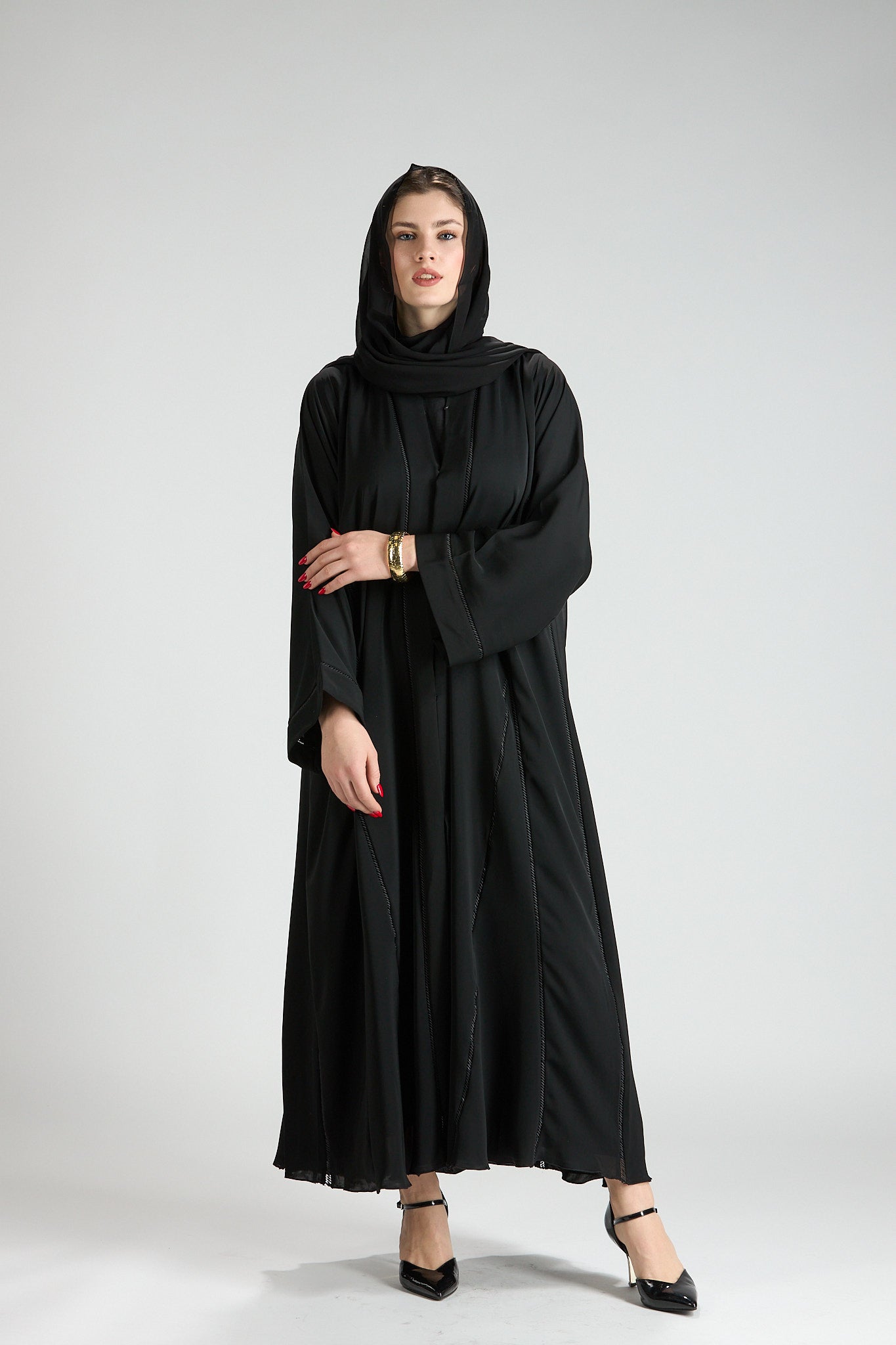 Subtle vertical detailing enhances the length of the design, creating a slimming and elongating effect without distracting from the abaya’s timeless simplicity. The wide sleeves add a touch of modern sophistication, making this piece ideal for both formal occasions and elevated everyday wear.