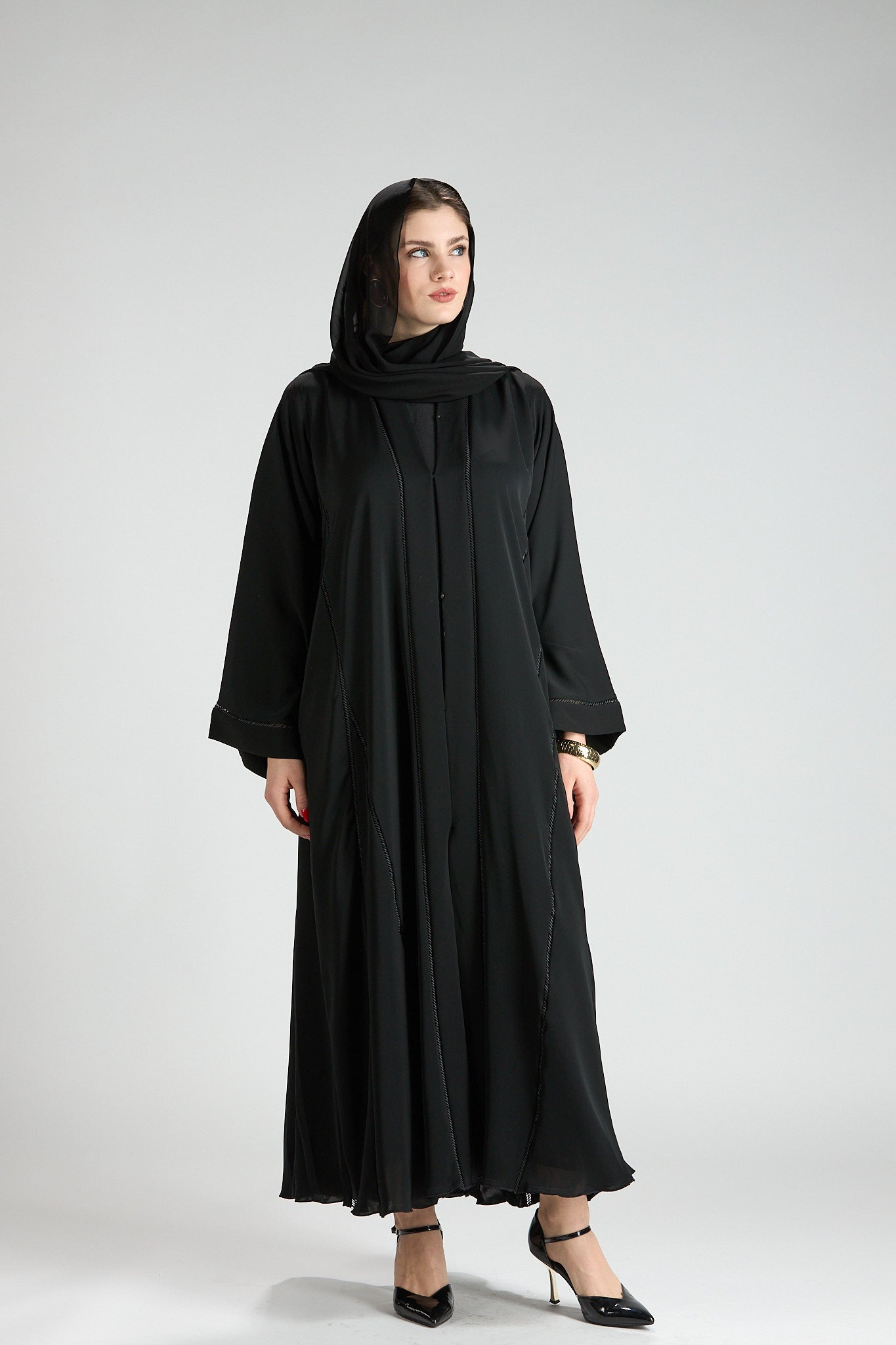 Finished with a matching black sheila, this abaya embodies understated luxury and refined modesty.