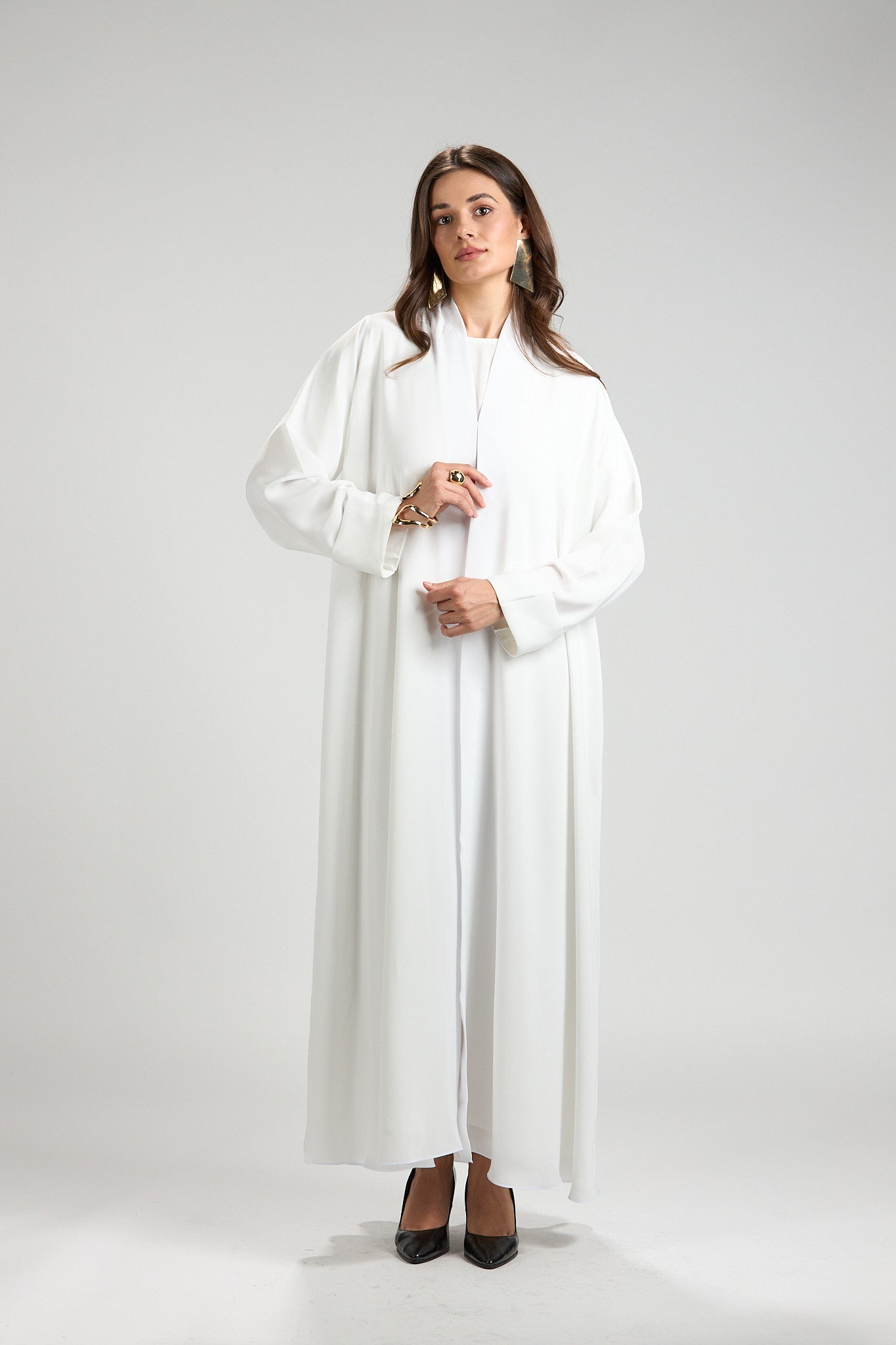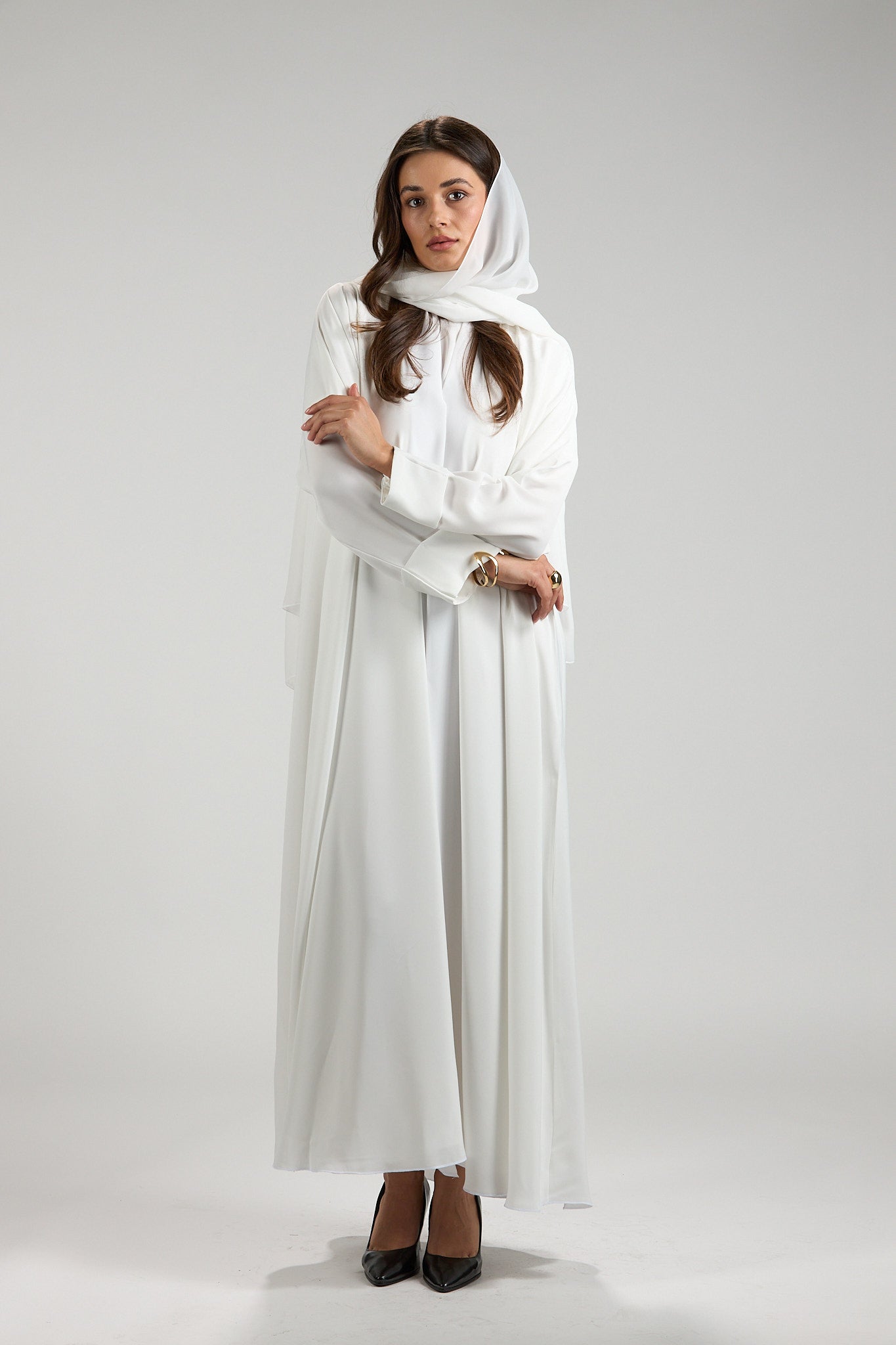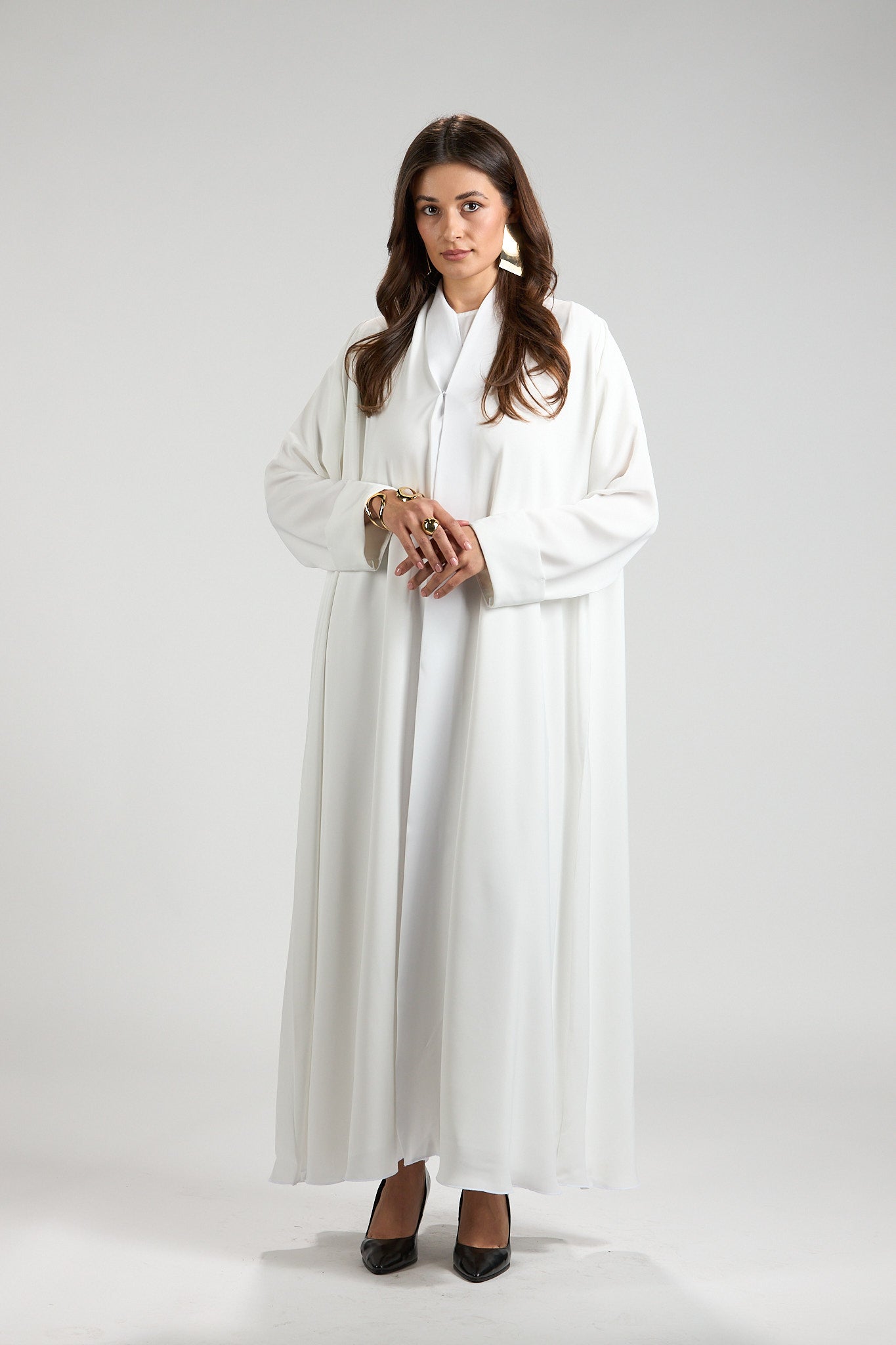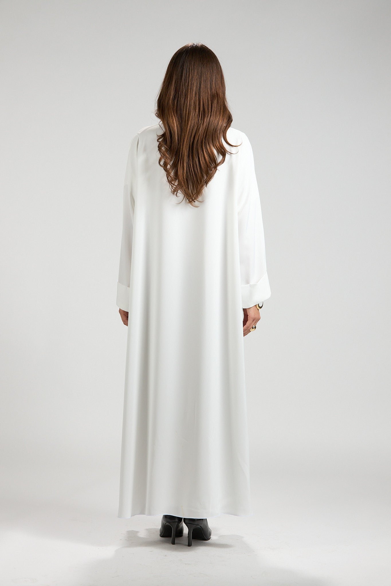 Graceful and timeless, The Ivory Serenity Abaya is designed for refined modest elegance. Crafted from a lightweight, fluid fabric, this abaya drapes effortlessly, creating a soft and airy silhouette that moves beautifully with every step.