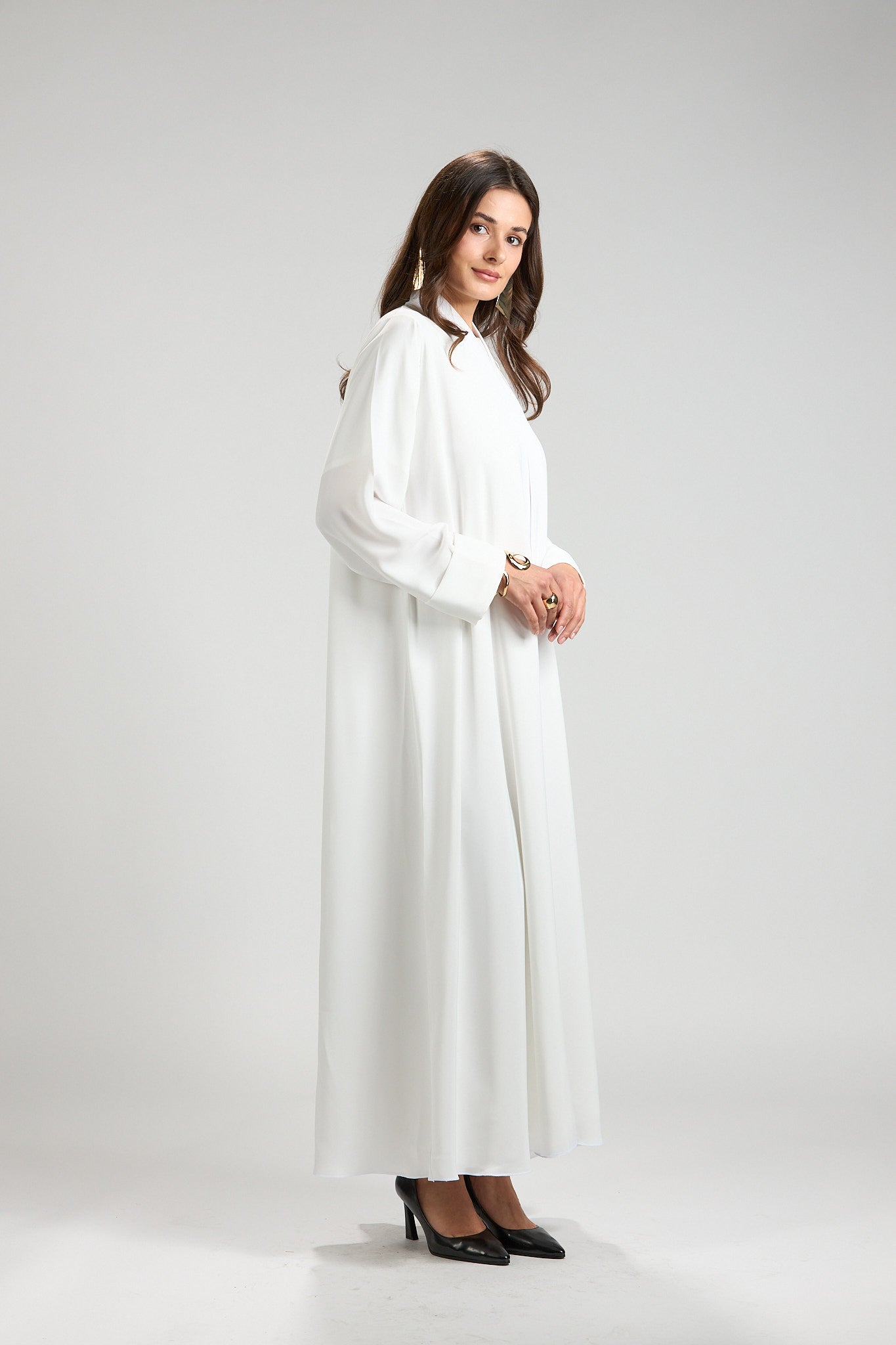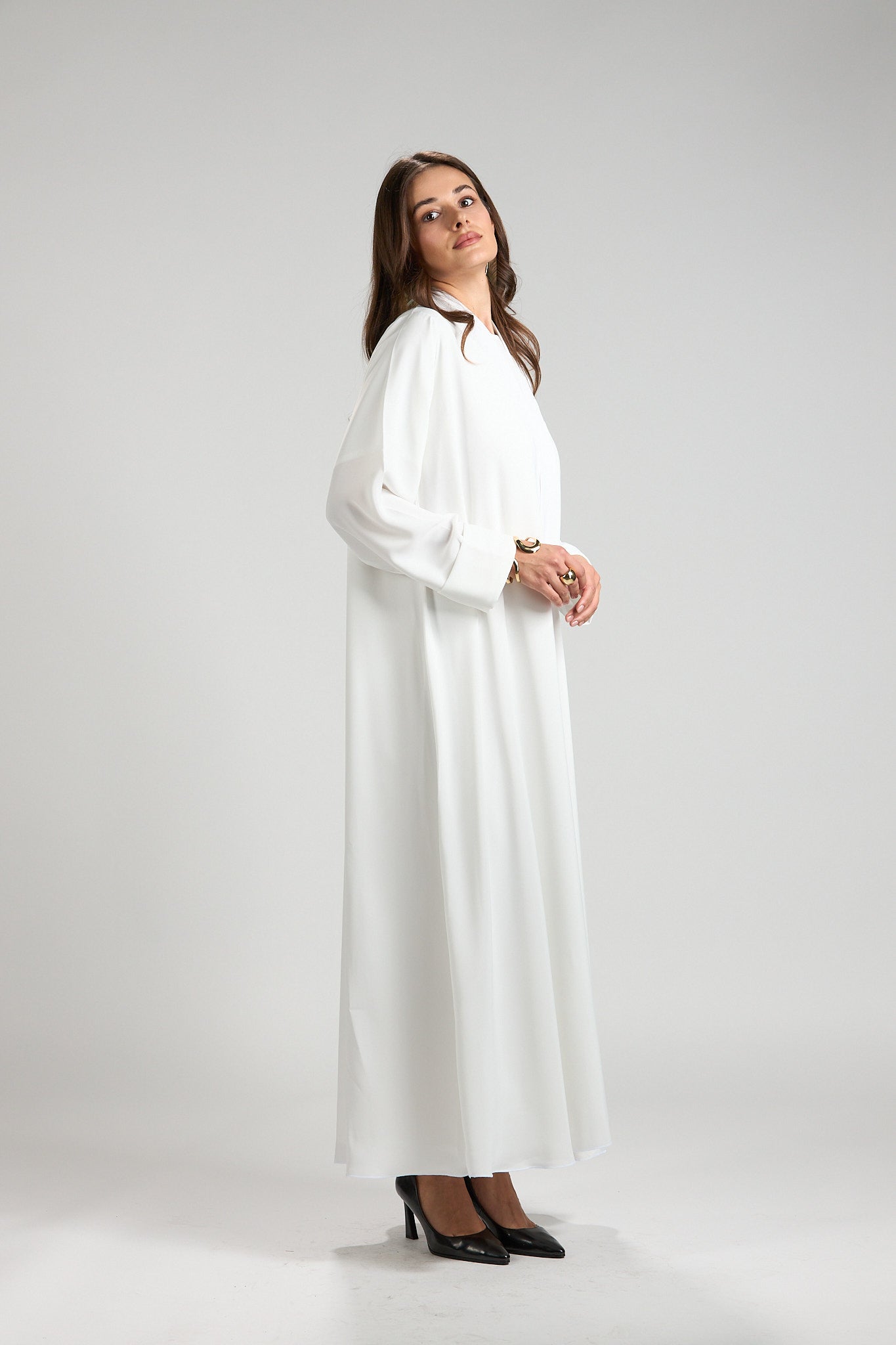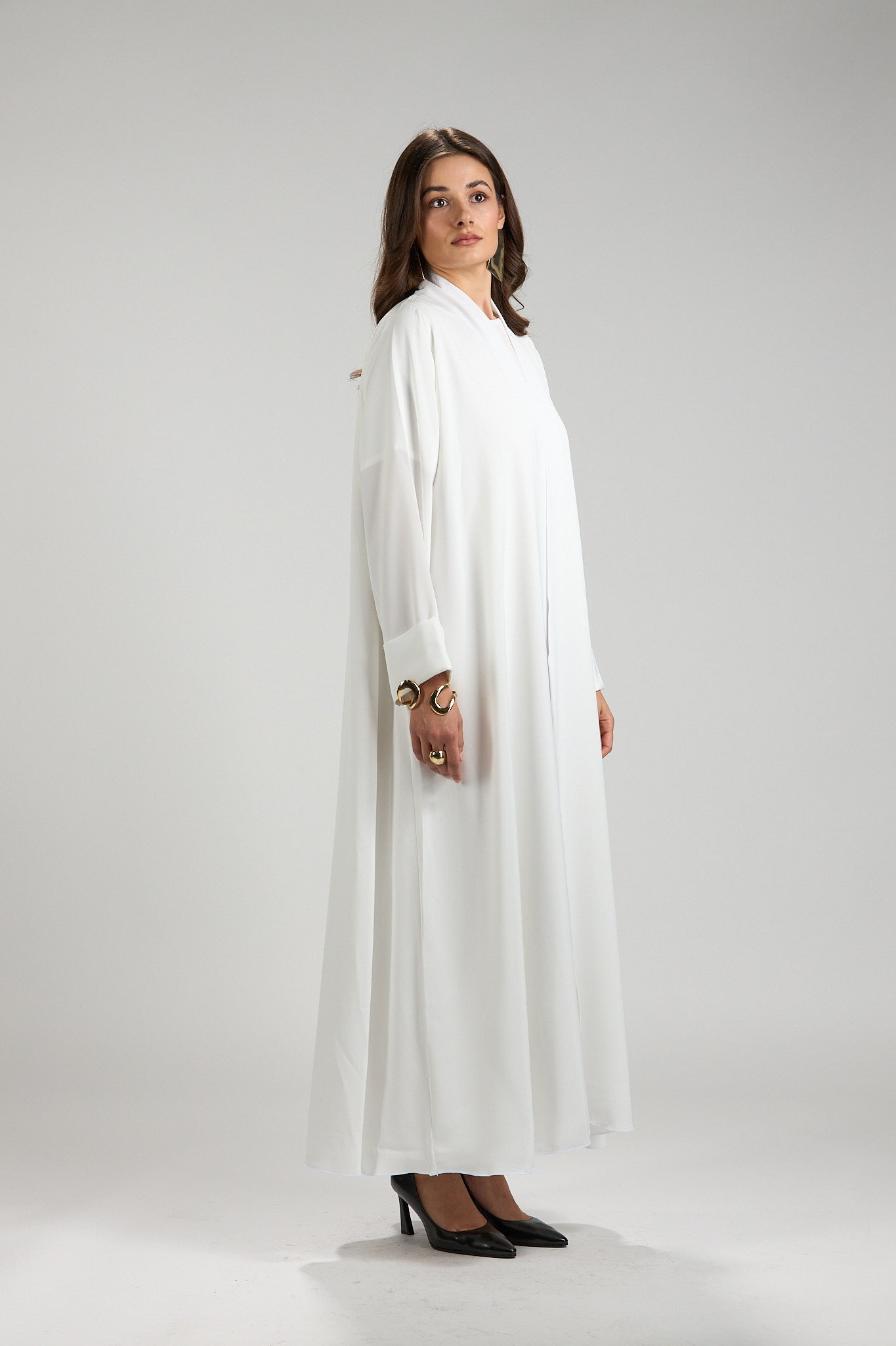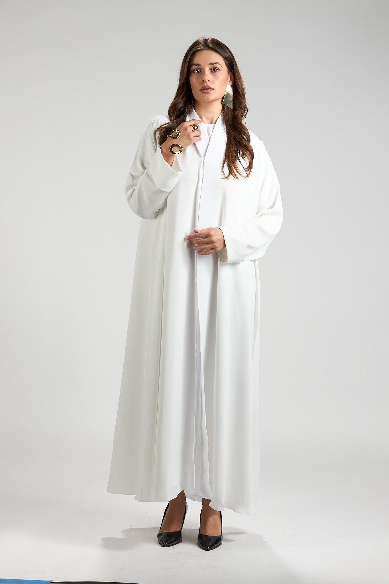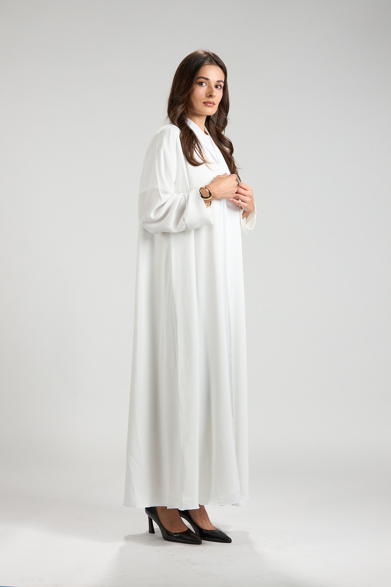 Graceful and timeless, The Ivory Serenity Abaya is designed for refined modest elegance. Crafted from a lightweight, fluid fabric, this abaya drapes effortlessly, creating a soft and airy silhouette that moves beautifully with every step.