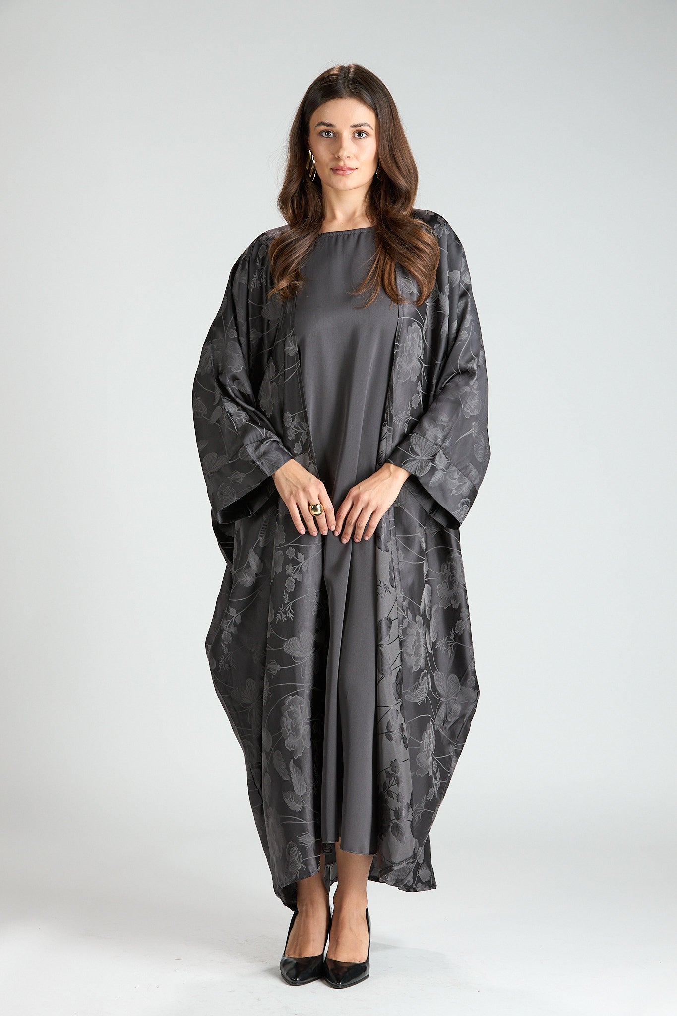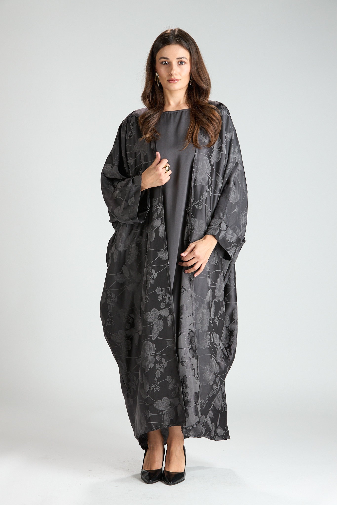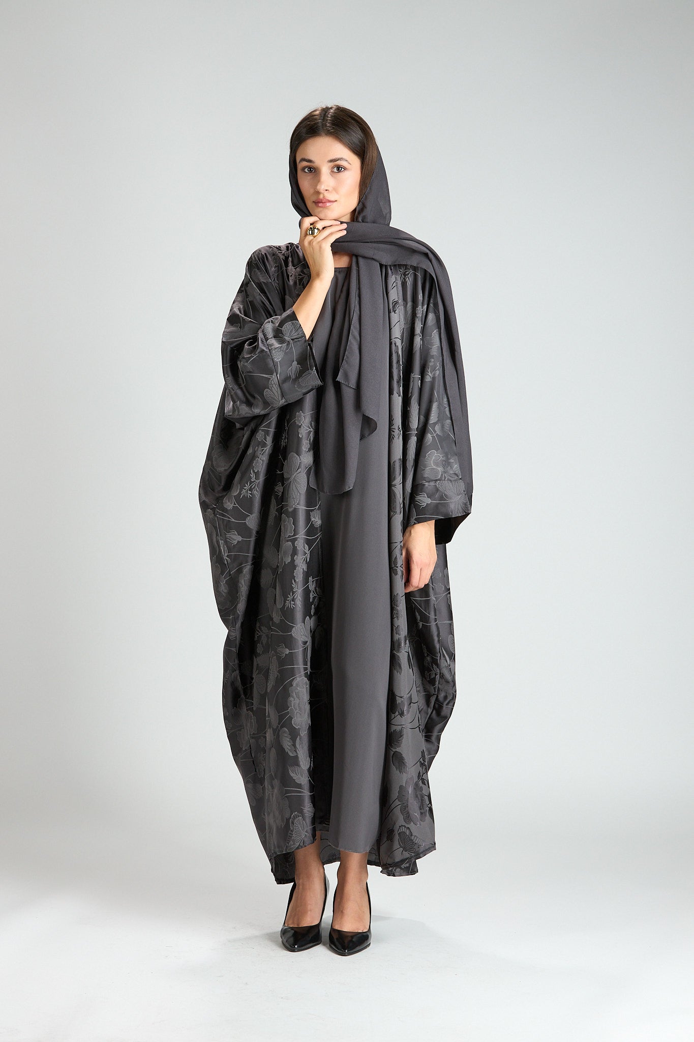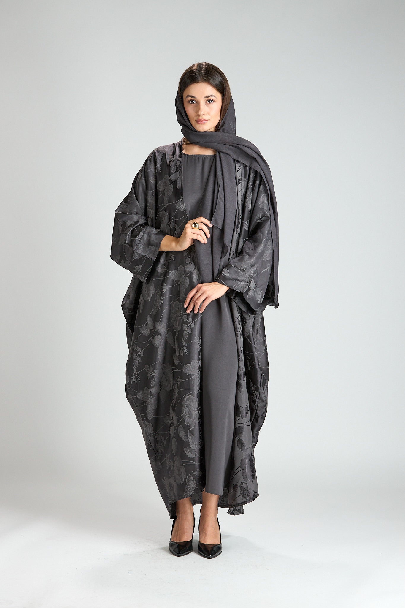Elegant and effortlessly refined, The Smoke Bloom Abaya features a flowing outer layer adorned with a delicate floral jacquard pattern, softly draped over a smooth inner silhouette. The muted gray tone adds a modern, understated elegance, making this piece both distinctive and timeless.