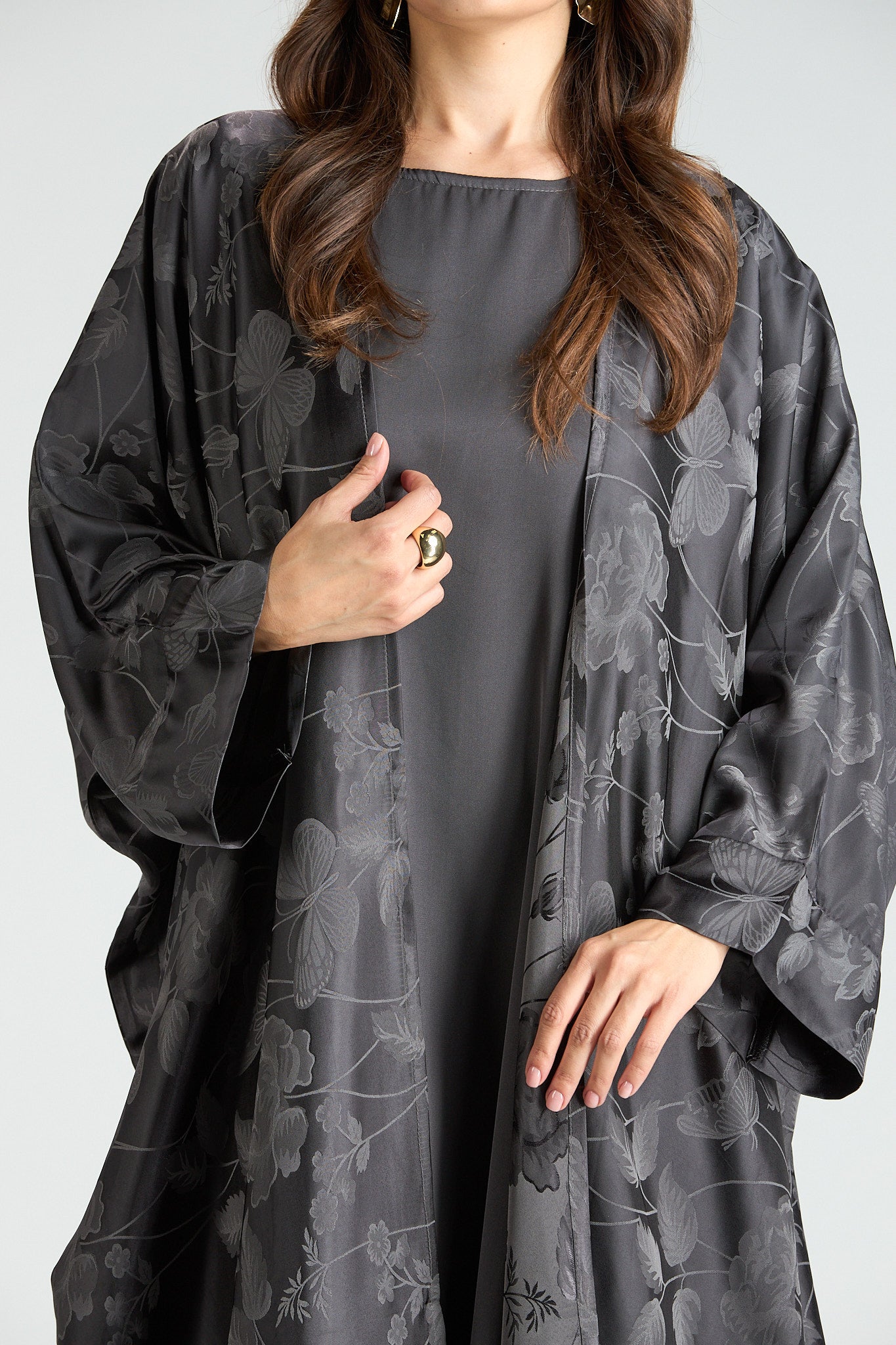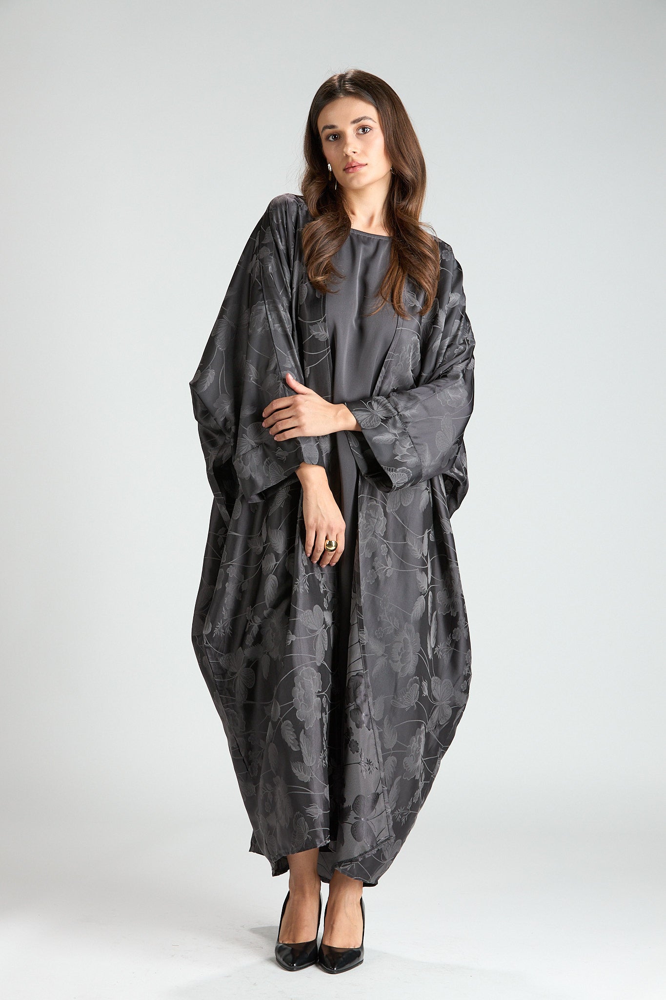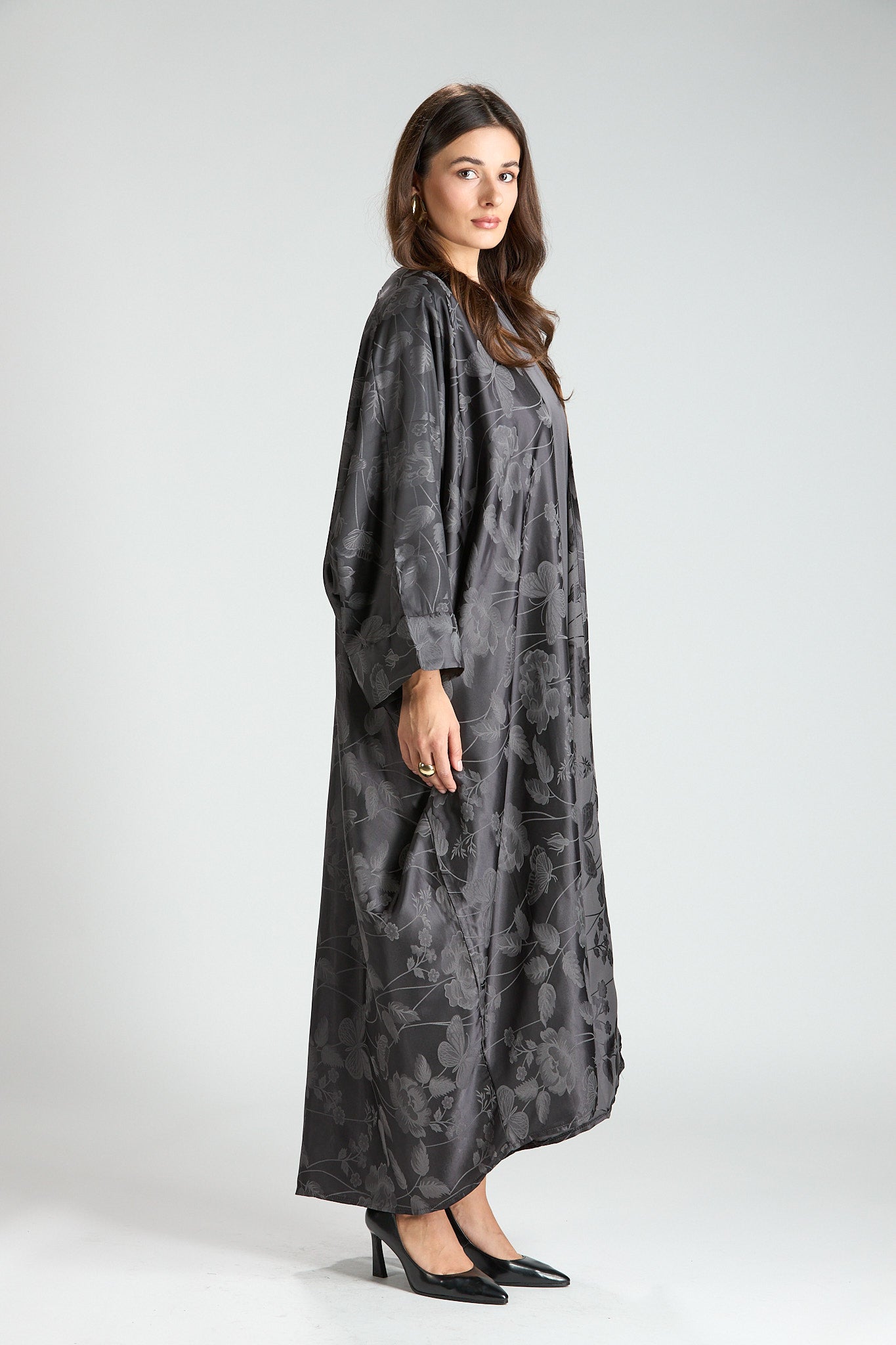 Elegant and effortlessly refined, The Smoke Bloom Abaya features a flowing outer layer adorned with a delicate floral jacquard pattern, softly draped over a smooth inner silhouette. The muted gray tone adds a modern, understated elegance, making this piece both distinctive and timeless.