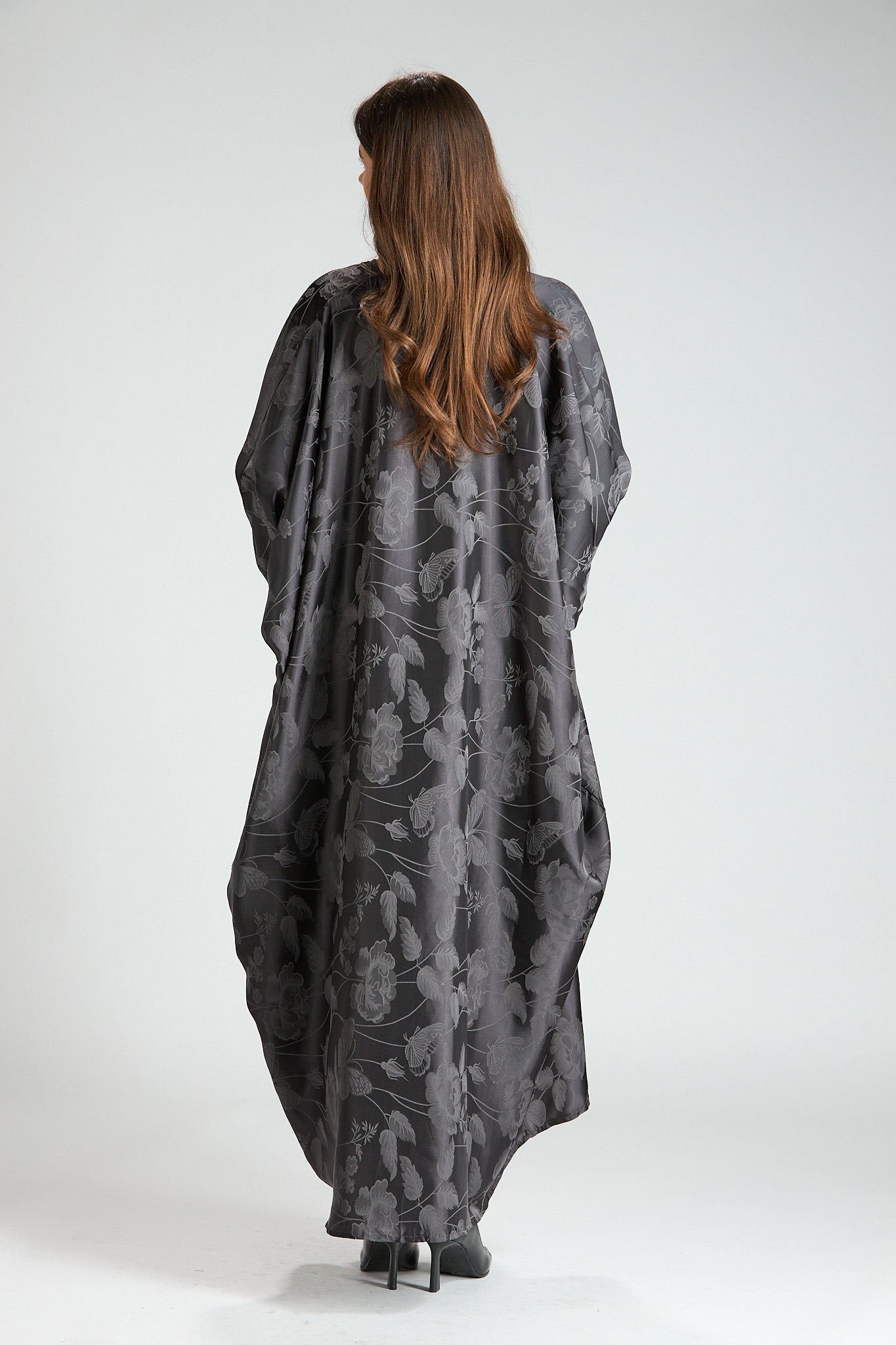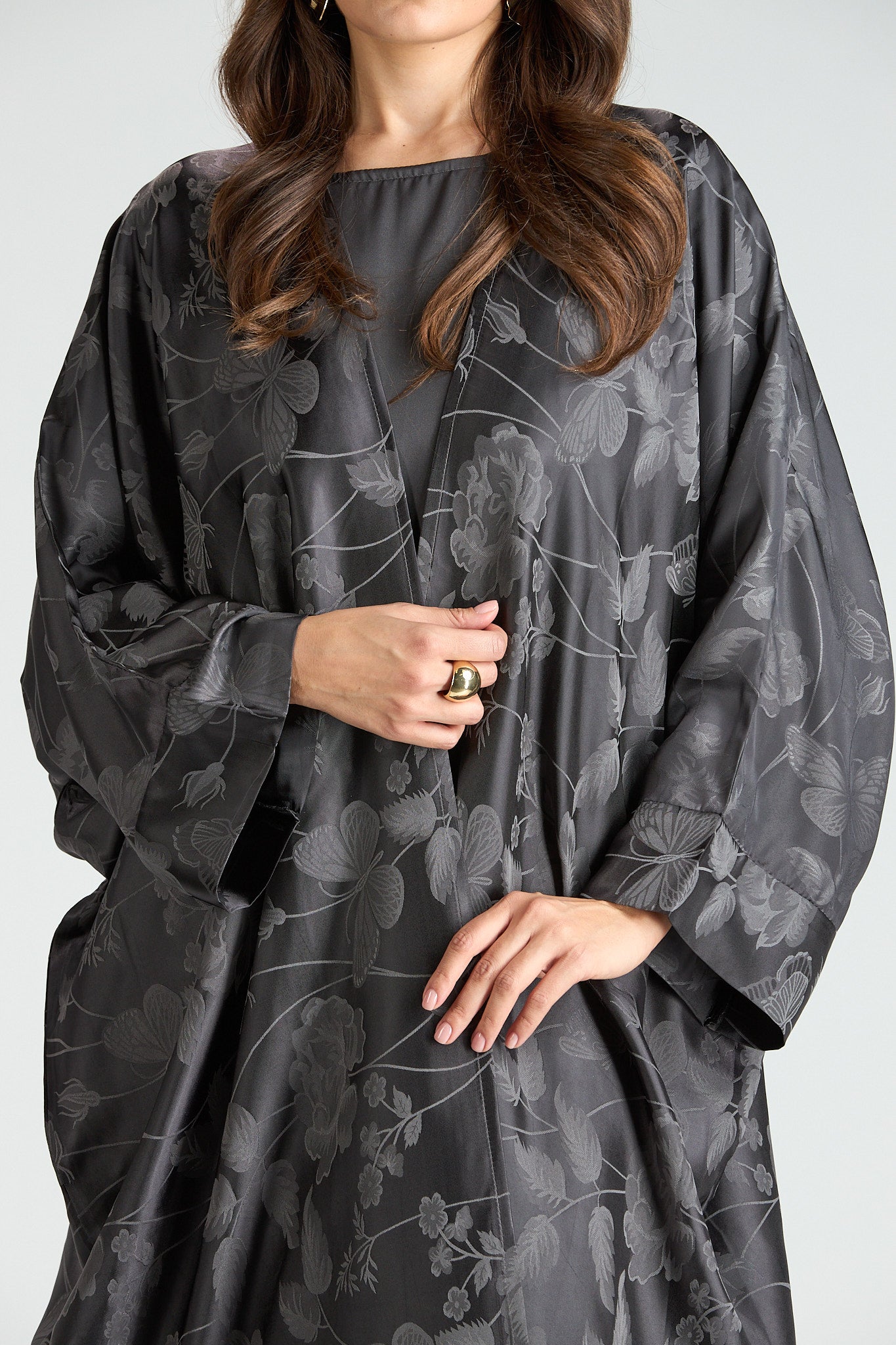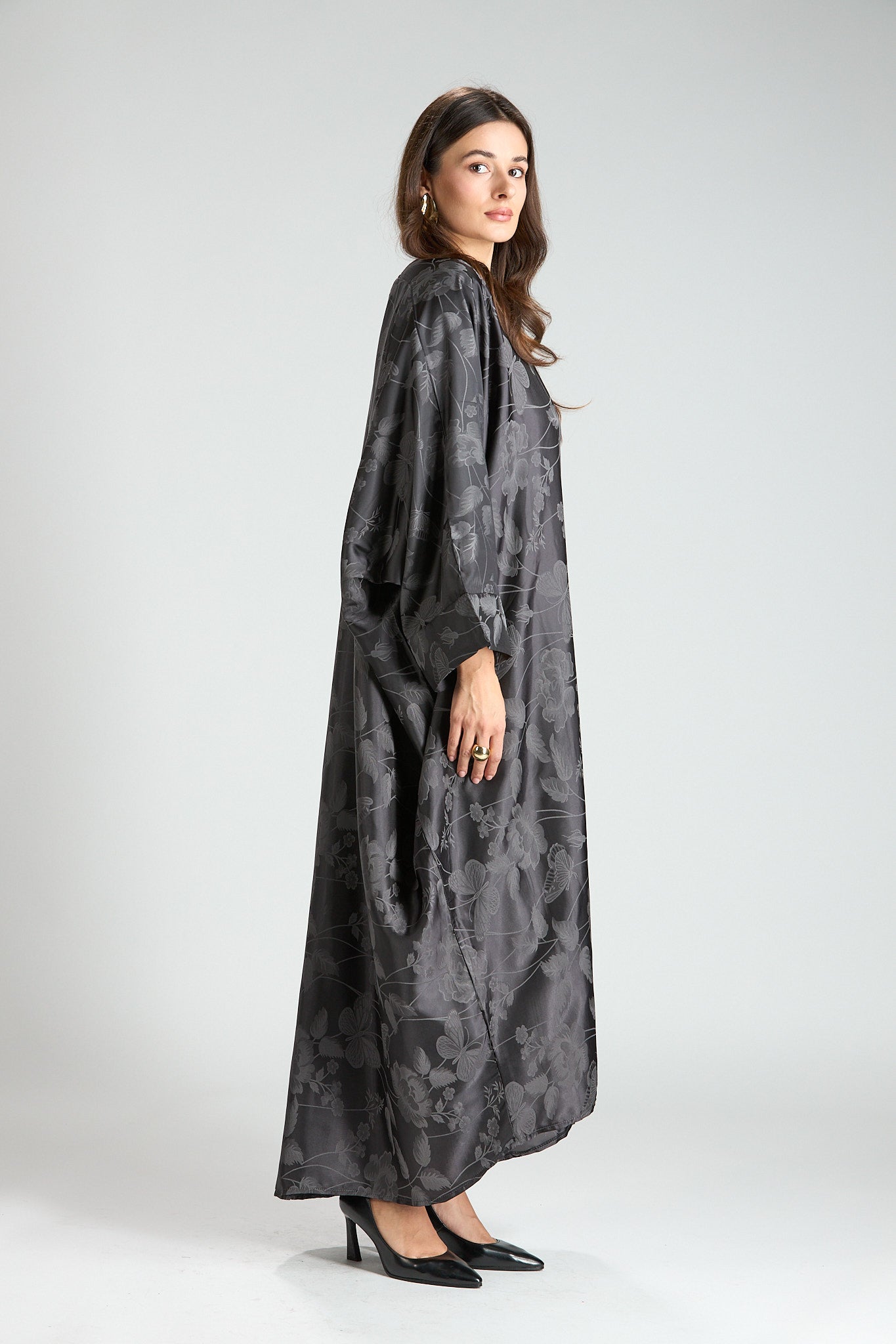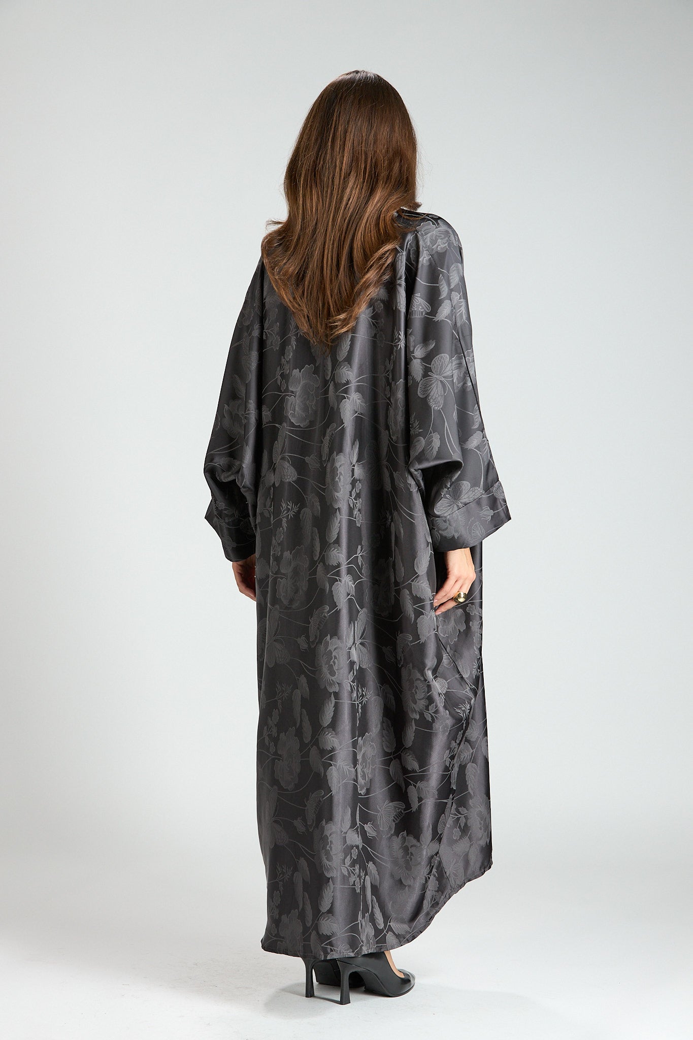 Elegant and effortlessly refined, The Smoke Bloom Abaya features a flowing outer layer adorned with a delicate floral jacquard pattern, softly draped over a smooth inner silhouette. The muted gray tone adds a modern, understated elegance, making this piece both distinctive and timeless.