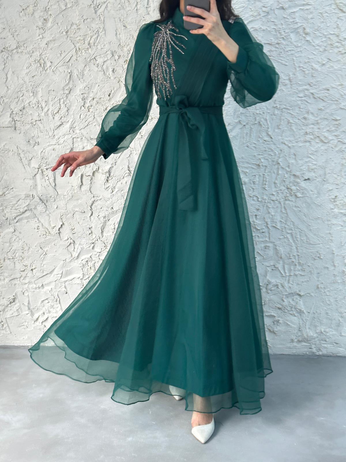 A modest yet captivating sash dress, adorned with a tasteful scattering of bedazzling details. This elegant dress combines timeless modesty with a touch of glamour, making it the perfect choice for those seeking a sophisticated and eye-catching outfit. The sash accentuates your waist and adds a dash of sparkle, ensuring you'll stand out at any special event with grace and style.