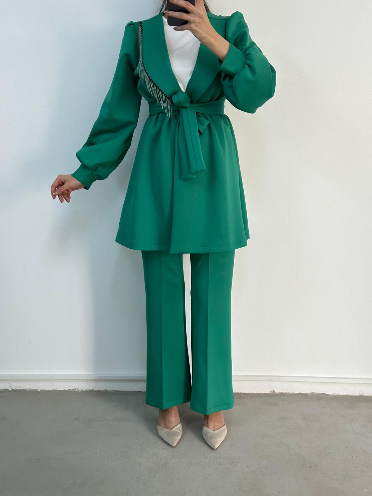 GREEN BEADED COLLAR W TIE WAIST TWO PIECE SUIT