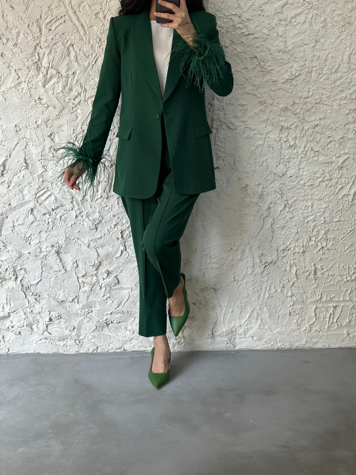GREEN FEATHER SLEEVE TWO PIECE SUIT