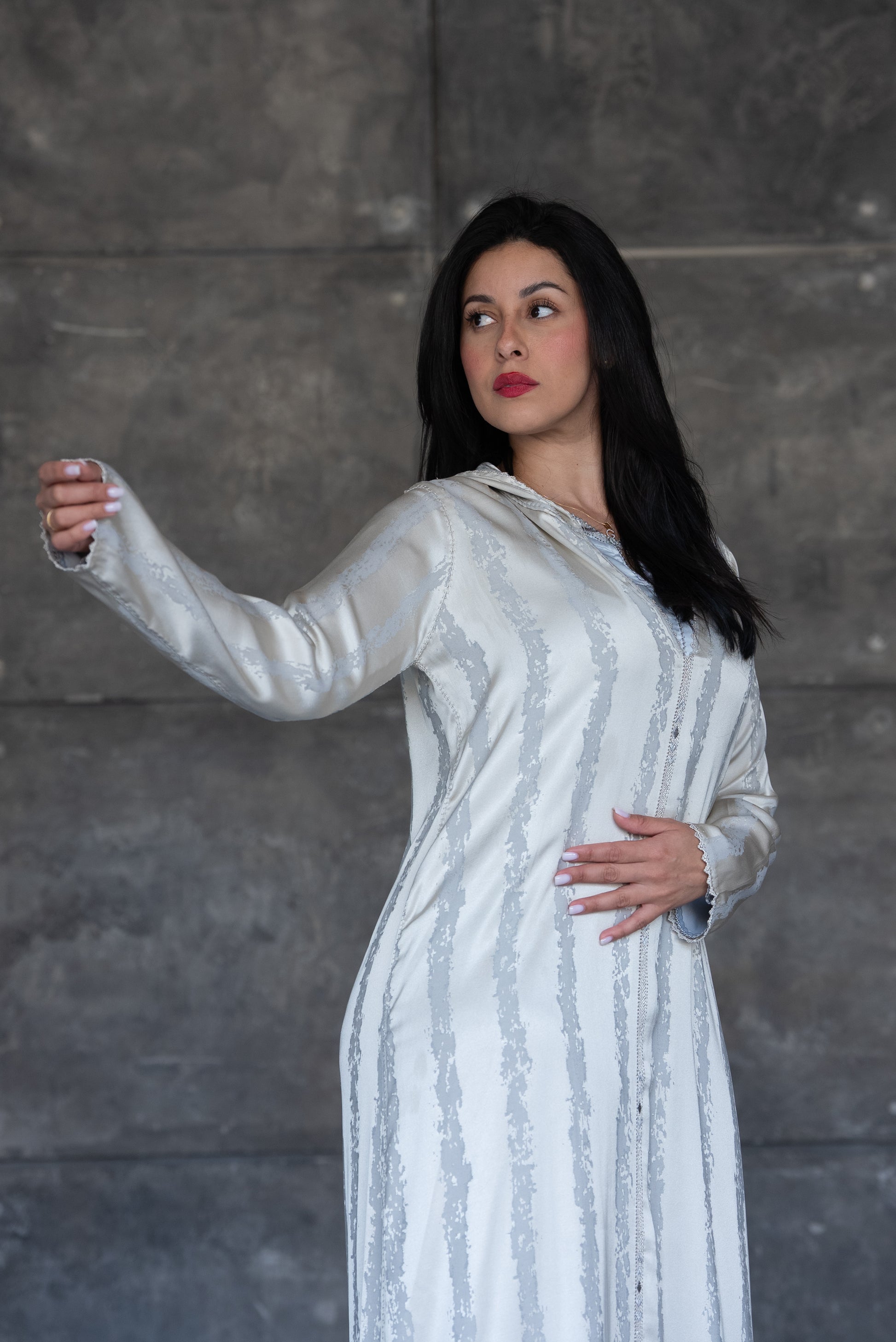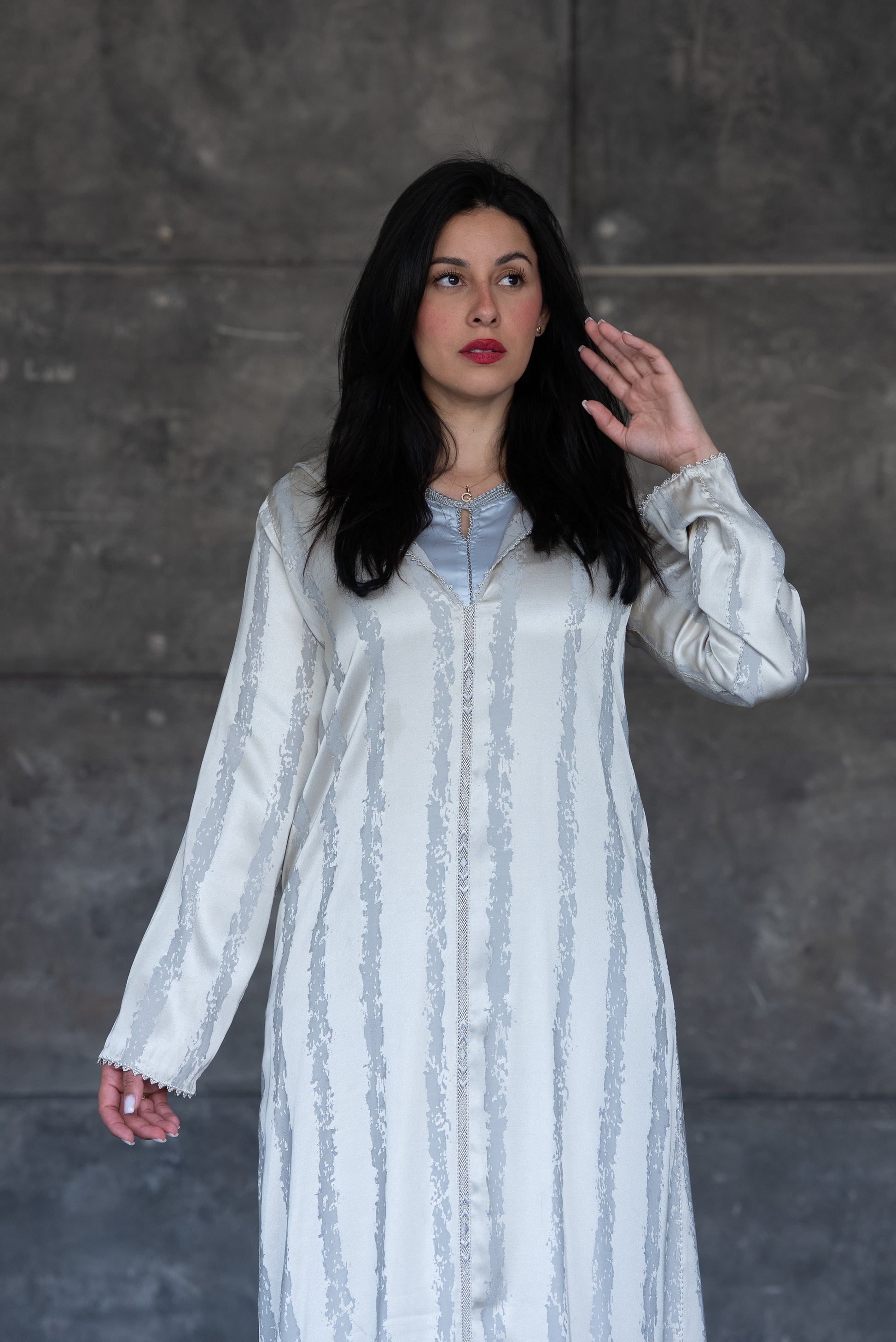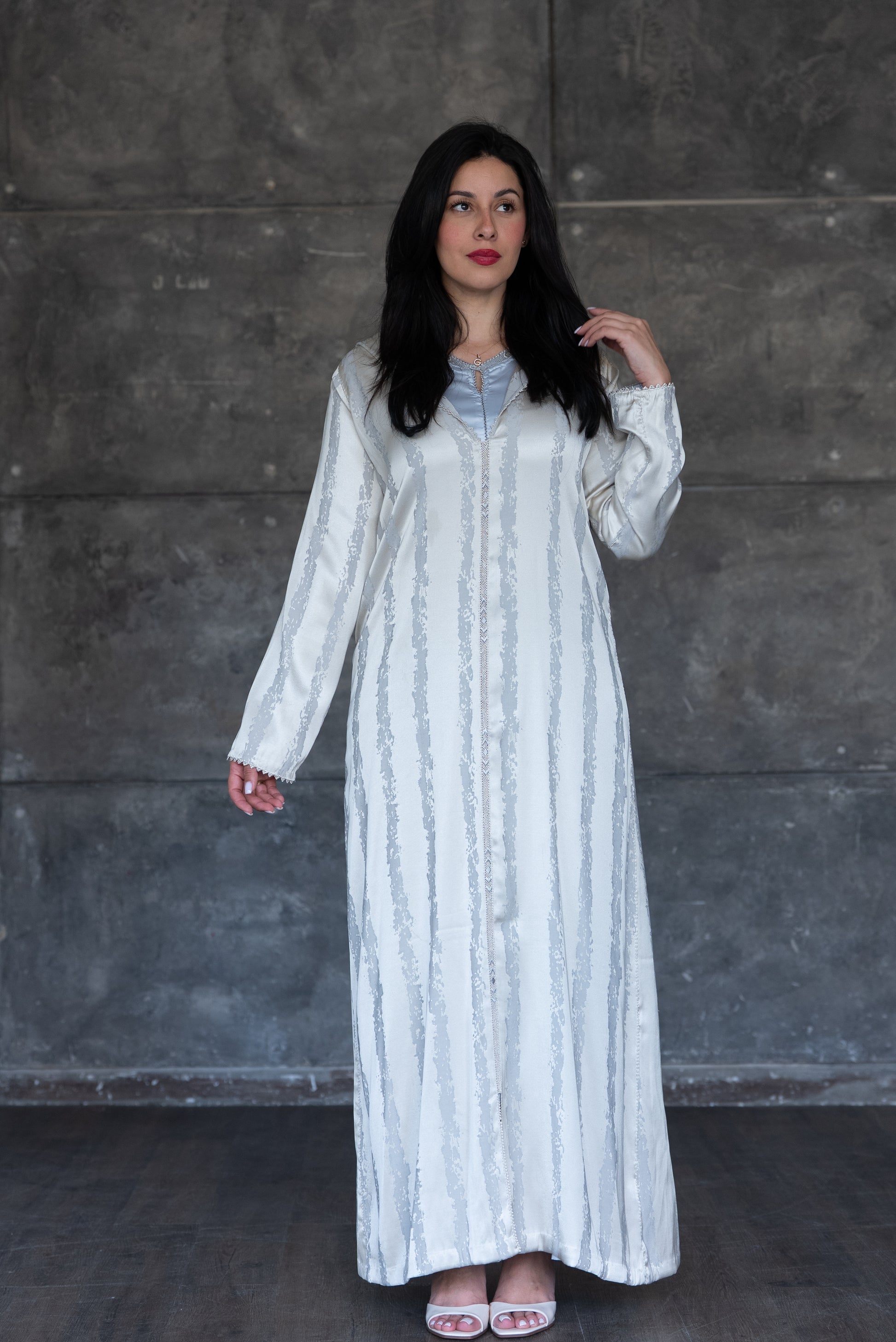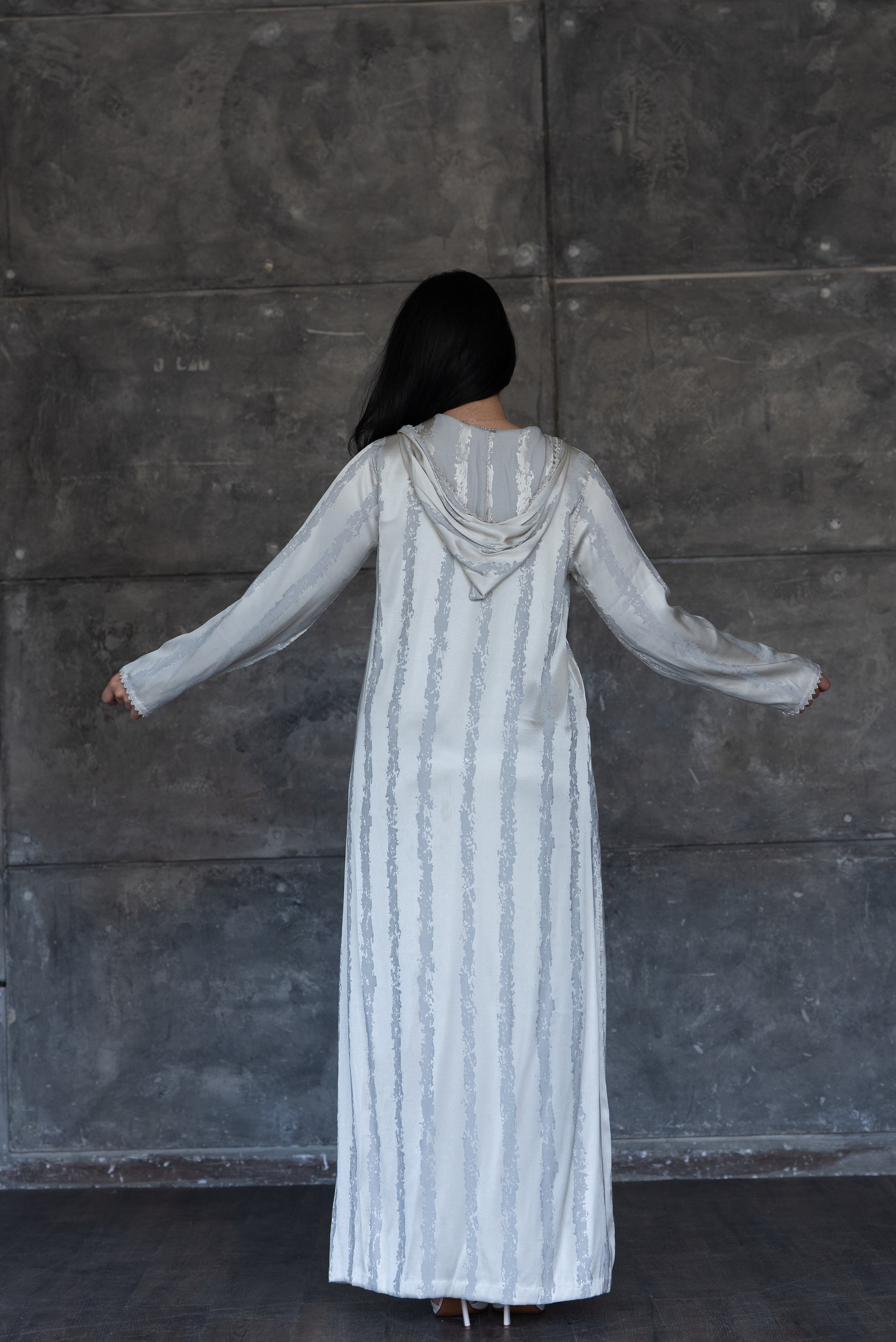2 Pieces Ivory & Silver Striped Satin Modern Djellaba