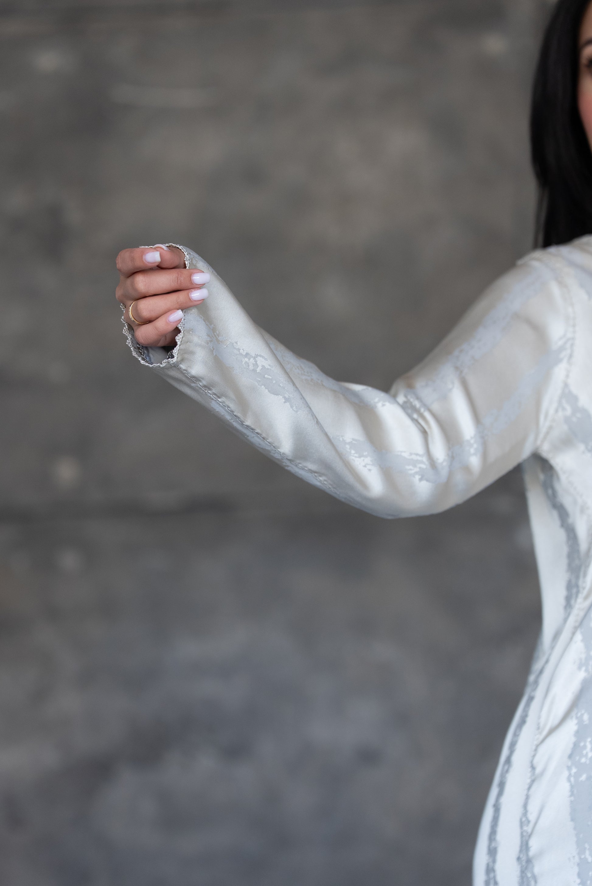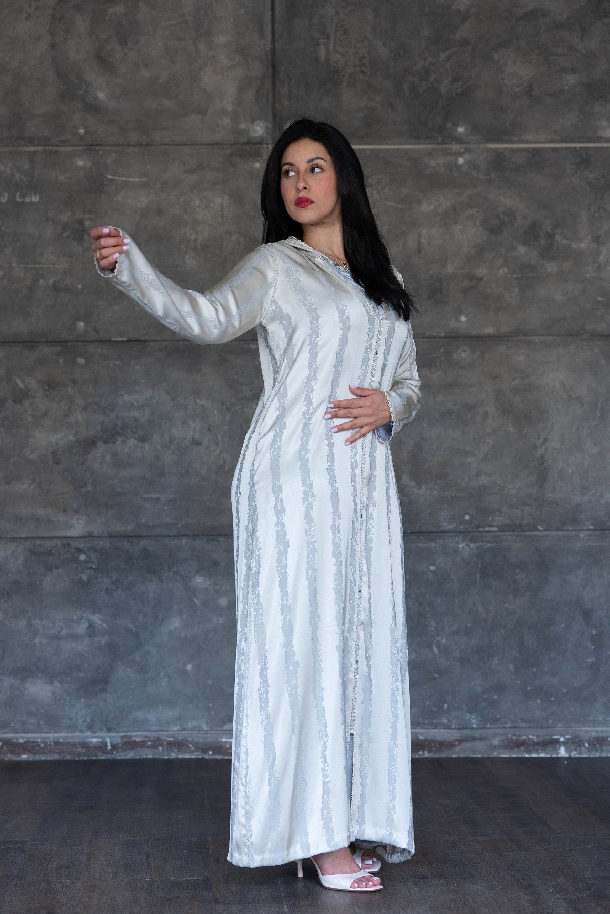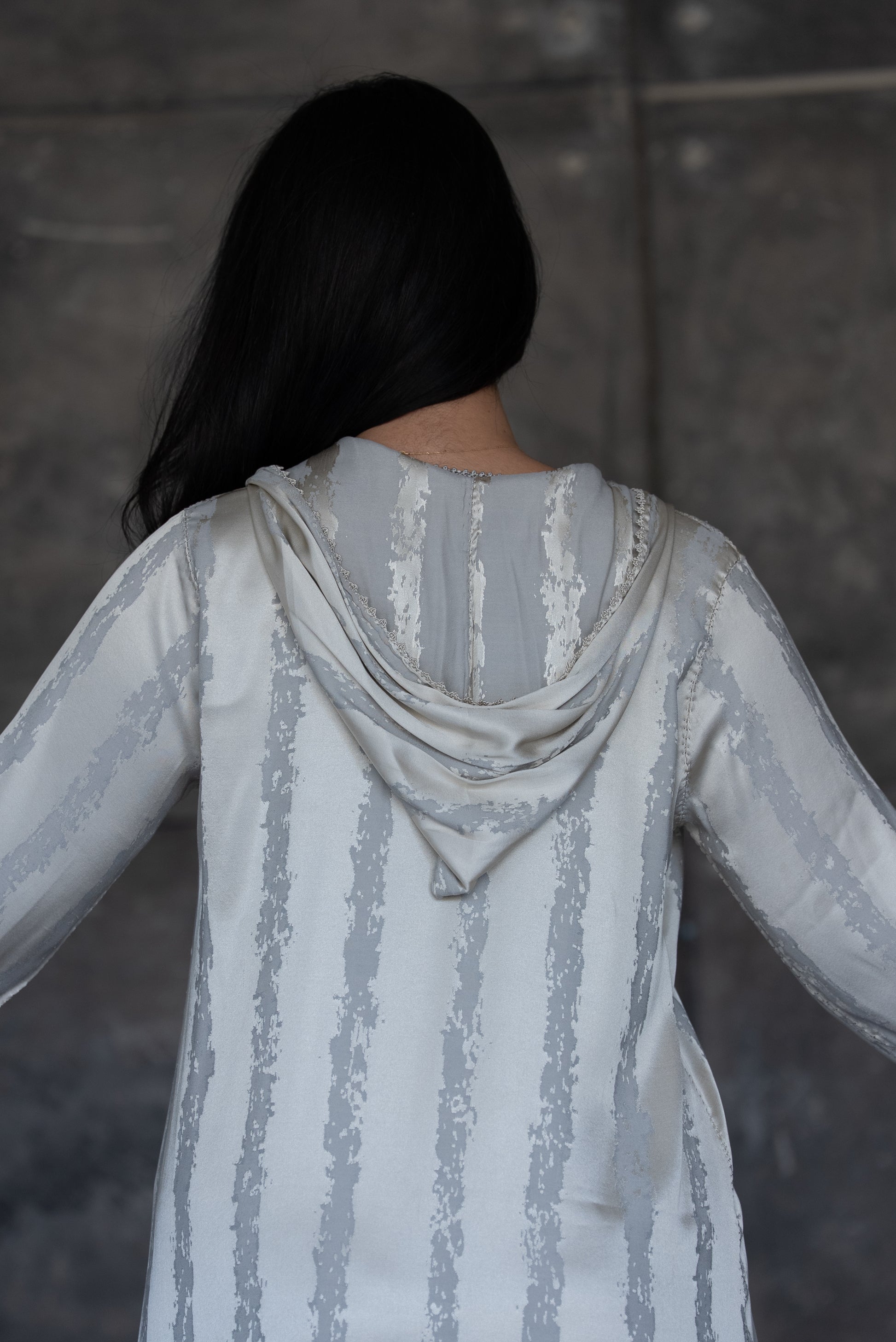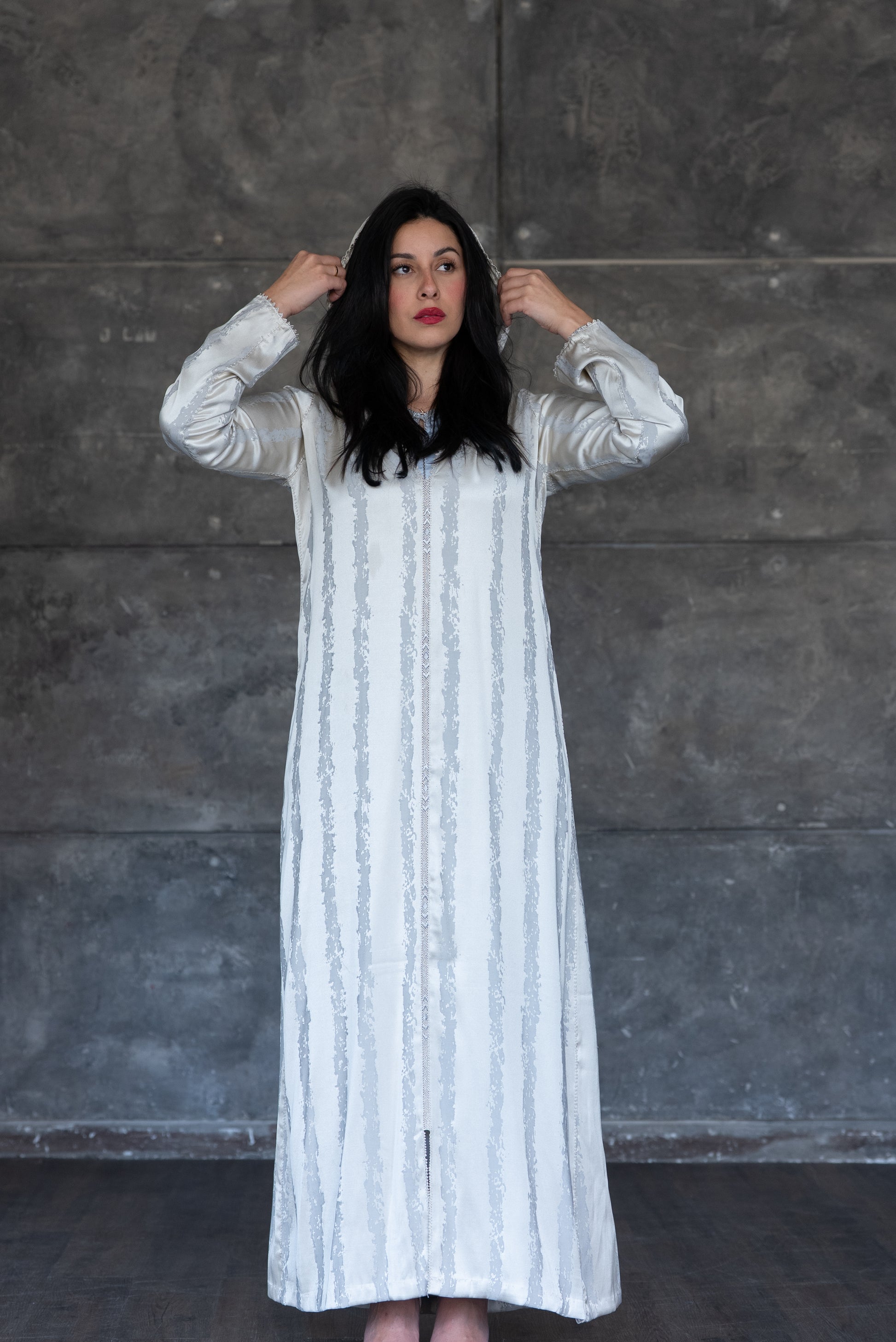 2 Pieces Ivory & Silver Striped Satin Modern Djellaba