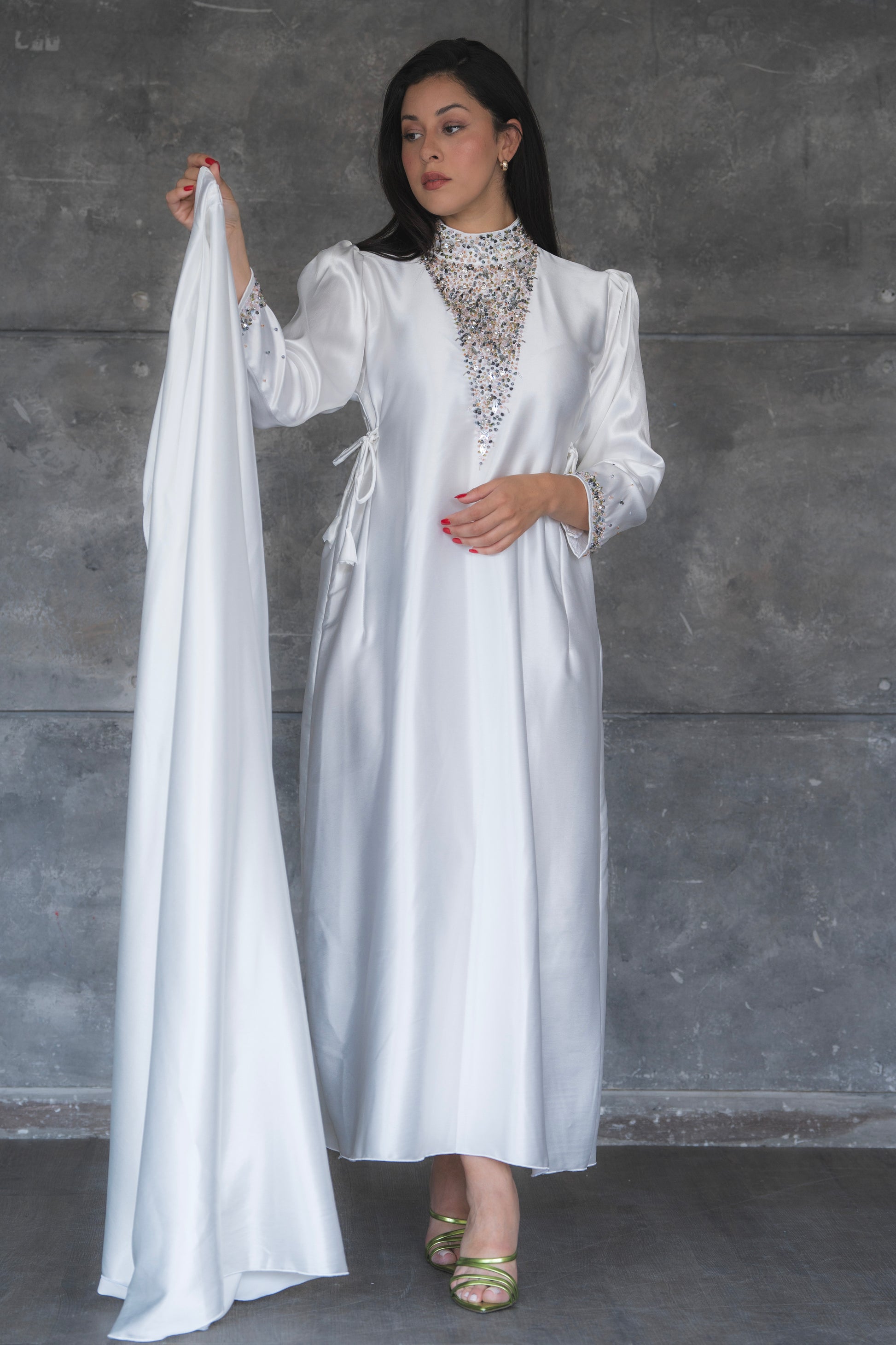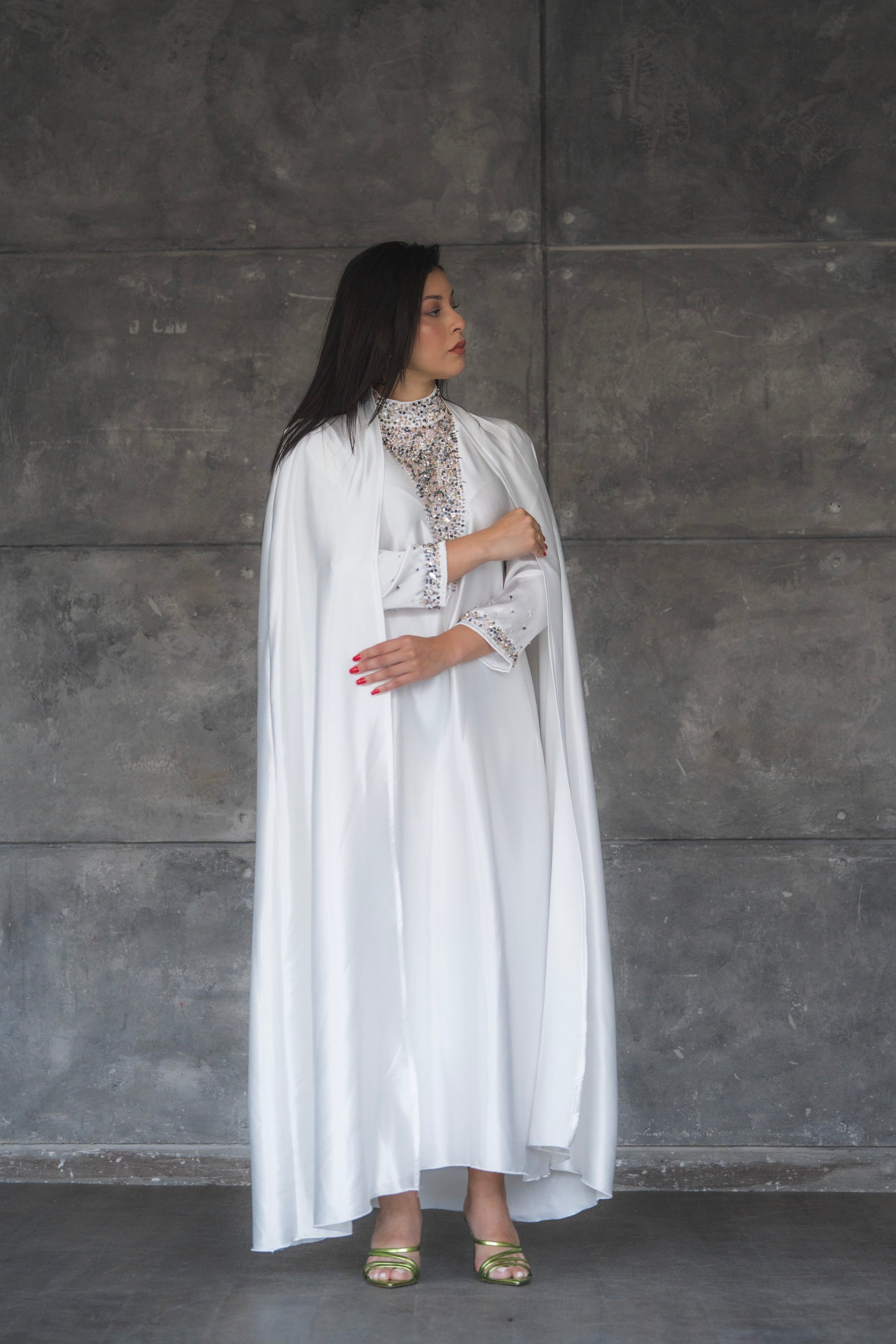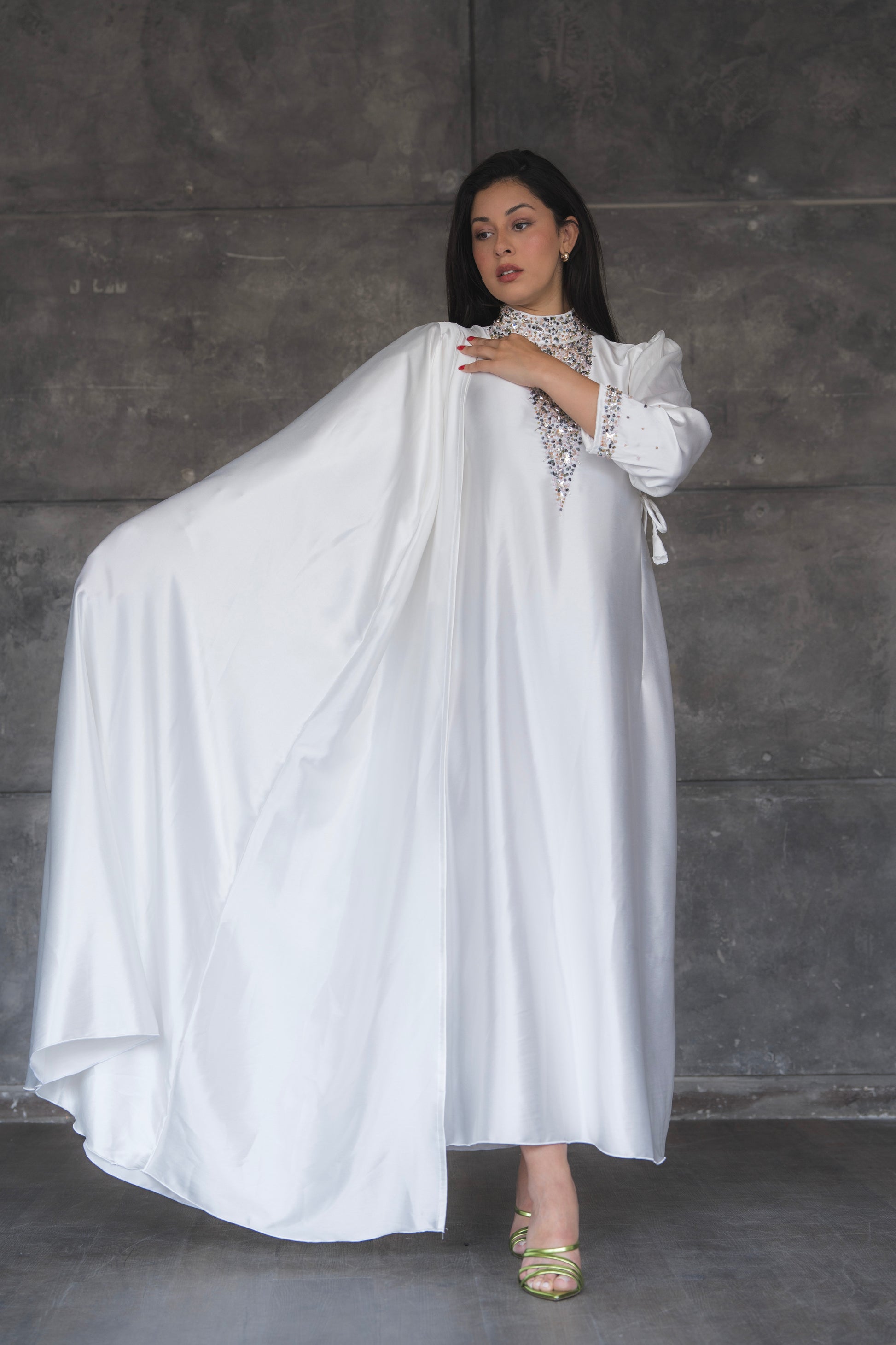 Fatima White Silk 2 Pieces Abaya Dress  Code 001