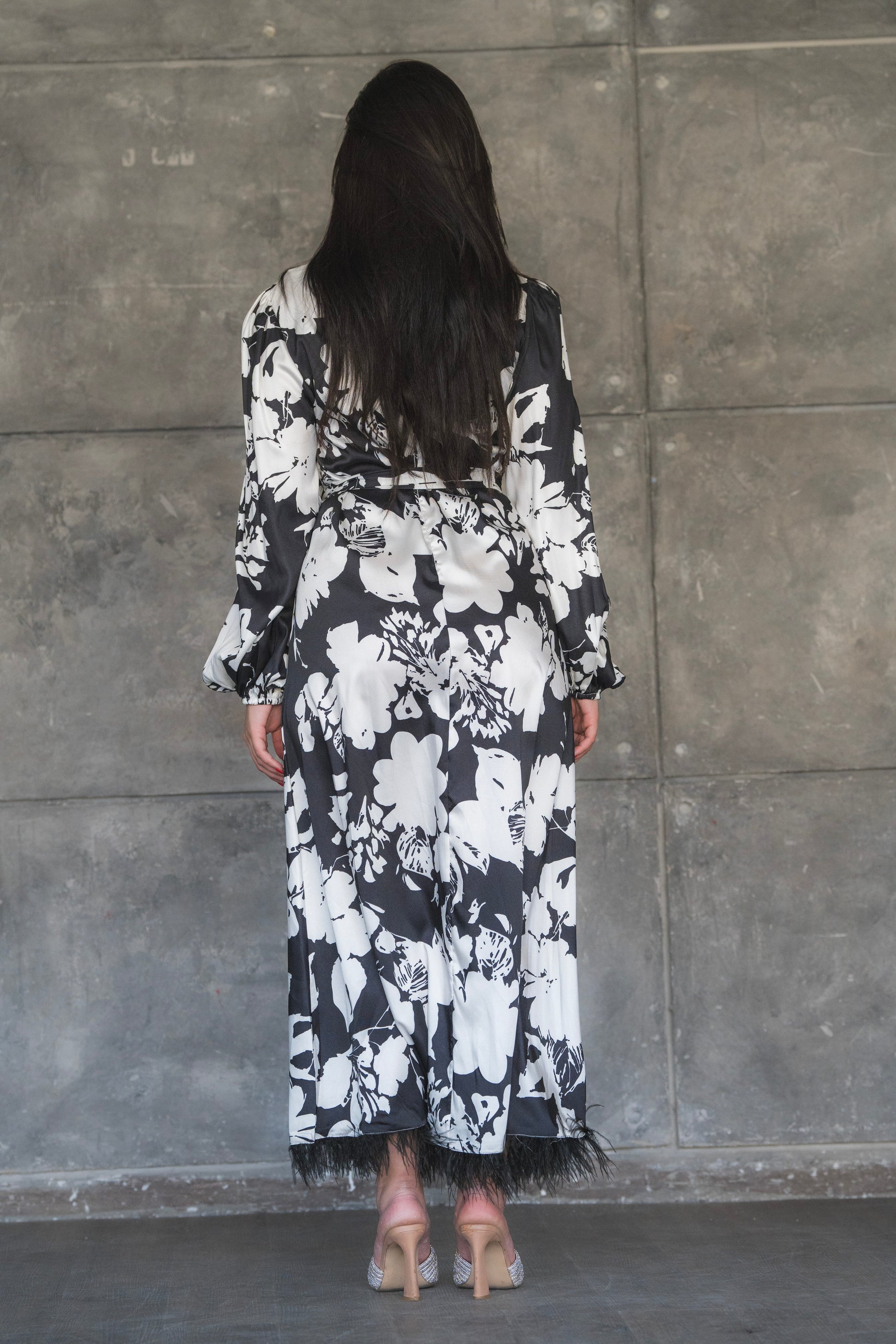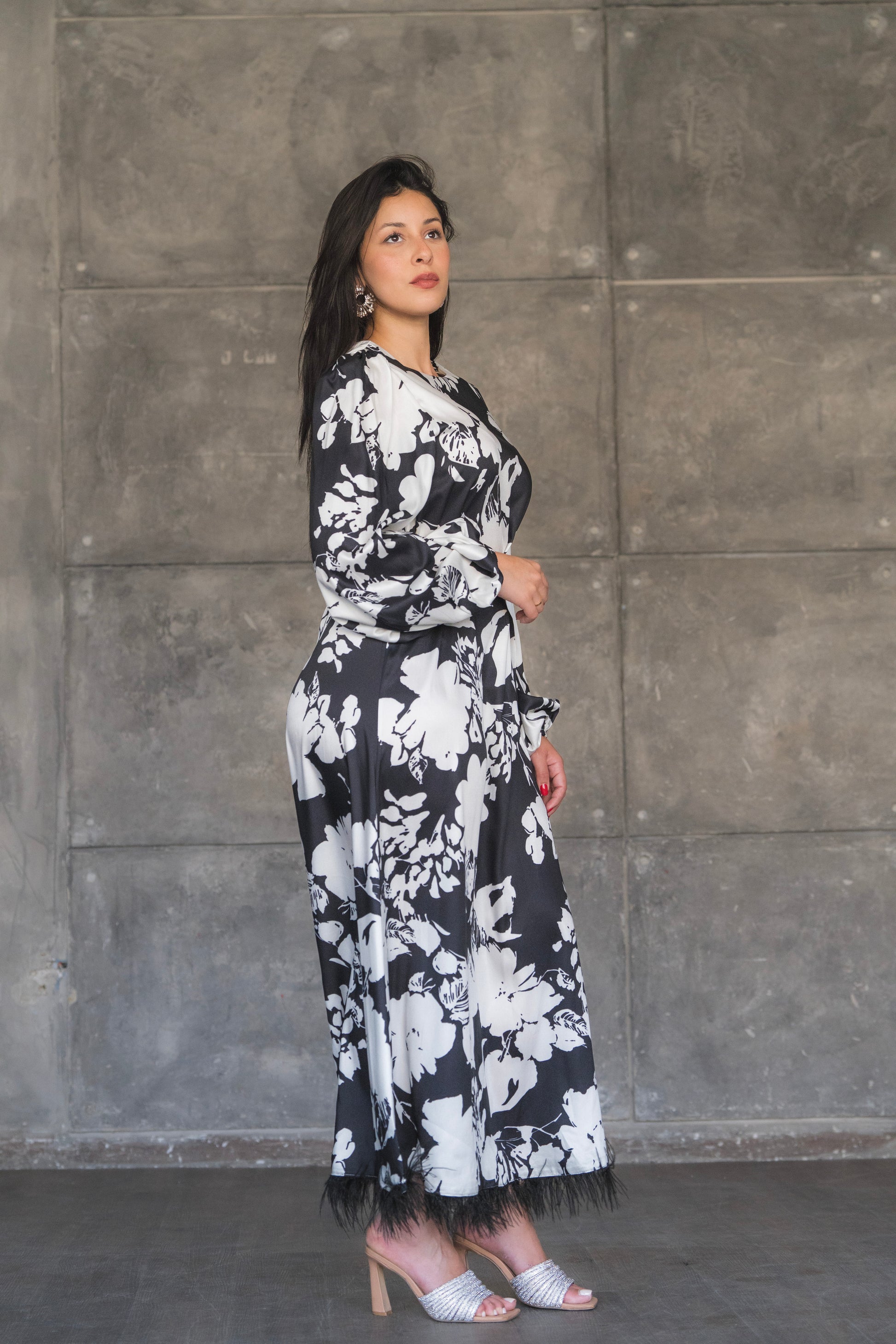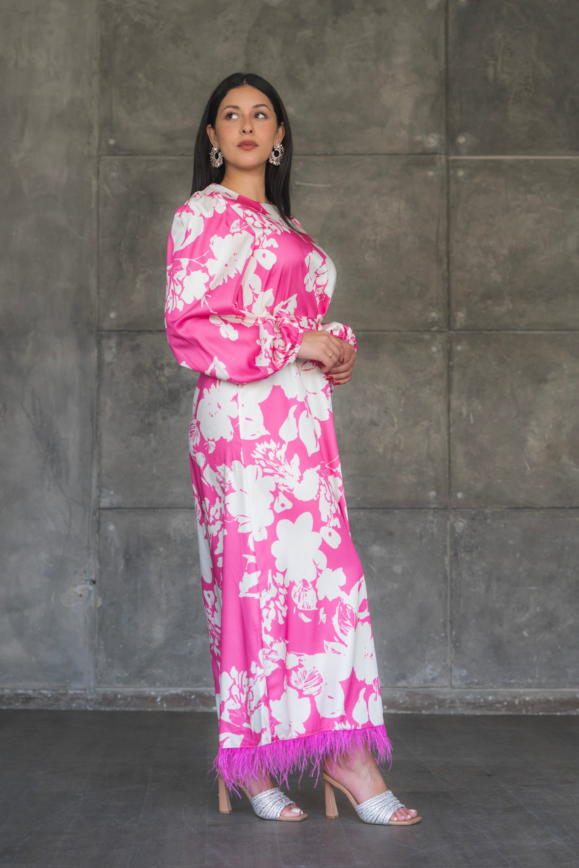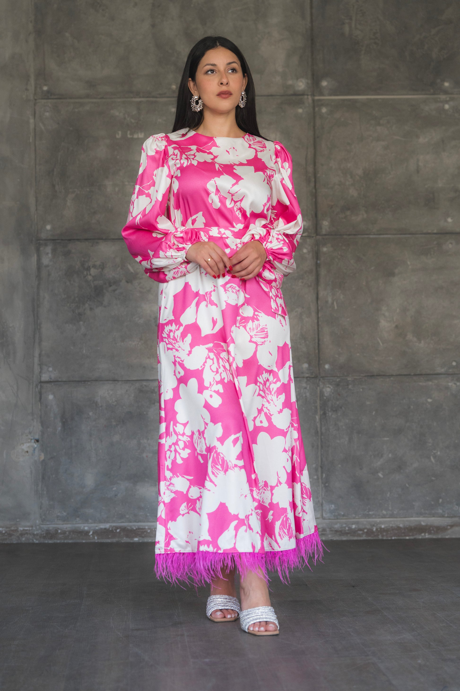 Step into playful elegance with this vibrant floral-print satin maxi dress, designed for the woman who loves to make a stylish impression. Featuring a soft sheen and flowy silhouette, this dress comes with voluminous sleeves, a flattering cinched waist, and delicate feather trim along the hem for a fun, feminine finish. Ideal for garden parties, Eid, summer soirées, or daytime events where style meets statement.
