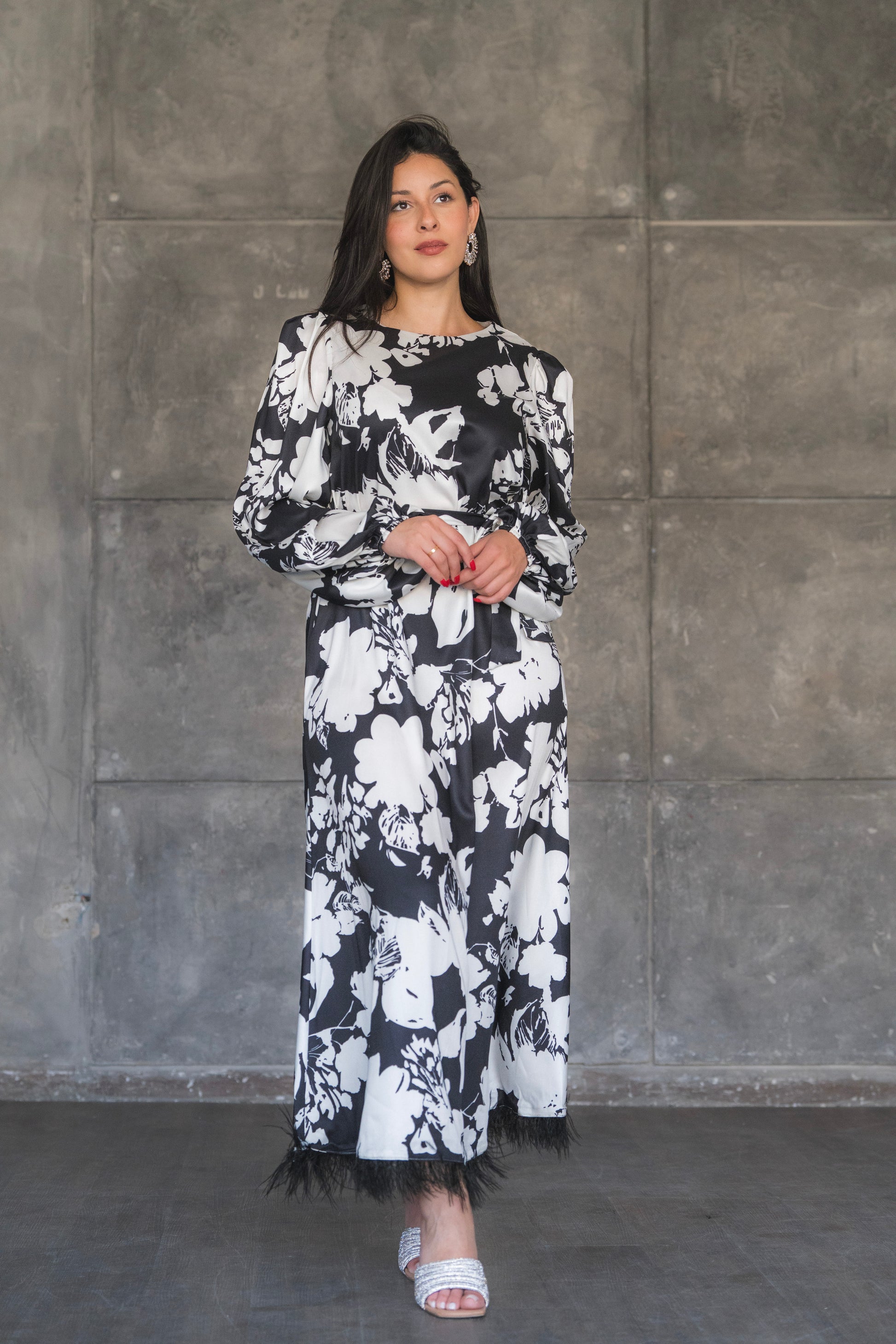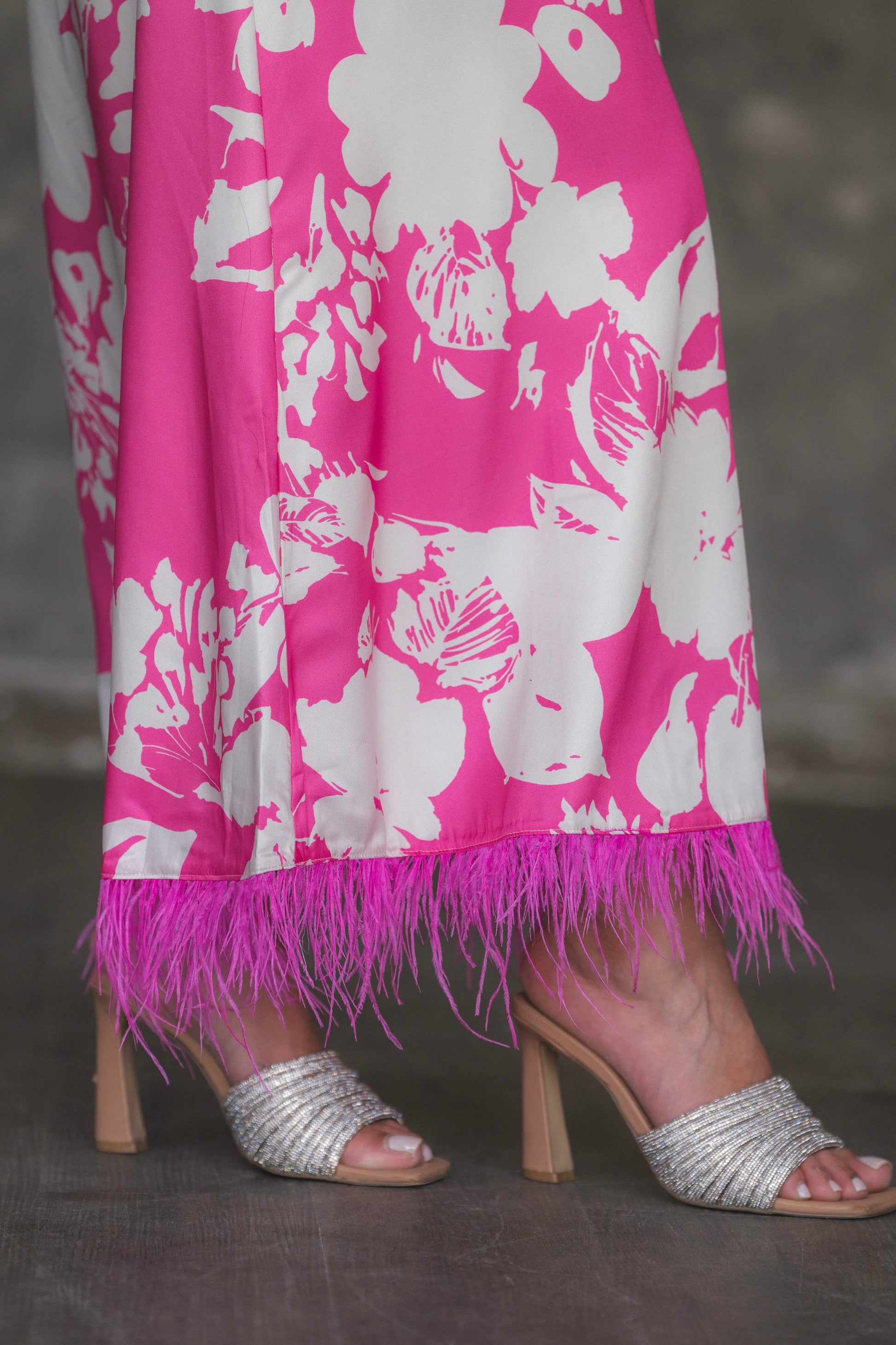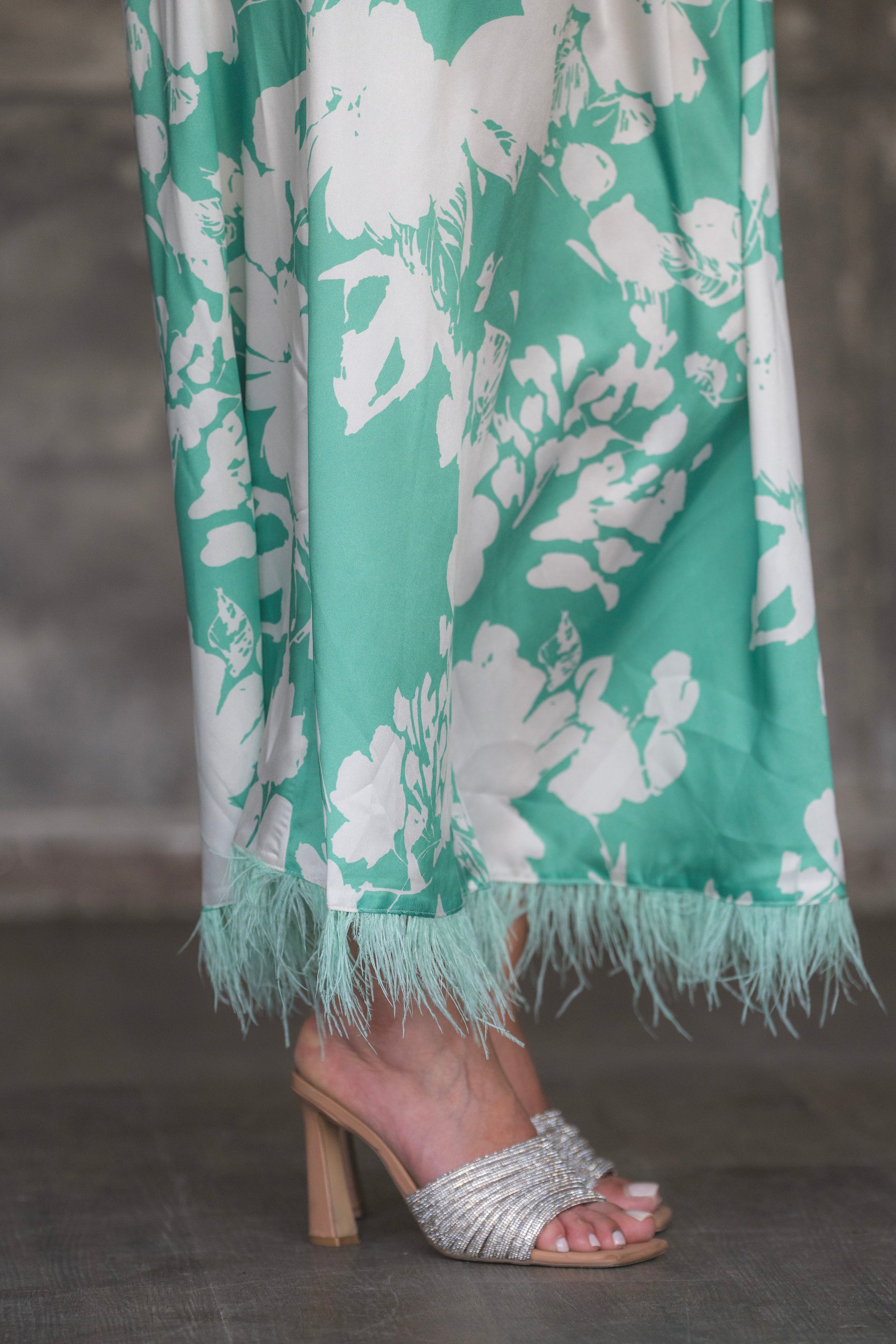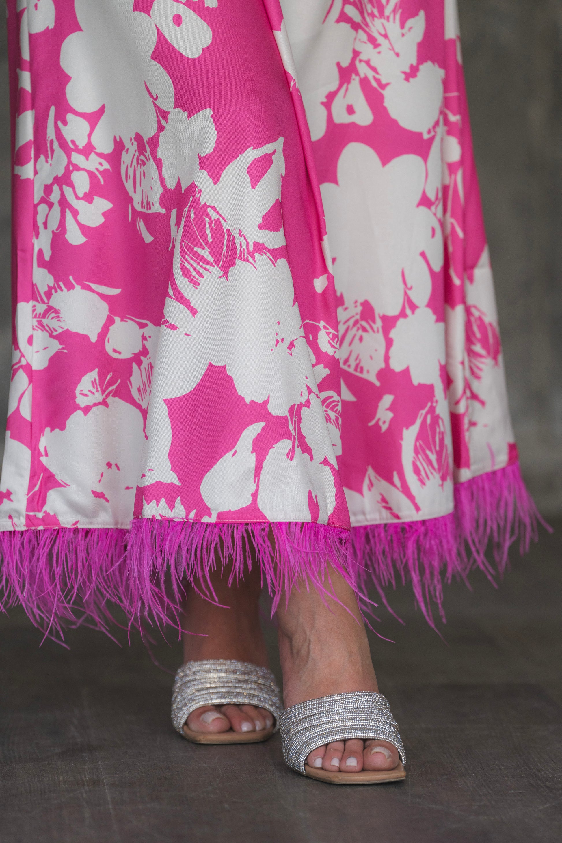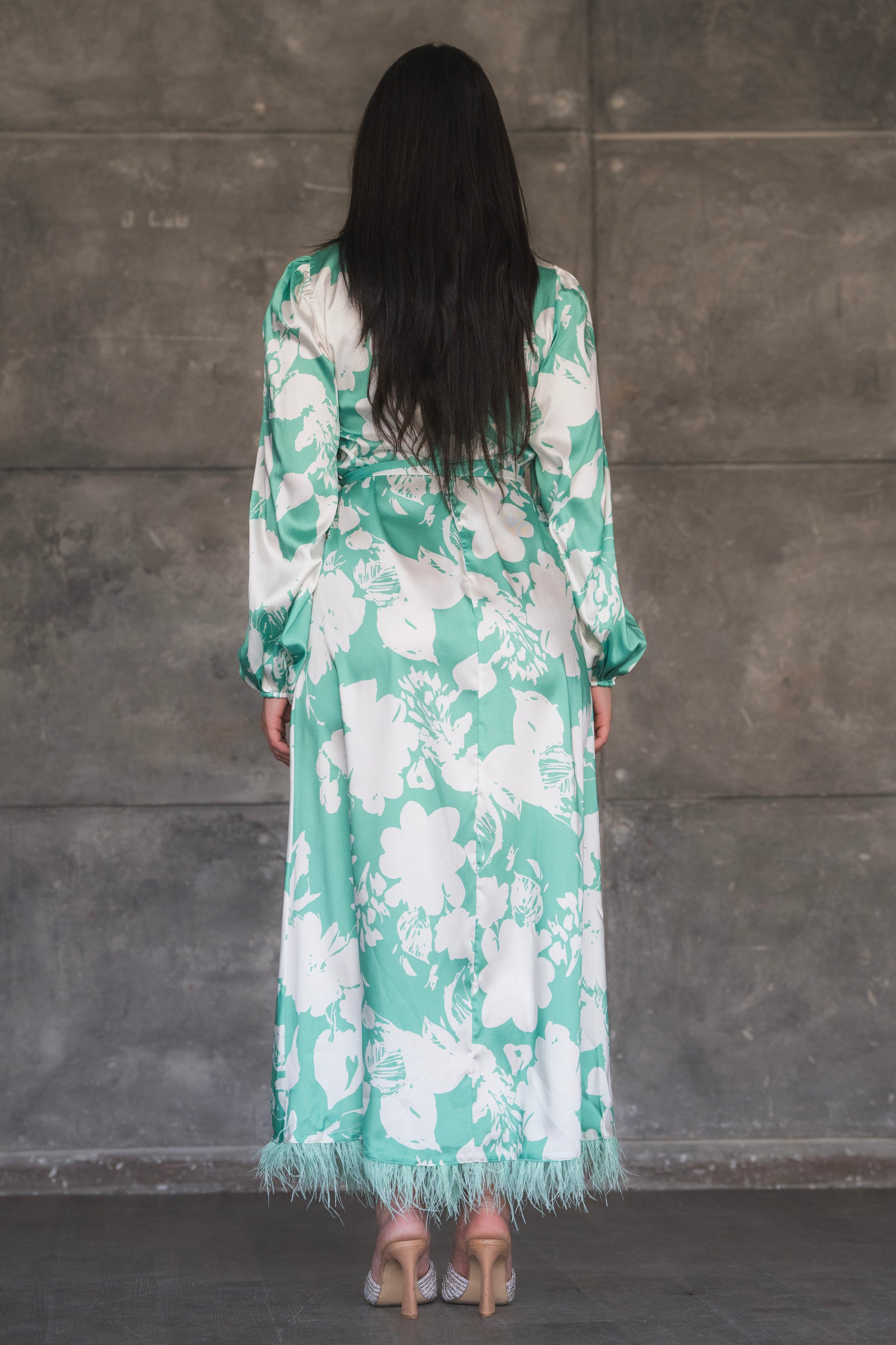 Step into playful elegance with this vibrant floral-print satin maxi dress, designed for the woman who loves to make a stylish impression. Featuring a soft sheen and flowy silhouette, this dress comes with voluminous sleeves, a flattering cinched waist, and delicate feather trim along the hem for a fun, feminine finish. Ideal for garden parties, Eid, summer soirées, or daytime events where style meets statement.