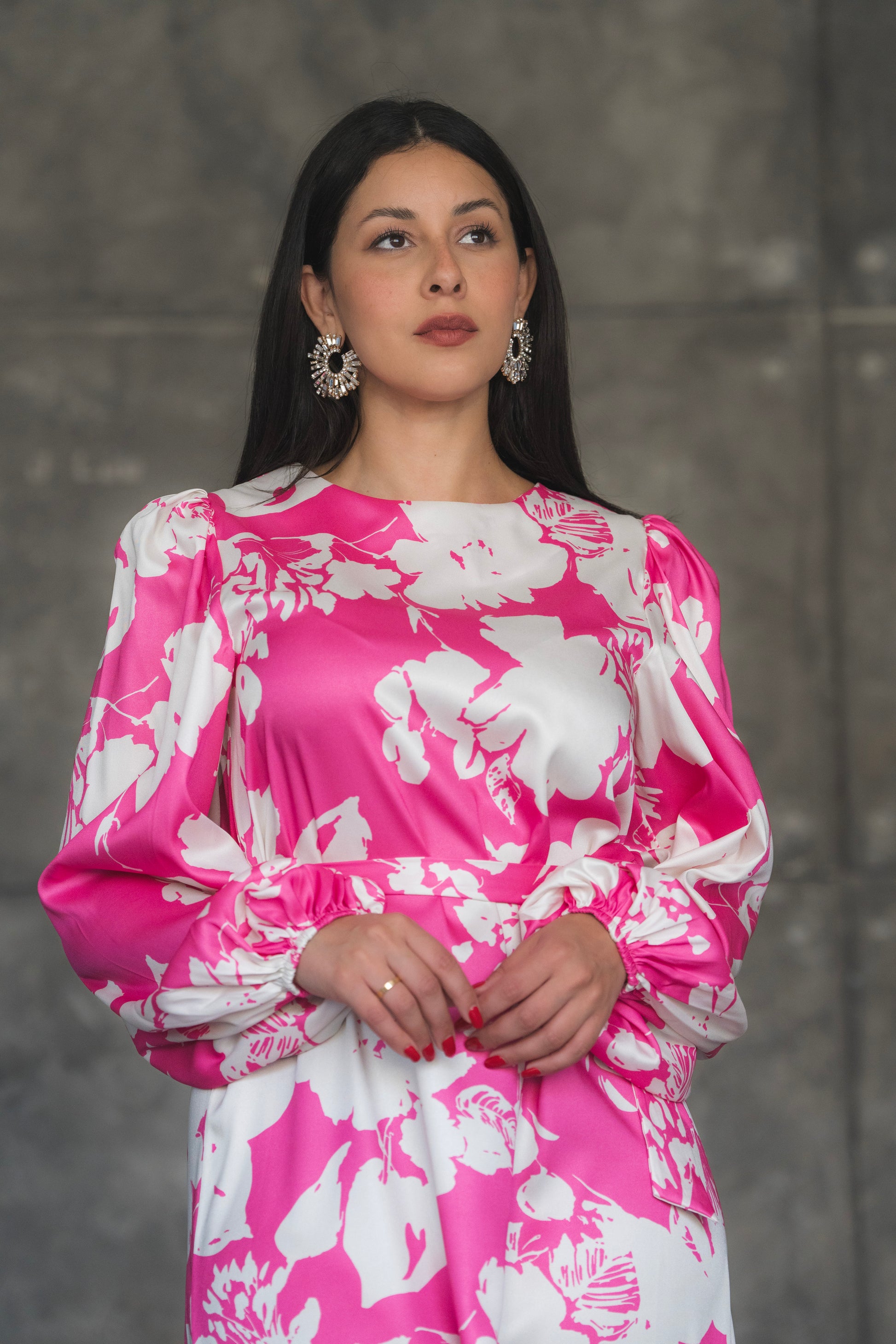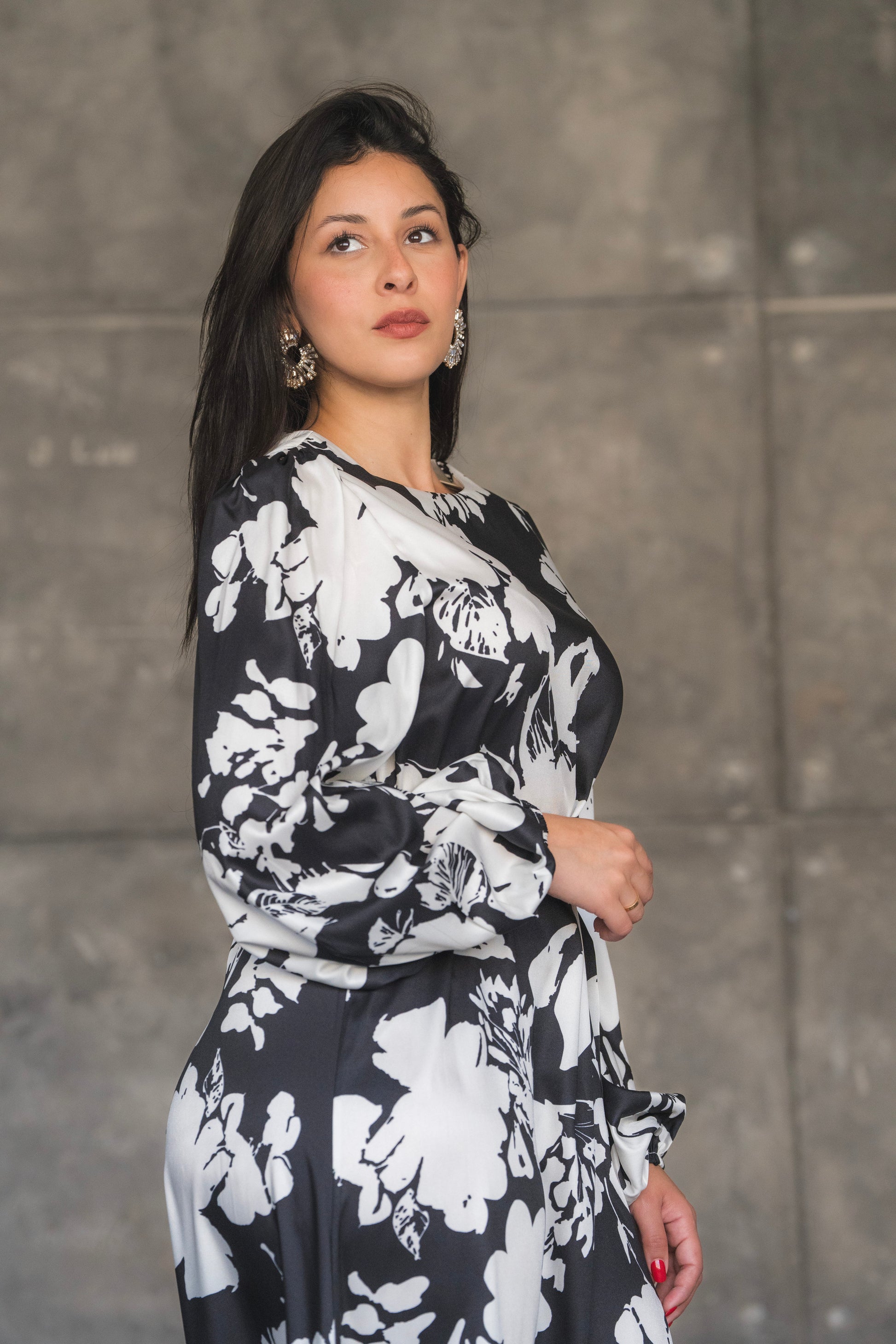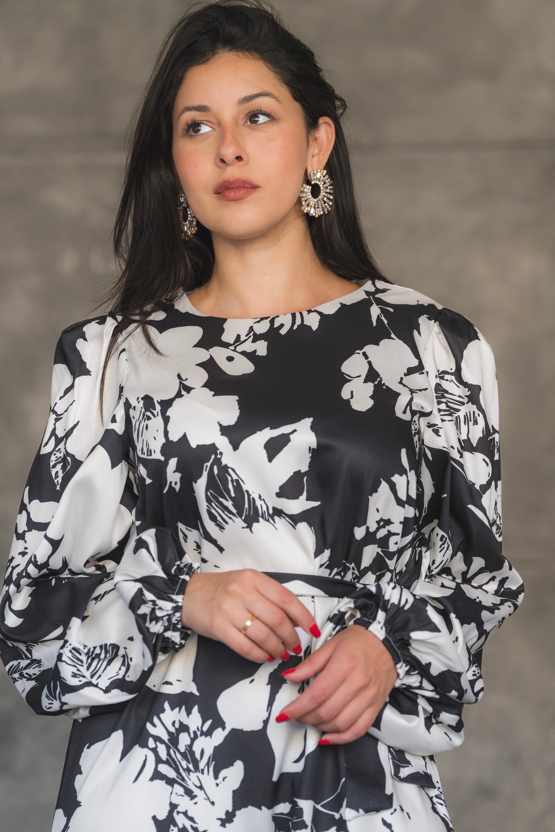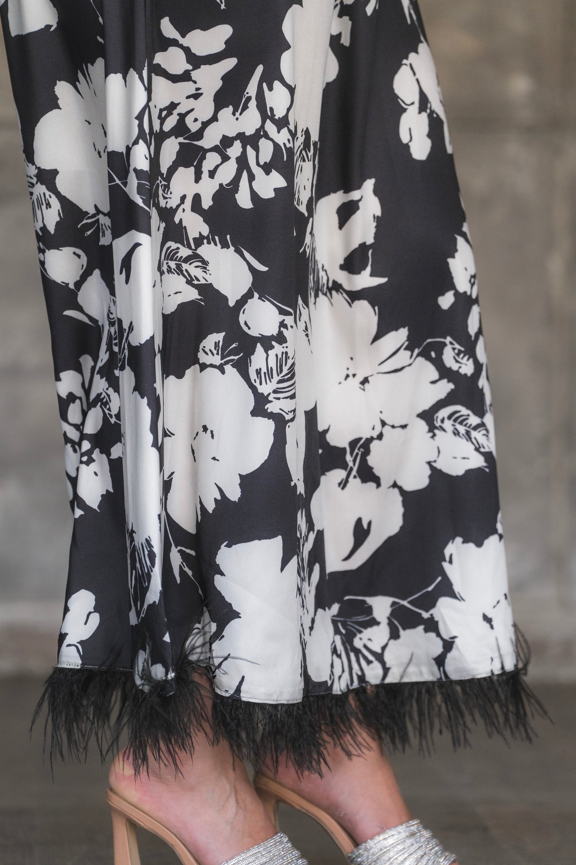 Step into playful elegance with this vibrant floral-print satin maxi dress, designed for the woman who loves to make a stylish impression. Featuring a soft sheen and flowy silhouette, this dress comes with voluminous sleeves, a flattering cinched waist, and delicate feather trim along the hem for a fun, feminine finish. Ideal for garden parties, Eid, summer soirées, or daytime events where style meets statement.