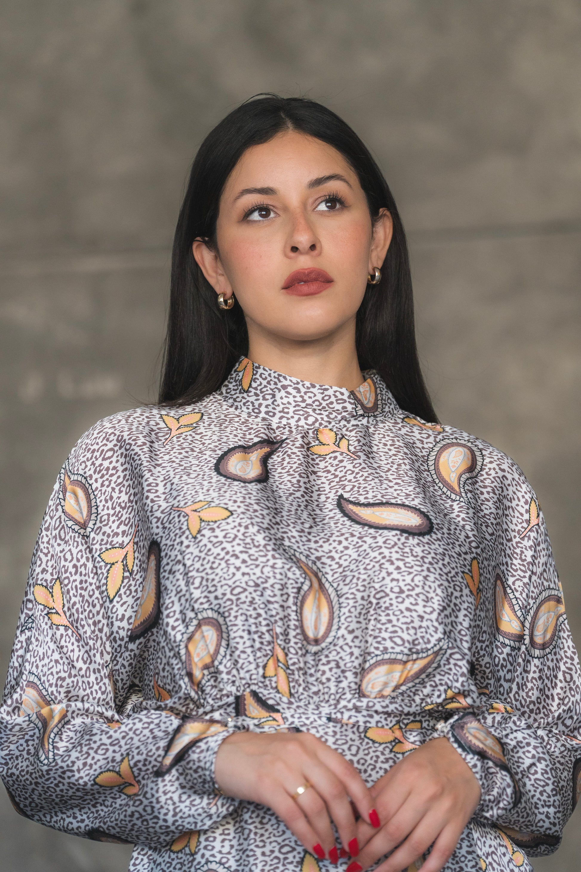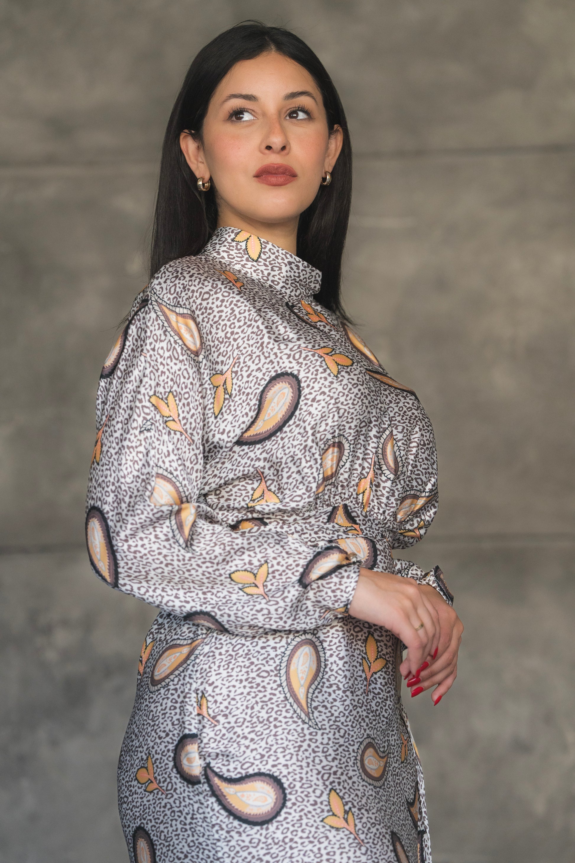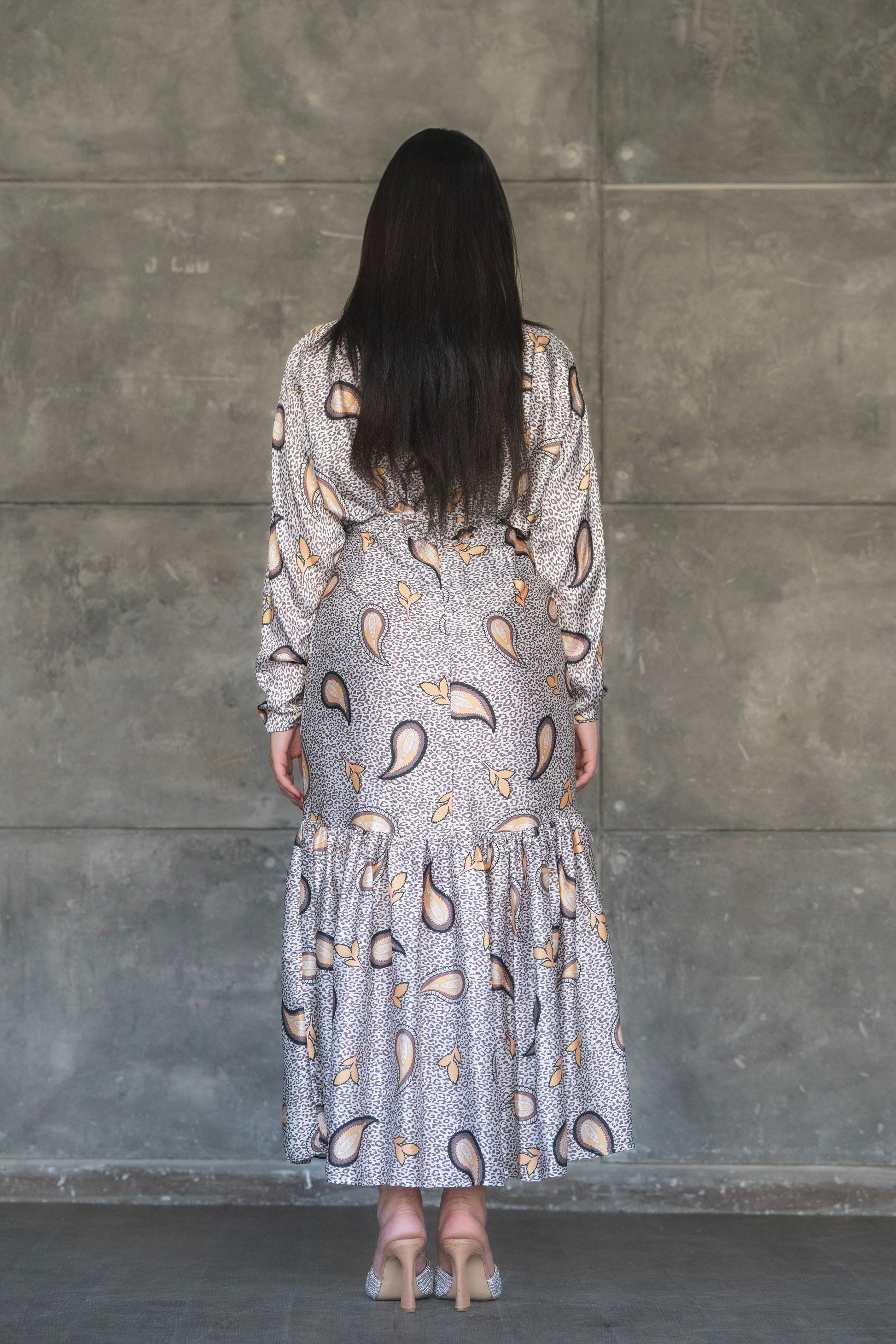 Gray and Yellow Turkish Satin Printed Dress