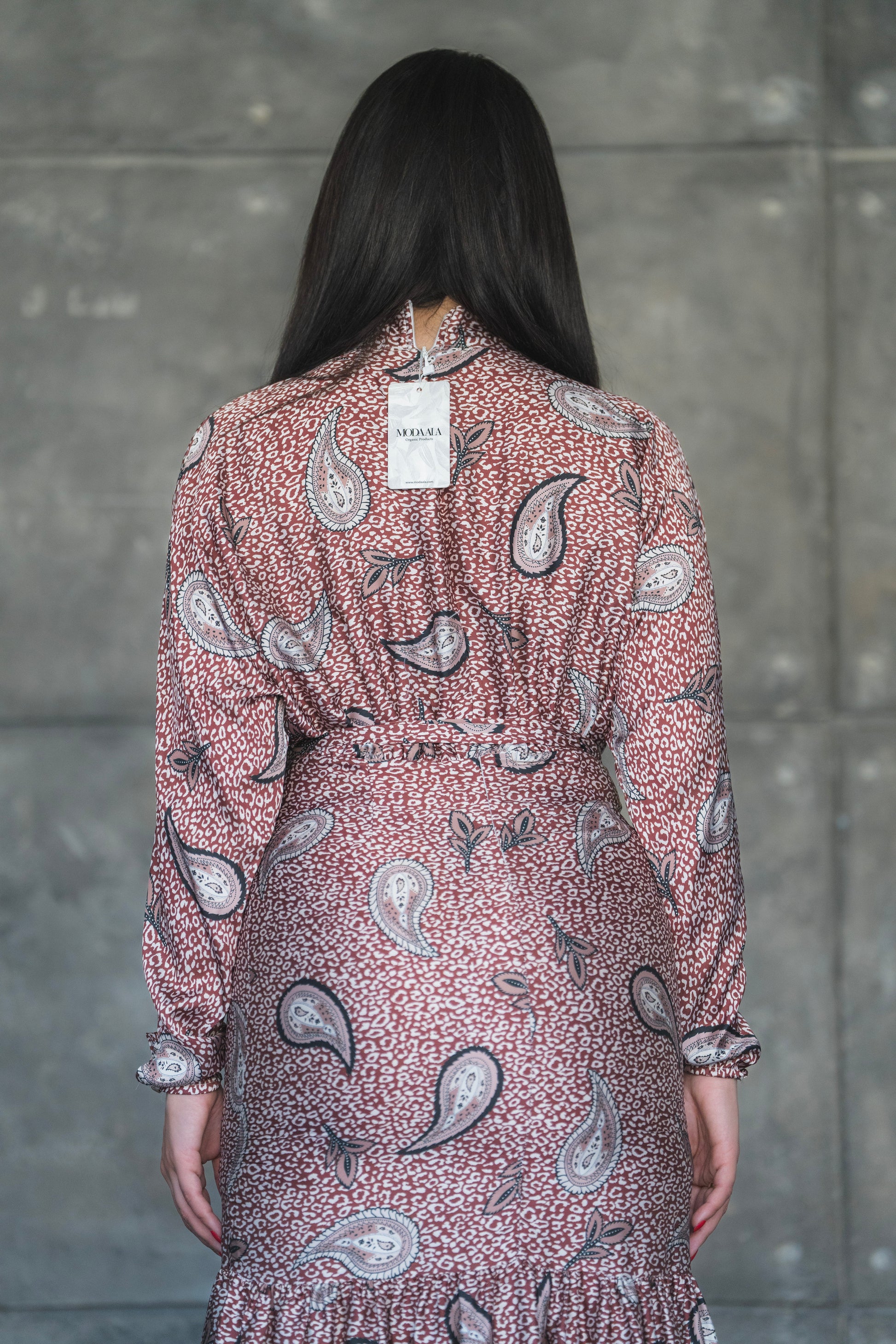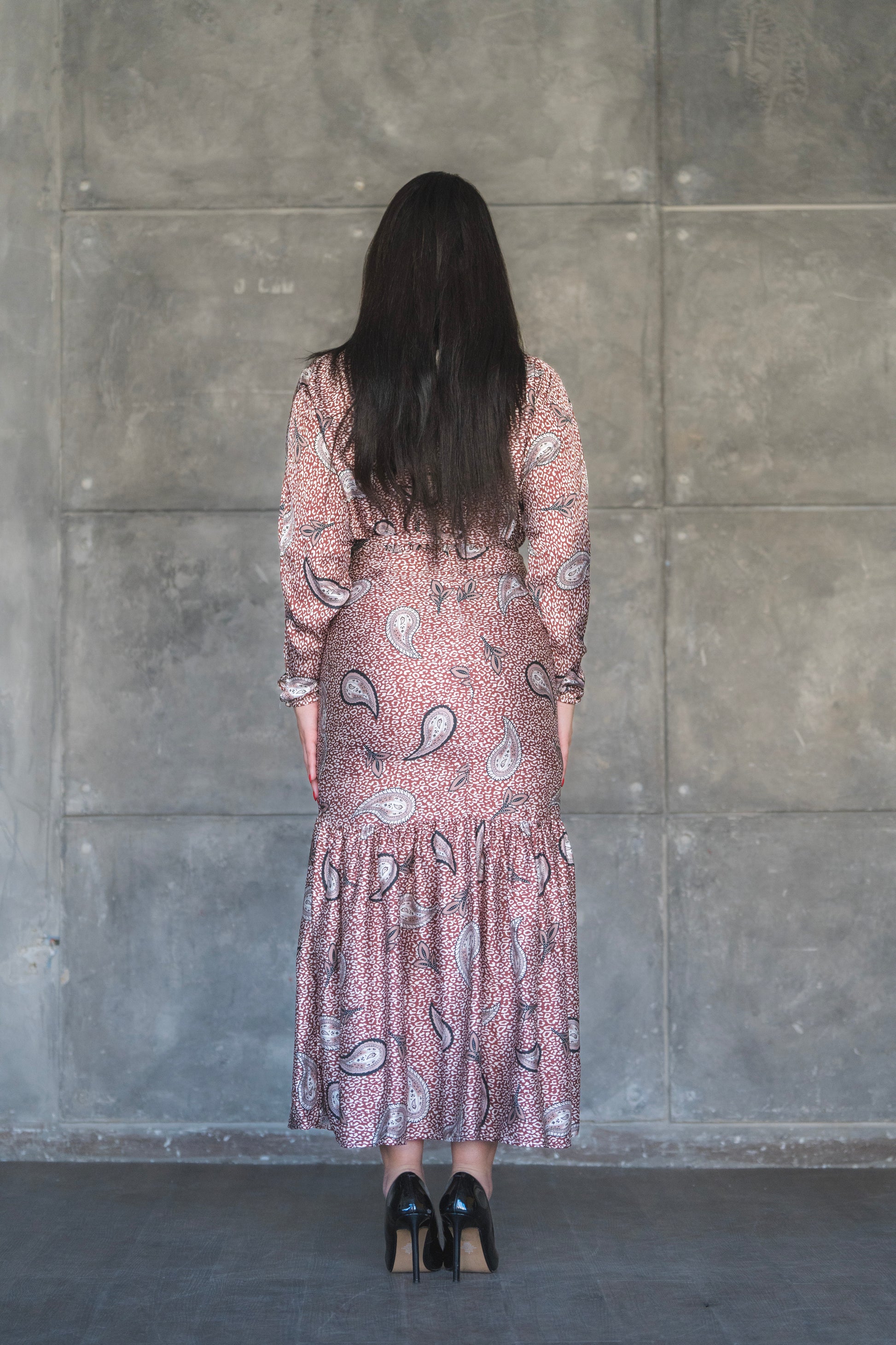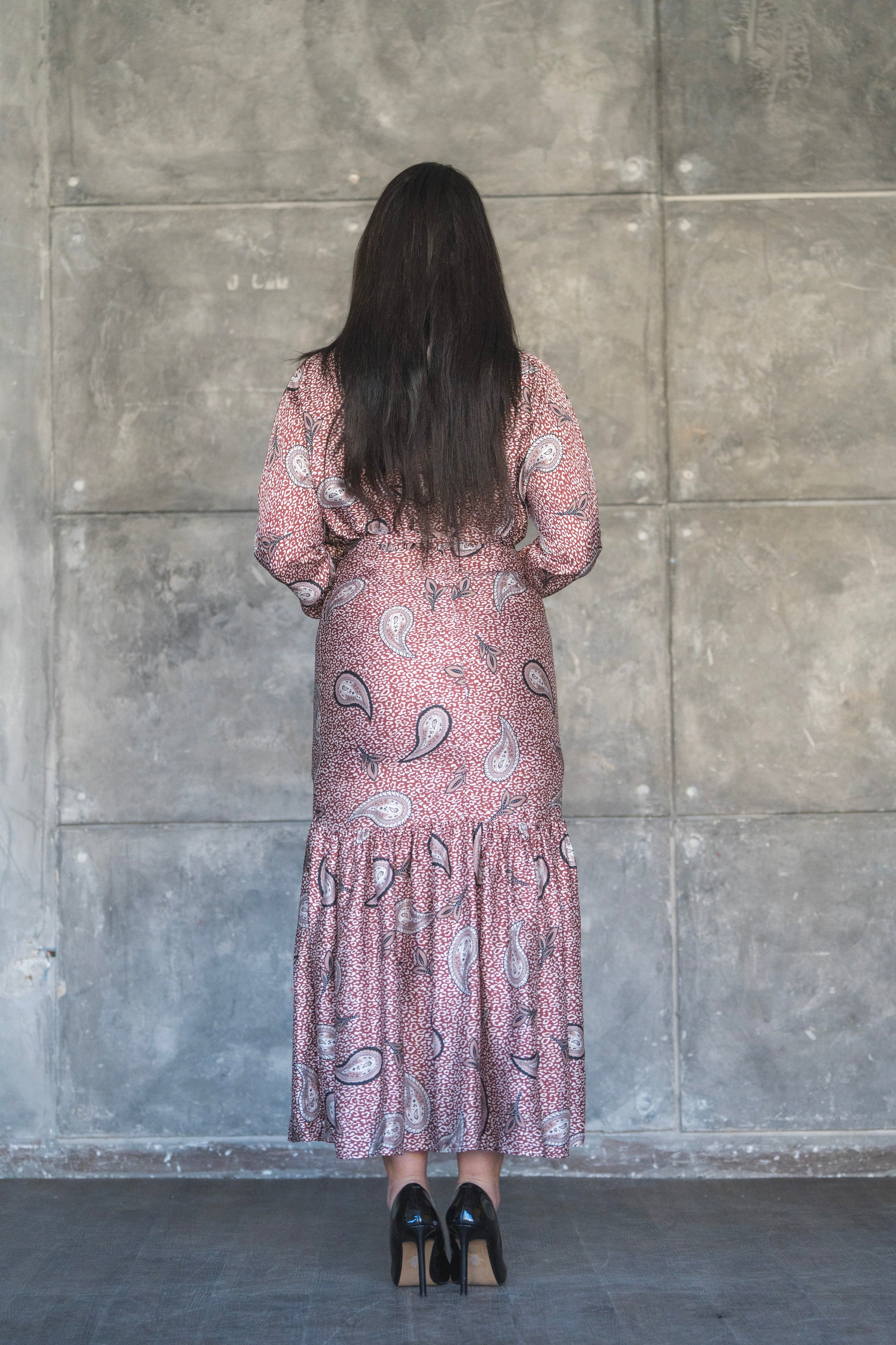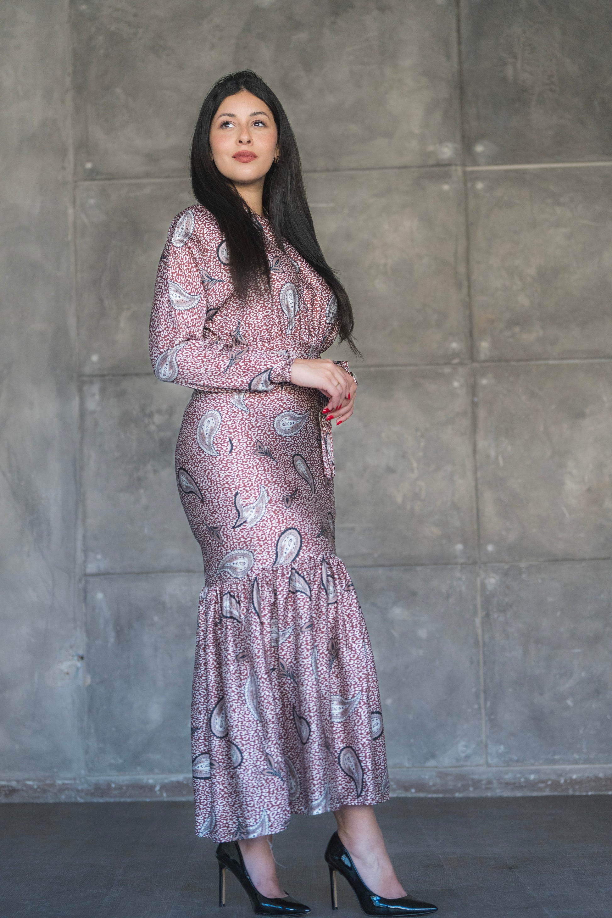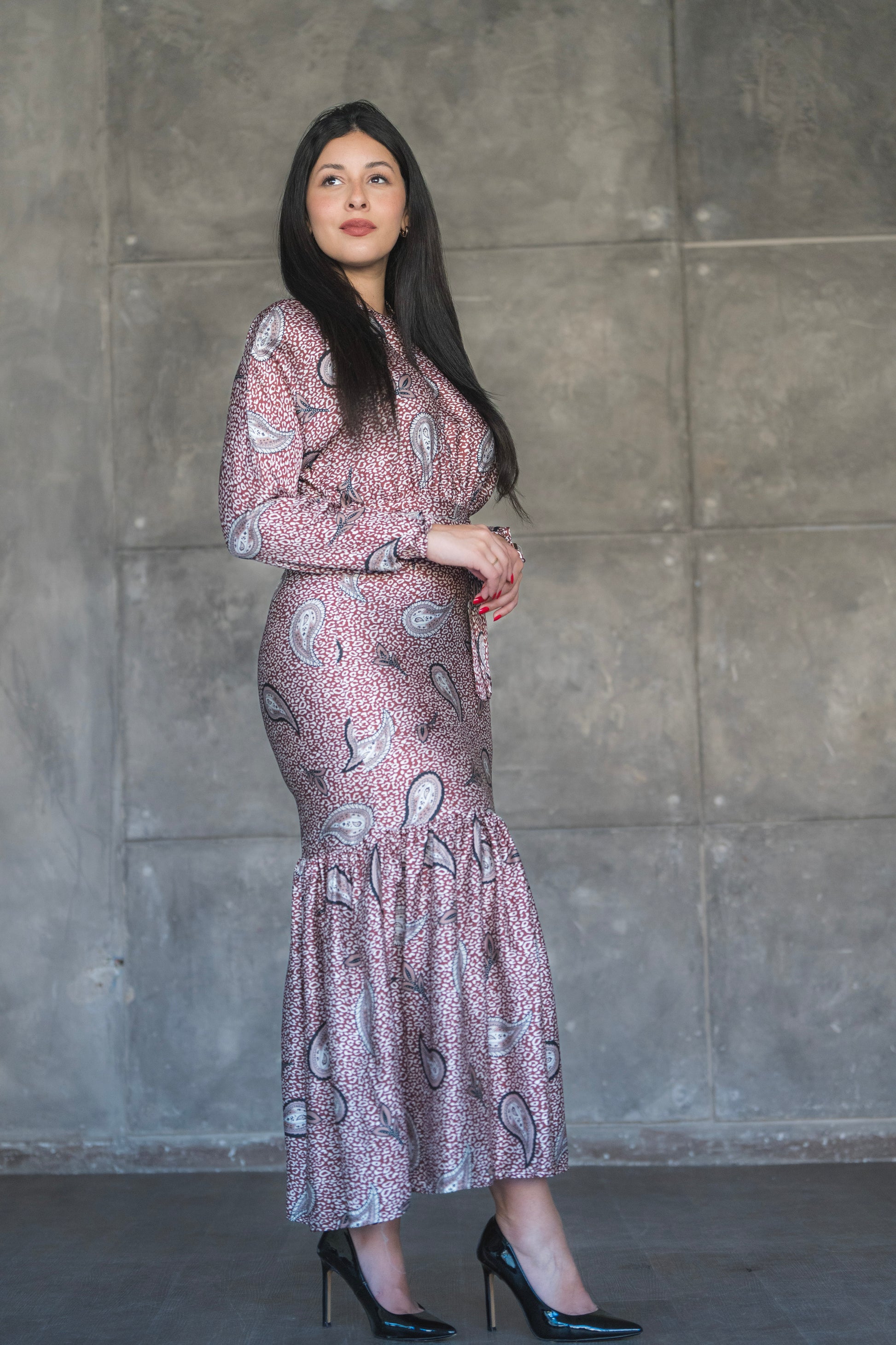 Step into elegance with the Rosewood Paisley Midi Dress – a perfect blend of vintage charm and modern grace. Featuring a soft rose-toned base adorned with classic paisley motifs, this dress is designed to make a subtle yet striking statement. The high neckline and long sleeves offer modest sophistication, while the flared tier at the hemline adds graceful movement and flair.