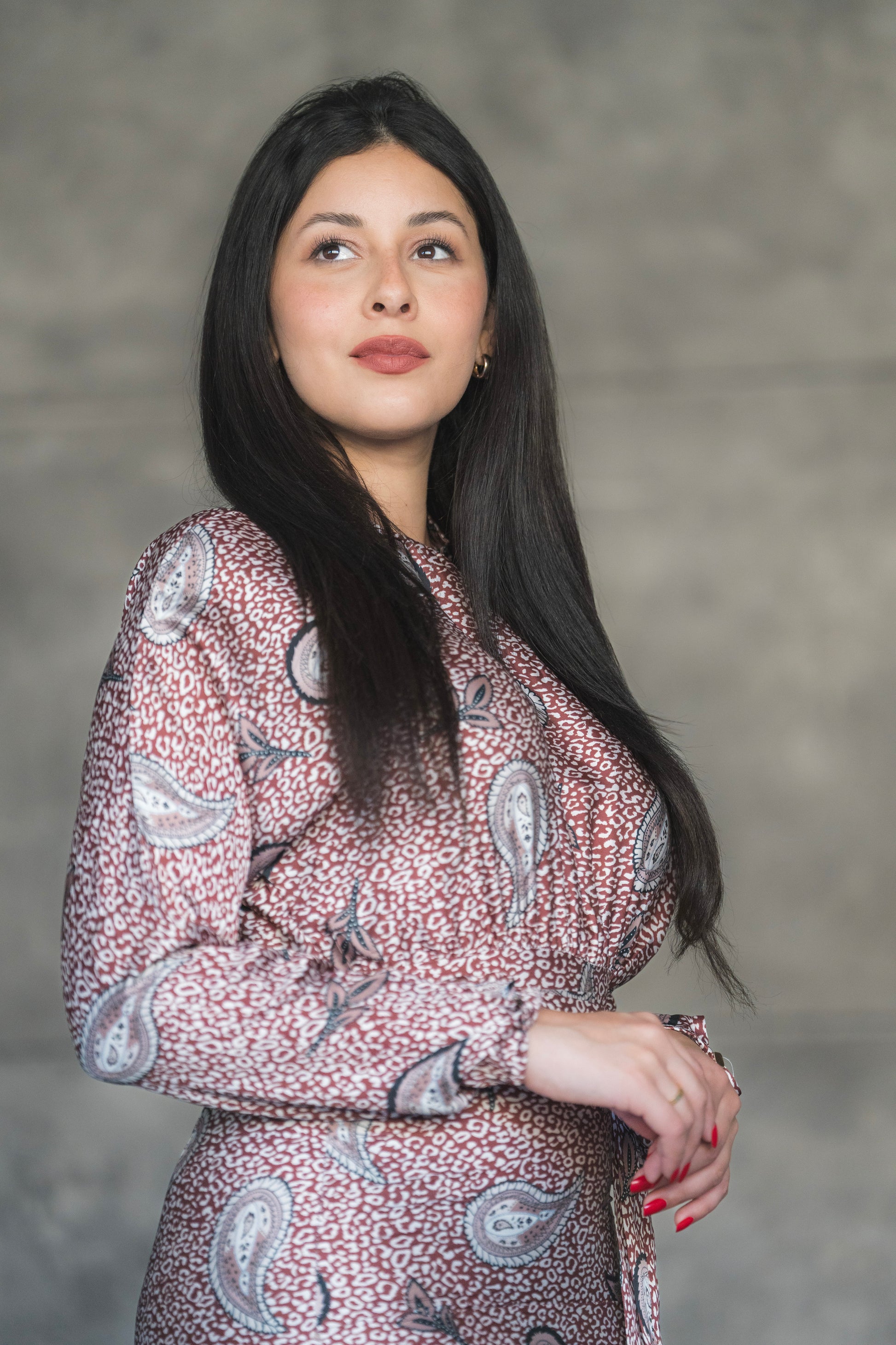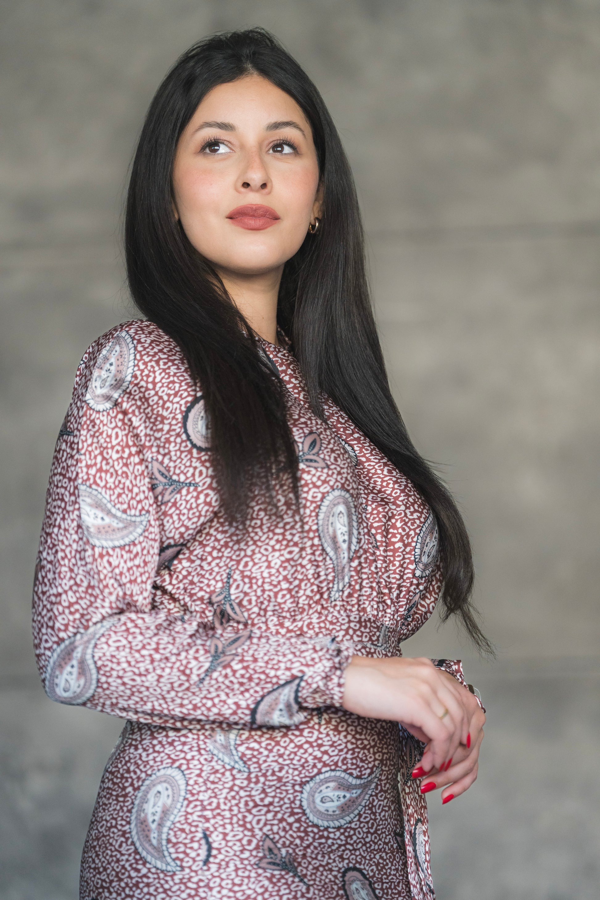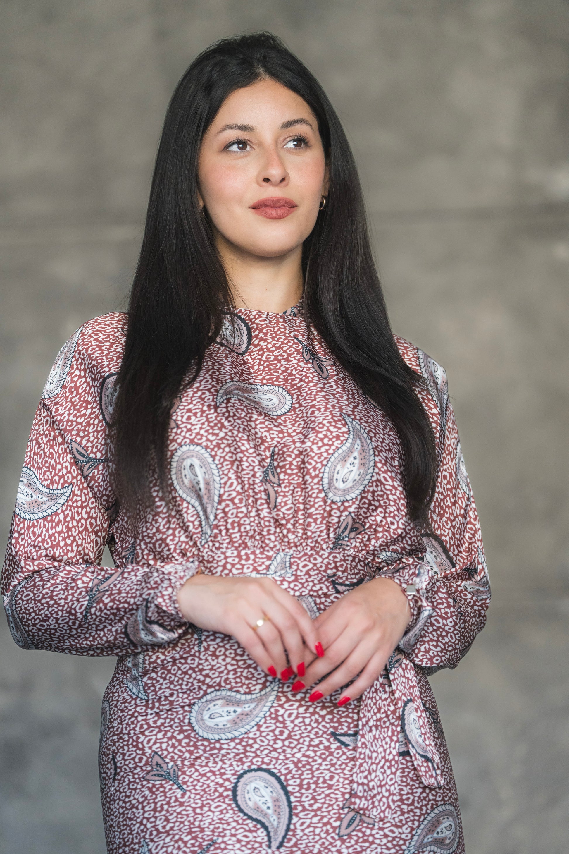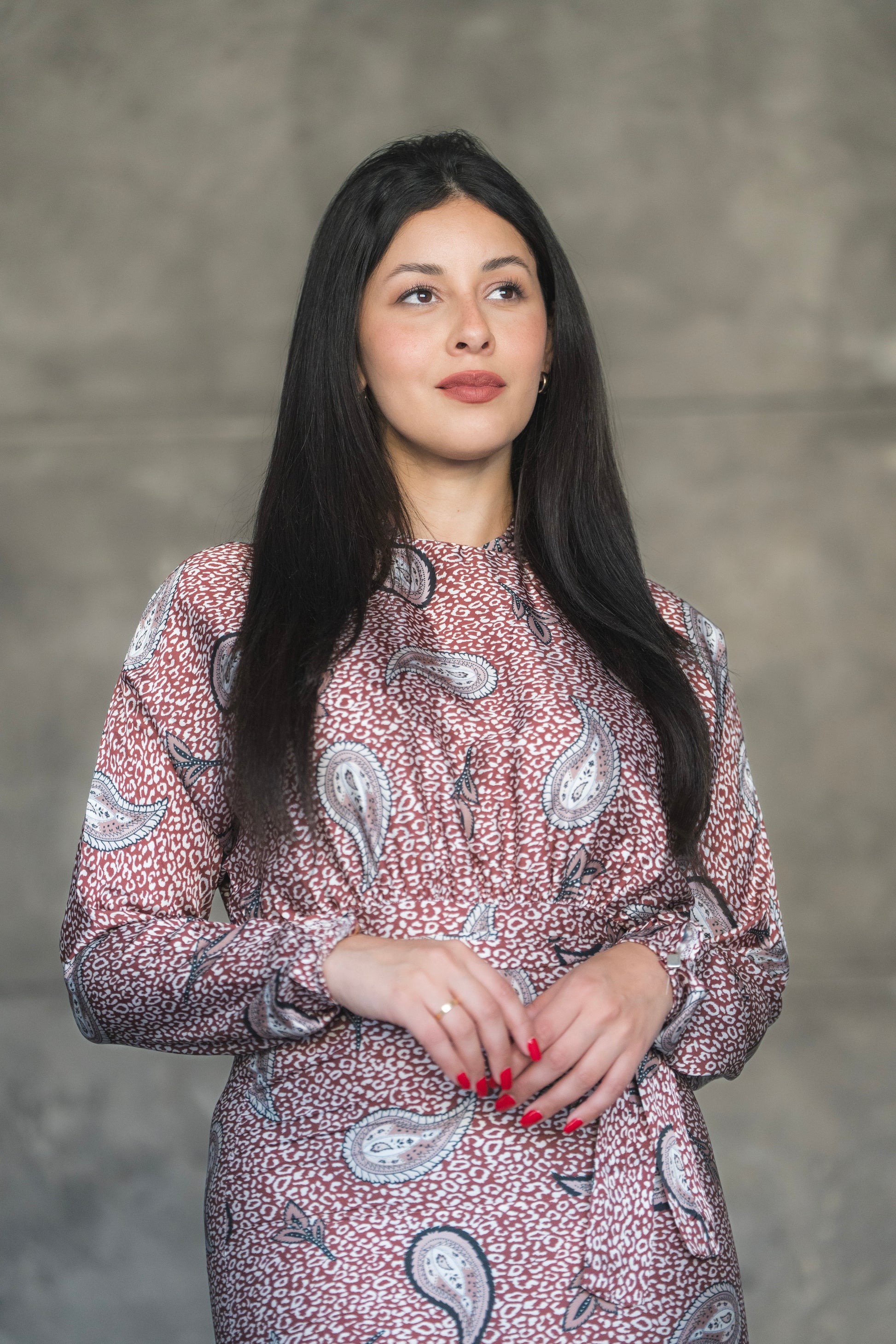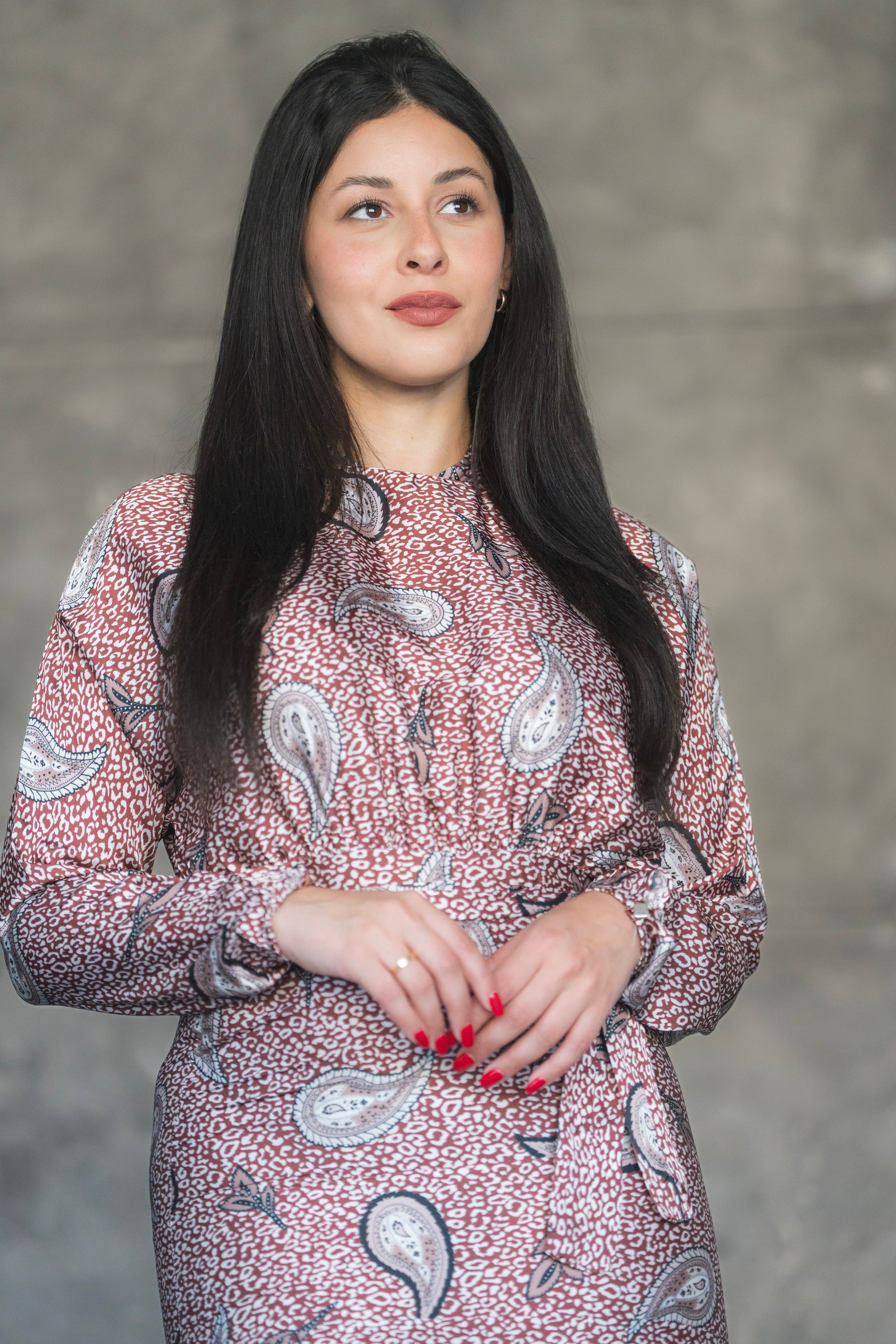 Step into elegance with the Rosewood Paisley Midi Dress – a perfect blend of vintage charm and modern grace. Featuring a soft rose-toned base adorned with classic paisley motifs, this dress is designed to make a subtle yet striking statement. The high neckline and long sleeves offer modest sophistication, while the flared tier at the hemline adds graceful movement and flair.