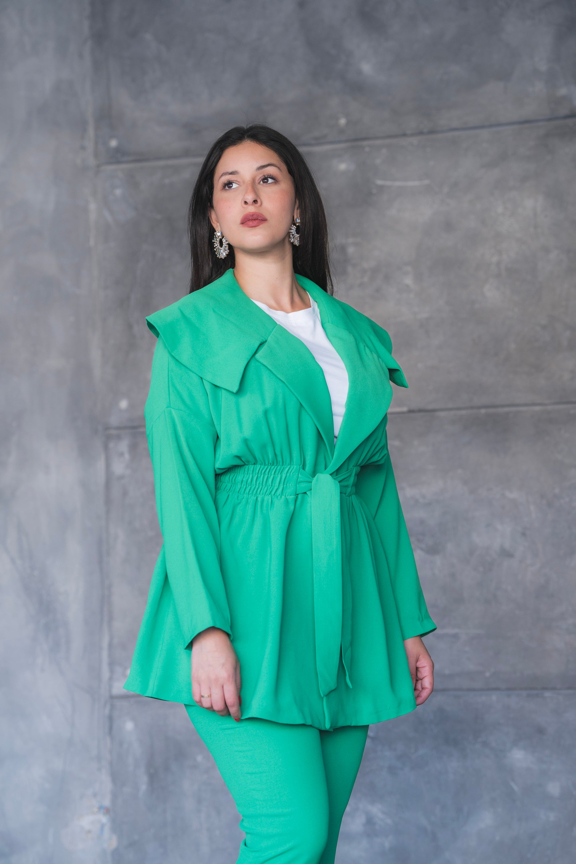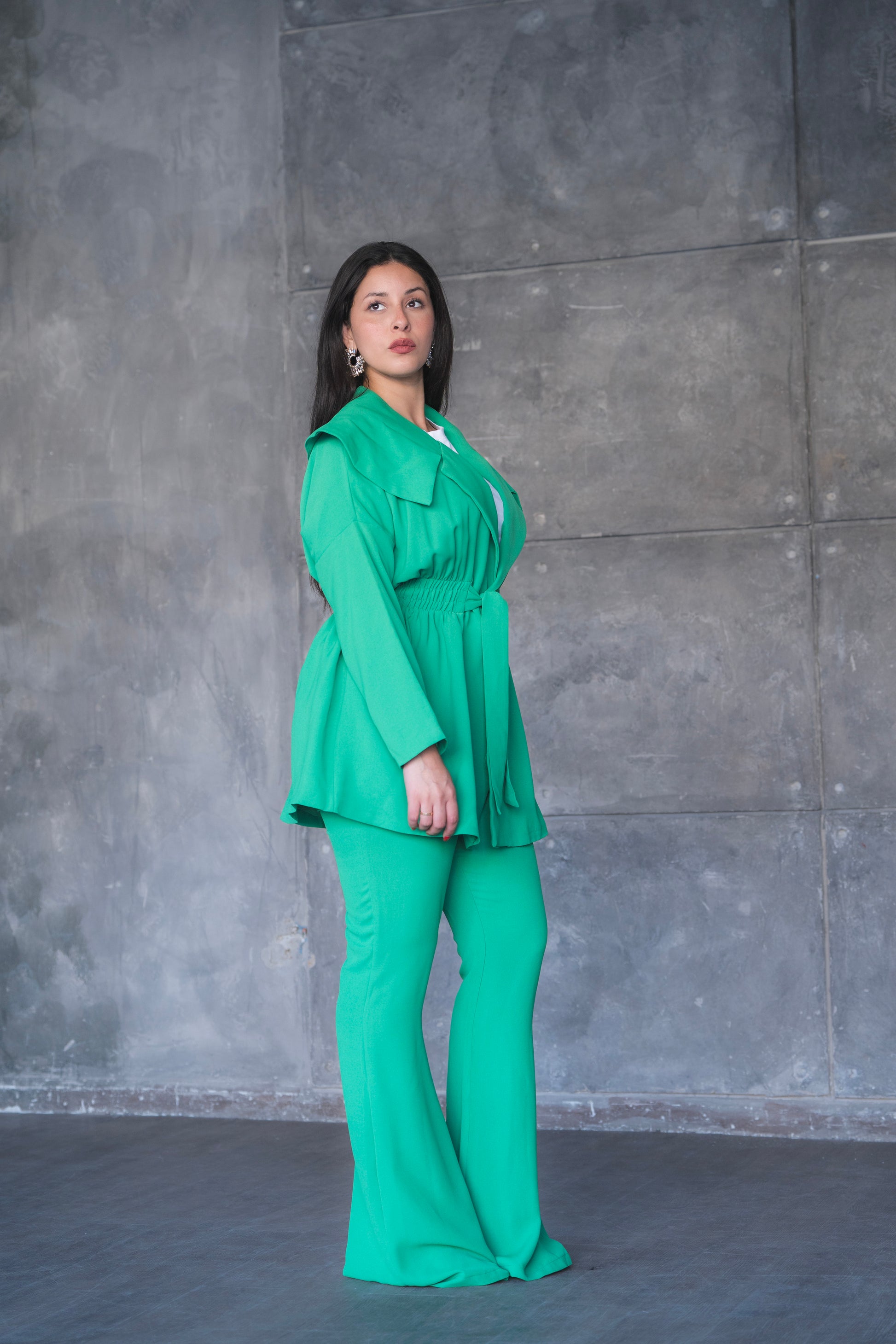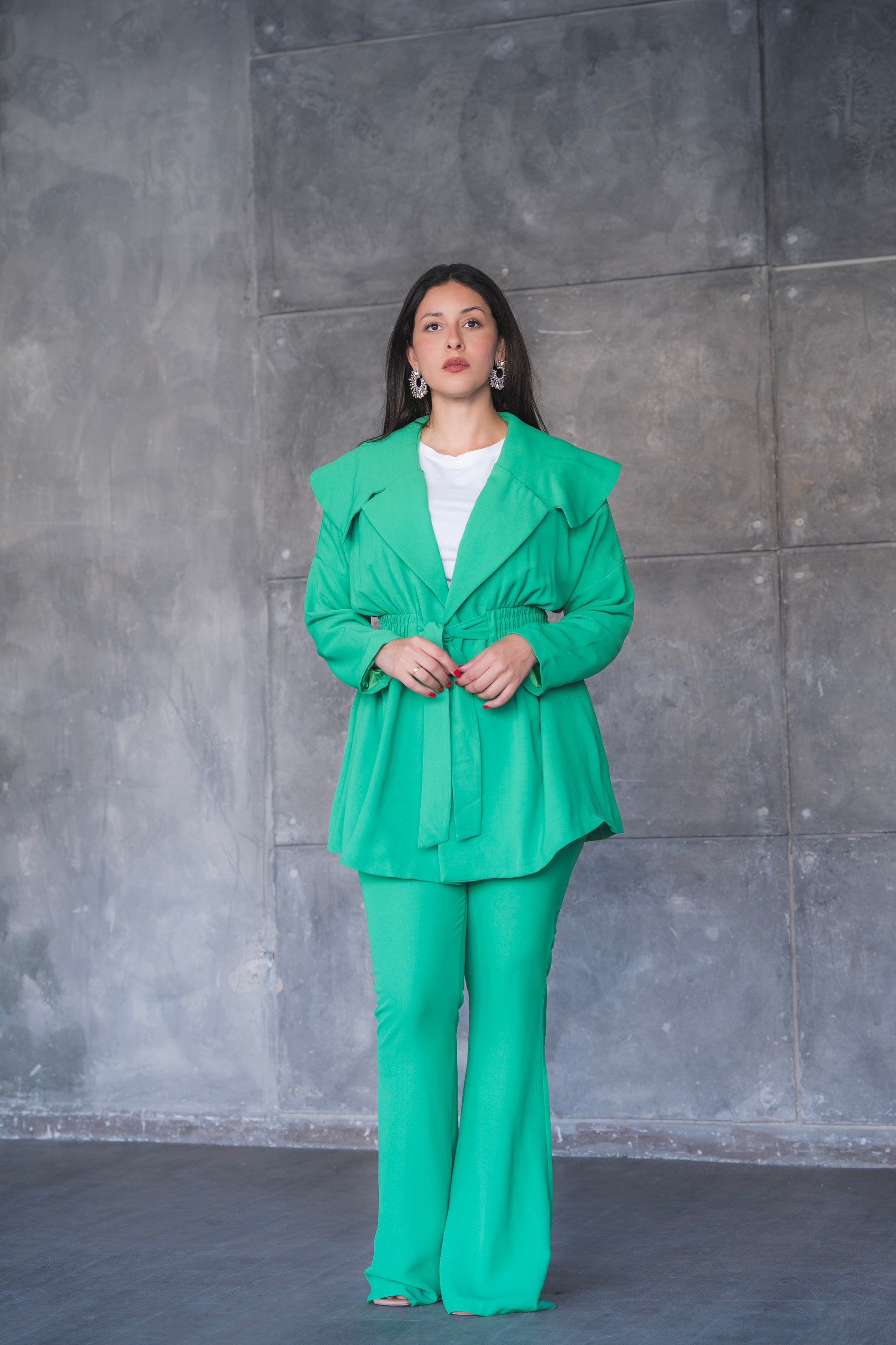 levate your power-dressing game with this striking green pantsuit set — where bold color meets tailored elegance. Featuring a longline jacket with oversized lapels and a belted waist for a cinched, feminine silhouette, this set is completed with matching high-waisted flared trousers for a look that's both polished and fashion-forward. Perfect for business events, formal outings, or any occasion where you want to stand out in style.