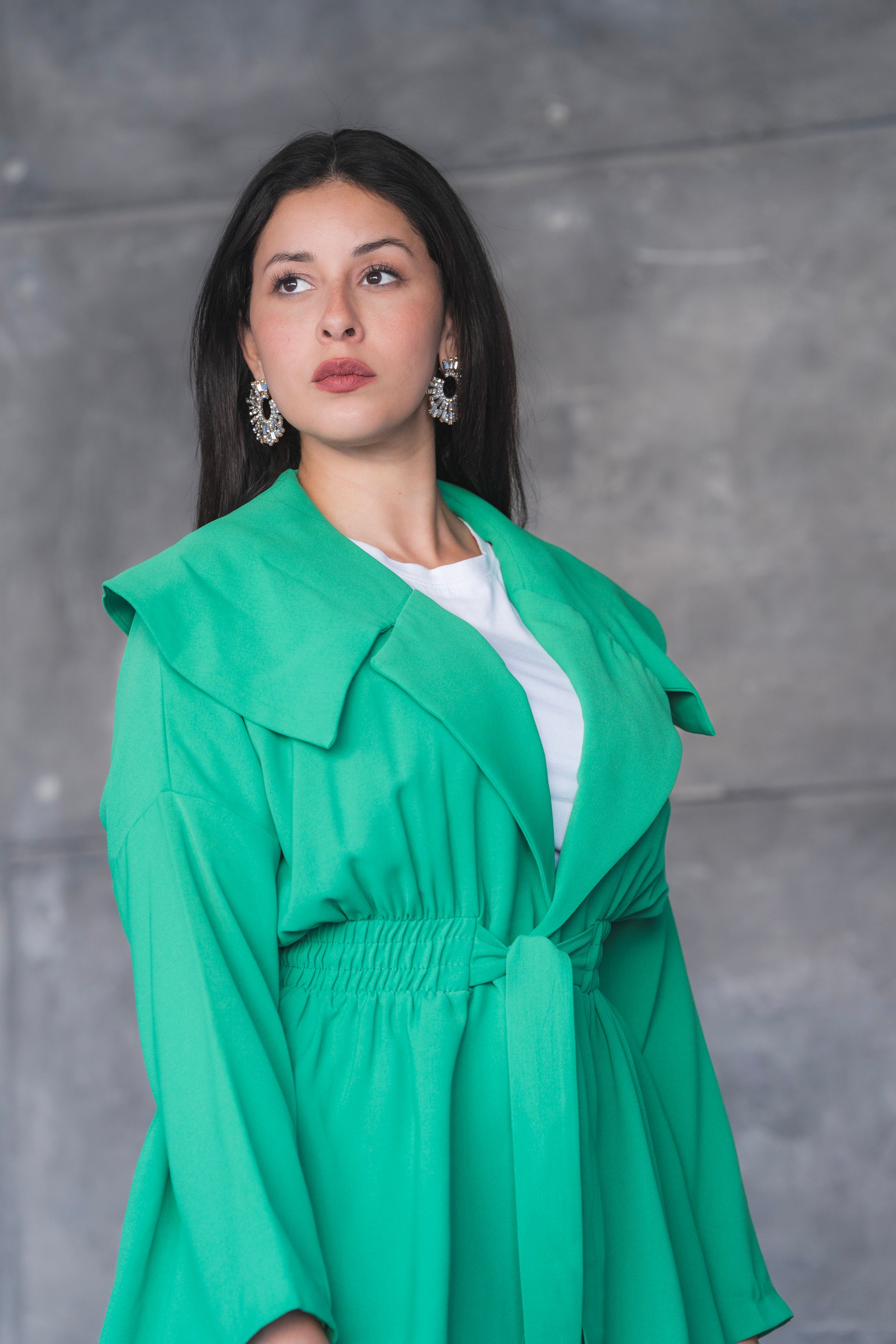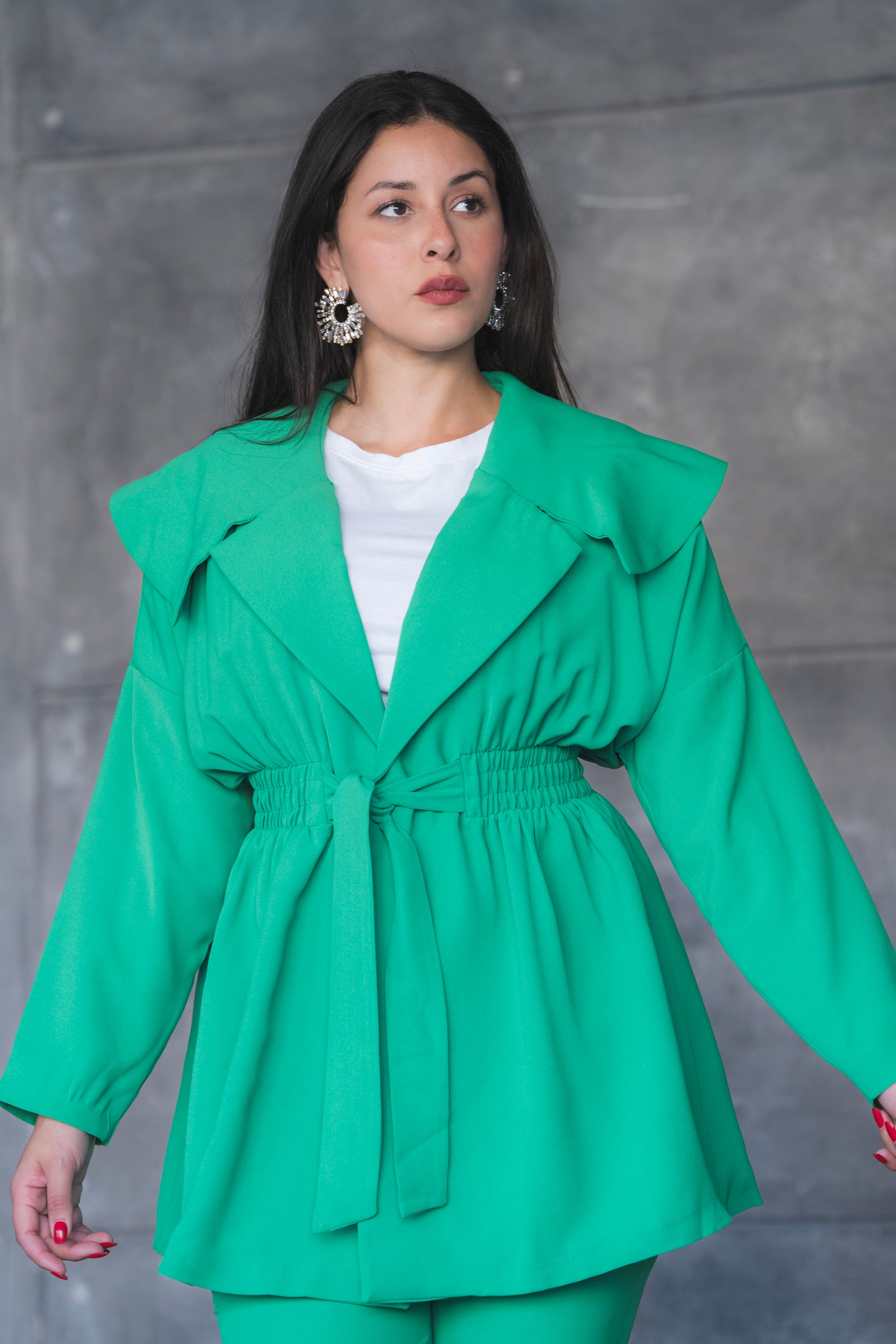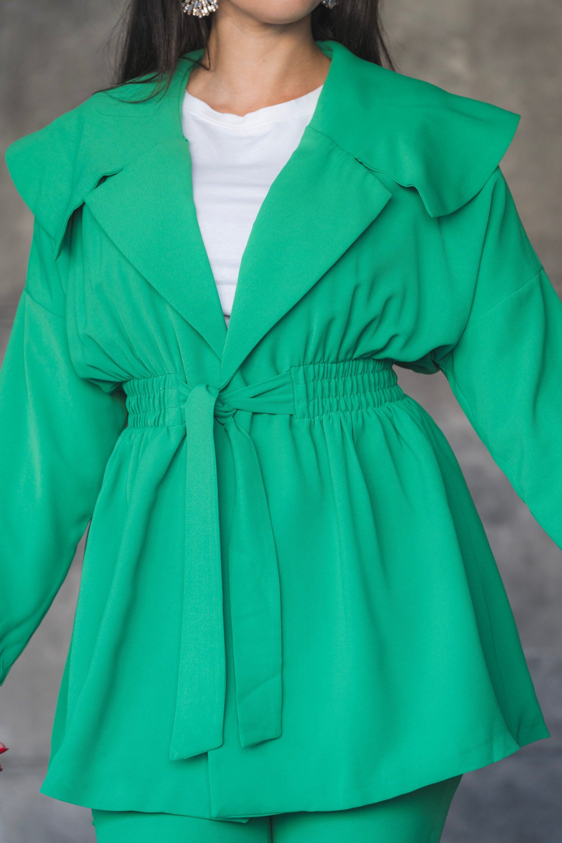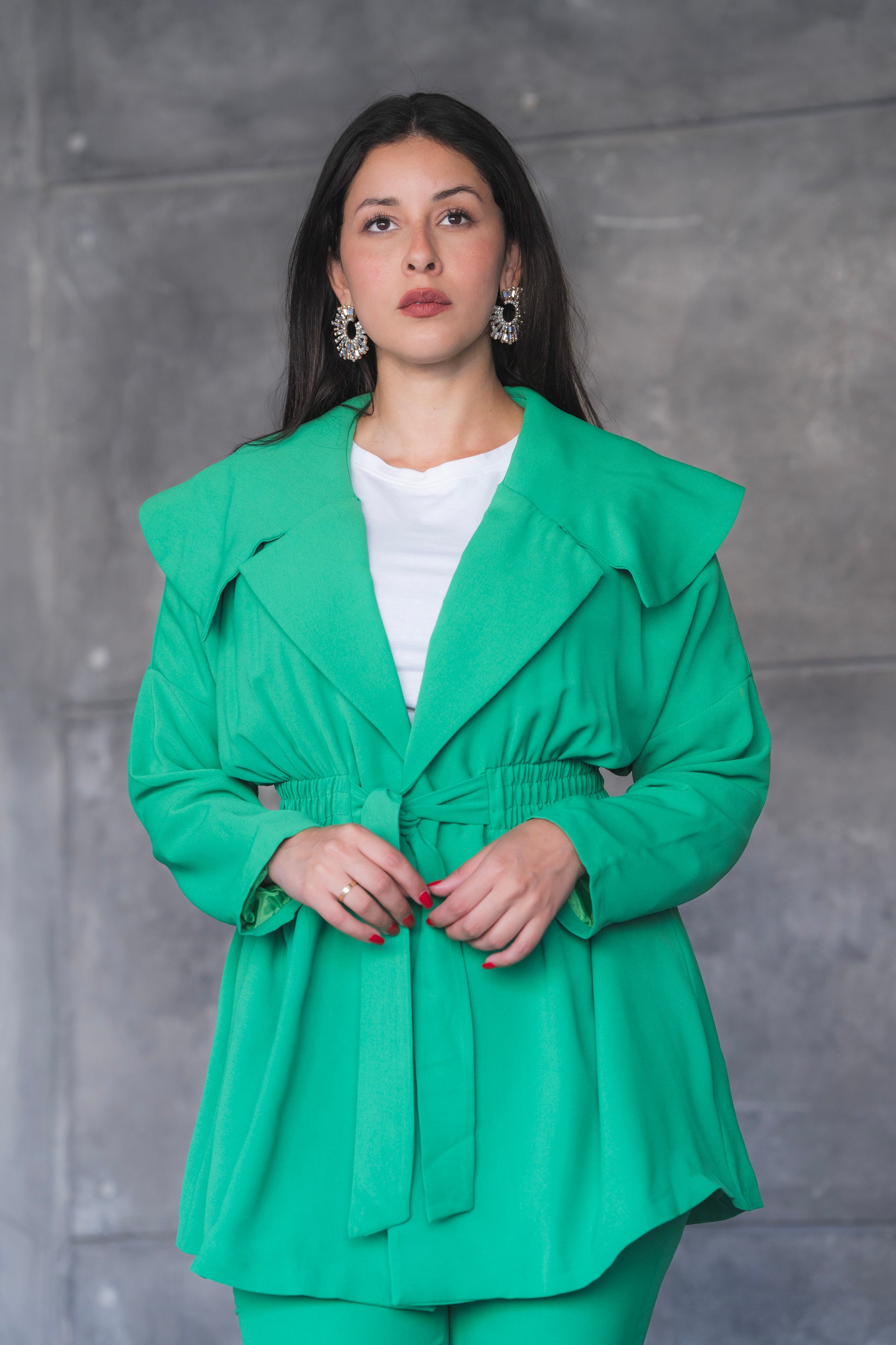 levate your power-dressing game with this striking green pantsuit set — where bold color meets tailored elegance. Featuring a longline jacket with oversized lapels and a belted waist for a cinched, feminine silhouette, this set is completed with matching high-waisted flared trousers for a look that's both polished and fashion-forward. Perfect for business events, formal outings, or any occasion where you want to stand out in style.
