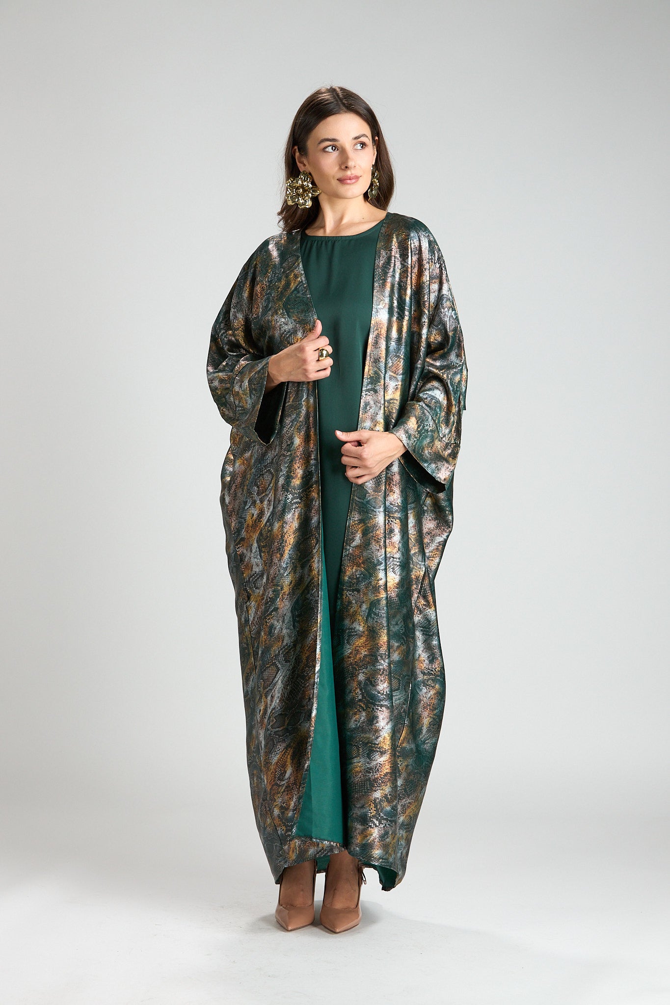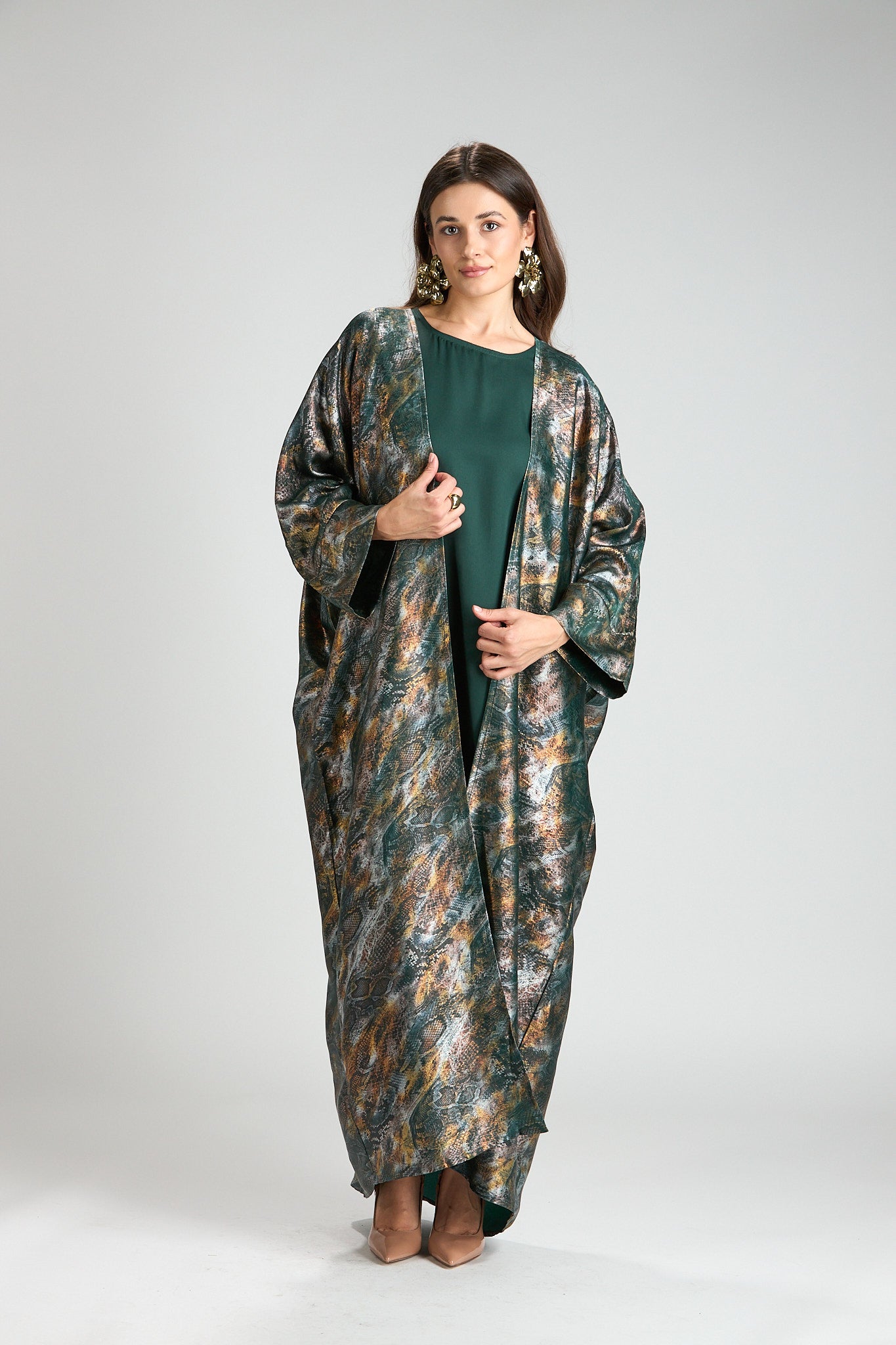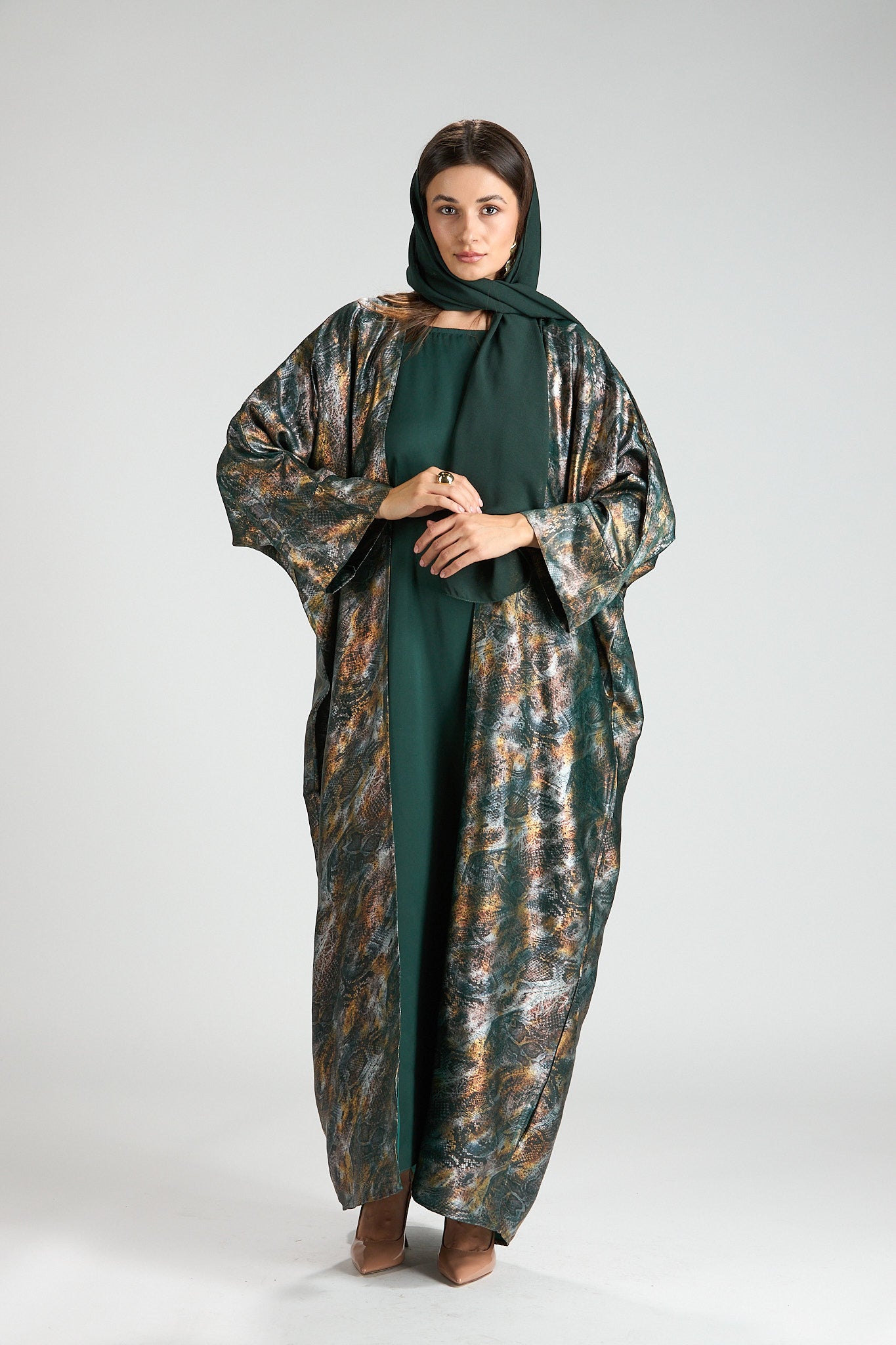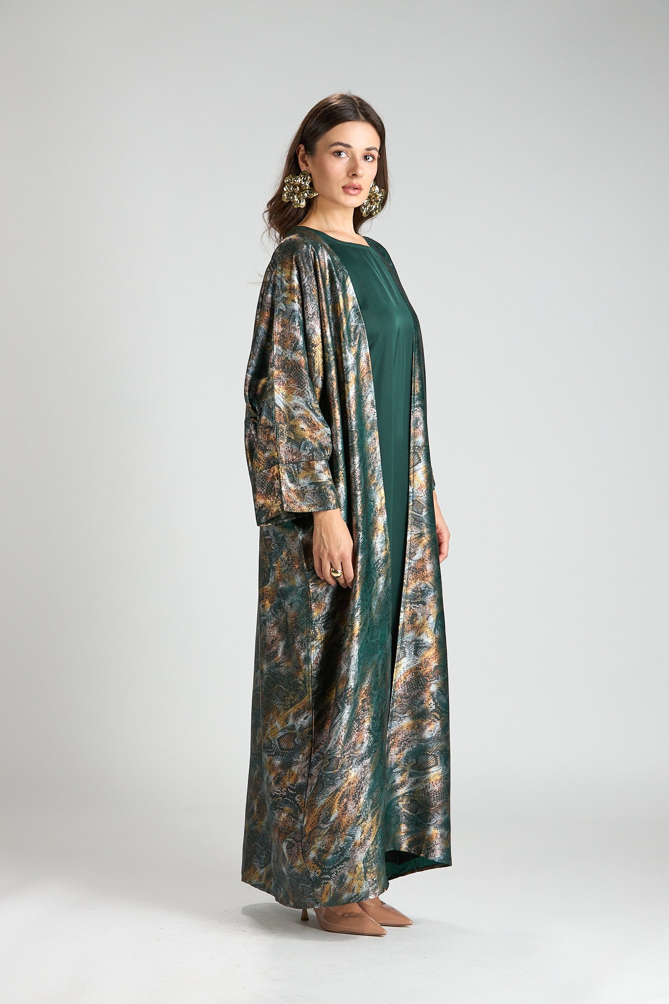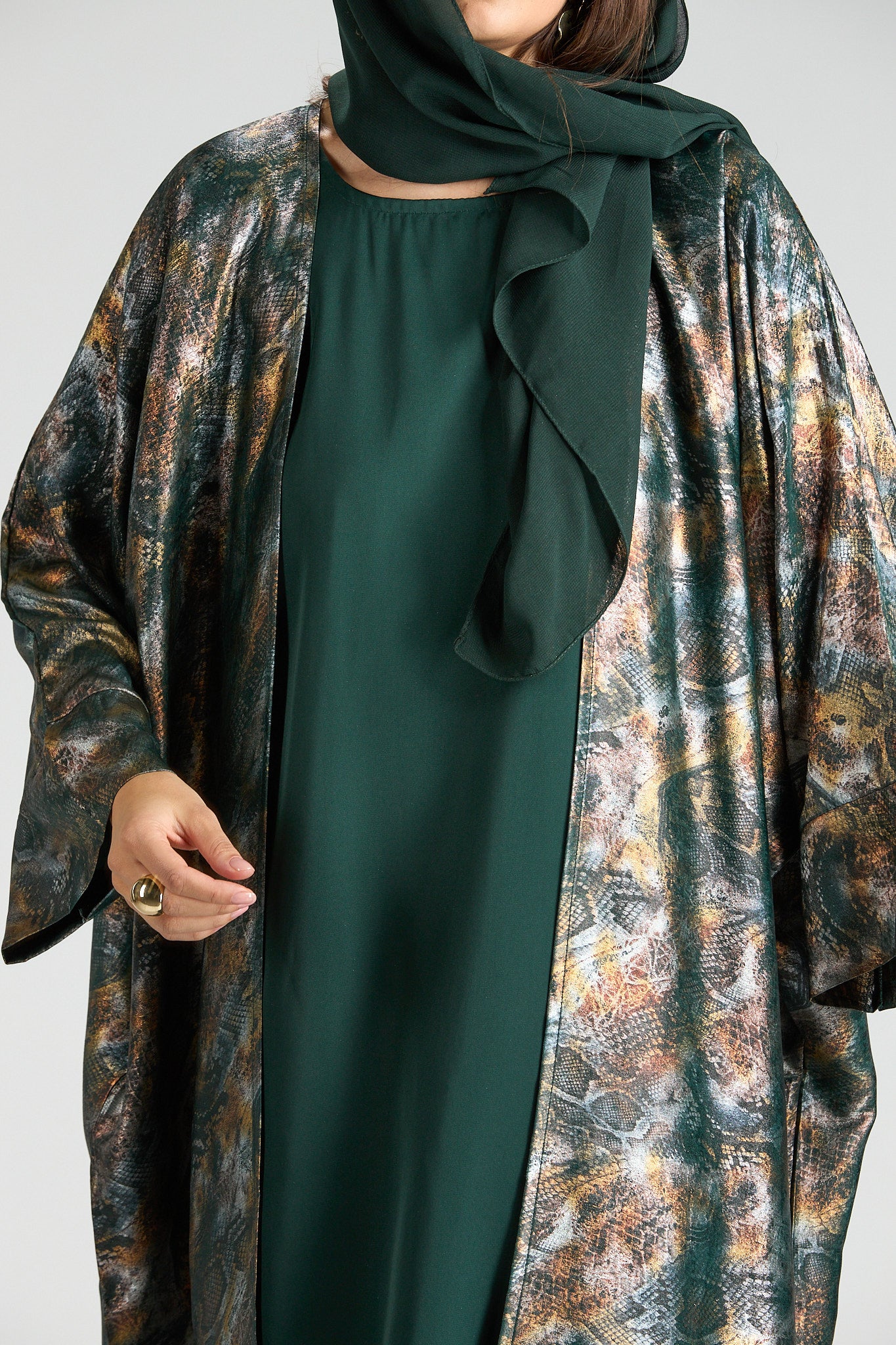 This two-piece ensemble features a flowing open abaya crafted in a rich emerald base with abstract bronze and gold metallic accents. The textured pattern creates depth and dimension, giving the piece a couture-inspired feel while maintaining effortless modesty. Layered over a sleek, solid emerald inner dress, the look is both refined and striking.