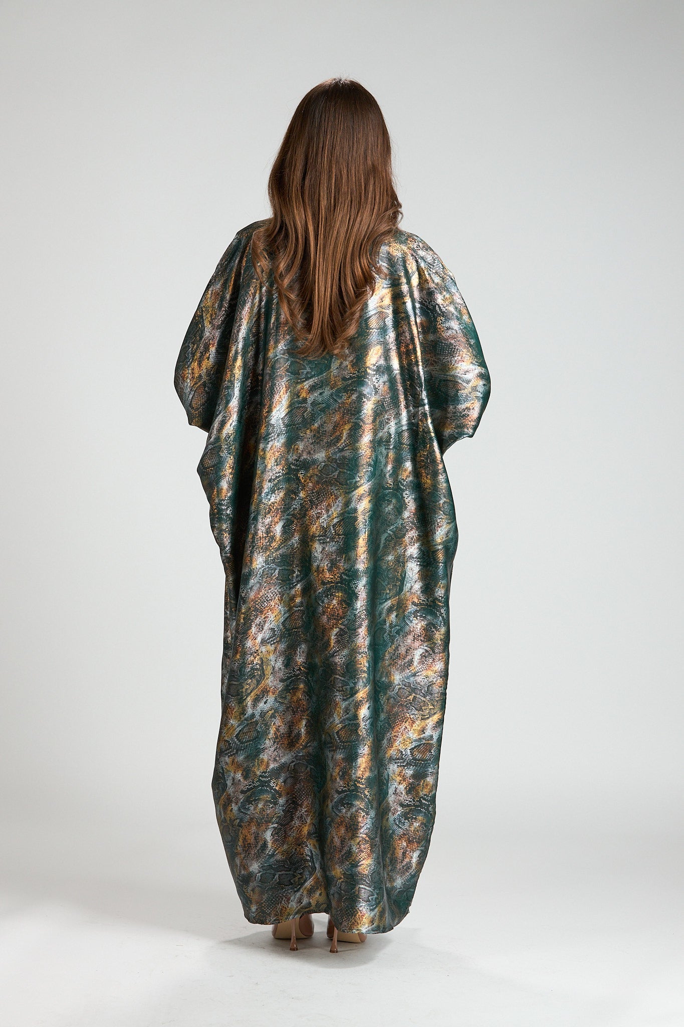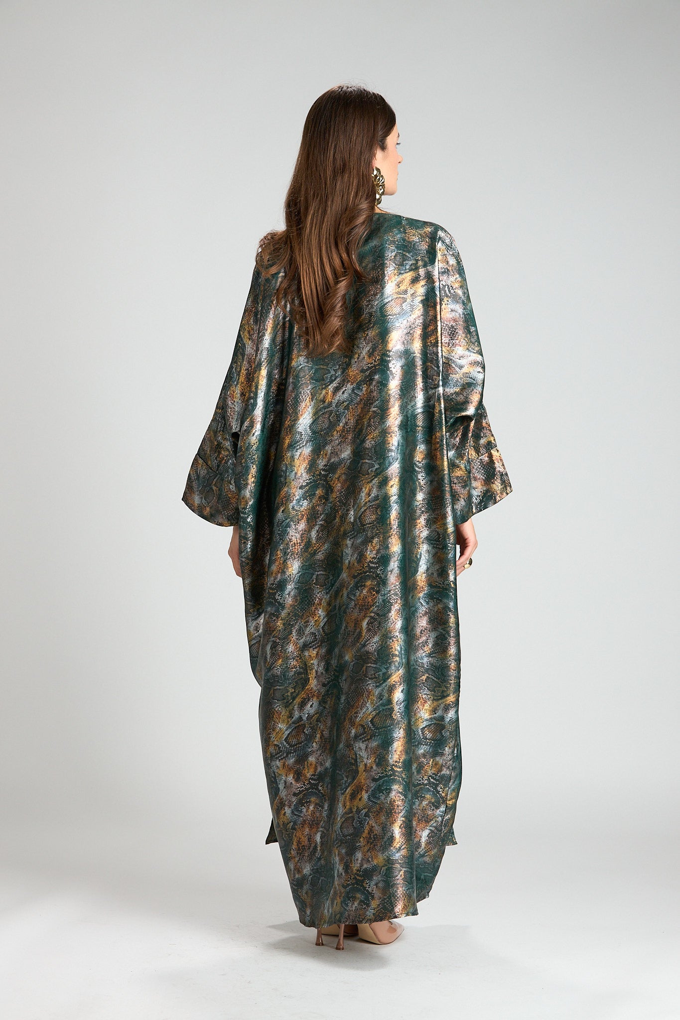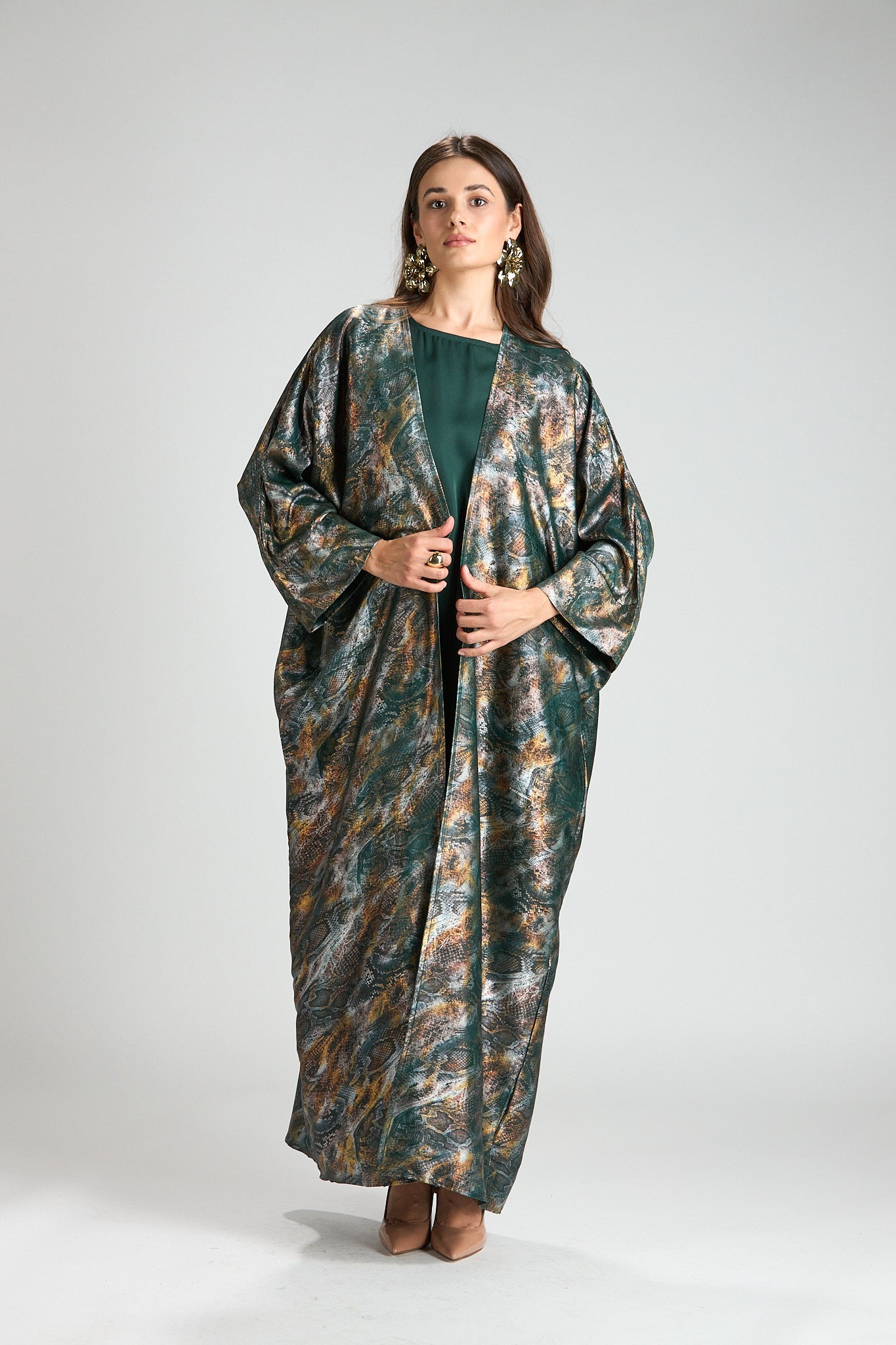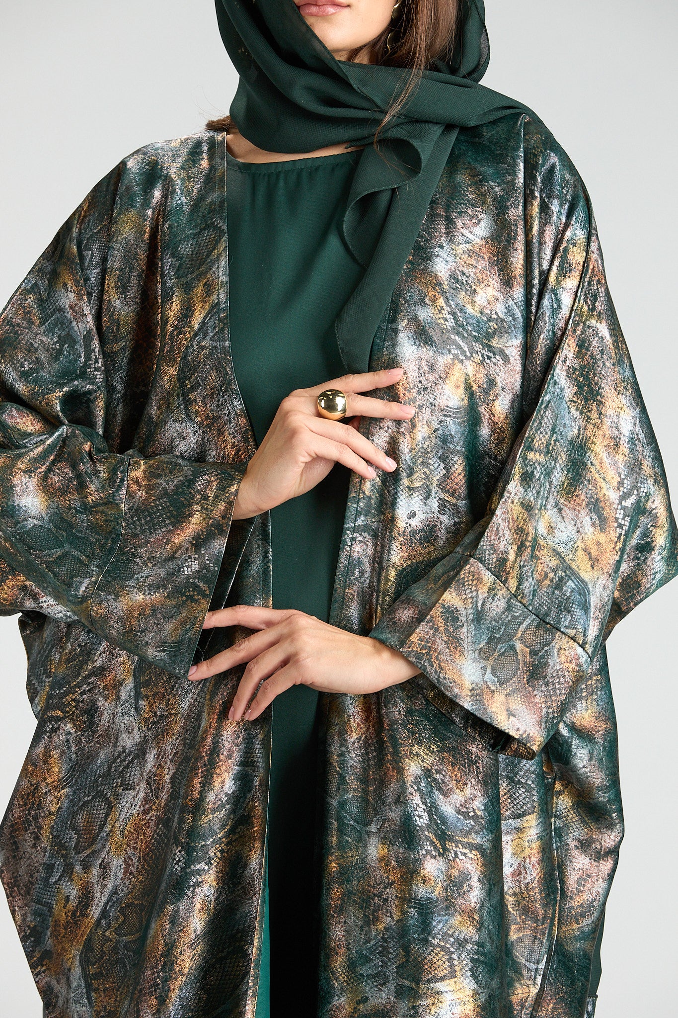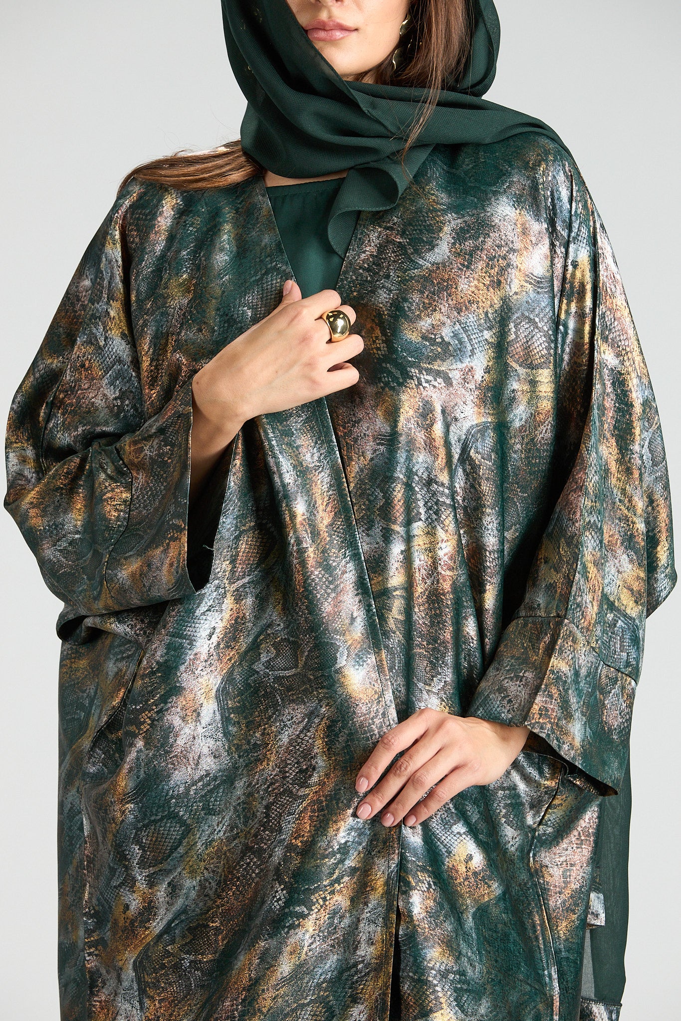 This two-piece ensemble features a flowing open abaya crafted in a rich emerald base with abstract bronze and gold metallic accents. The textured pattern creates depth and dimension, giving the piece a couture-inspired feel while maintaining effortless modesty. Layered over a sleek, solid emerald inner dress, the look is both refined and striking.