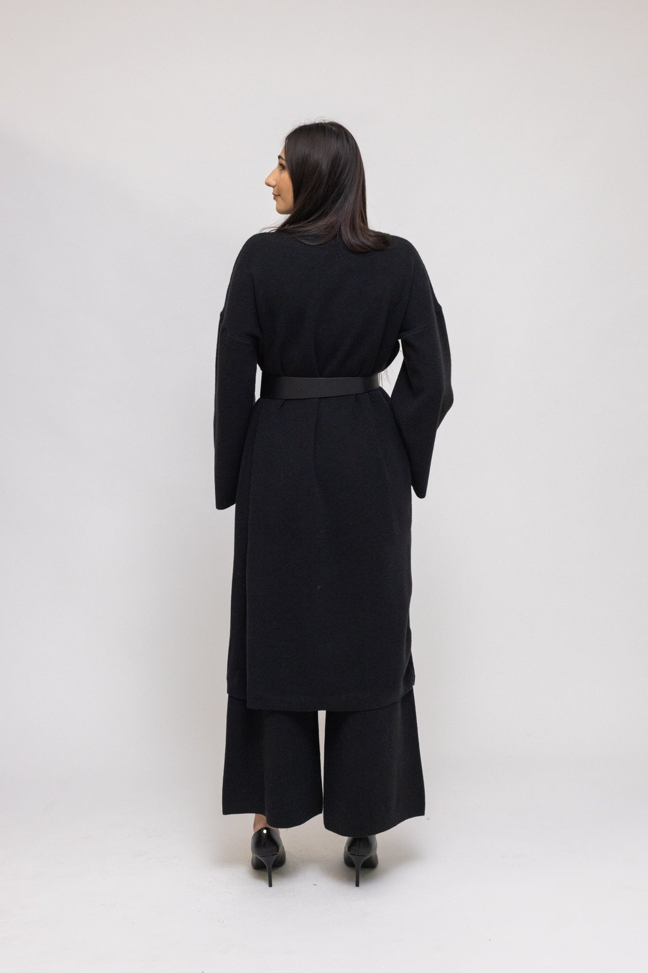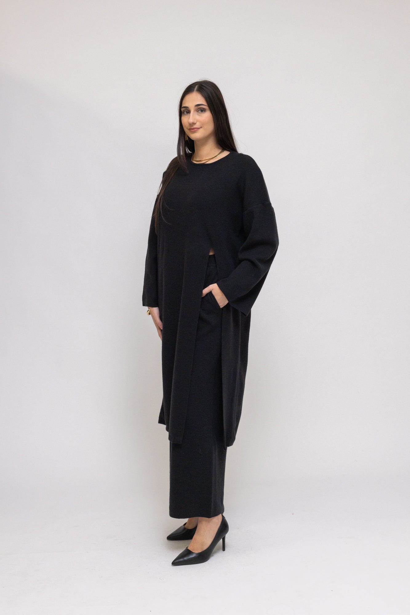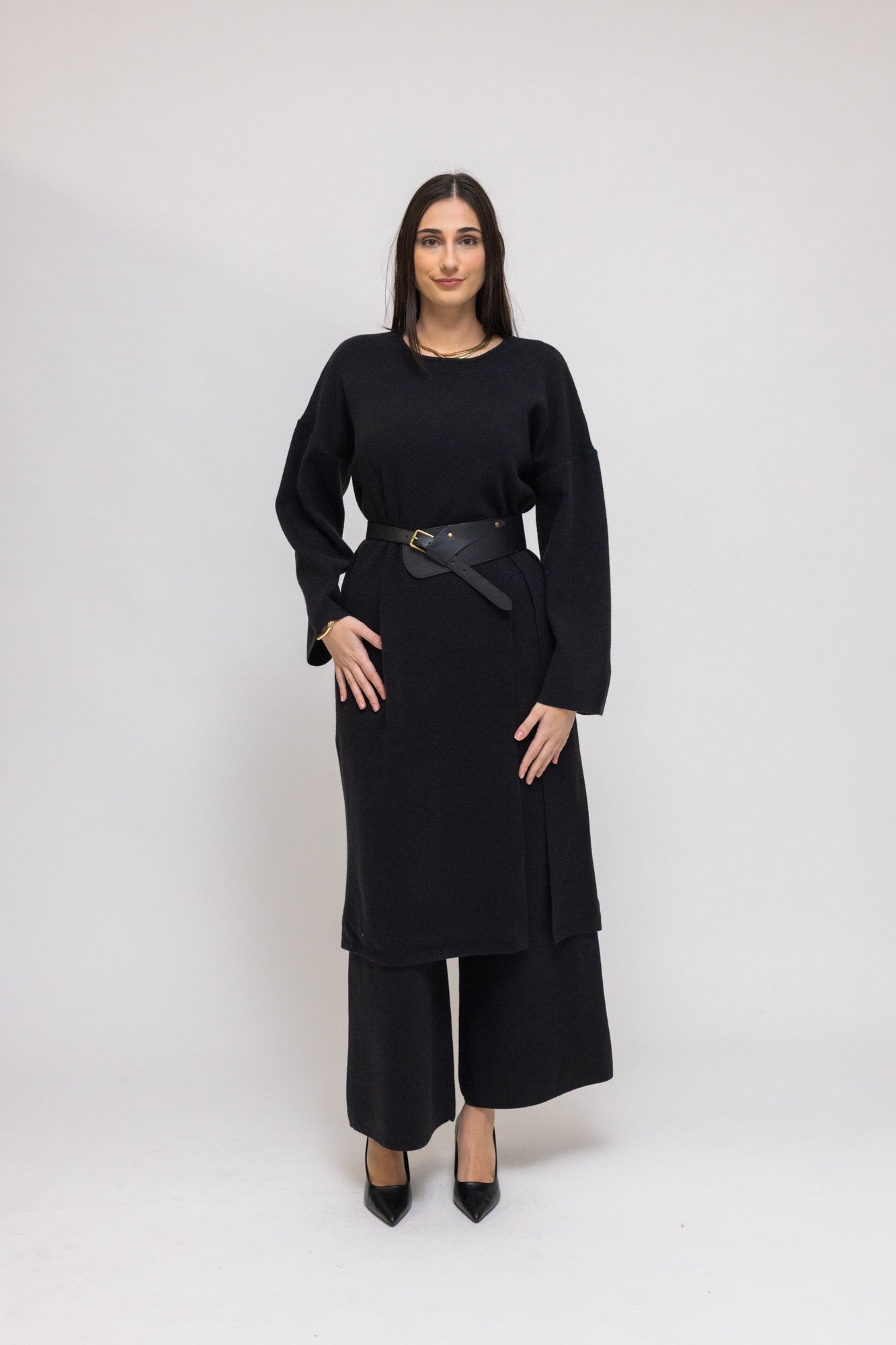 timeless essential designed for effortless elegance and everyday comfort. This black knit two-piece set features a relaxed longline tunic paired with wide-leg pants, creating a flattering, modest silhouette that moves beautifully with you. Crafted from a soft, structured knit, it offers warmth without bulk and a refined drape perfect for both casual and elevated styling.