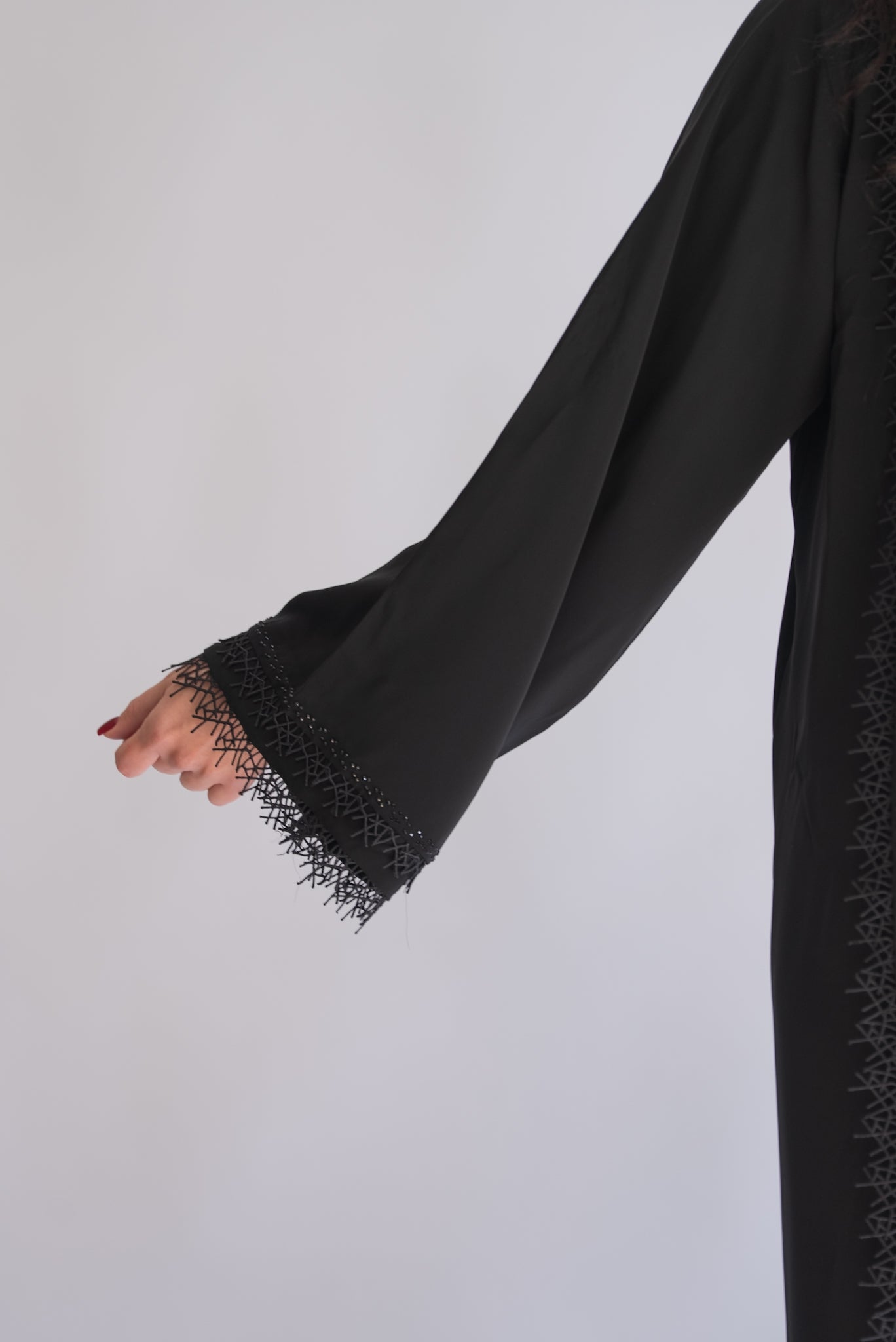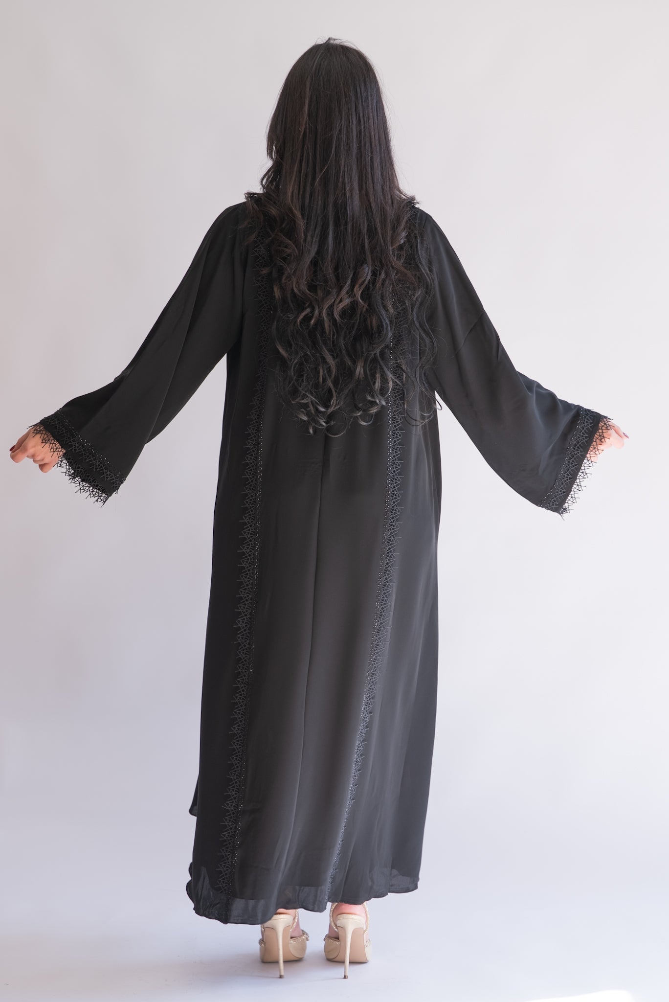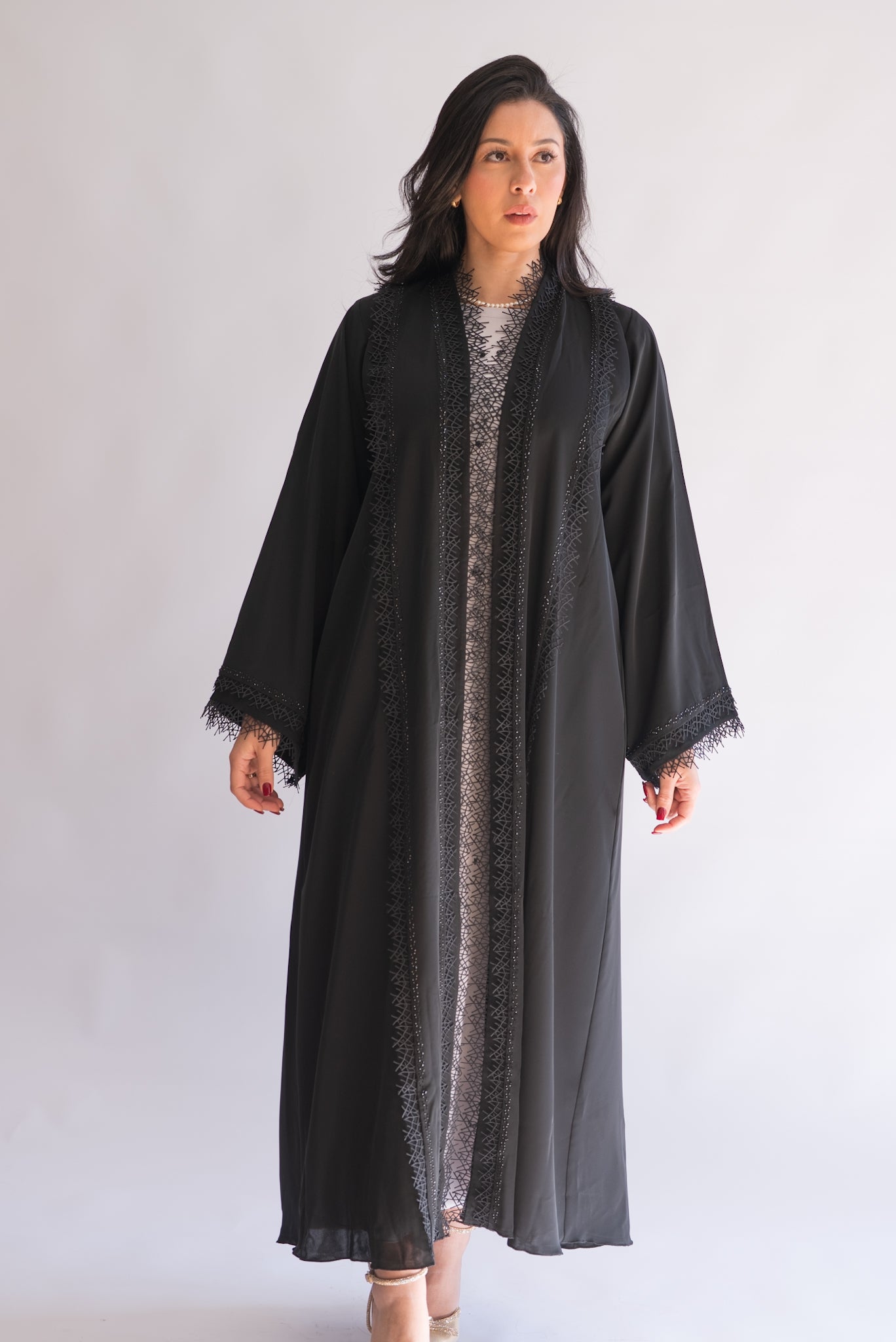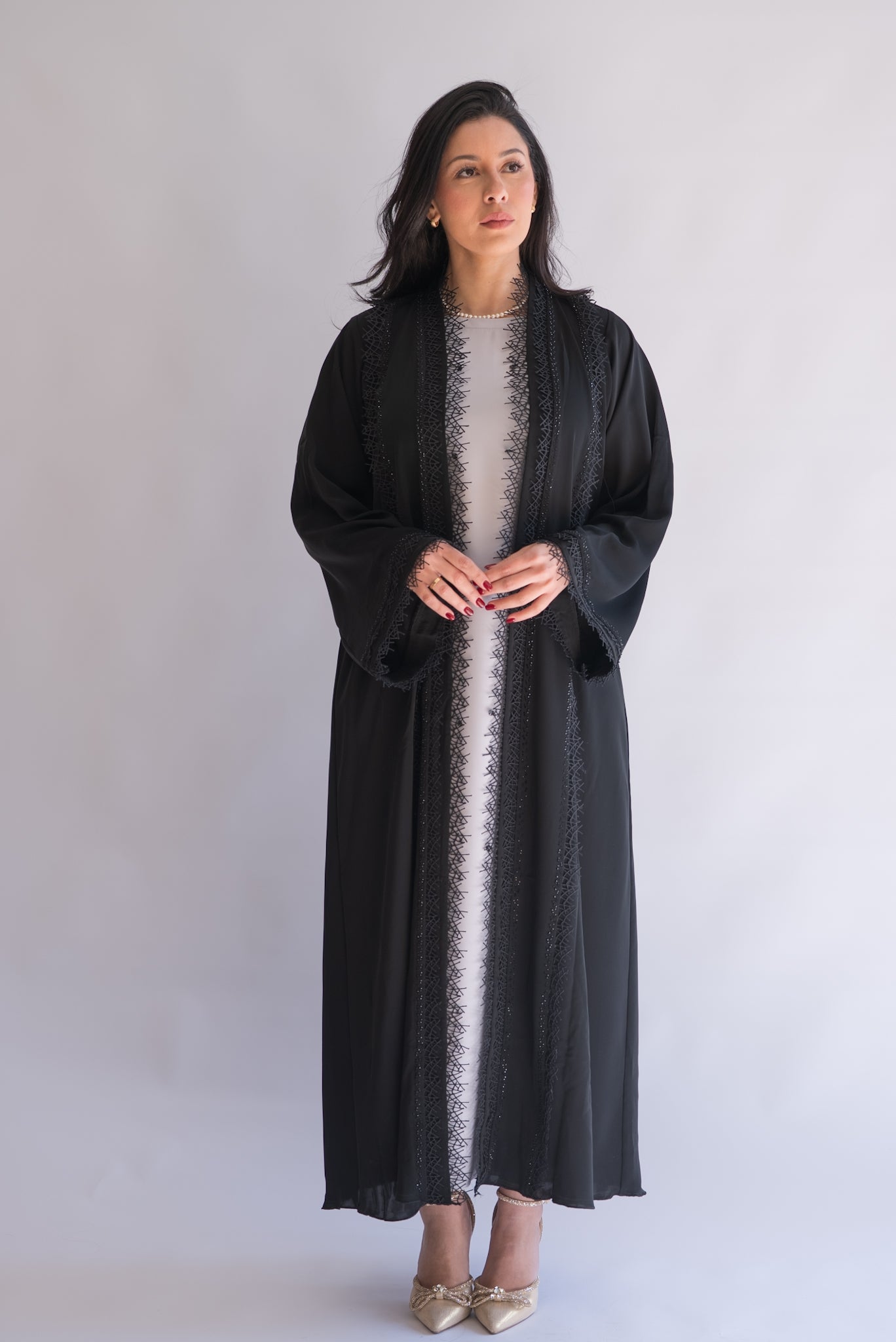 Timeless and elegant, this classic black abaya is adorned with delicate lace embellishments along the front and cuffs. Crafted from a lightweight fabric, it offers both comfort and grace, making it a perfect choice for formal occasions or modest everyday wear. The intricate lace detailing adds a luxurious touch, elevating this piece to a wardrobe essential. Style it with chic heels and accessories to complete the look.