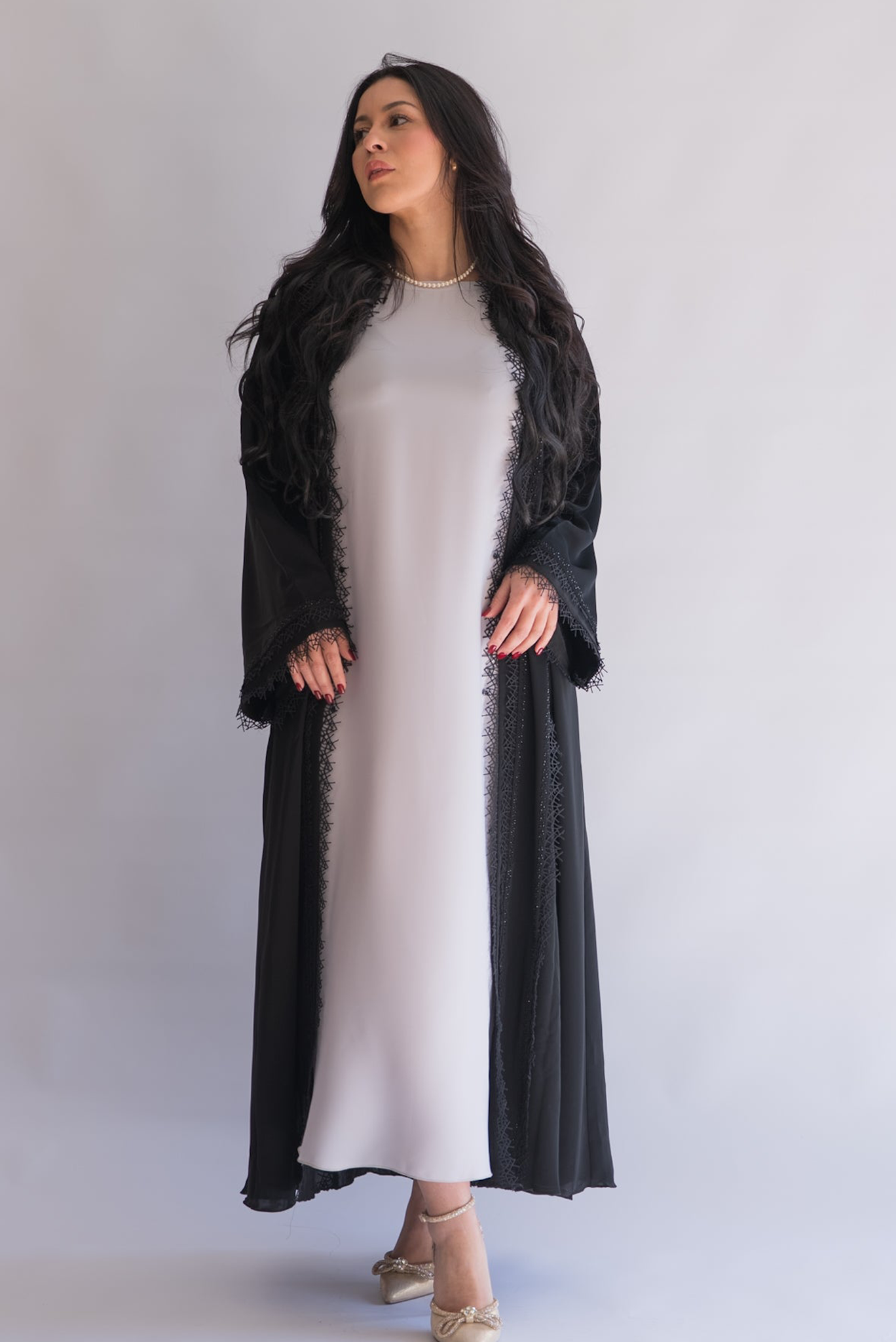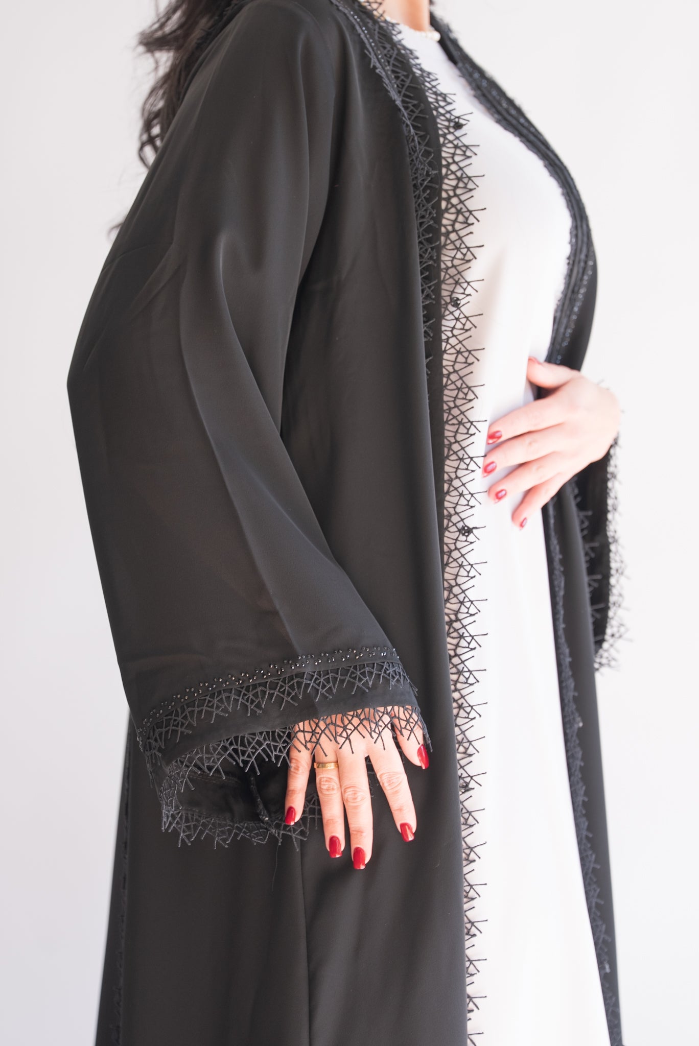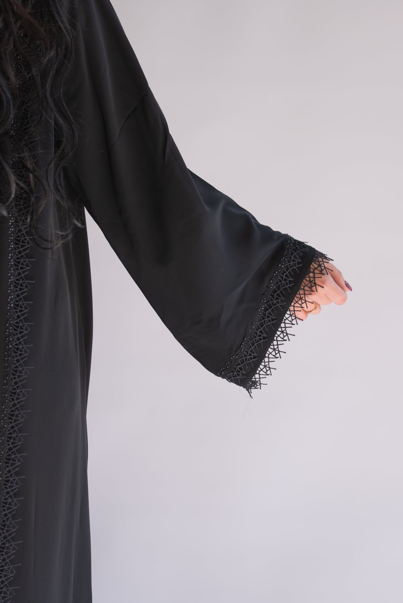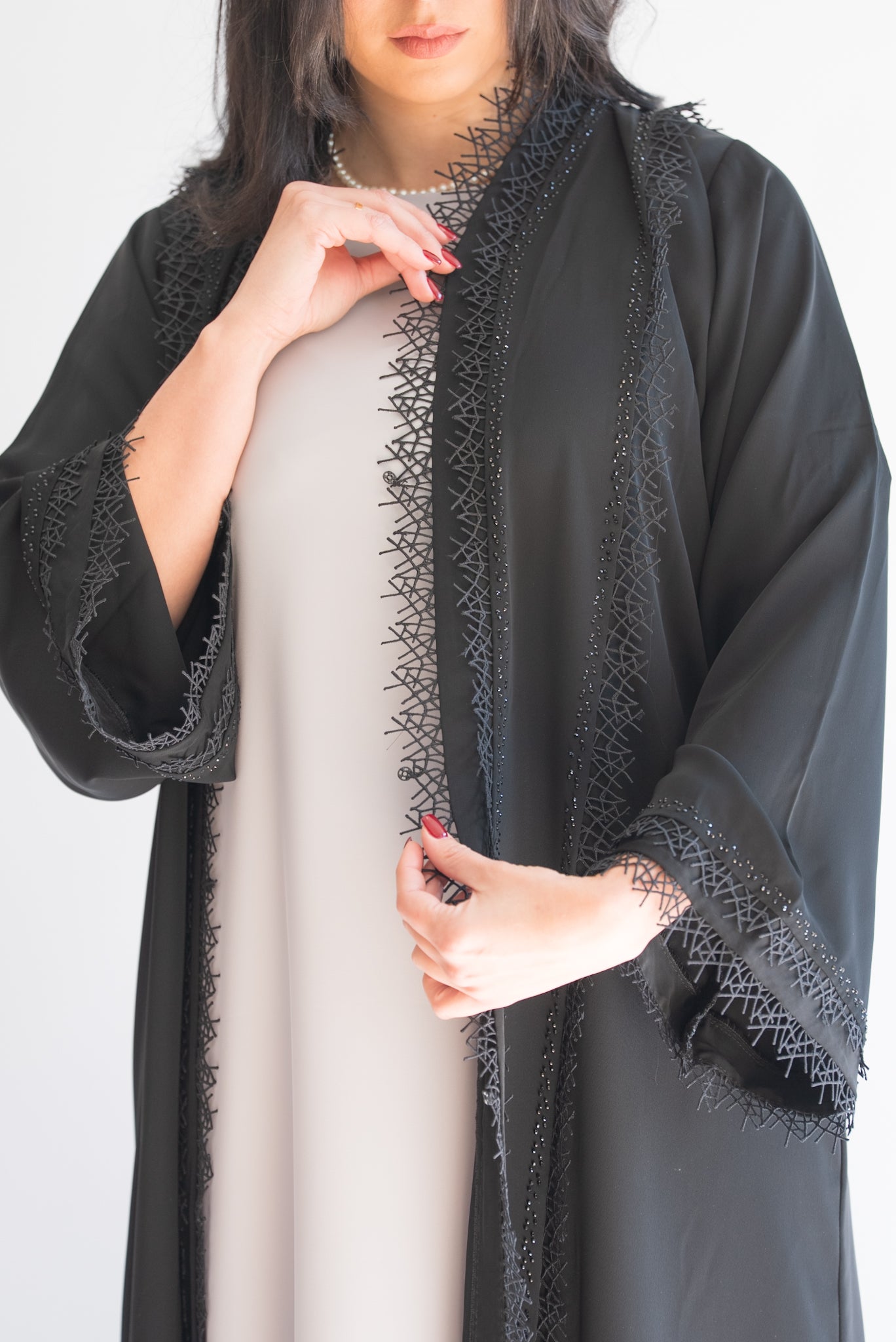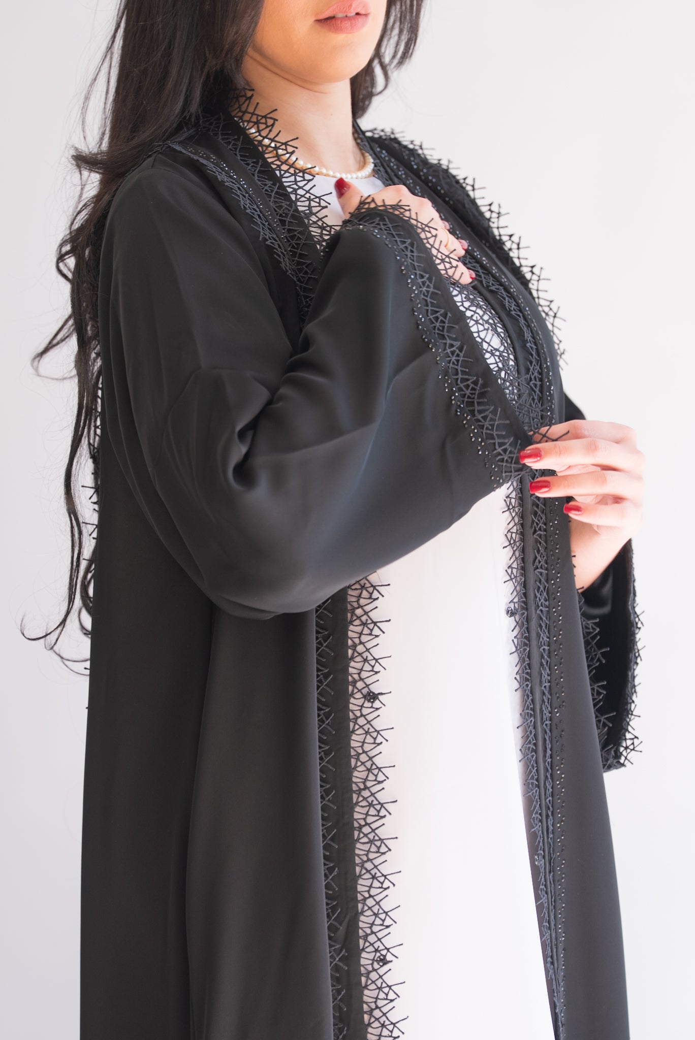 Timeless and elegant, this classic black abaya is adorned with delicate lace embellishments along the front and cuffs. Crafted from a lightweight fabric, it offers both comfort and grace, making it a perfect choice for formal occasions or modest everyday wear. The intricate lace detailing adds a luxurious touch, elevating this piece to a wardrobe essential. Style it with chic heels and accessories to complete the look.