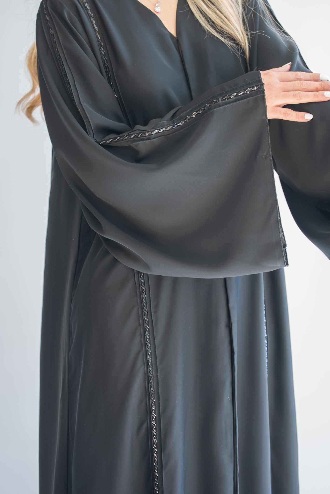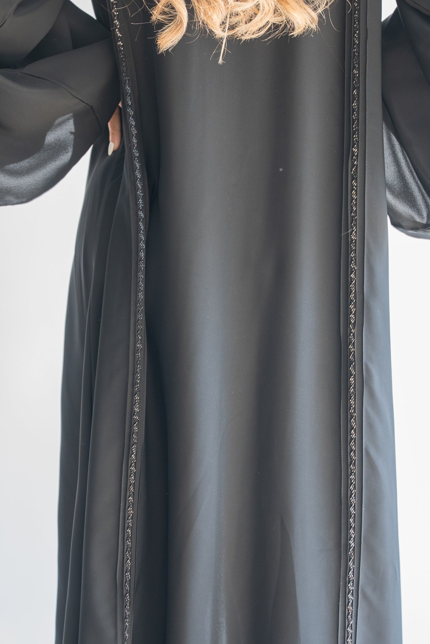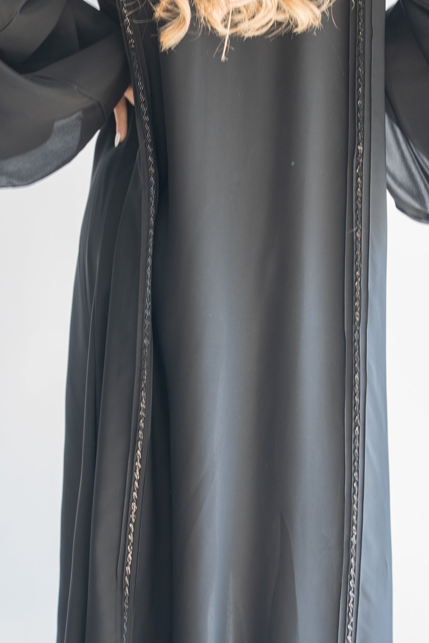 This stunning black abaya offers a refined and minimalist aesthetic, perfect for those who prefer timeless elegance. The abaya features subtle yet beautiful trim detailing along the front and sleeve edges, enhancing its sleek design. The wide, flowing sleeves add a touch of grace and comfort, making this abaya suitable for any occasion, whether casual or formal. Crafted from high-quality fabric, this abaya ensures a comfortable fit and an effortlessly chic look.
