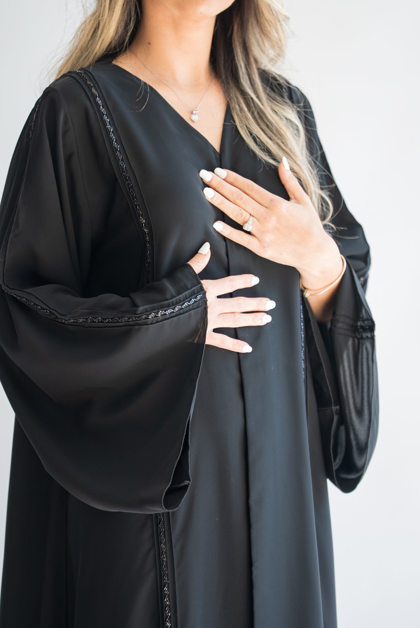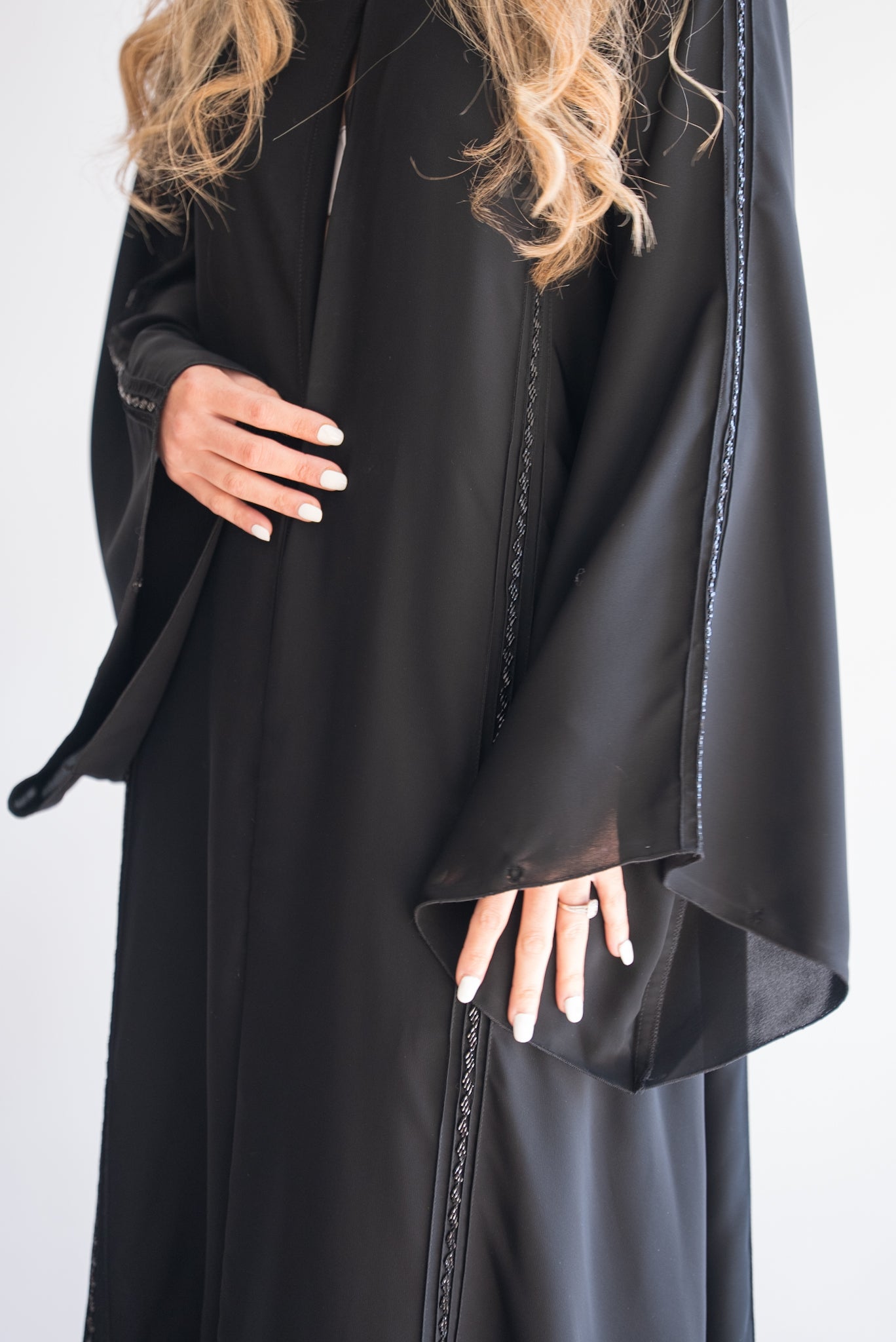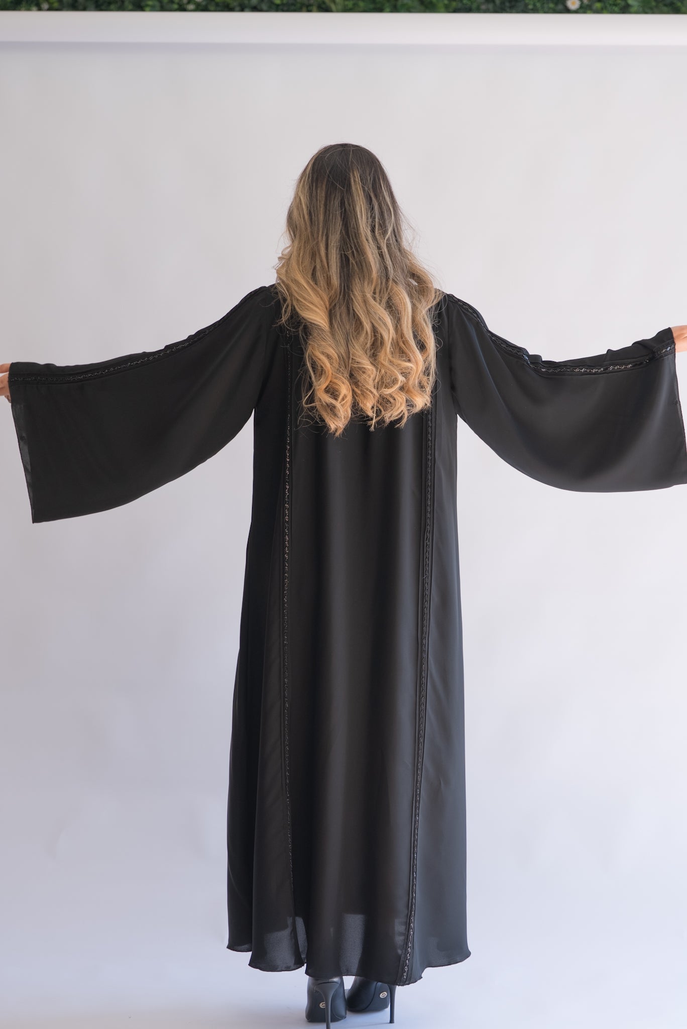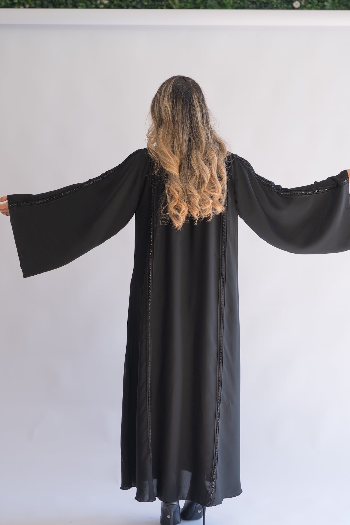 This stunning black abaya offers a refined and minimalist aesthetic, perfect for those who prefer timeless elegance. The abaya features subtle yet beautiful trim detailing along the front and sleeve edges, enhancing its sleek design. The wide, flowing sleeves add a touch of grace and comfort, making this abaya suitable for any occasion, whether casual or formal. Crafted from high-quality fabric, this abaya ensures a comfortable fit and an effortlessly chic look.
