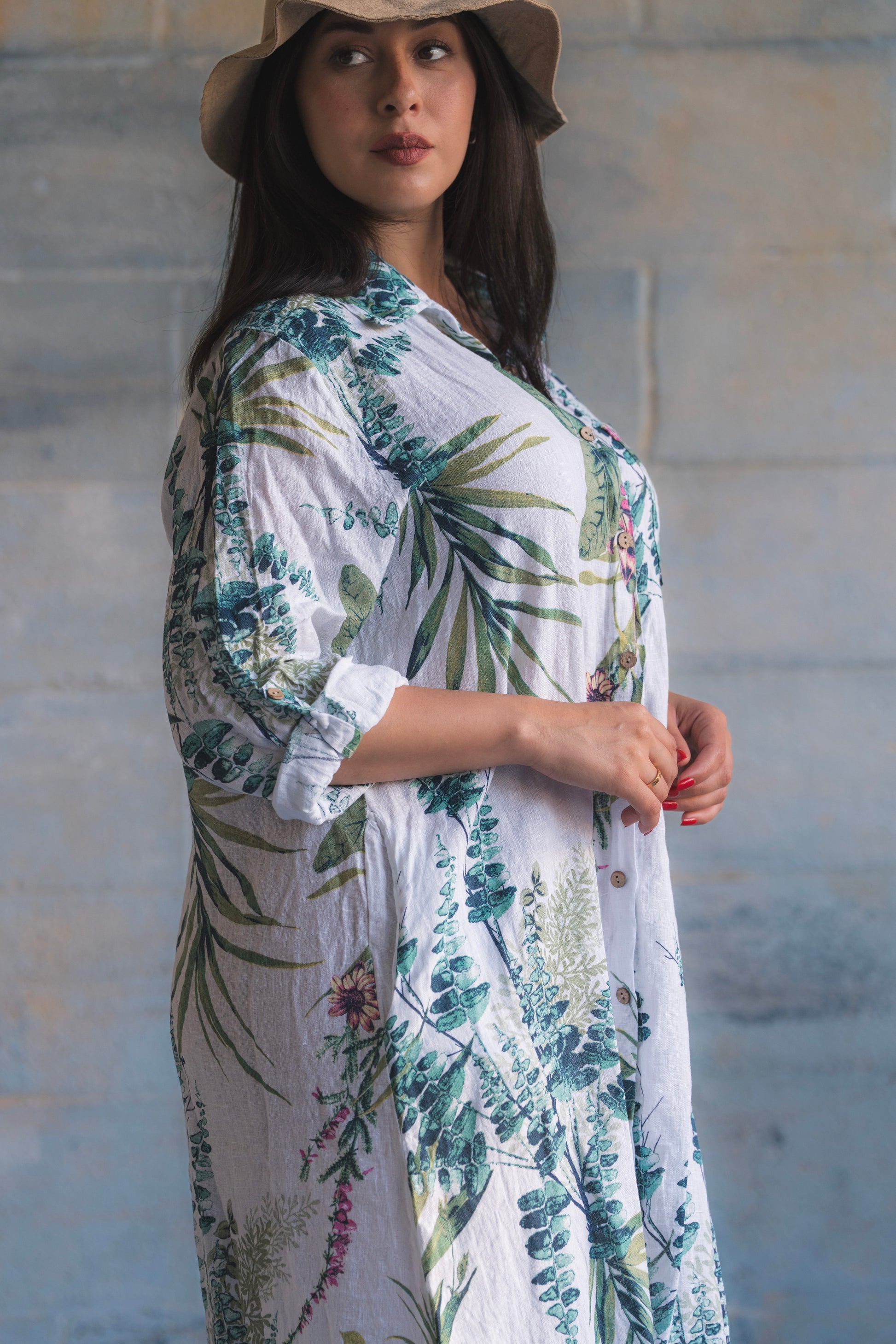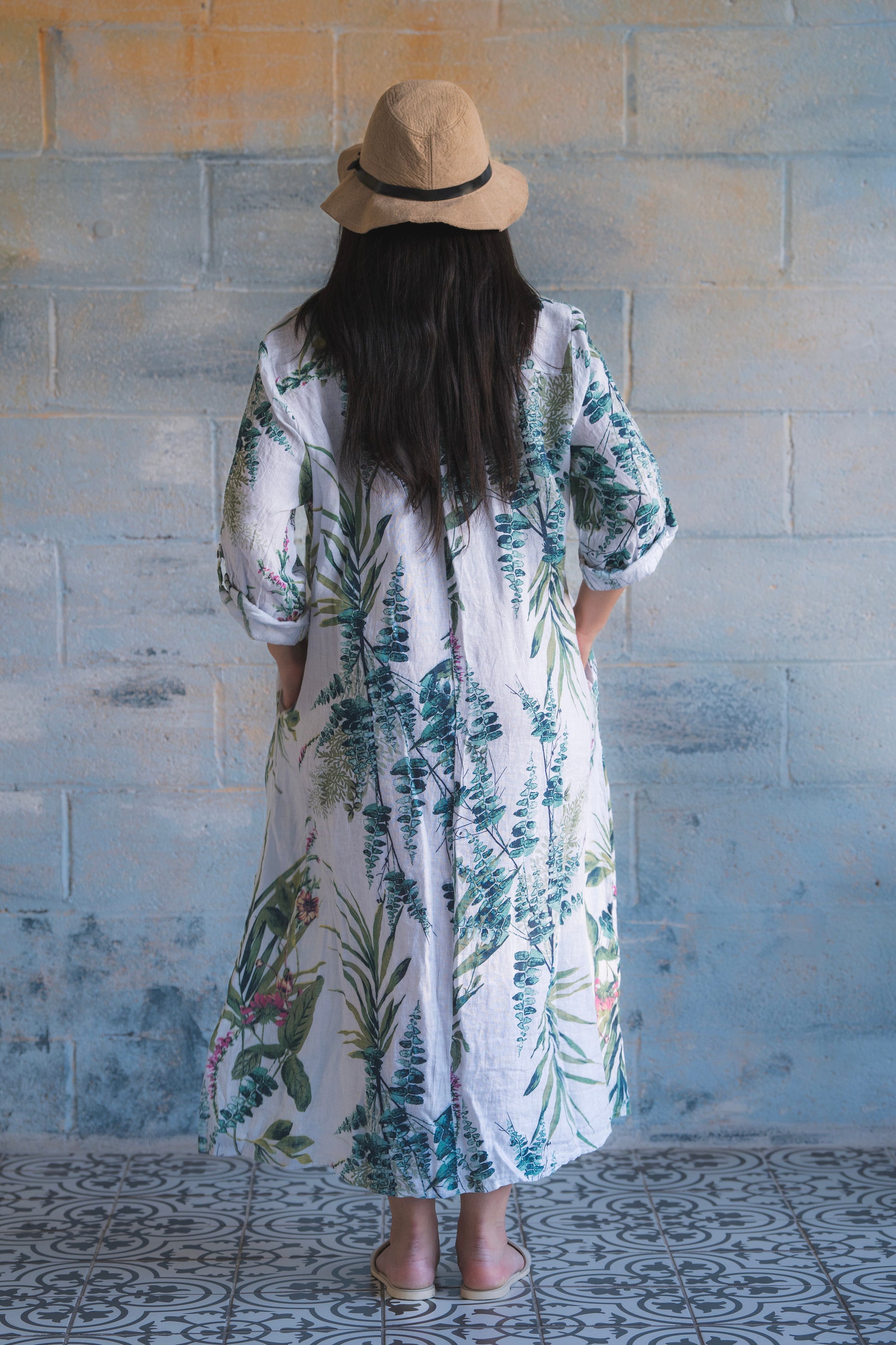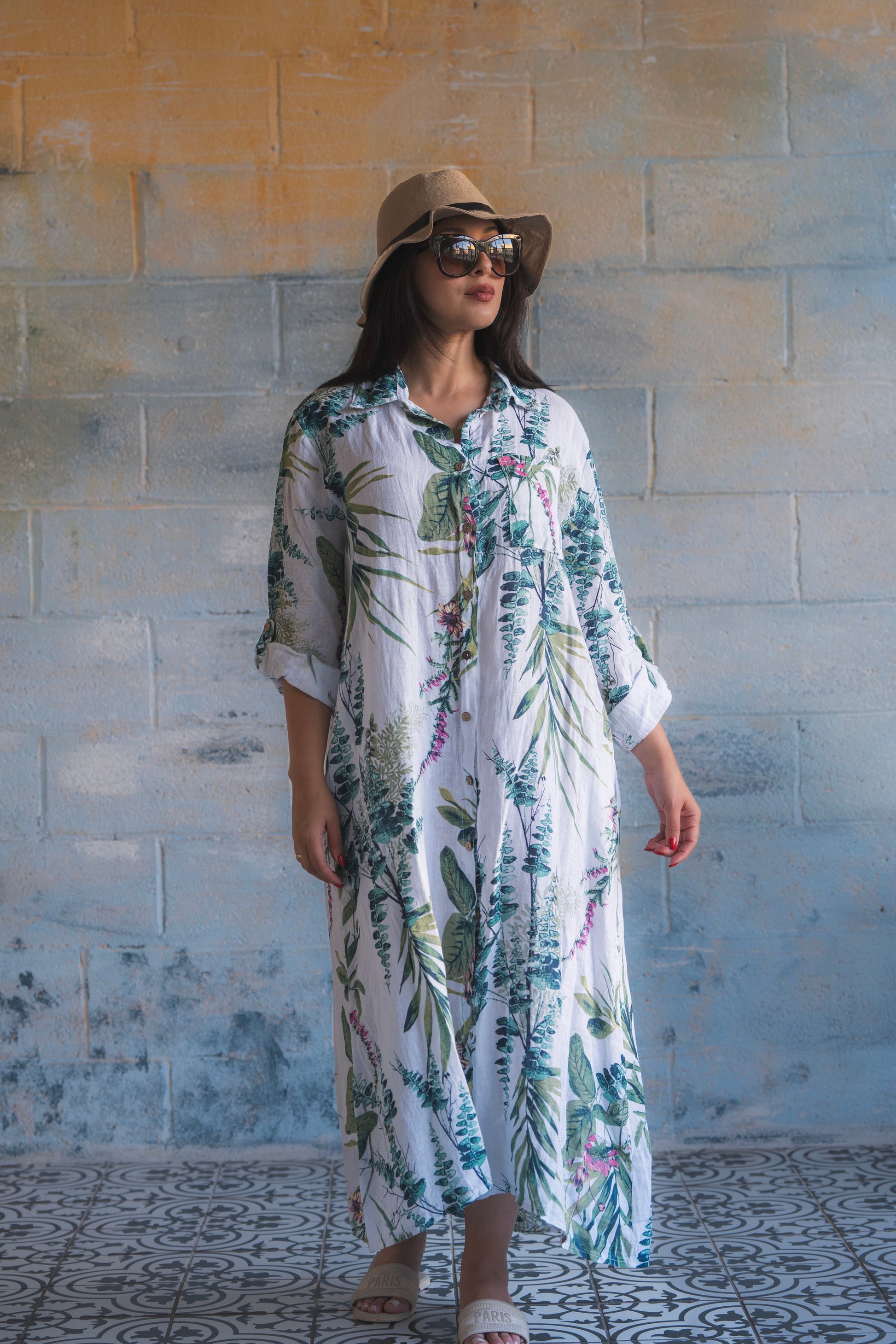 Long flowy maxi dress, featuring a botanical print with various shades of green, blue, and touches of pink and purple on a white background. It has a relaxed fit with long sleeves that can be rolled up. The dress is 100% linen ideal for warm weather.